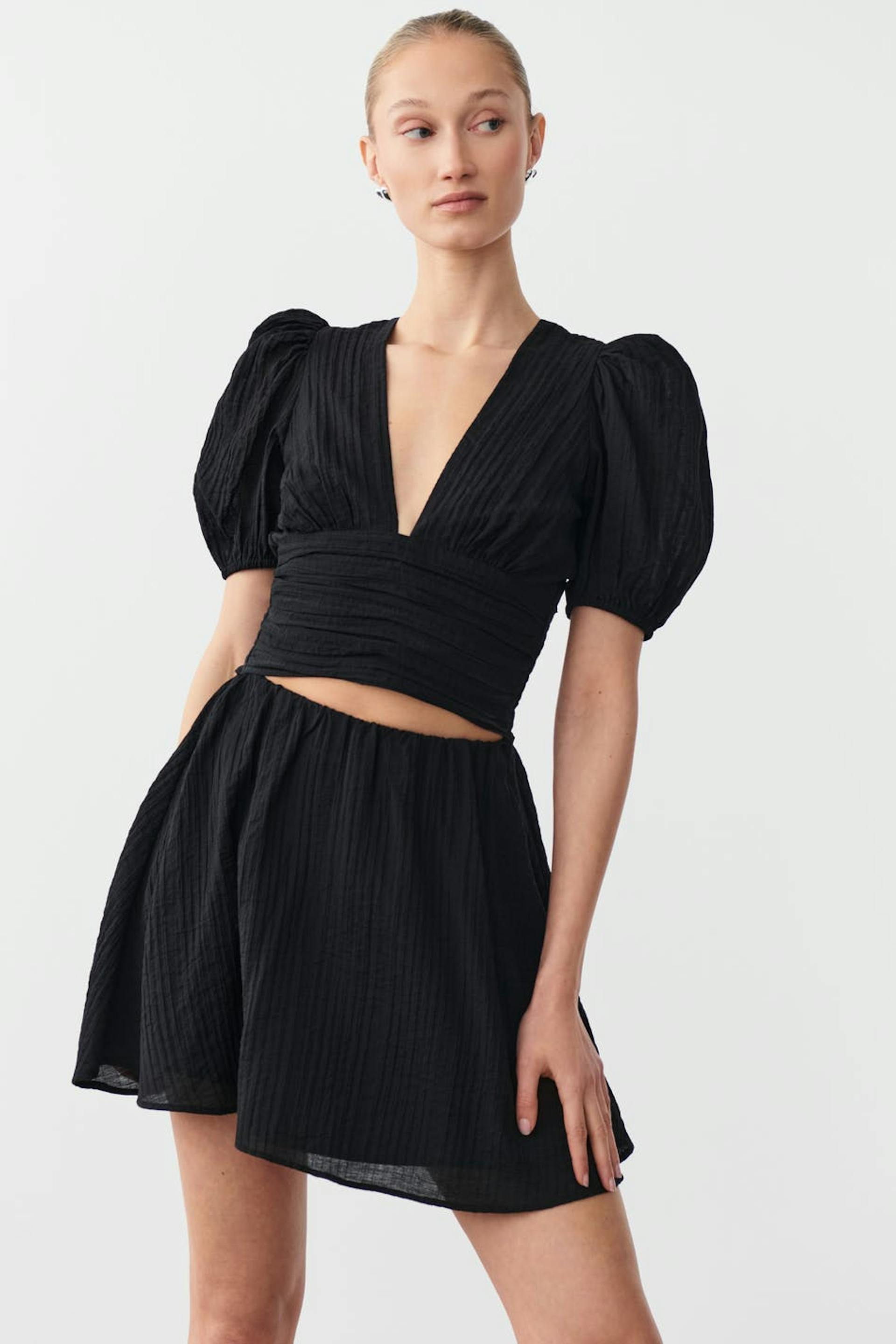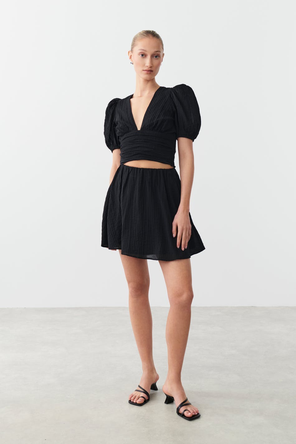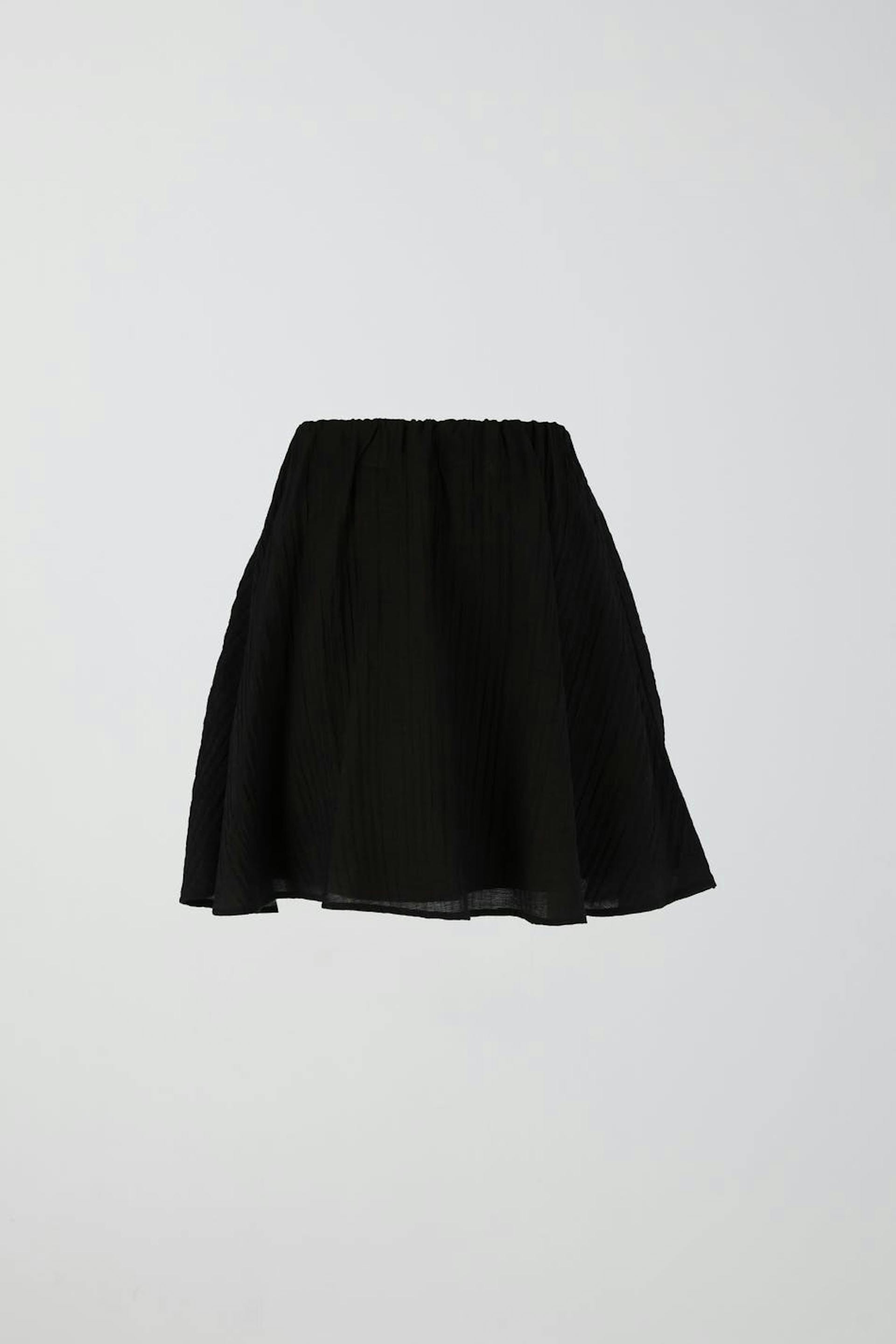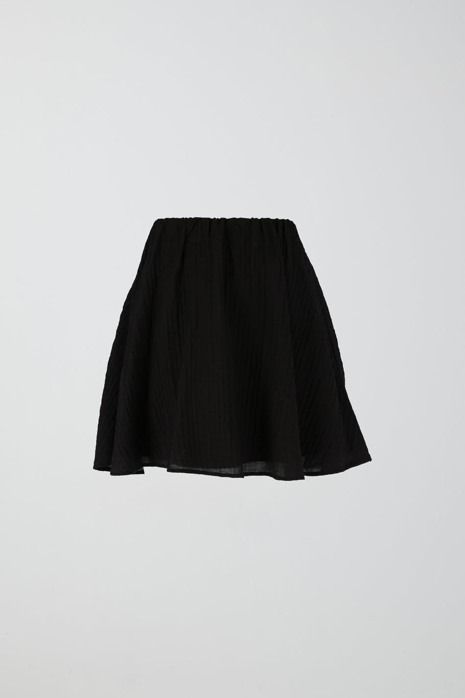 Midi skirt with loose fit. The skirt is black and has a structured, wrinkled fabric. It has elastic at the waist.