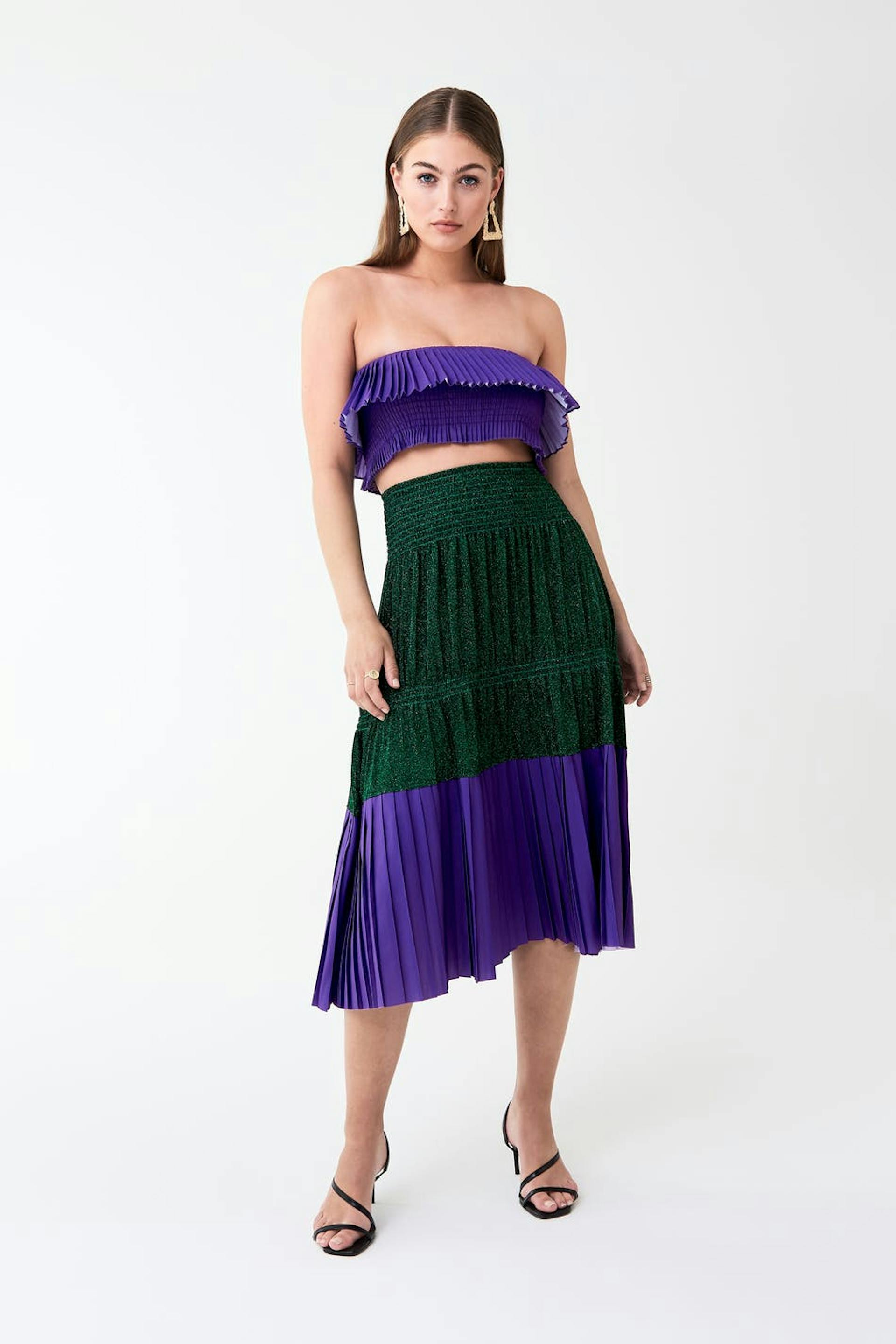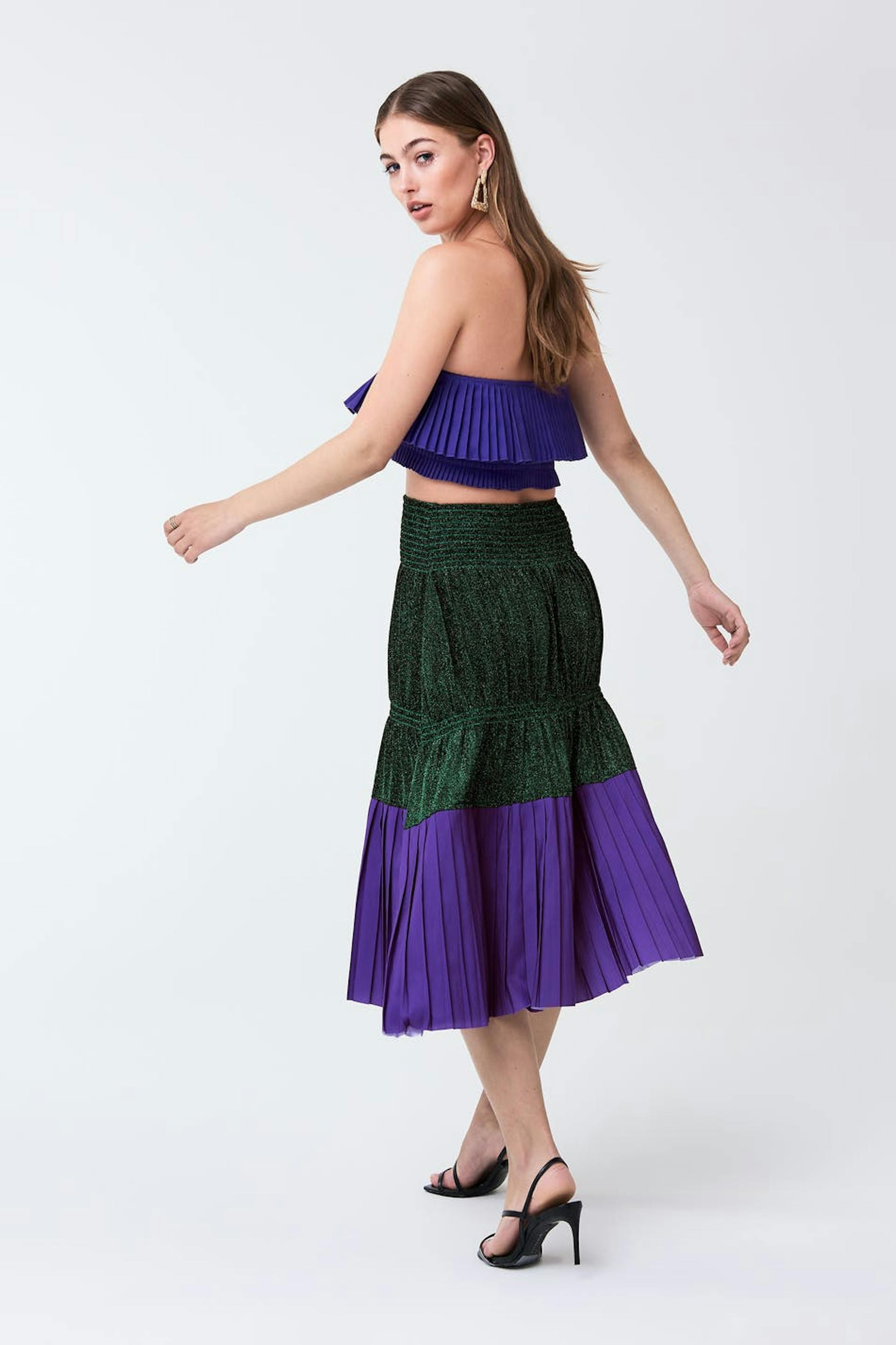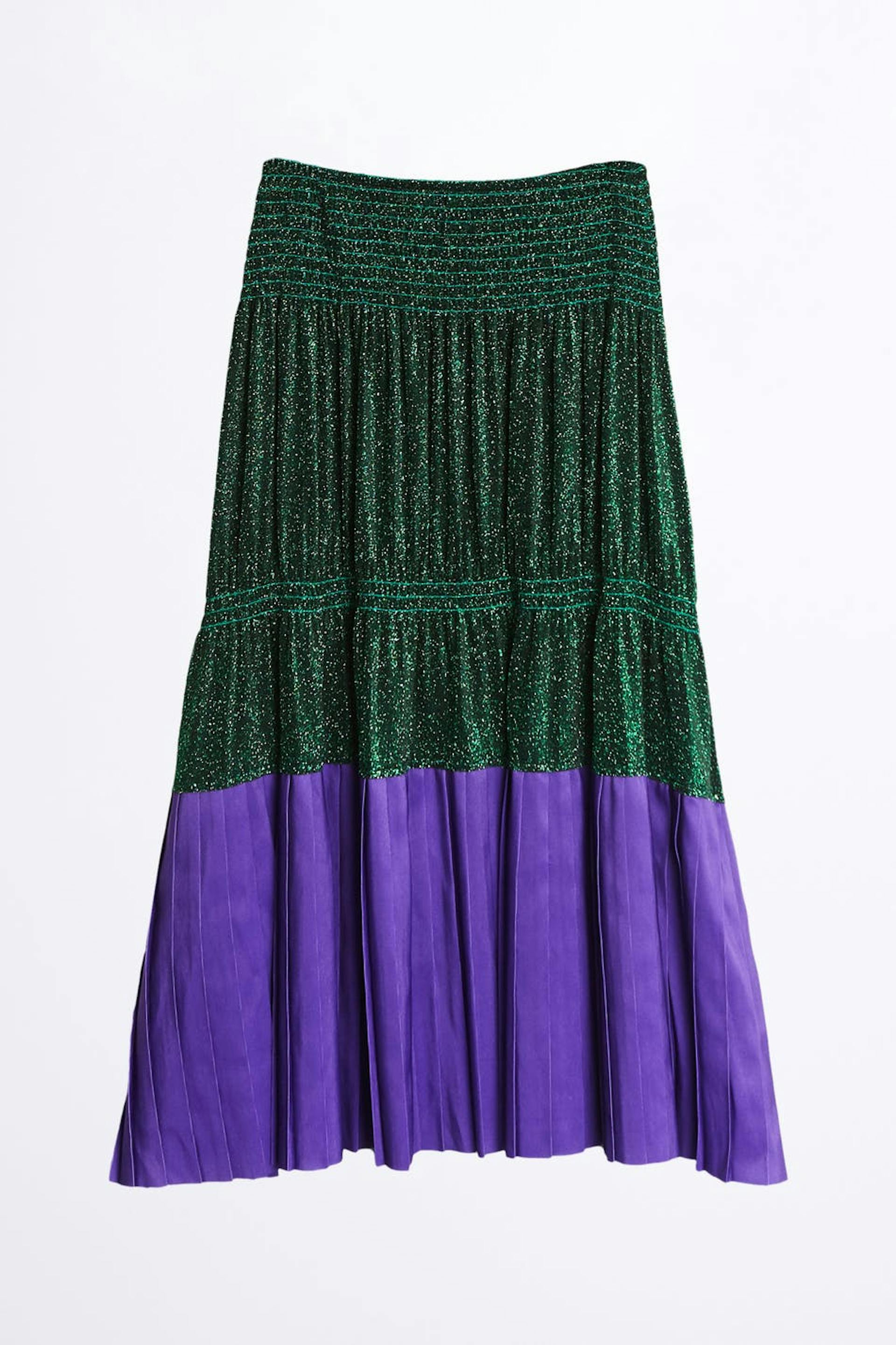 Ruffled skirt with a regular fit. The skirt is green and purple.