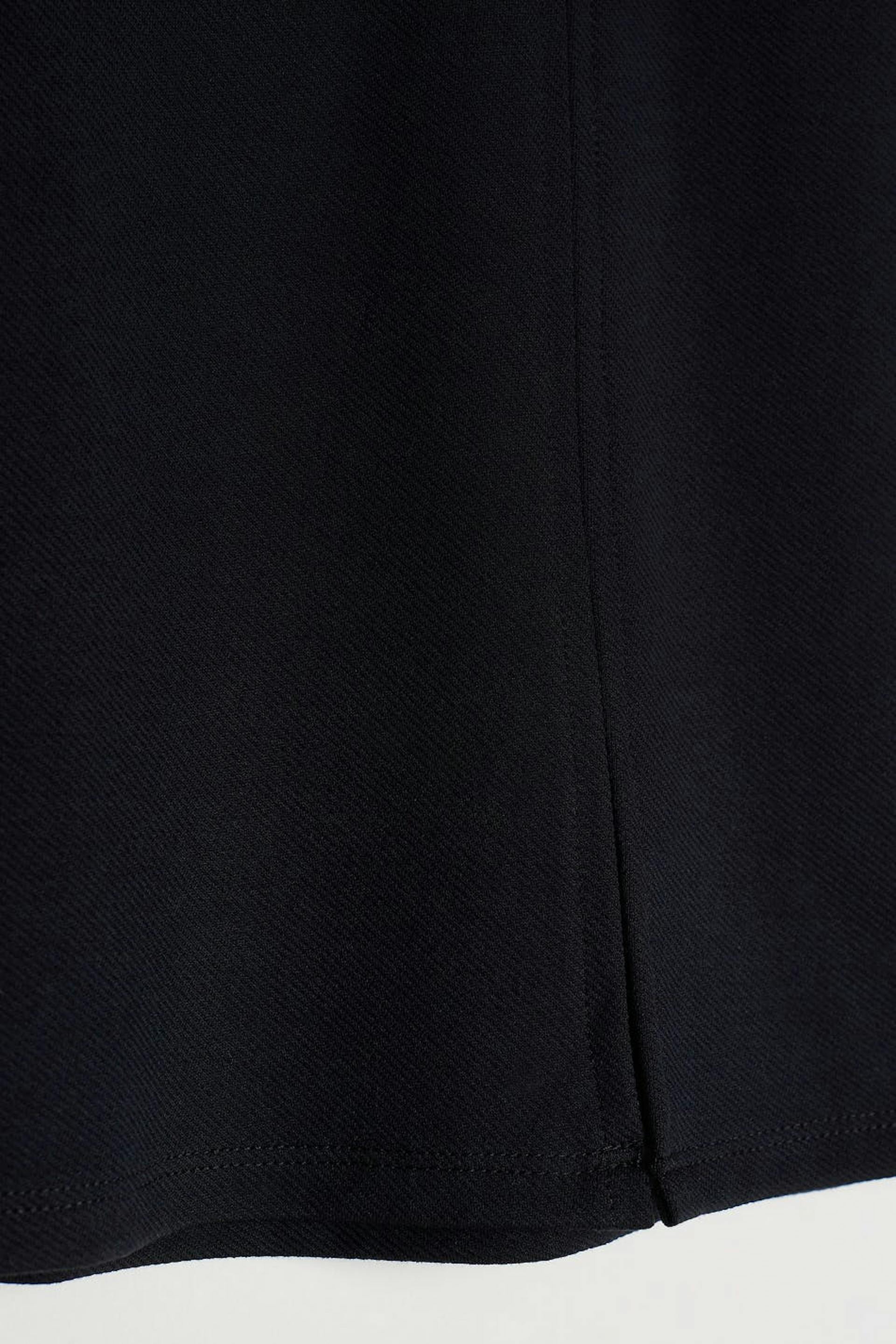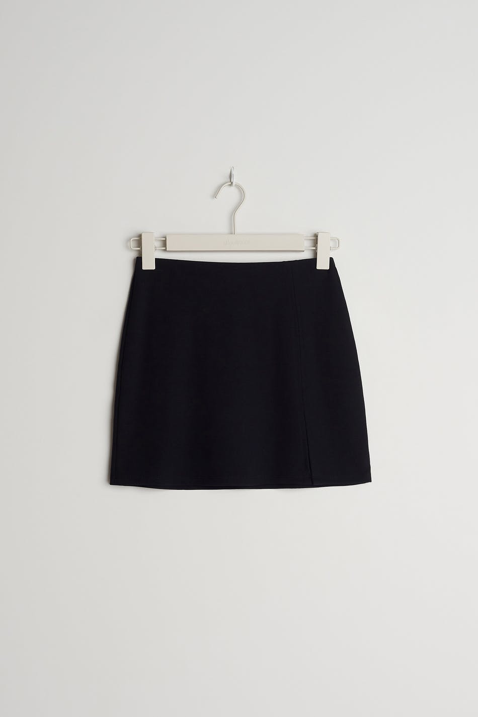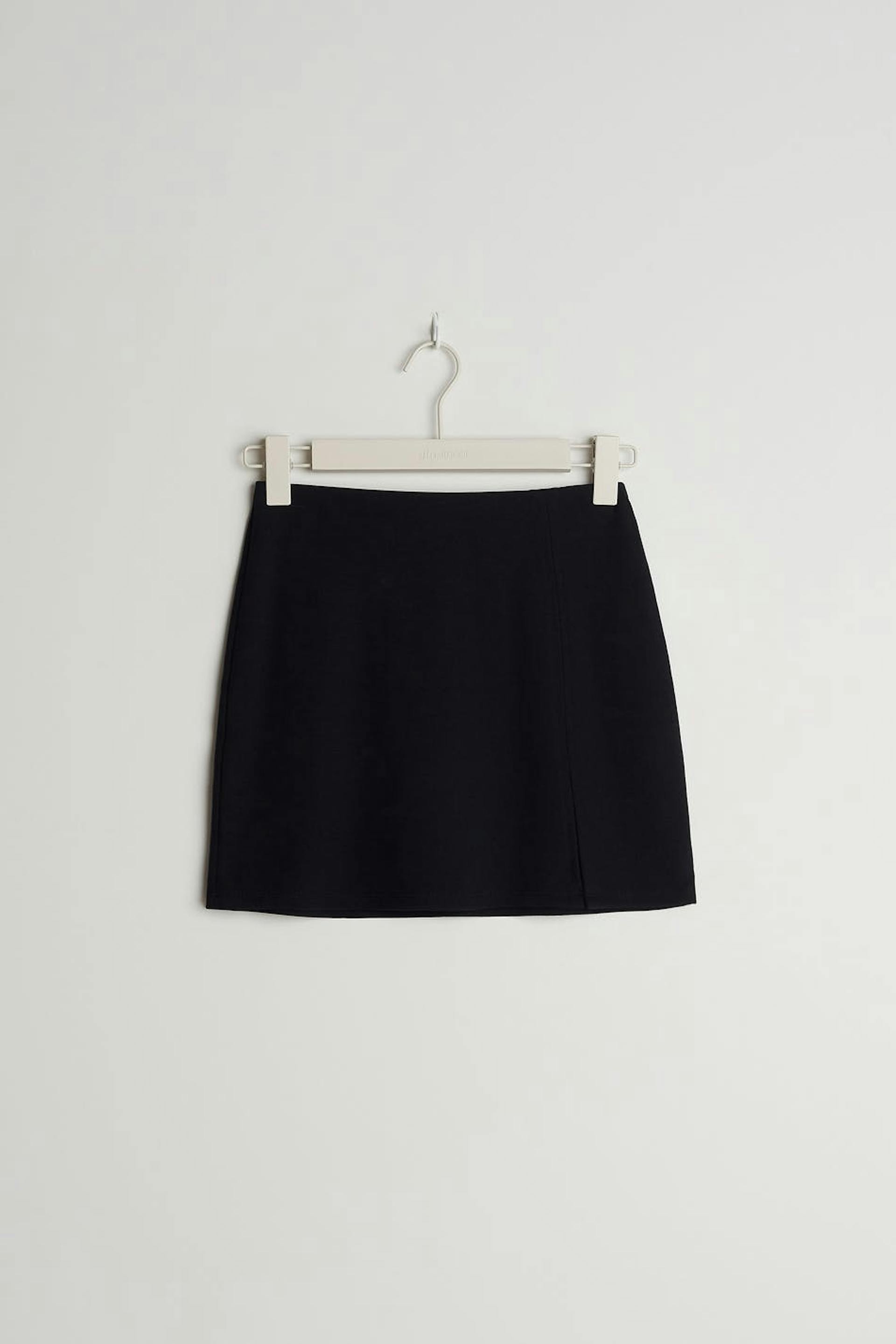 Short skirt with a fitted fit. The skirt is black and has a slit at the side. It has an elastic at the waist.
