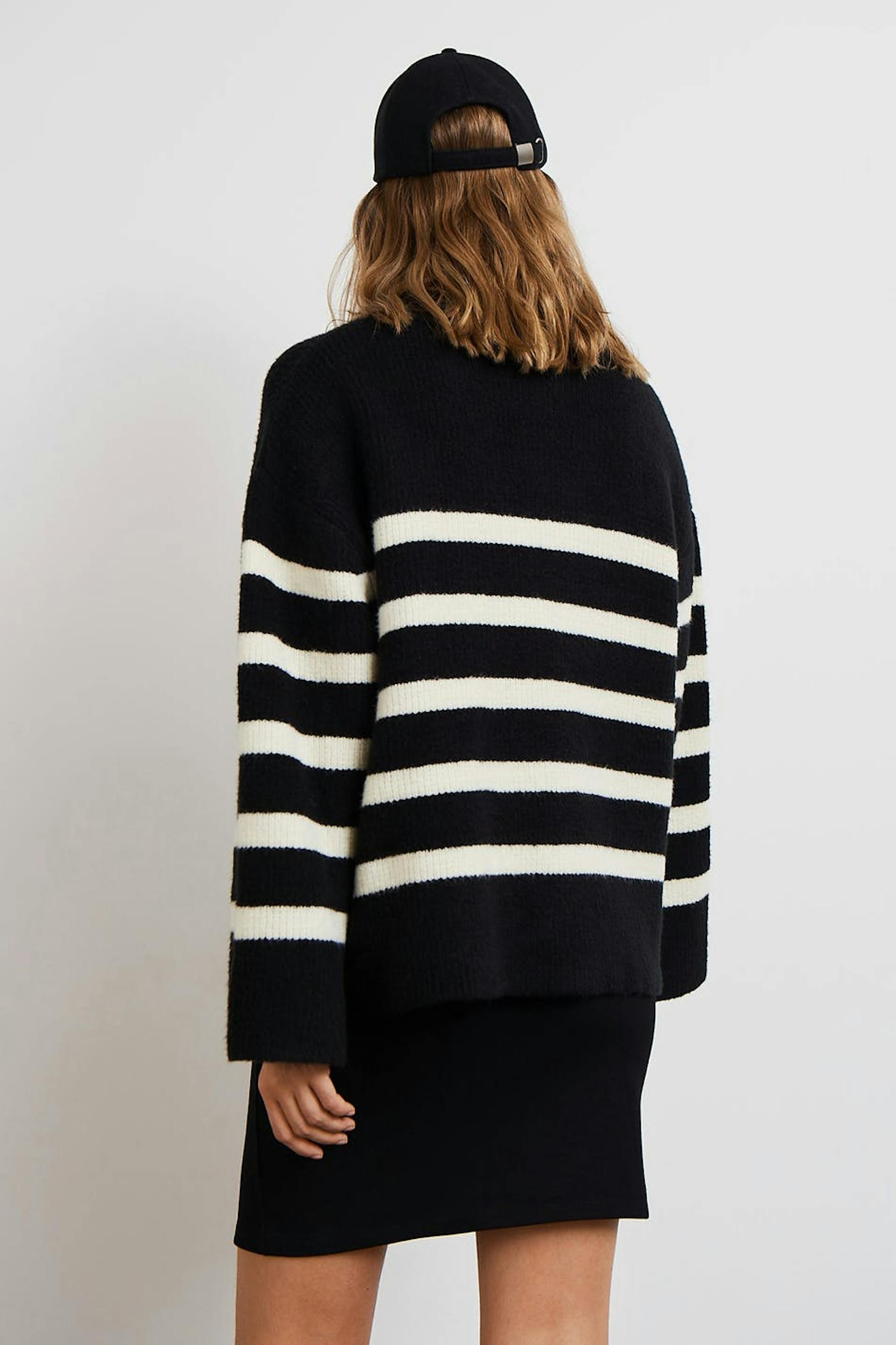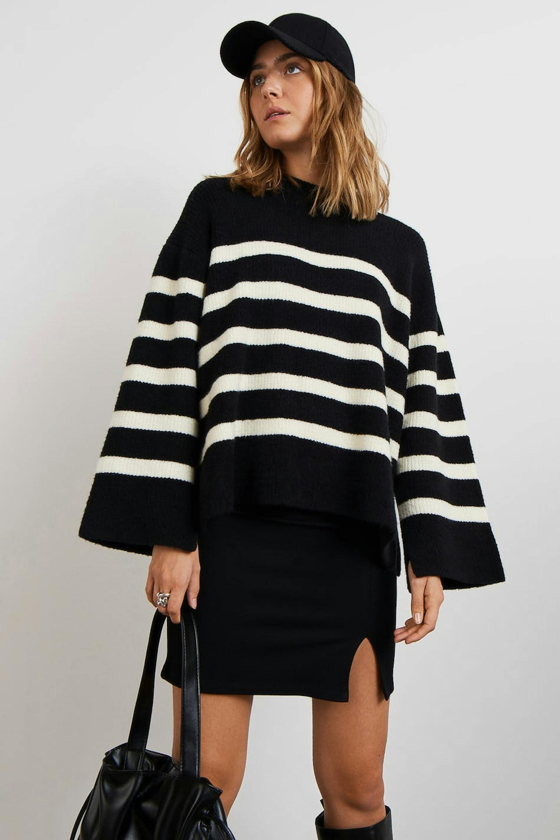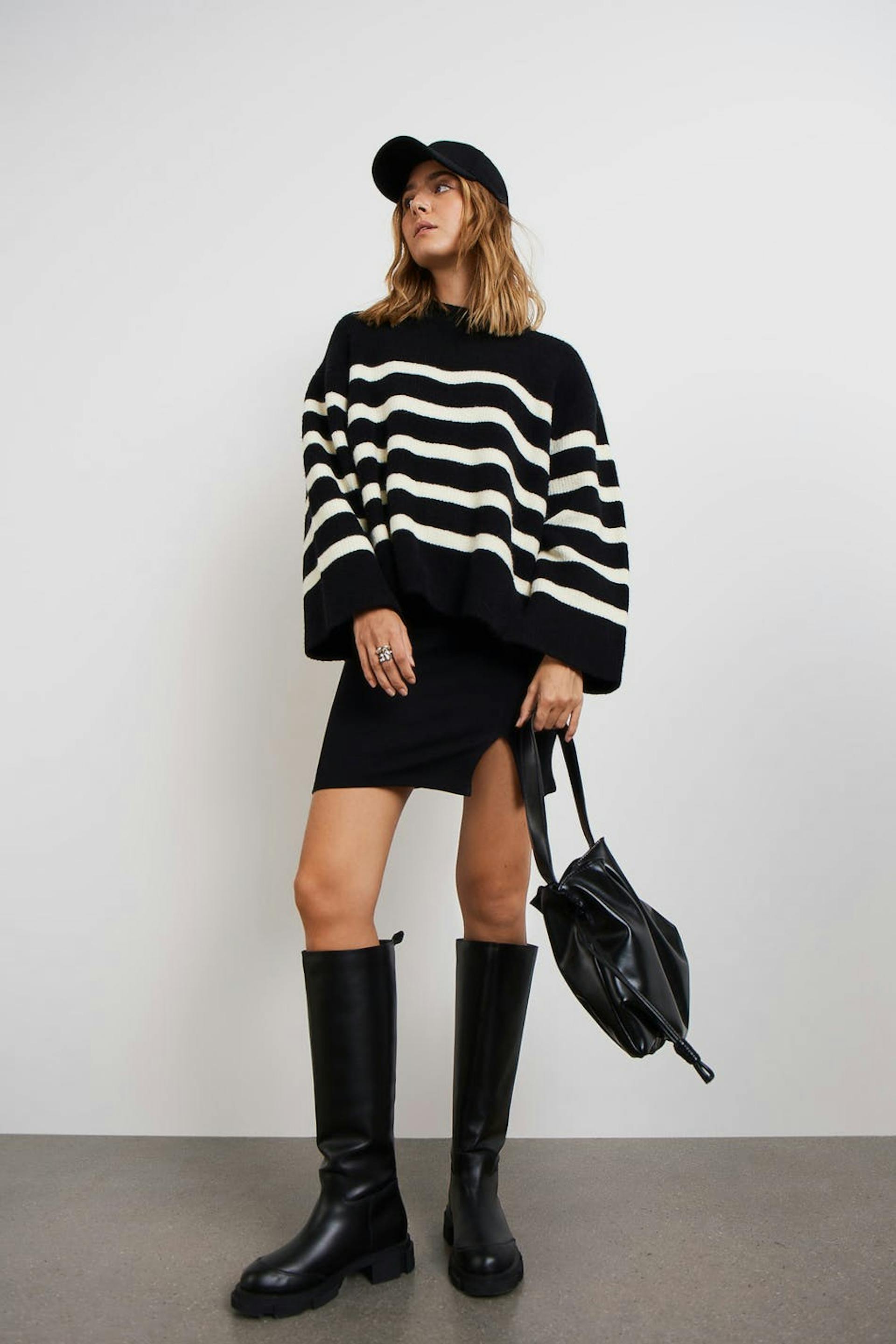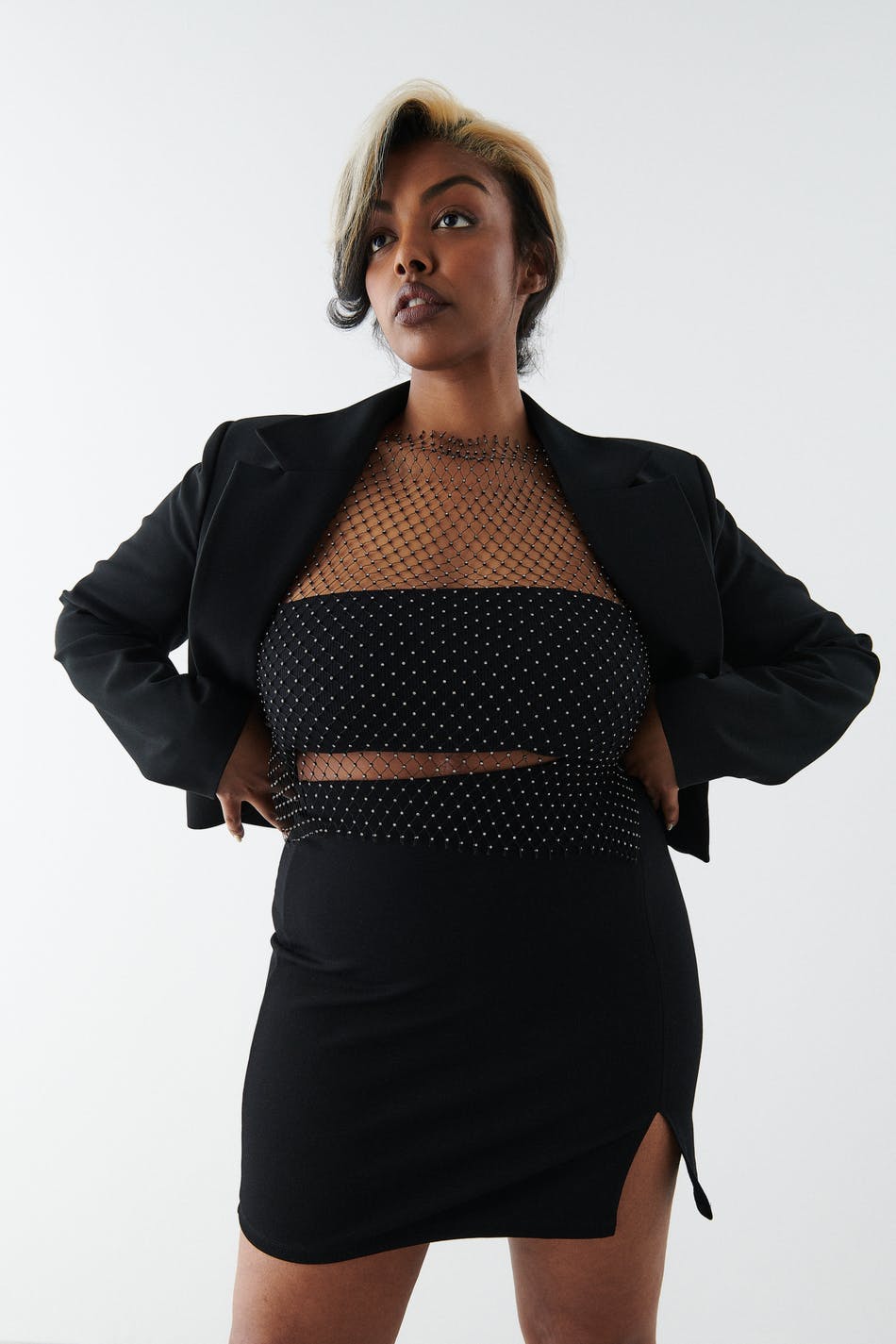 Short skirt with a fitted fit. The skirt is black and has a slit at the side. It has an elastic at the waist.
