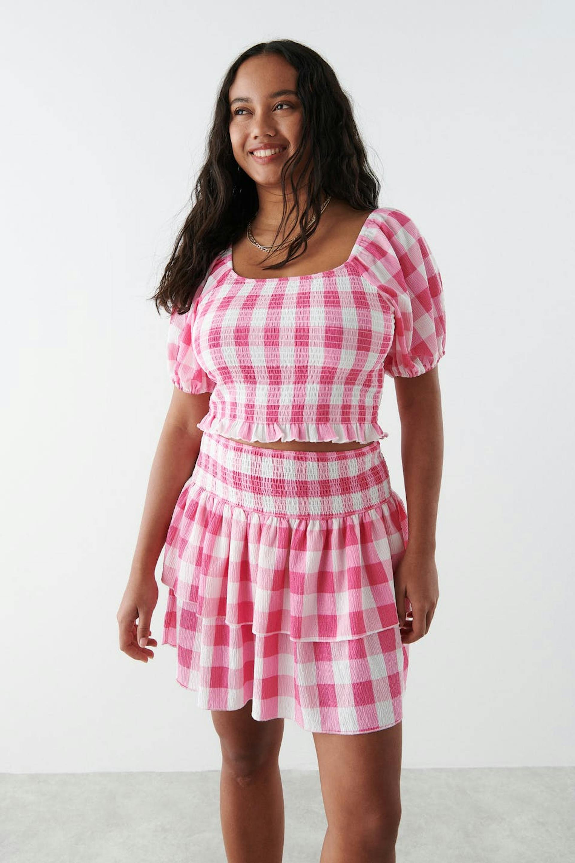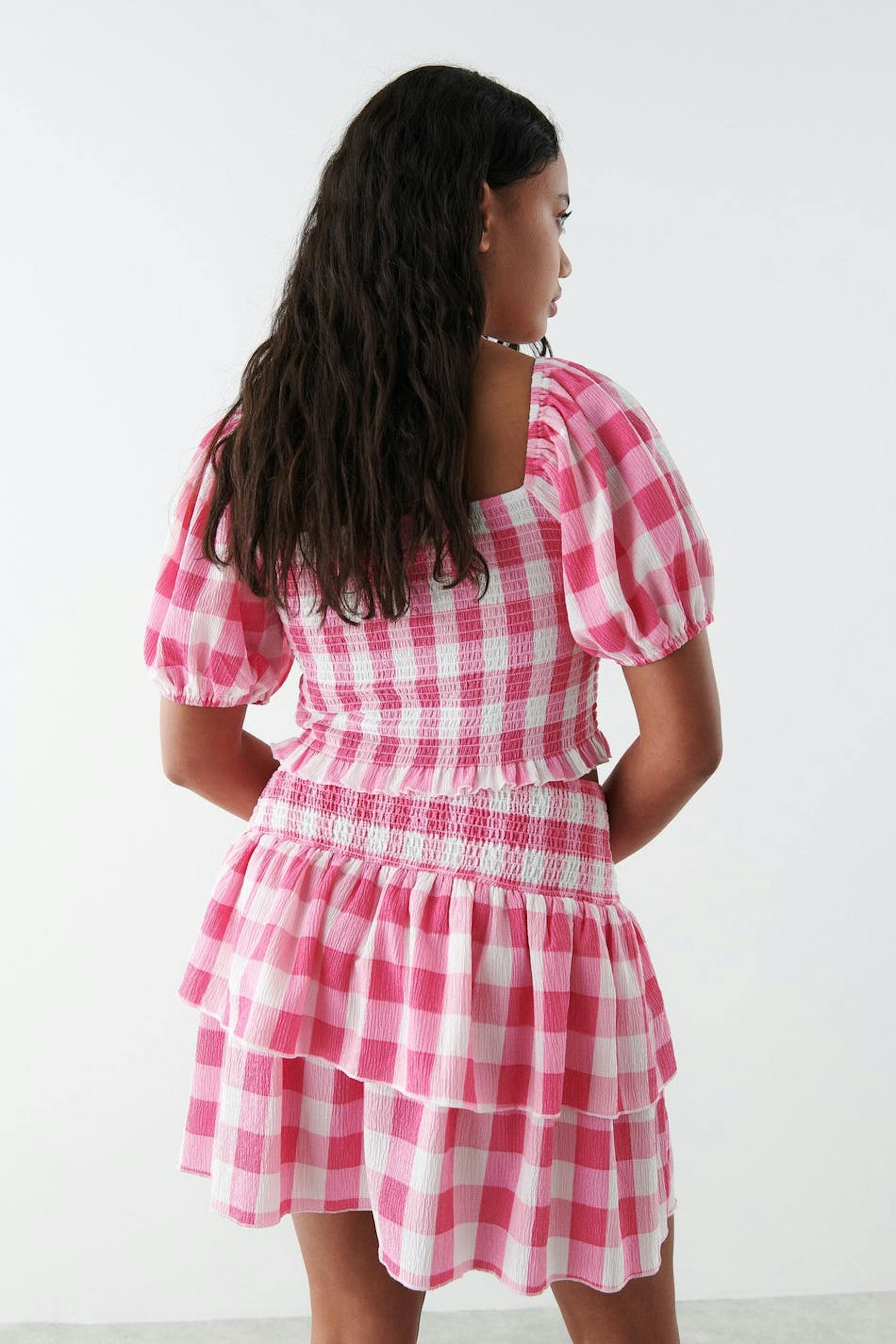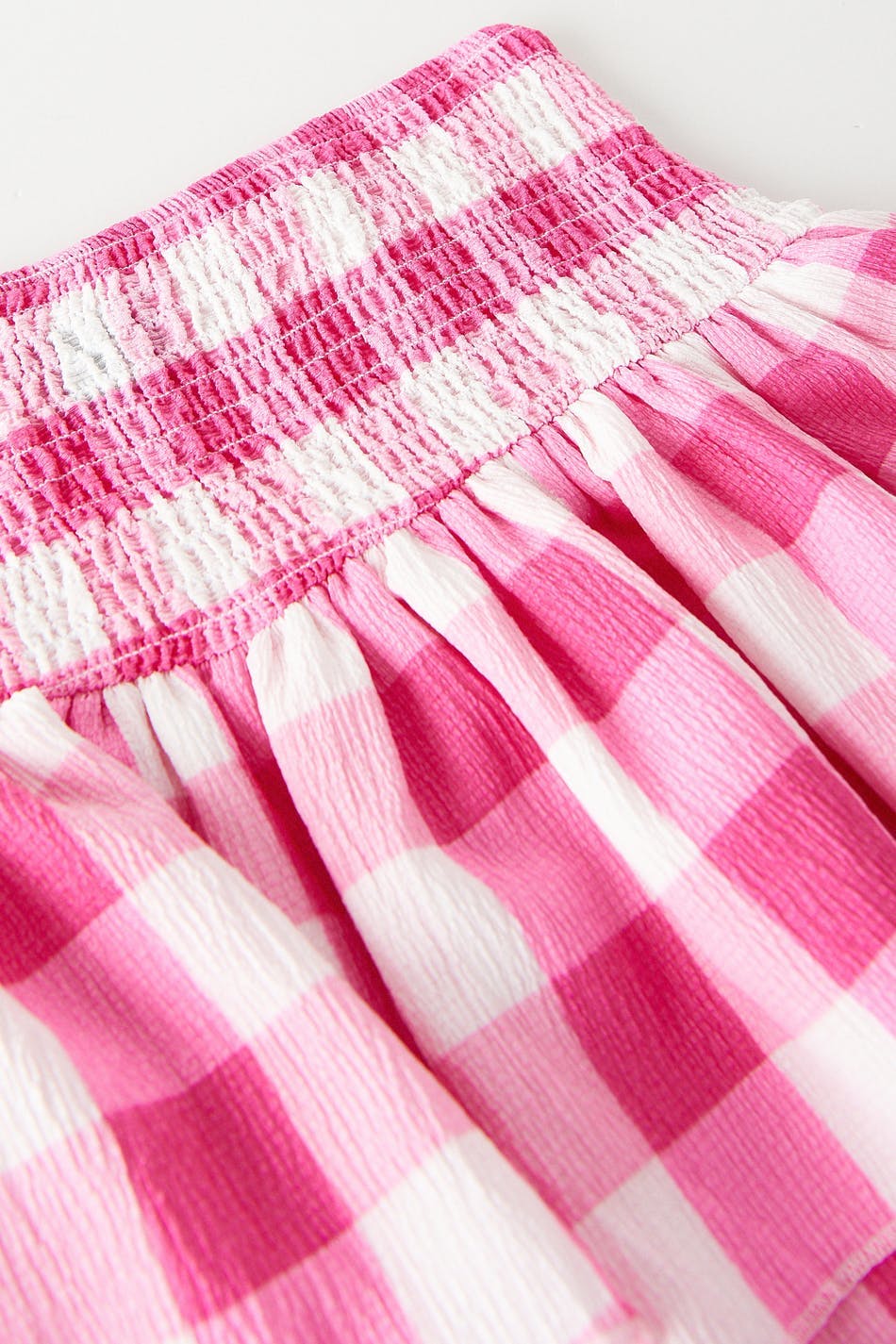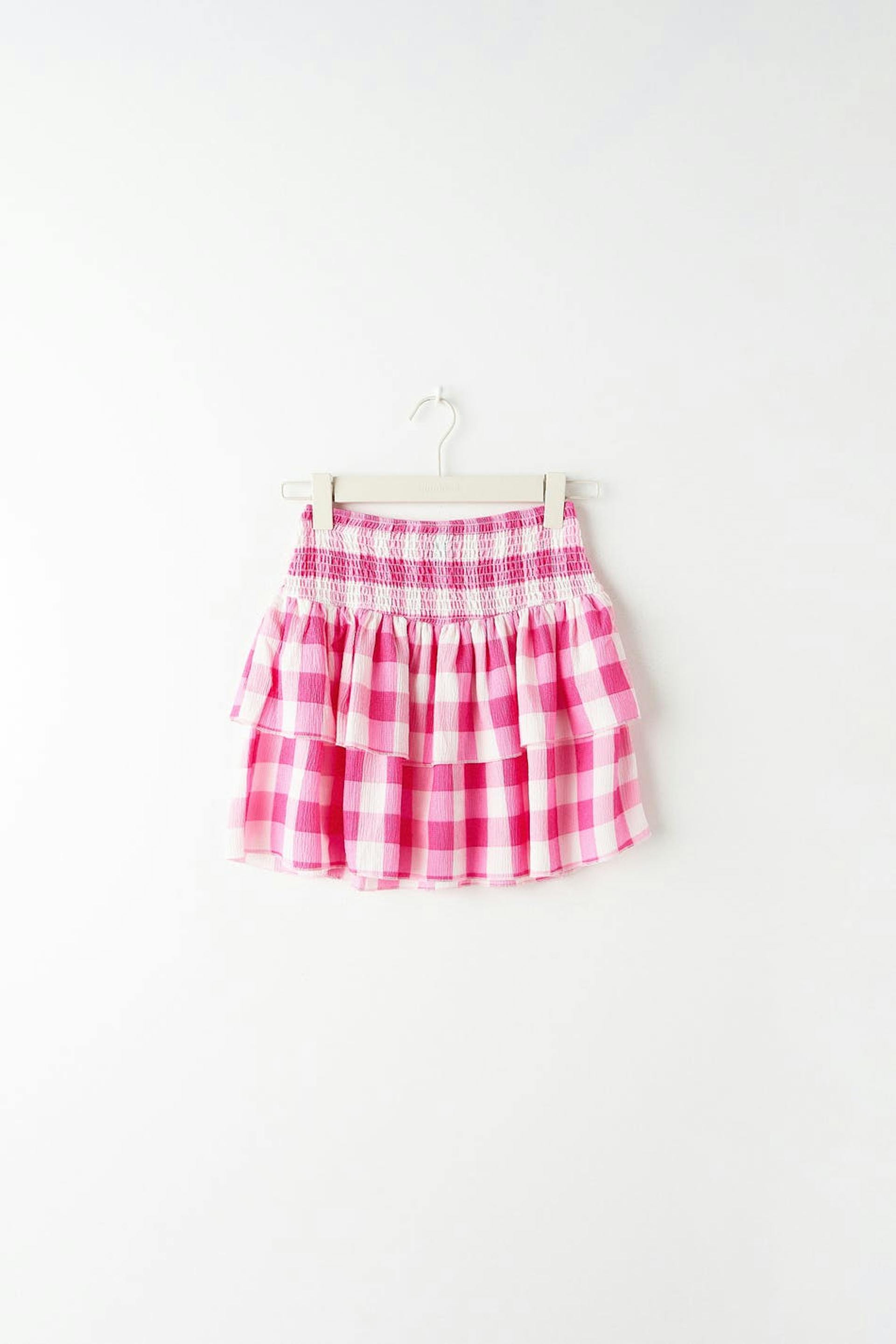 Short skirt with a regular fit. The skirt is pink and has a smocking at the waist. It has frills at the bottom.
