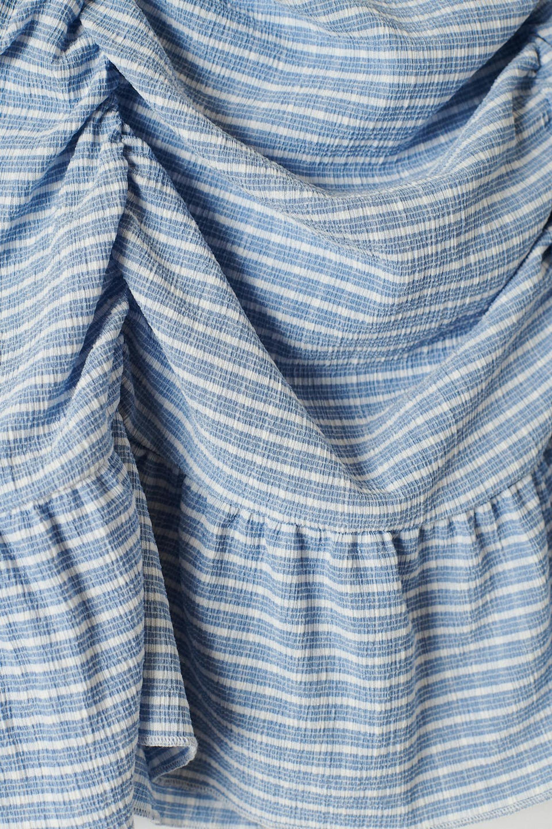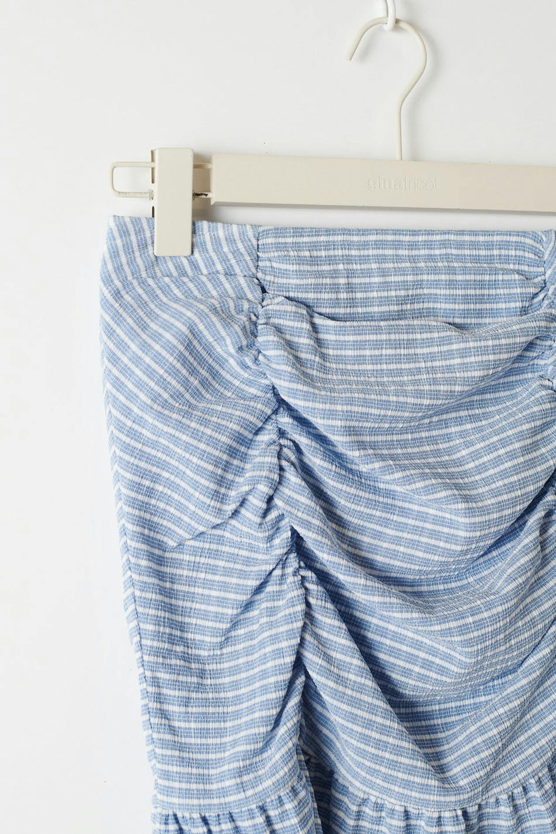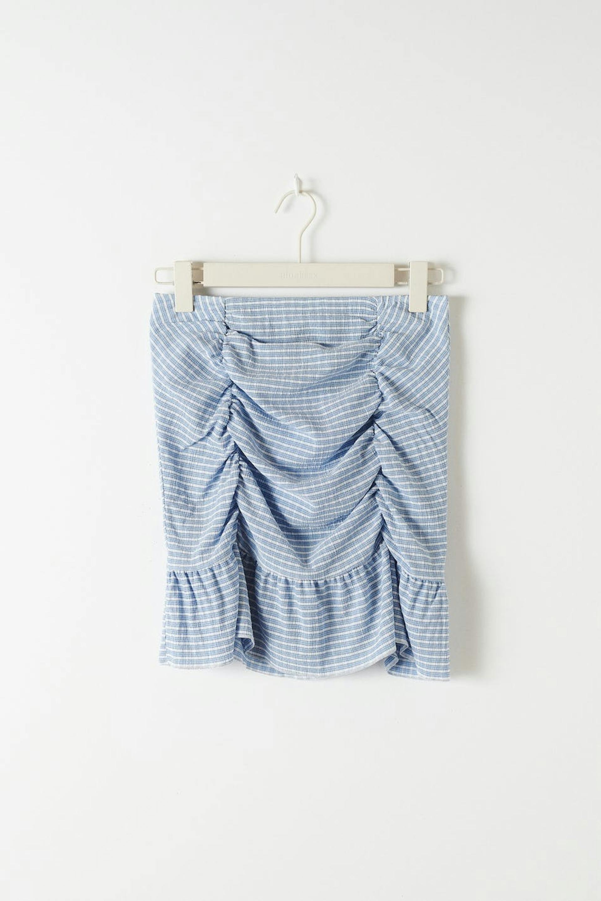 Short skirt in jersey with a fitted fit. The skirt is blue and has ruching at the front. It has a frill at the bottom and an elastic waist.