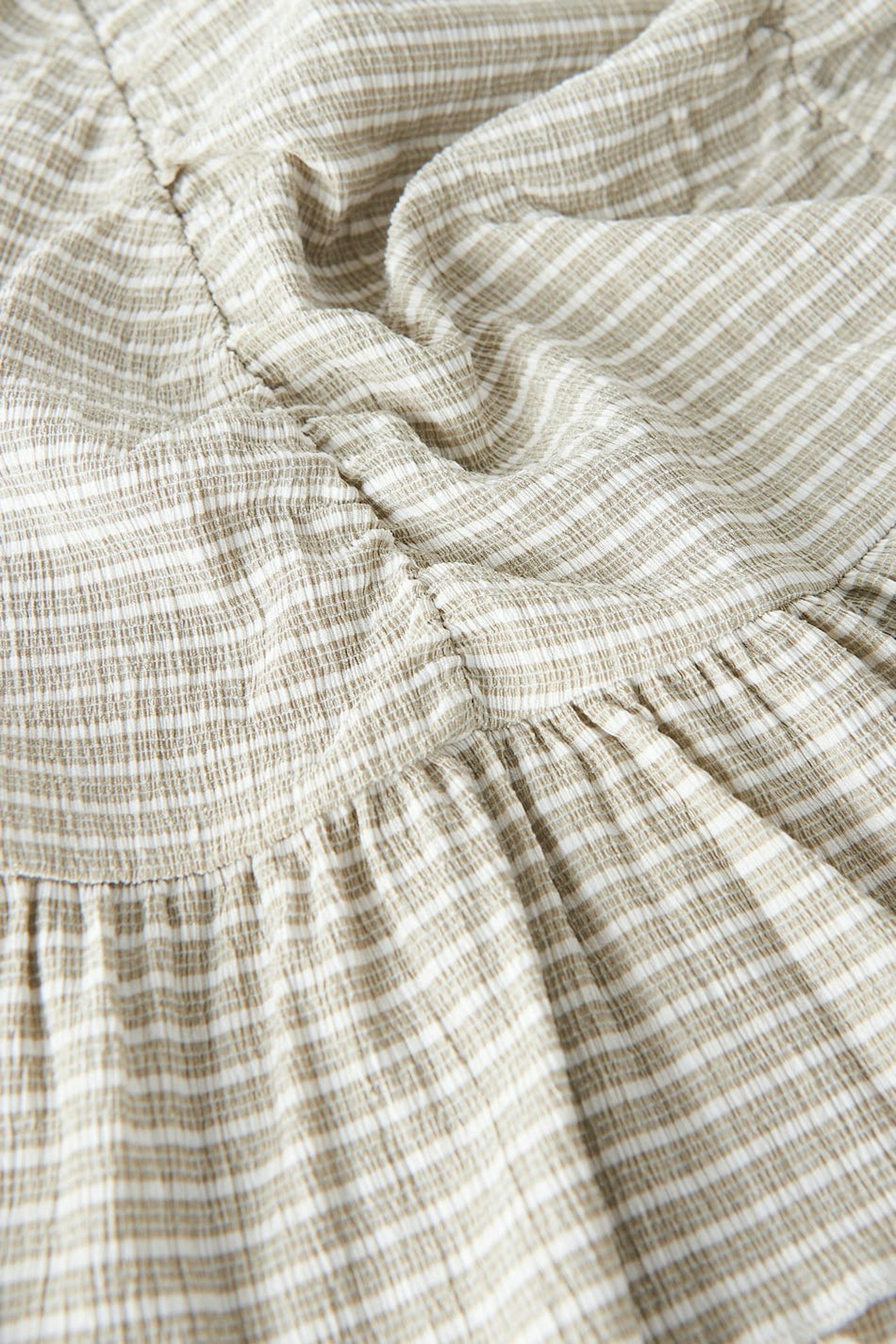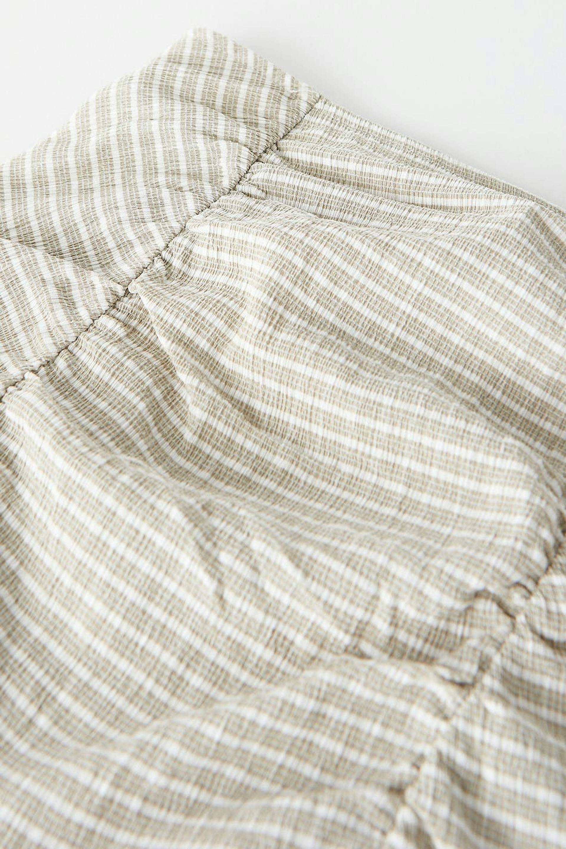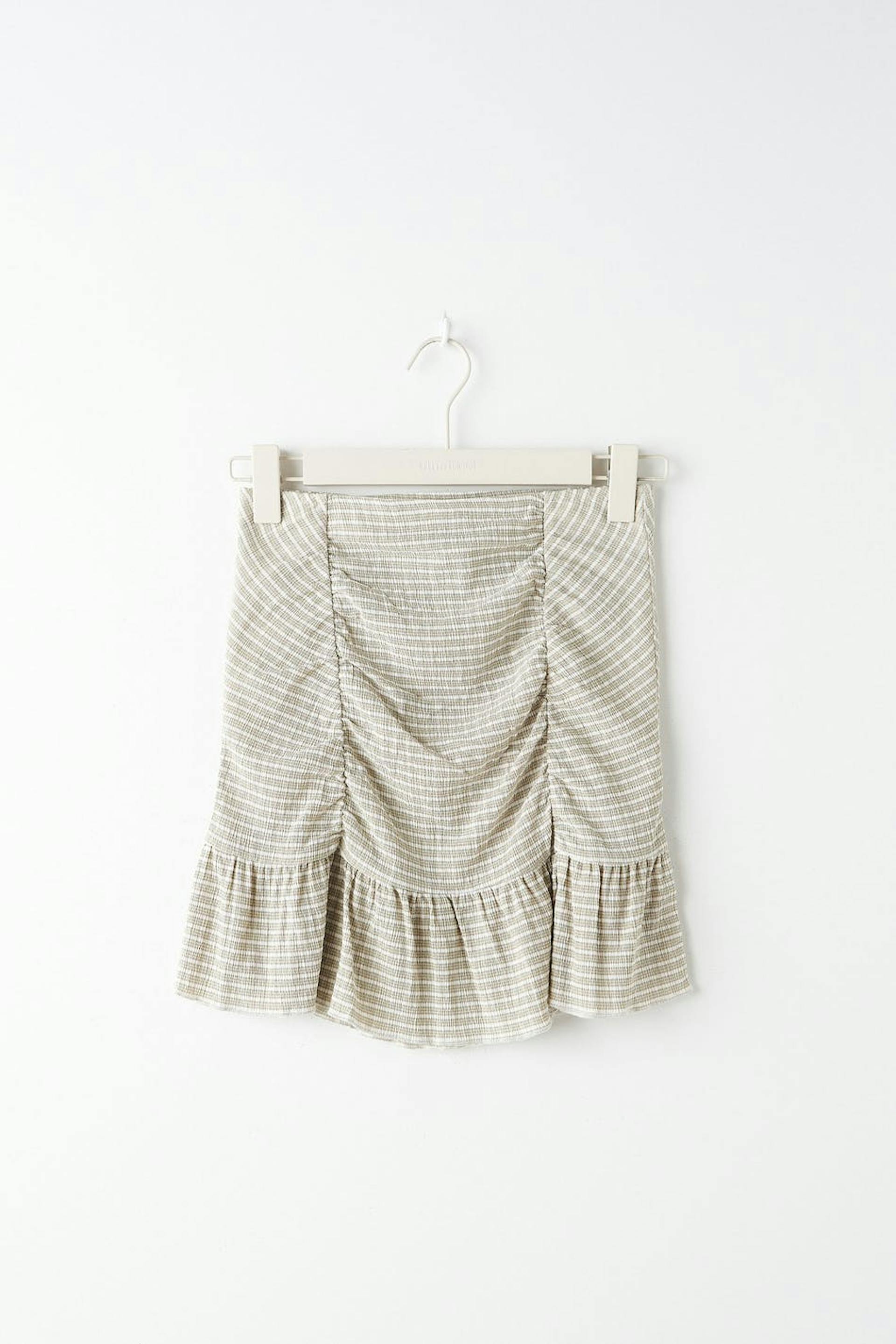 Short skirt in jersey with a fitted fit. The skirt is beige and has ruching at the front. It has a frill at the bottom and an elastic waist.