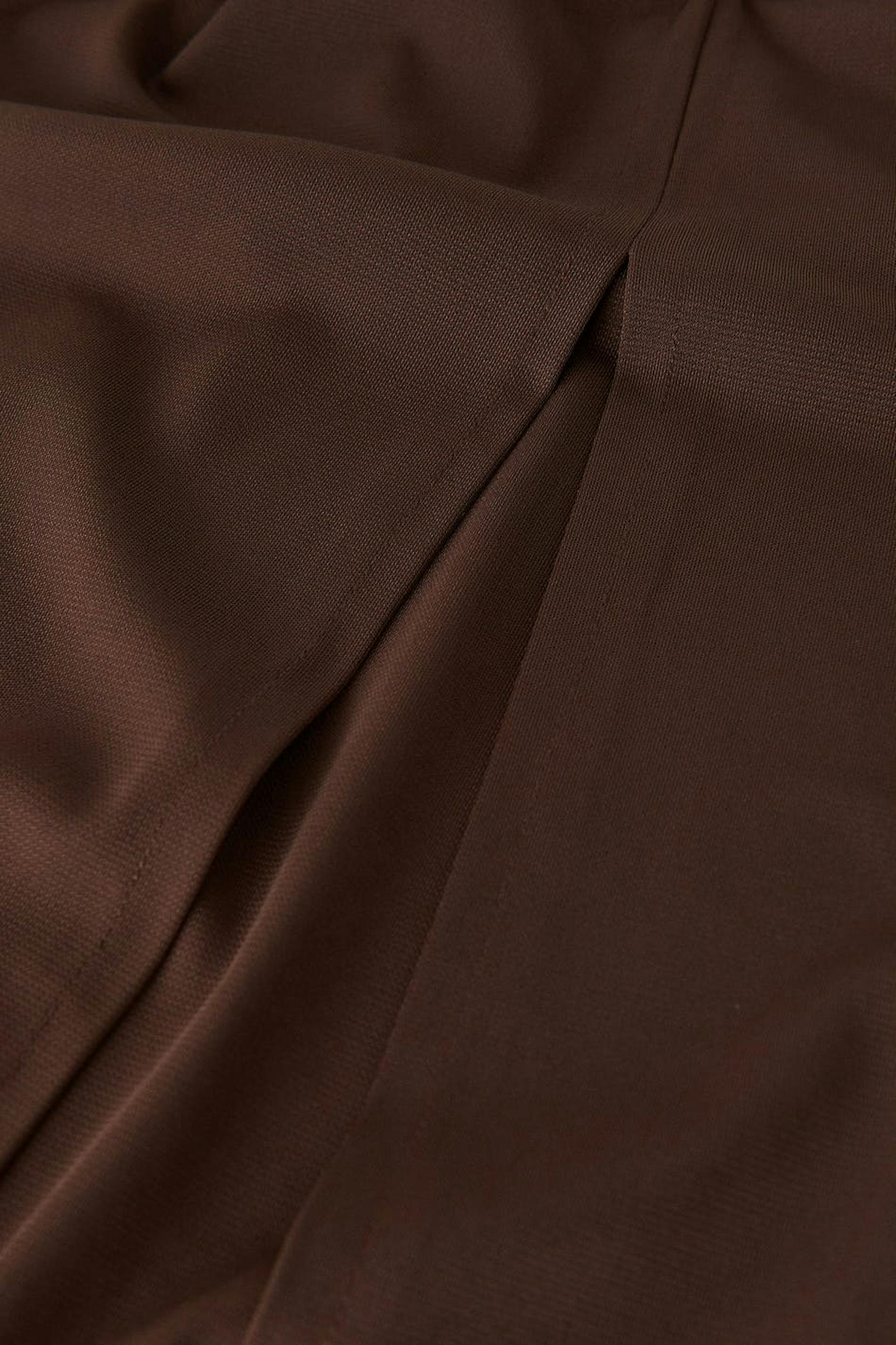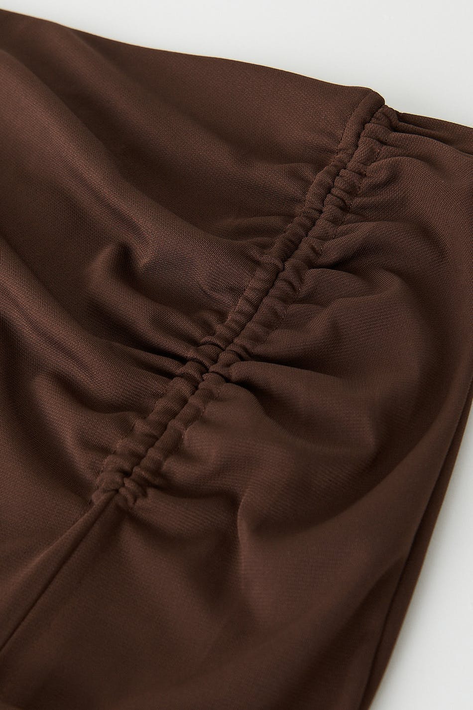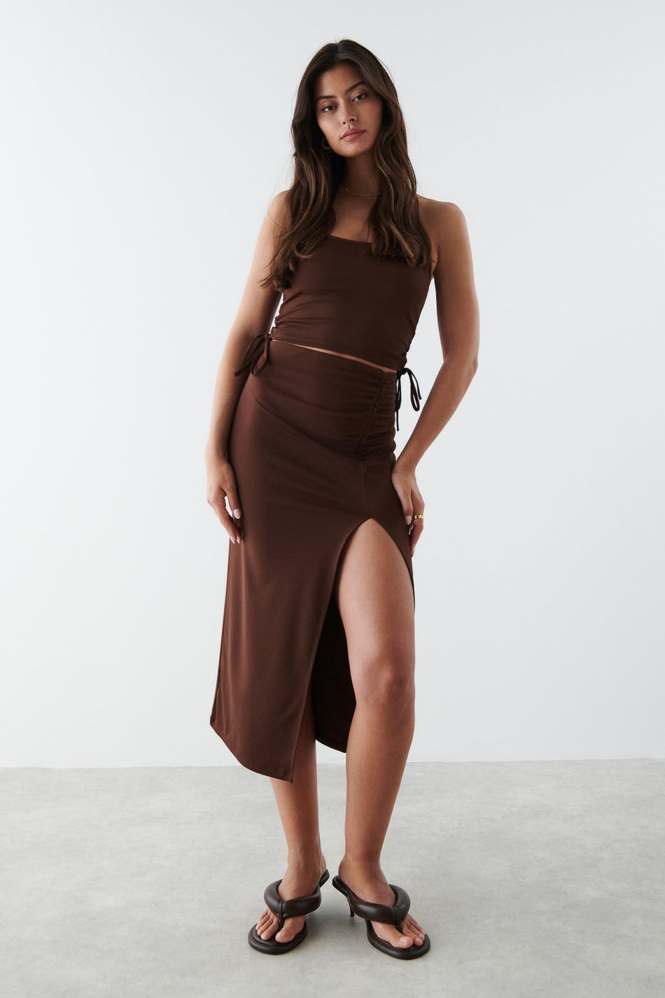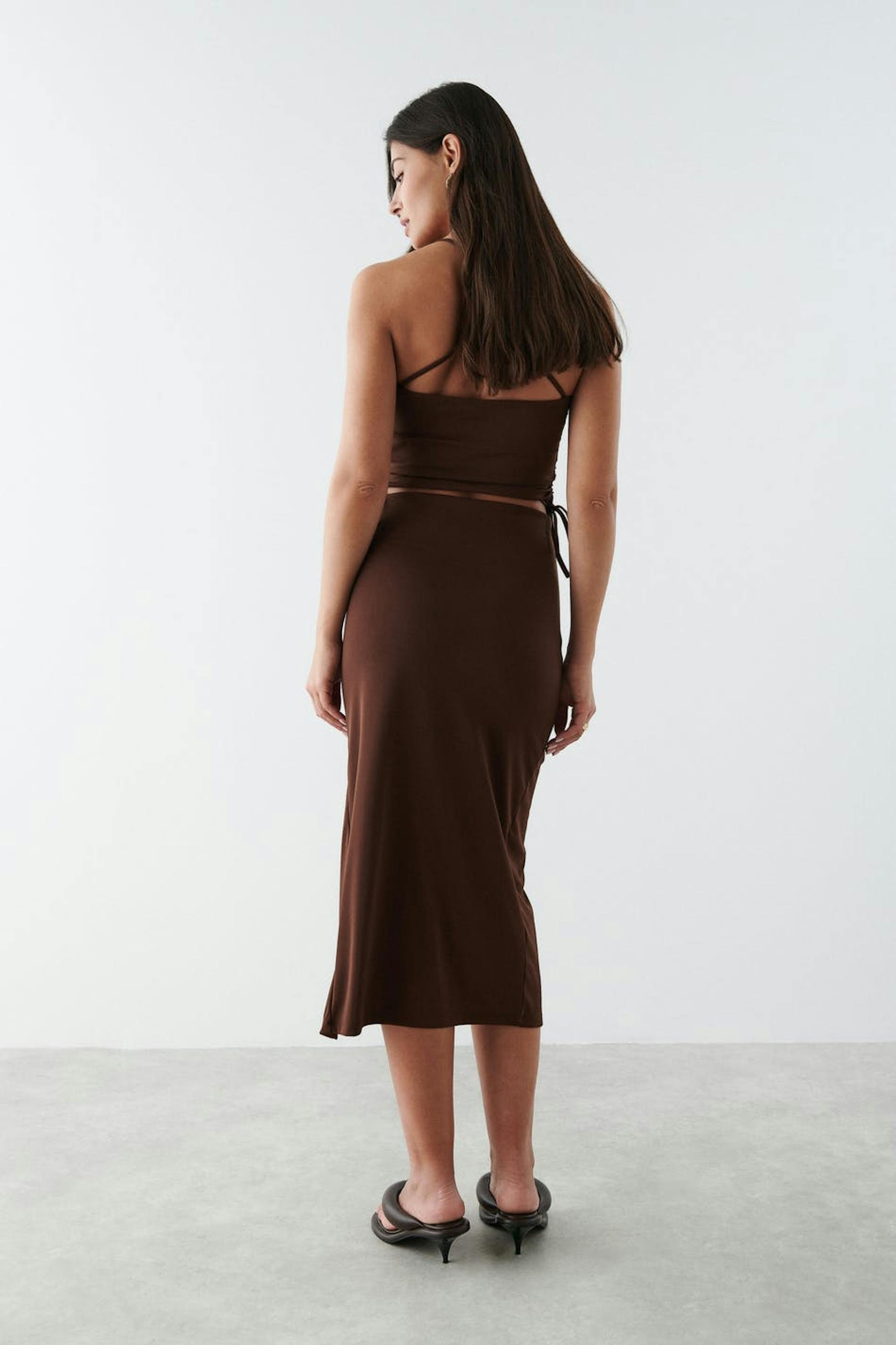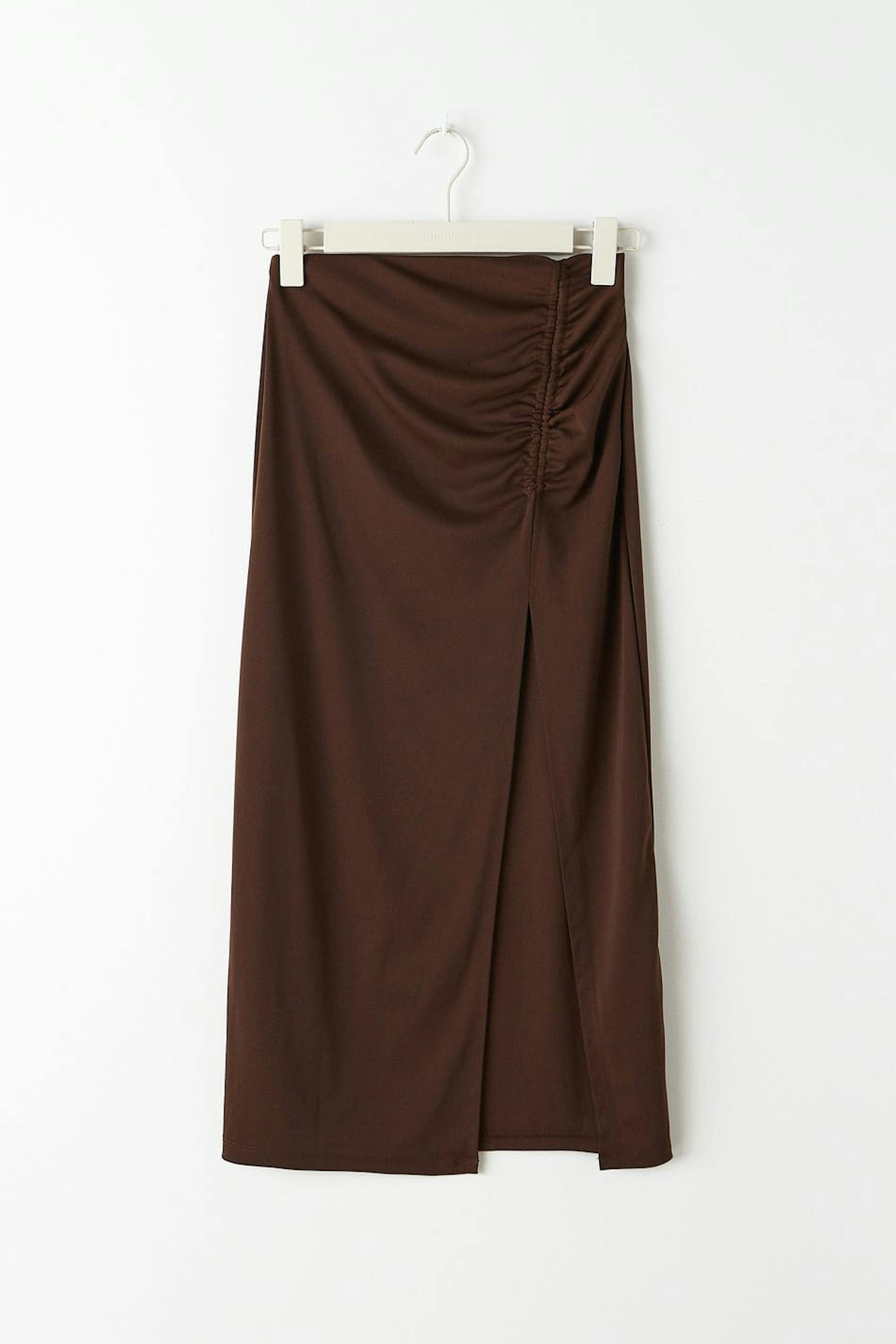 Midi skirt in recycled polyester with high slit at the front. The skirt is brown and has a fitted fit. It has a gathered effect at the side with an adjustable drawstring.