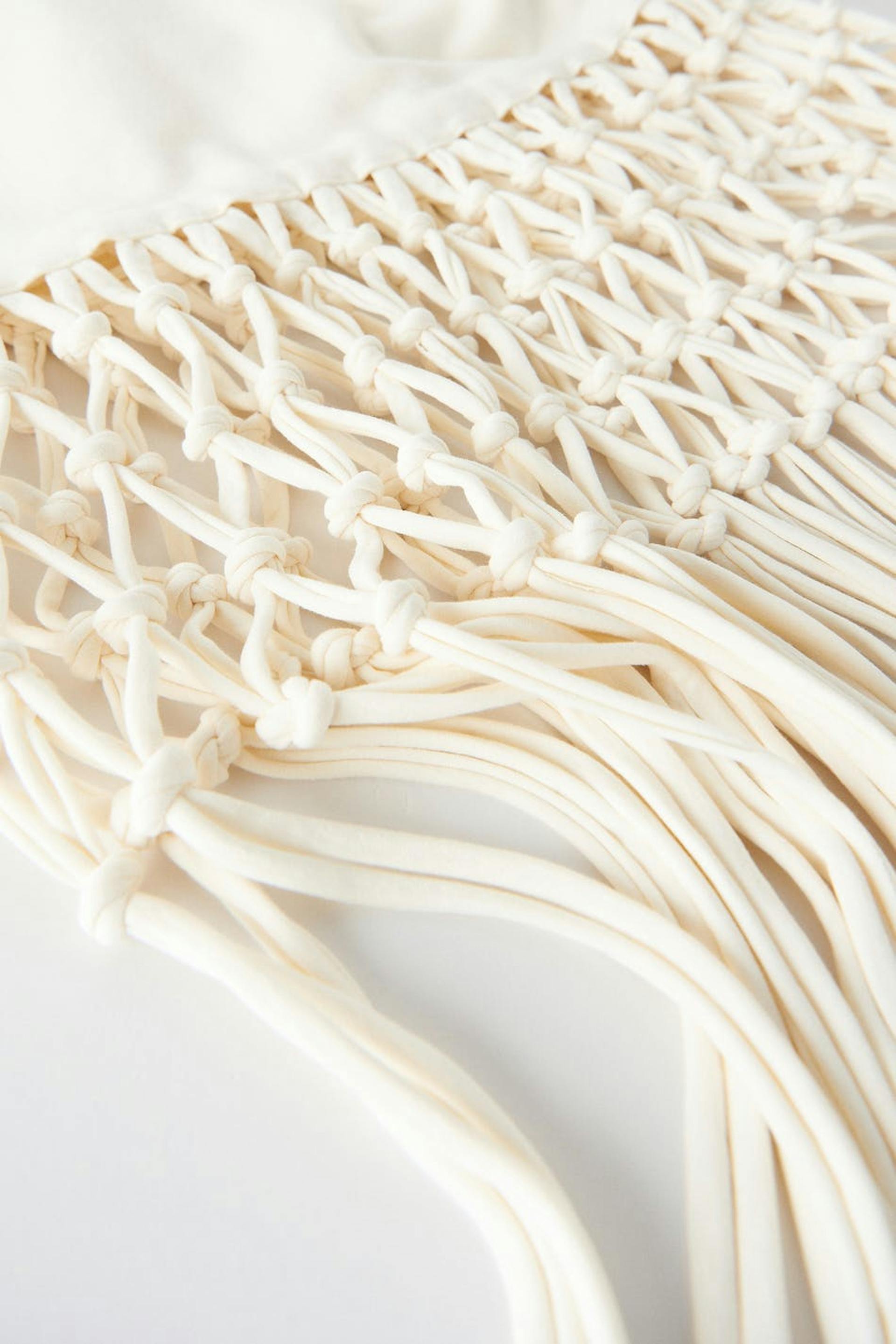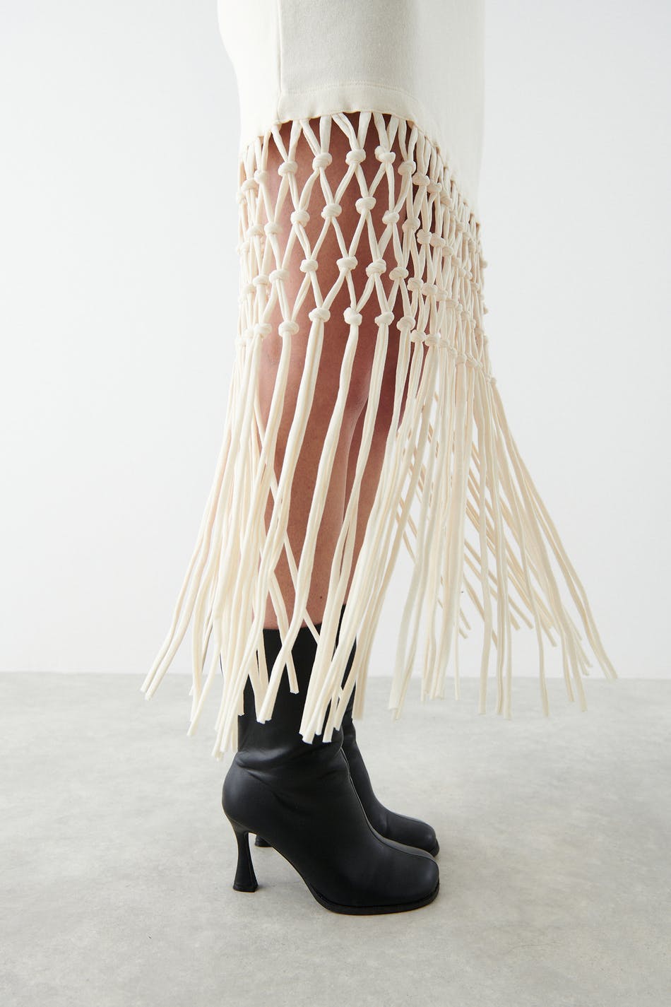 Jersey dress with a fitted fit. The jersey dress is white and has long fringes. It has an elastic waist.