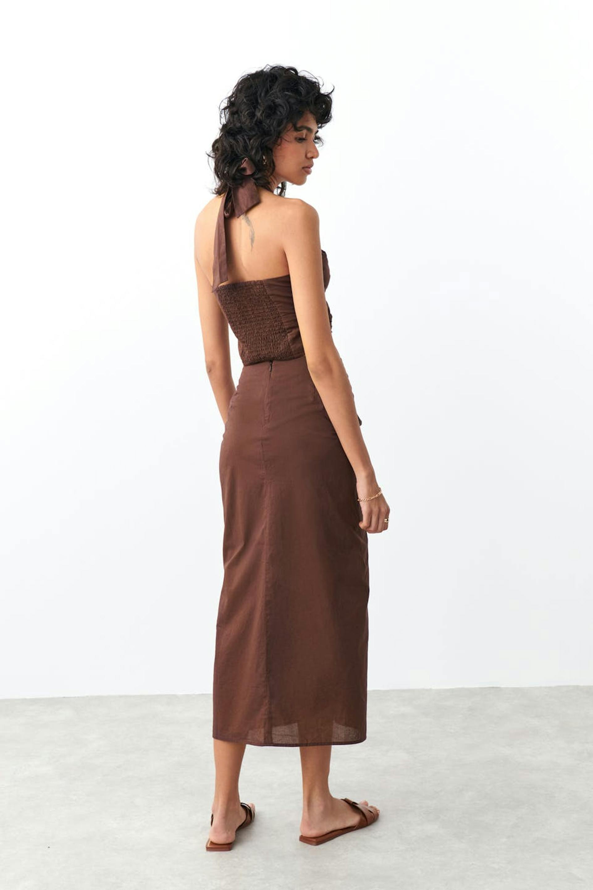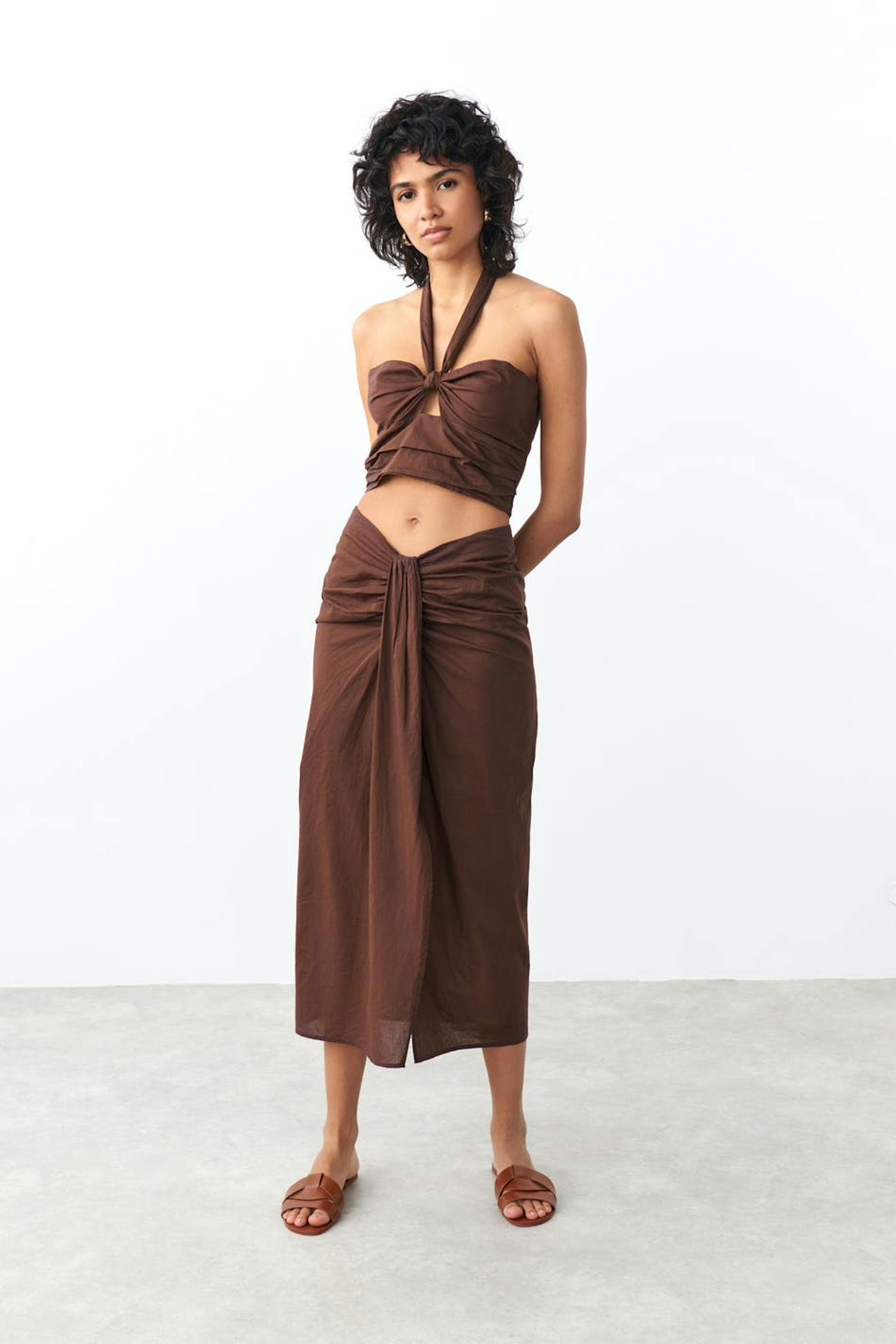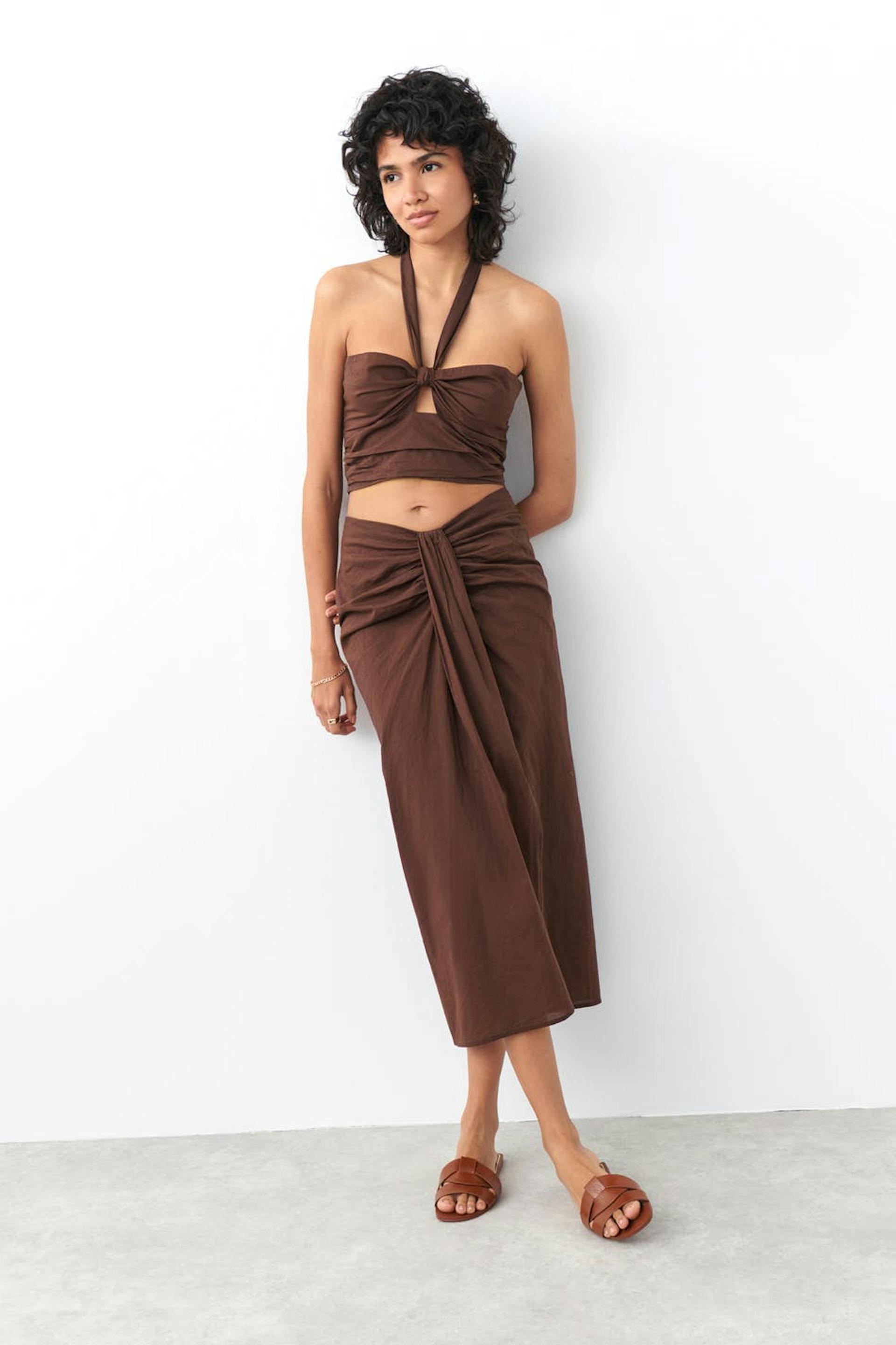 Midi skirt with twisted detail at the front. The skirt is brown and has zip at the back.