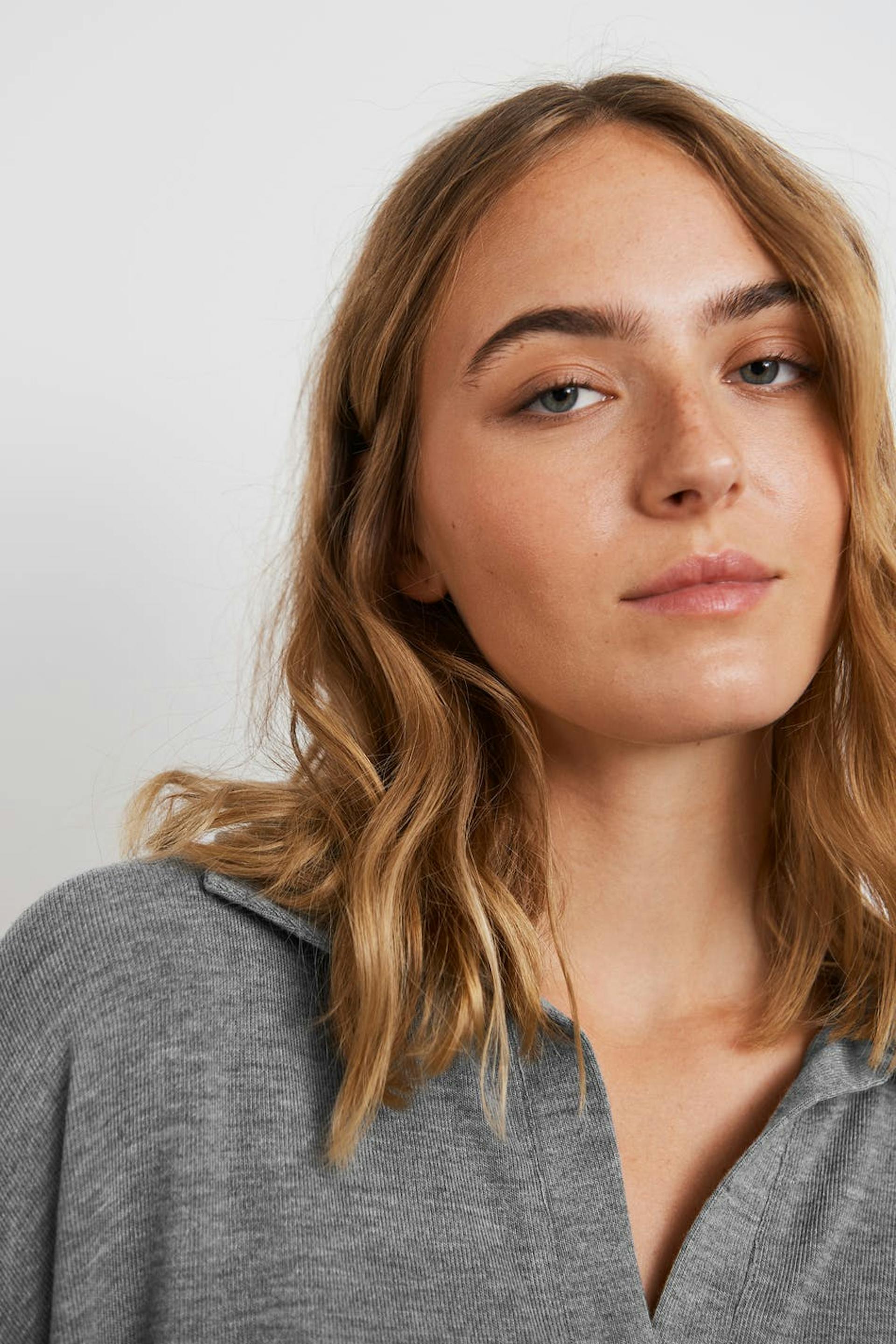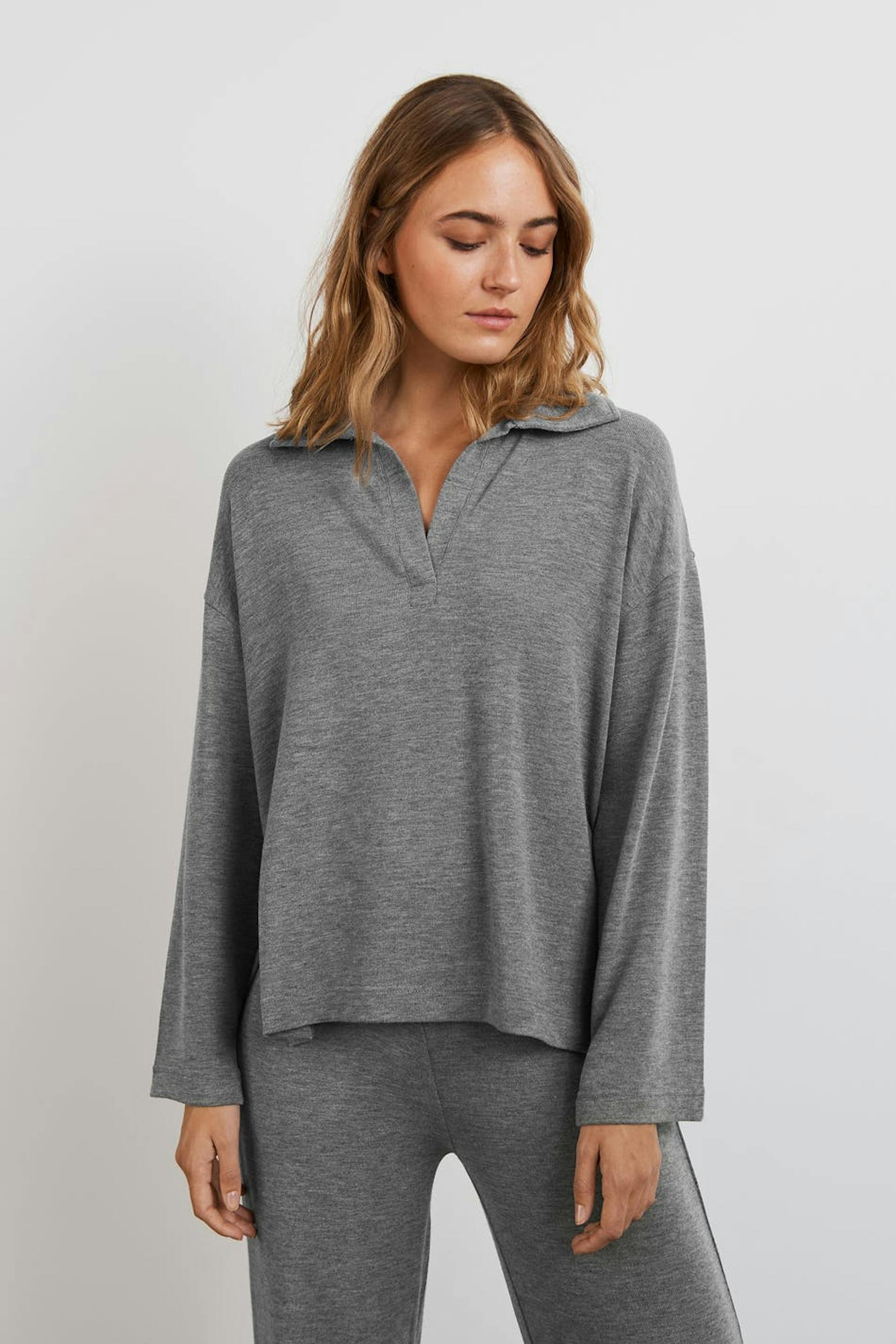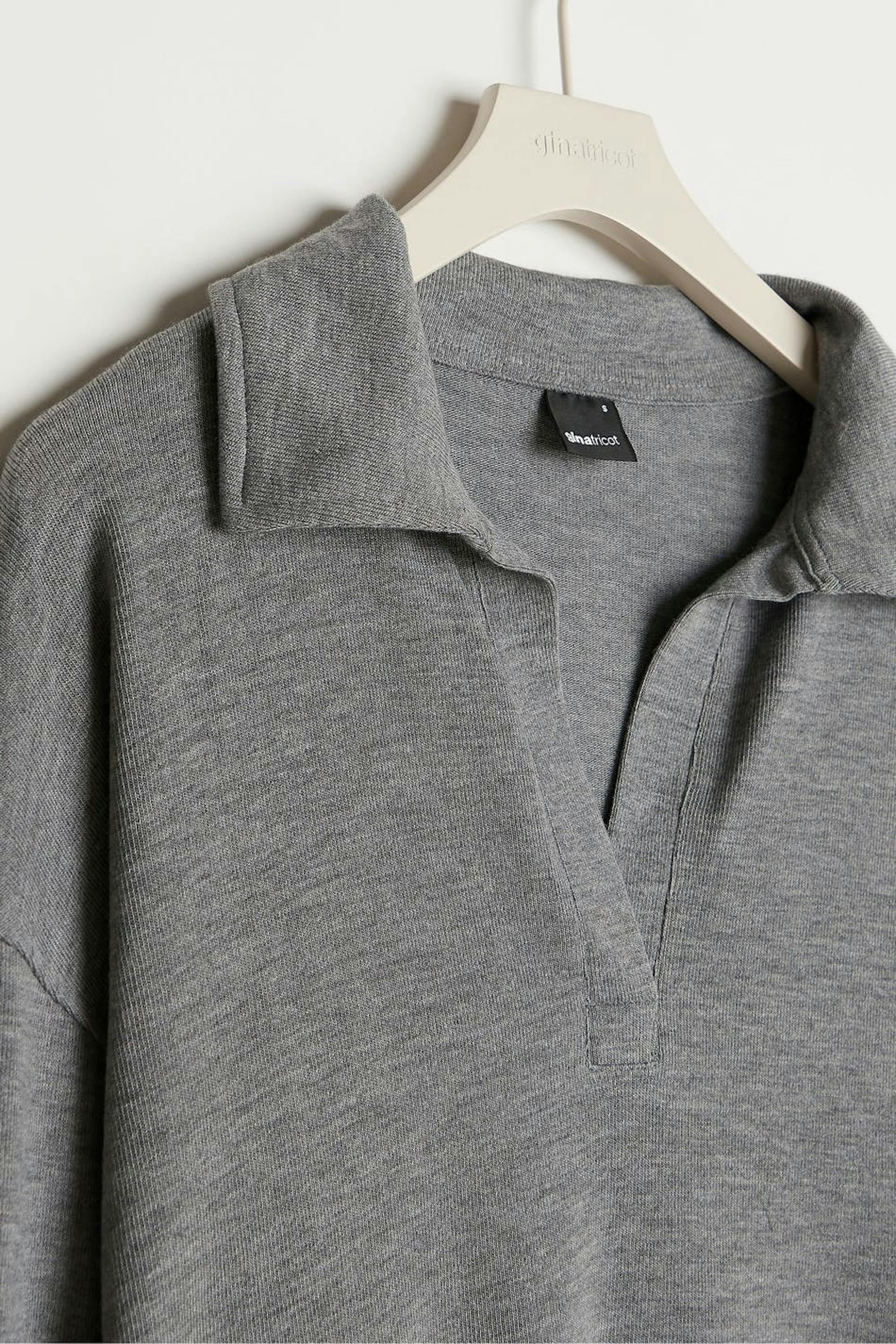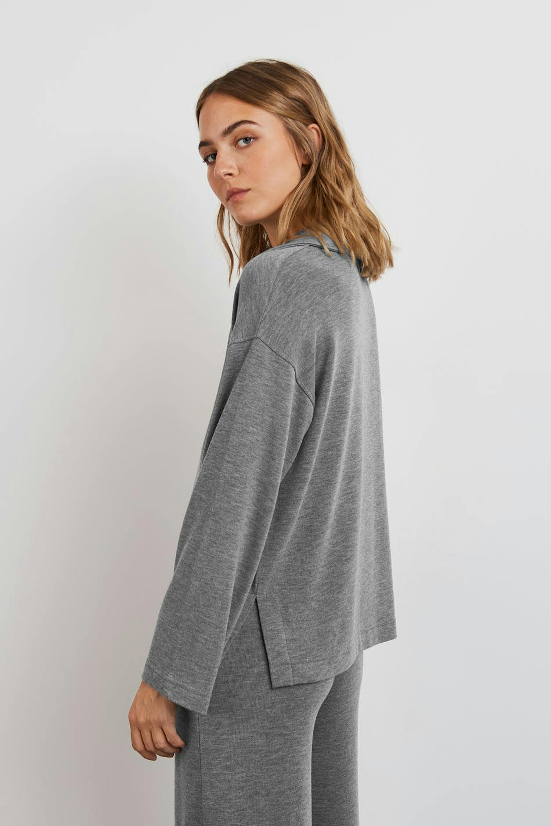 Sweat with an oversize fit. The sweat is grey and has a soft quality in jersey. It has a V-neck, a collar, dropped shoulders, slit on the sides and wide, long sleeves.