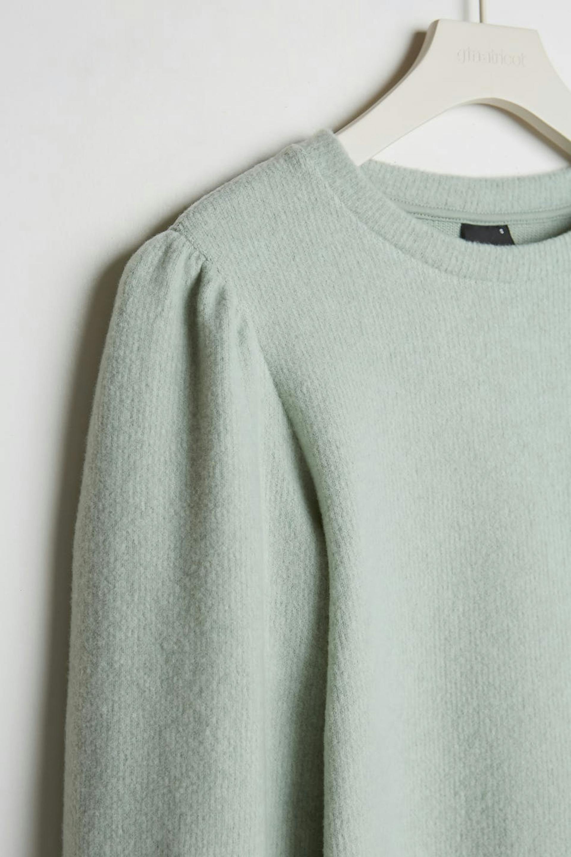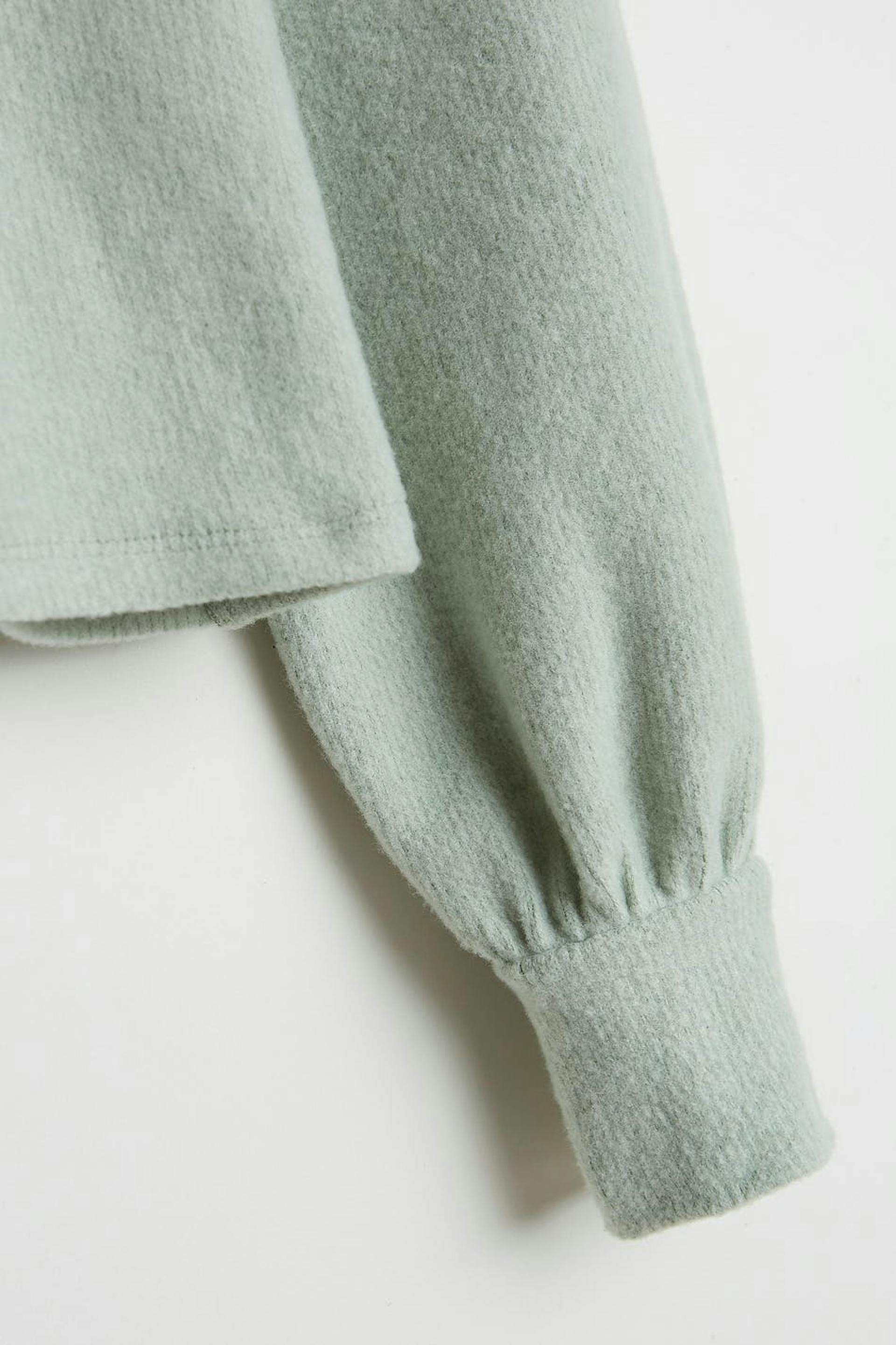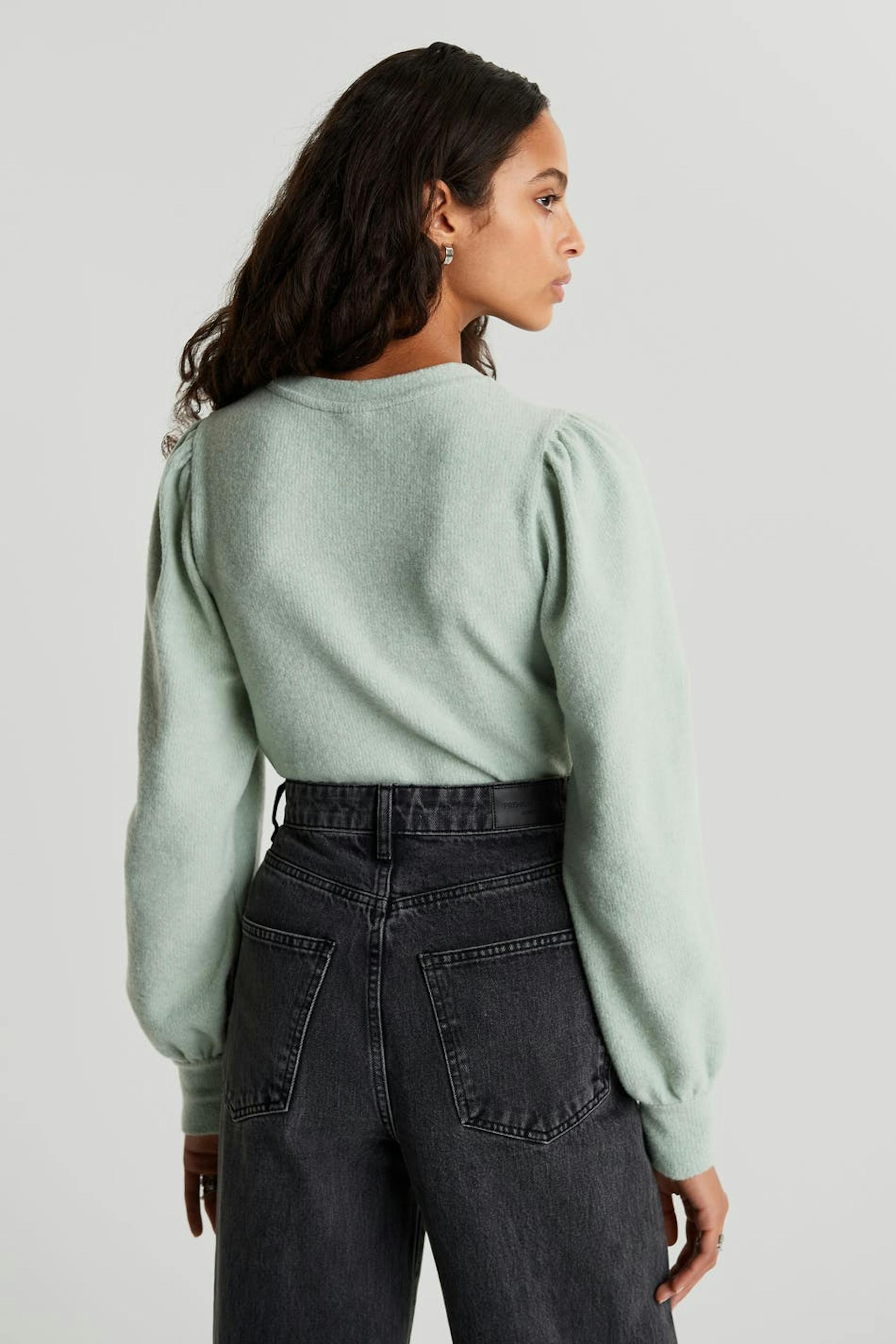 Soft jumper with a regular fit. The jumper is light green and has long puff sleeves.