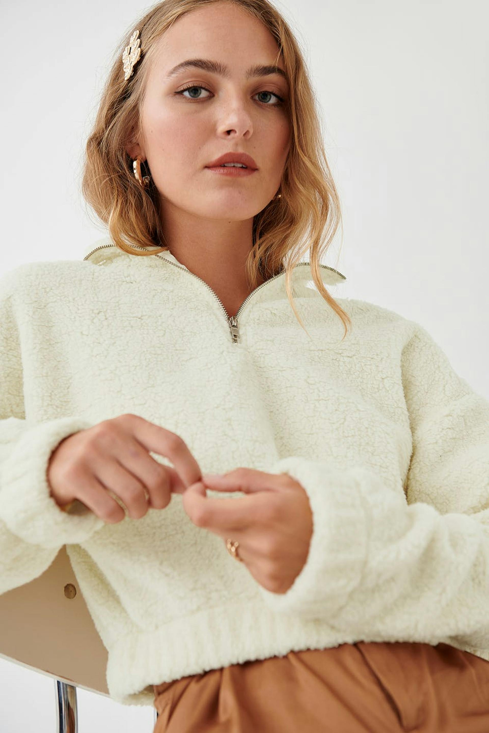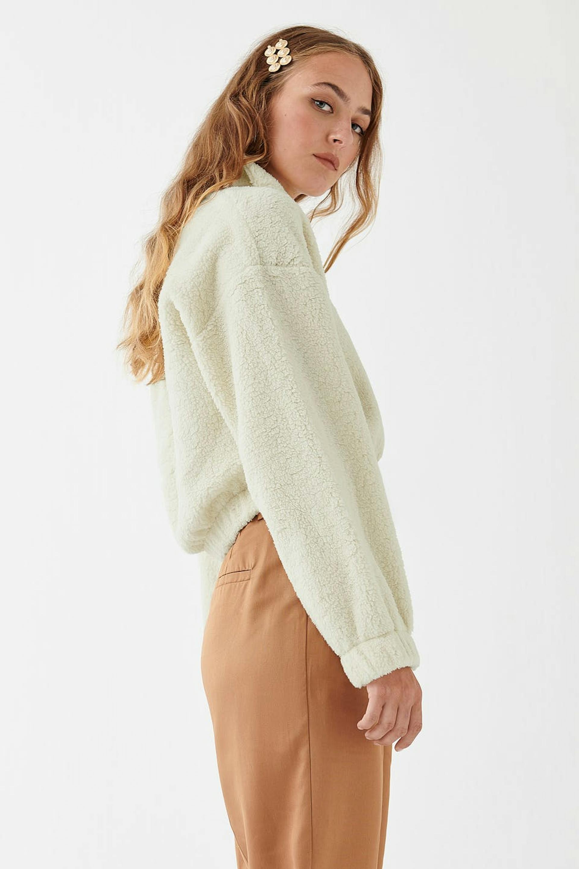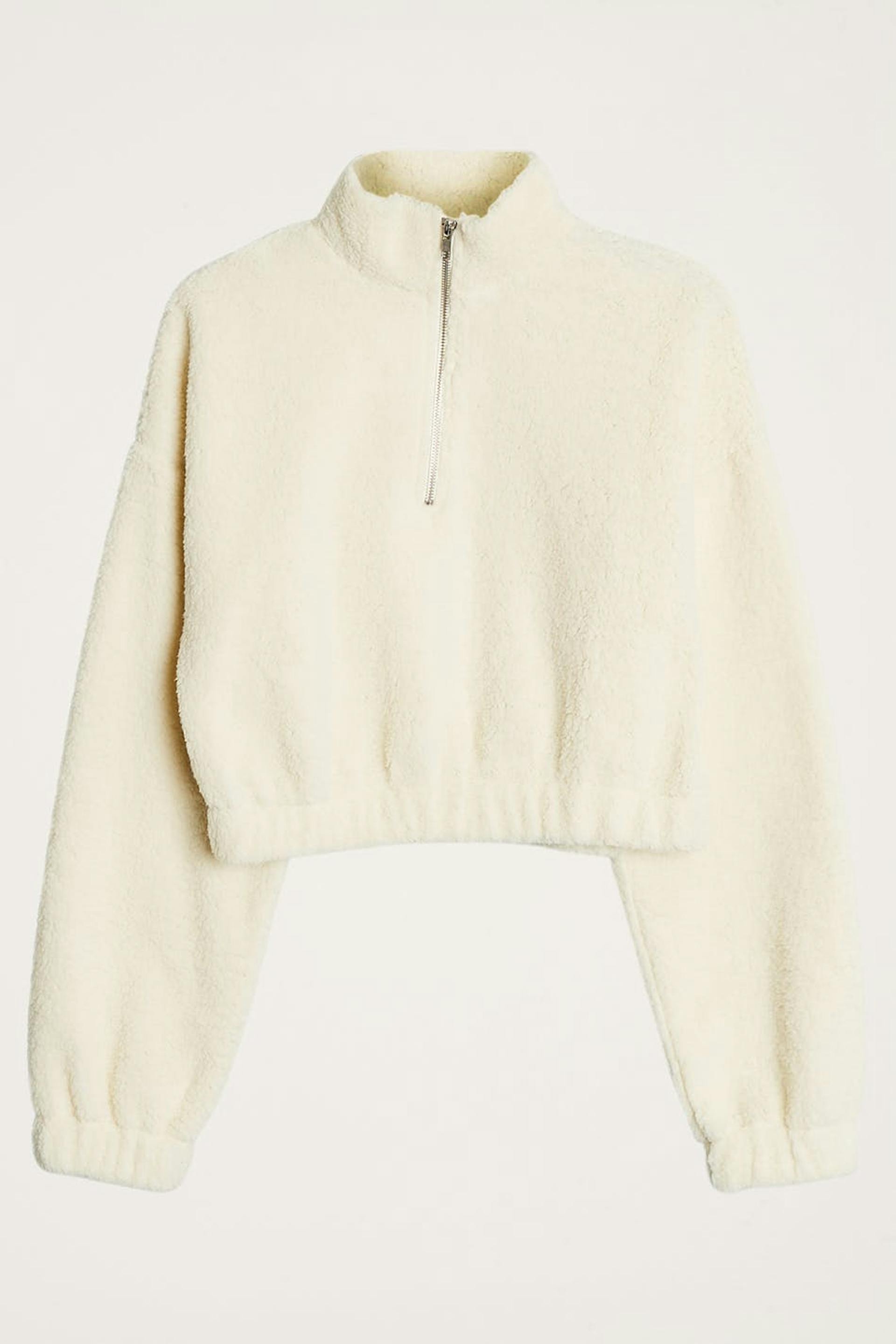 Jumper with a regular fit. The jumper is bone-white and has a teddy material. It has a zip to the neck.