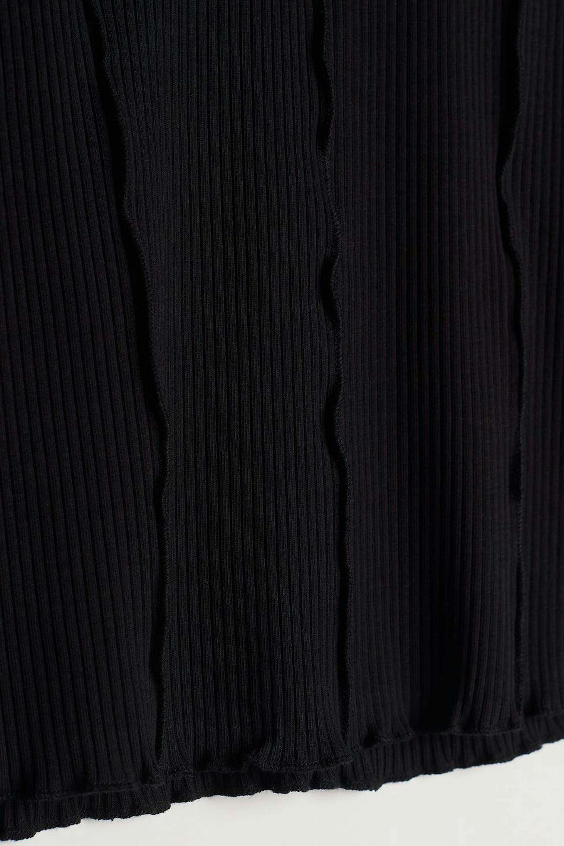 Ribbed top with a fitted fit. The top is black and long-sleeved and has a boat neck at the top. It has small, decorative ruffle details at the front and at hem.