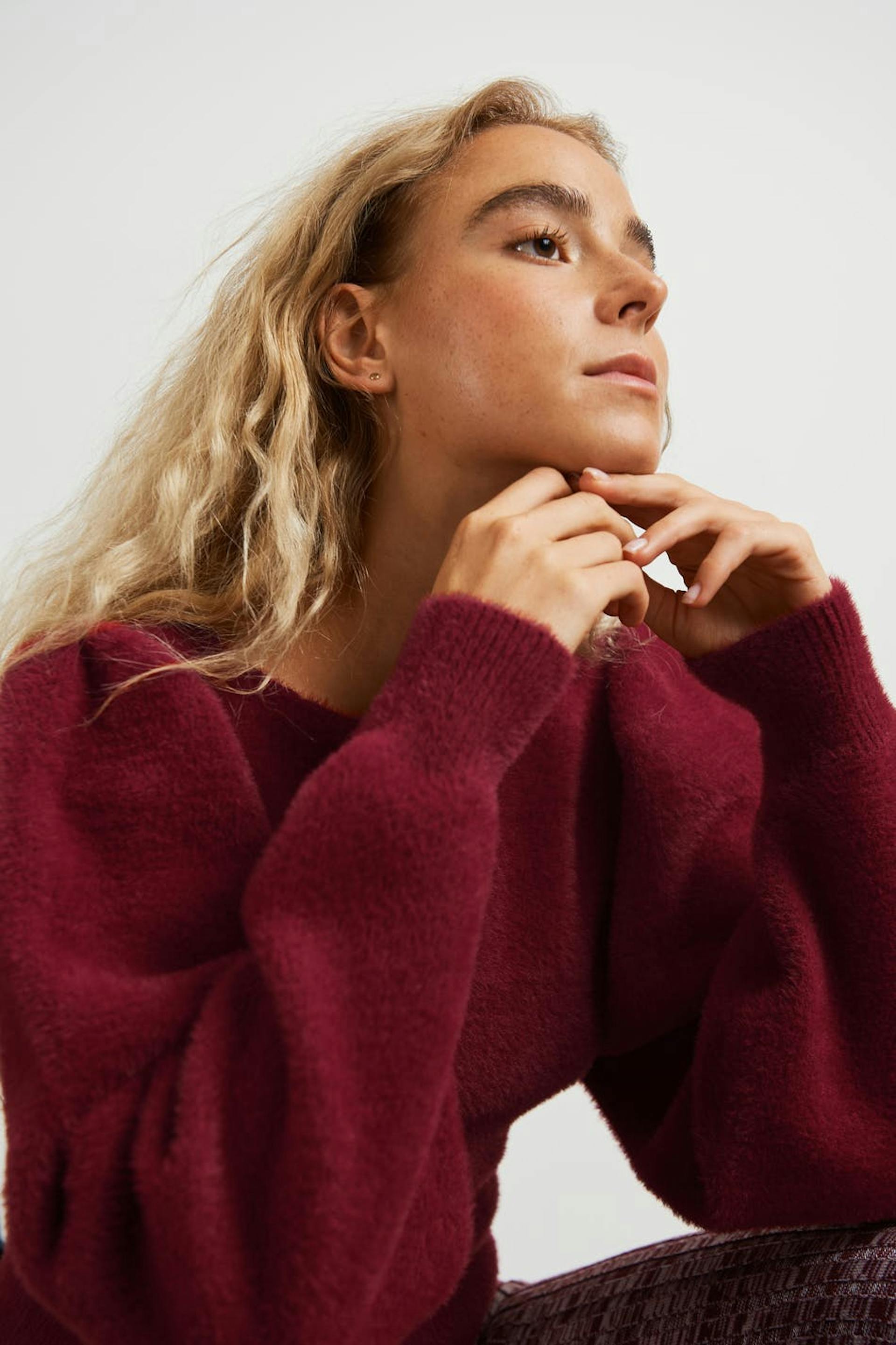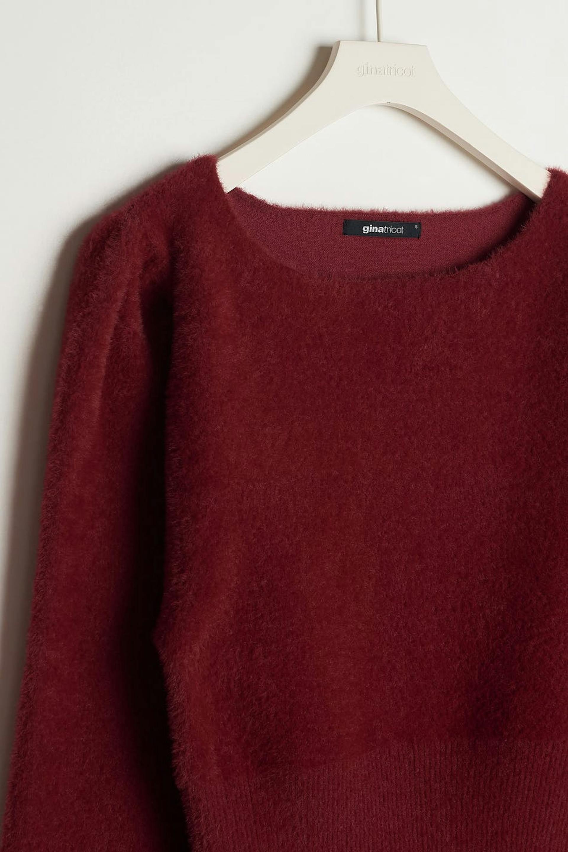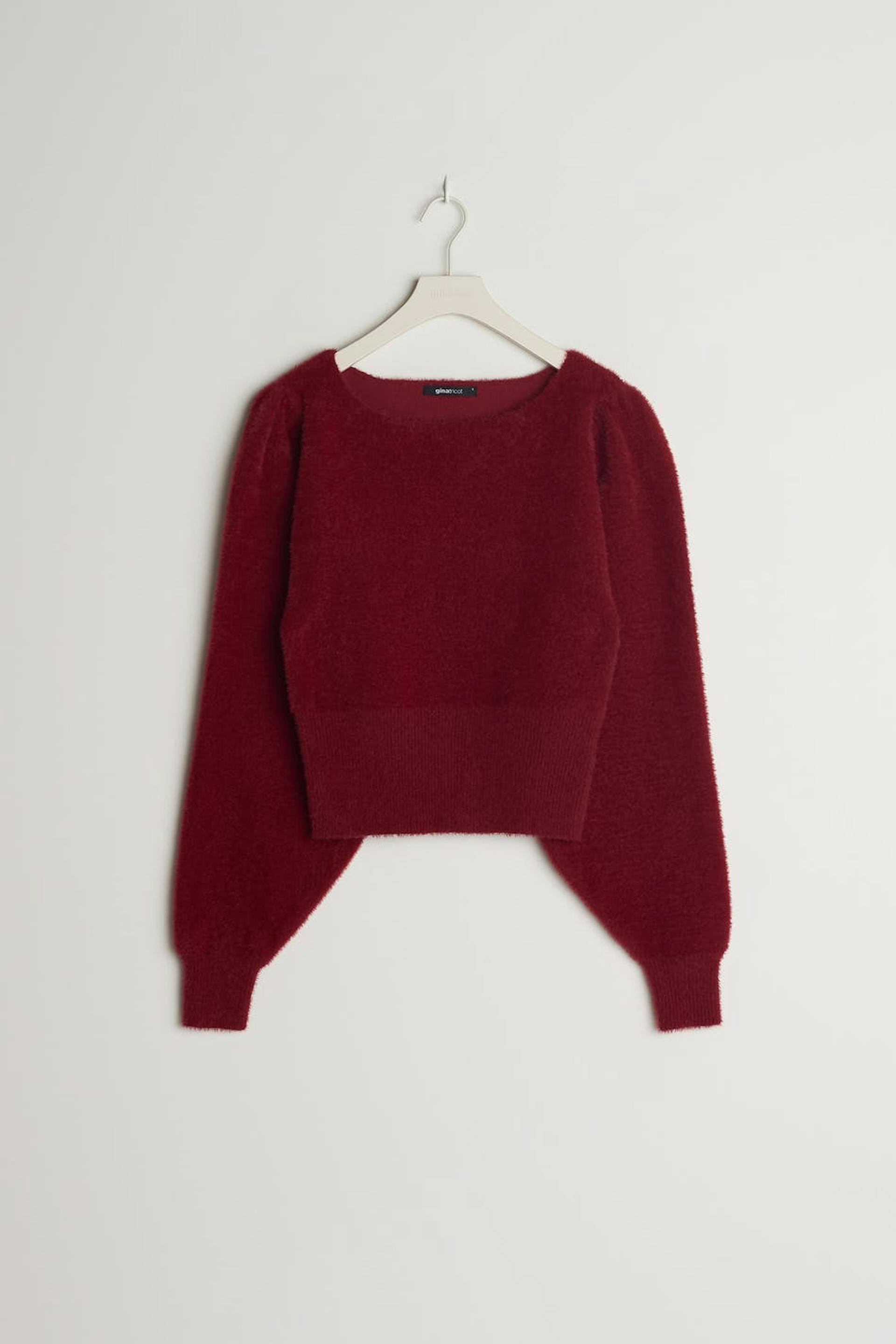 Jumper with voluminous sleeves. The jumper is wine and has a knitted quality with a fluffy texture. It has a fitted waist, a heart-shaped neckline, a ribbed hem and gathering at the shoulders.