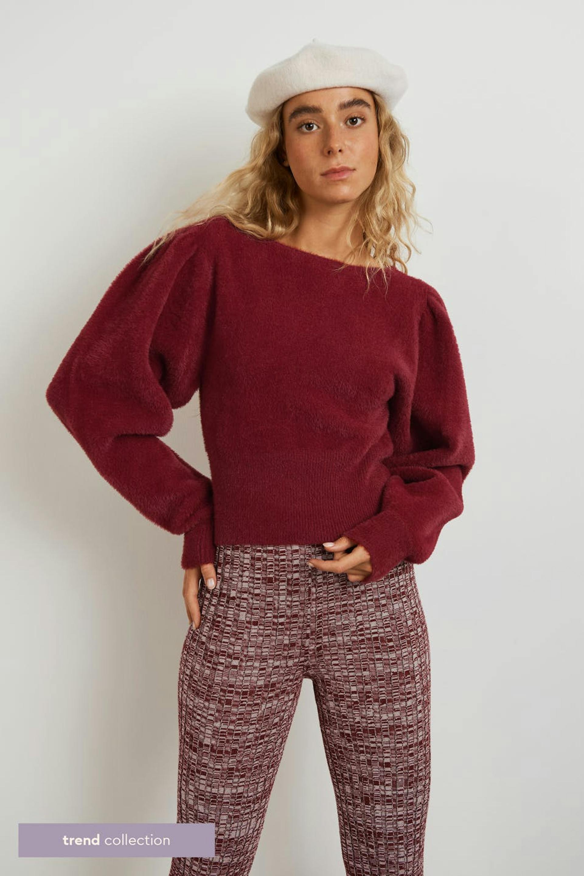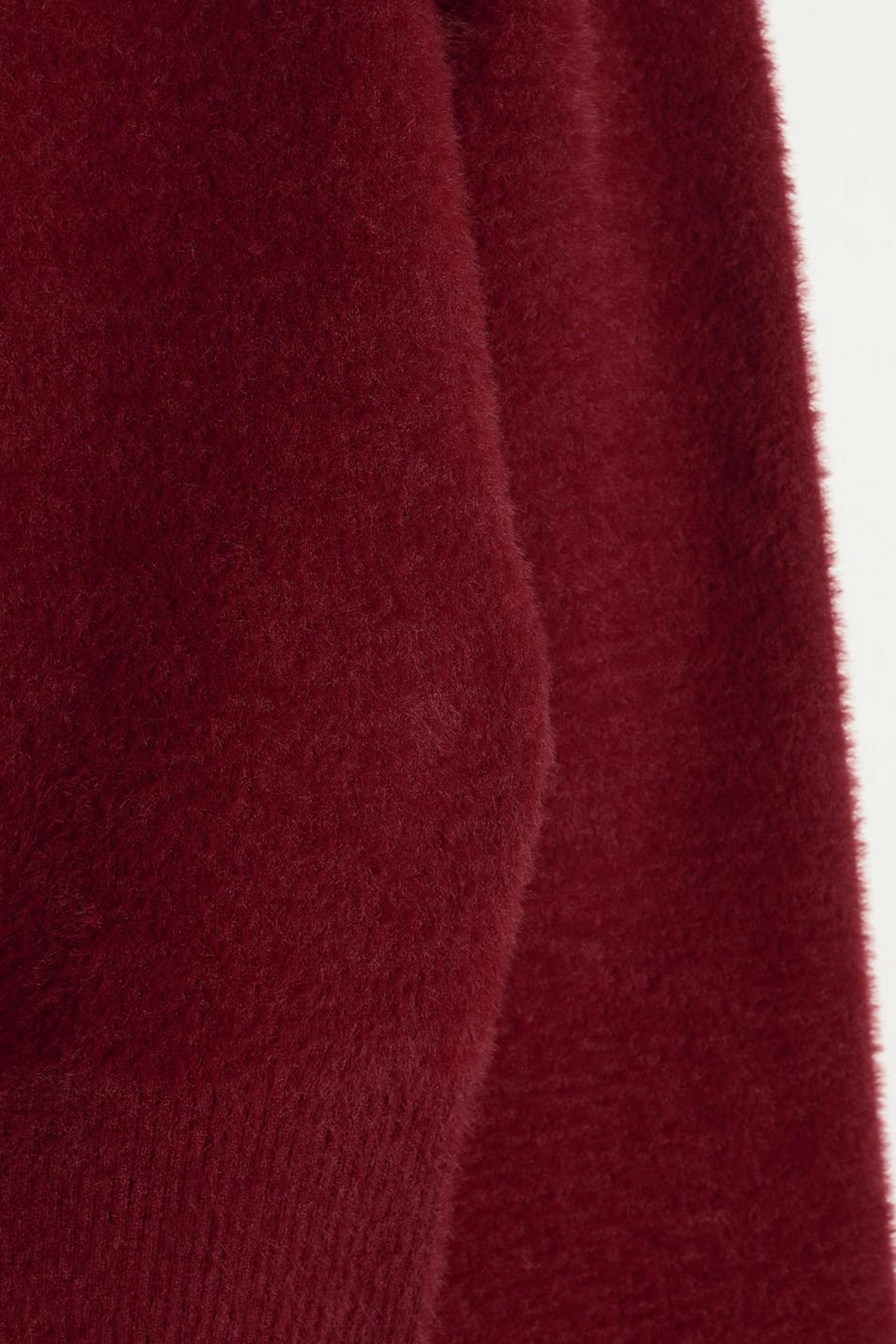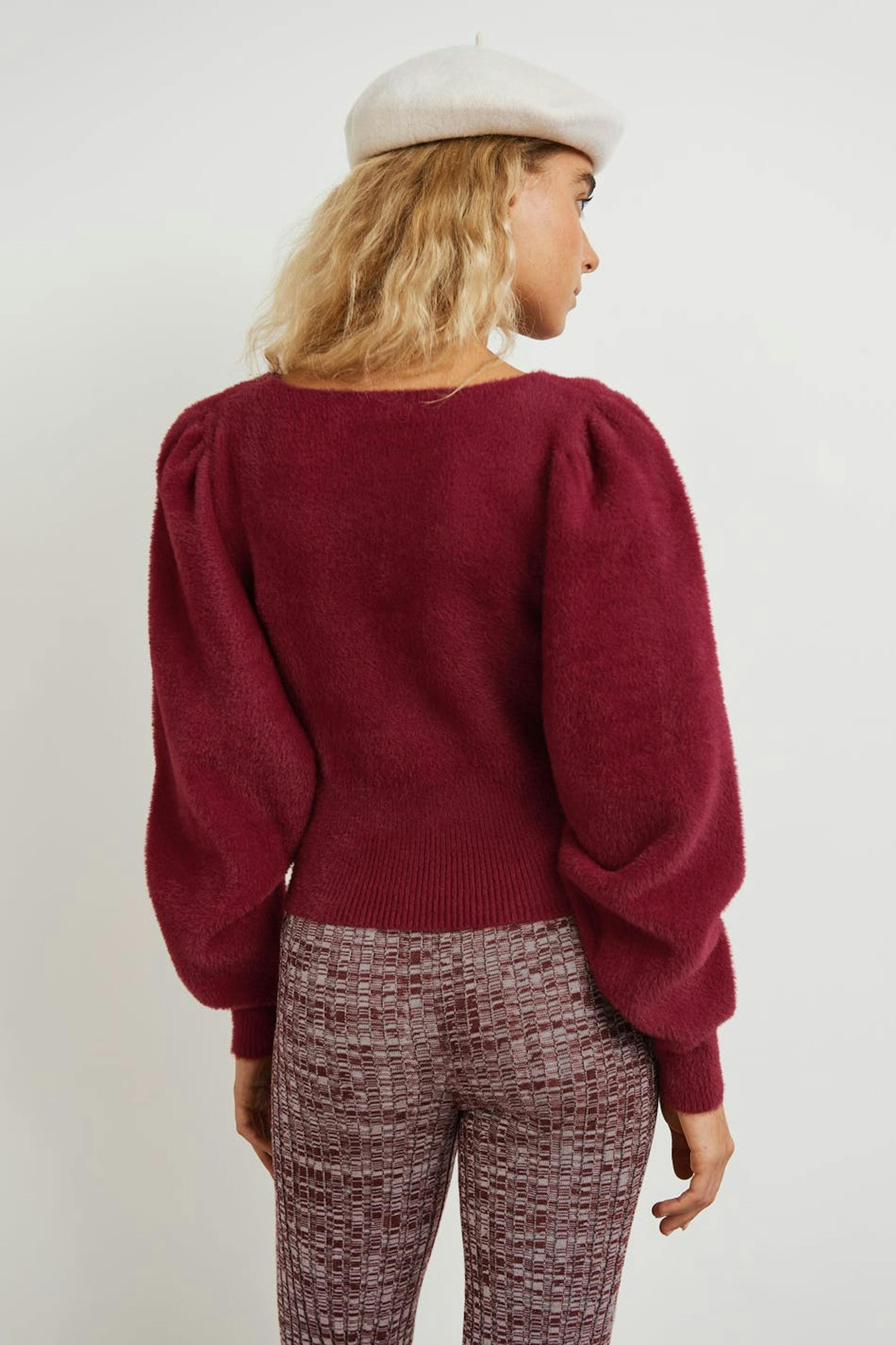 Jumper with voluminous sleeves. The jumper is wine and has a knitted quality with a fluffy texture. It has a fitted waist, a heart-shaped neckline, a ribbed hem and gathering at the shoulders.