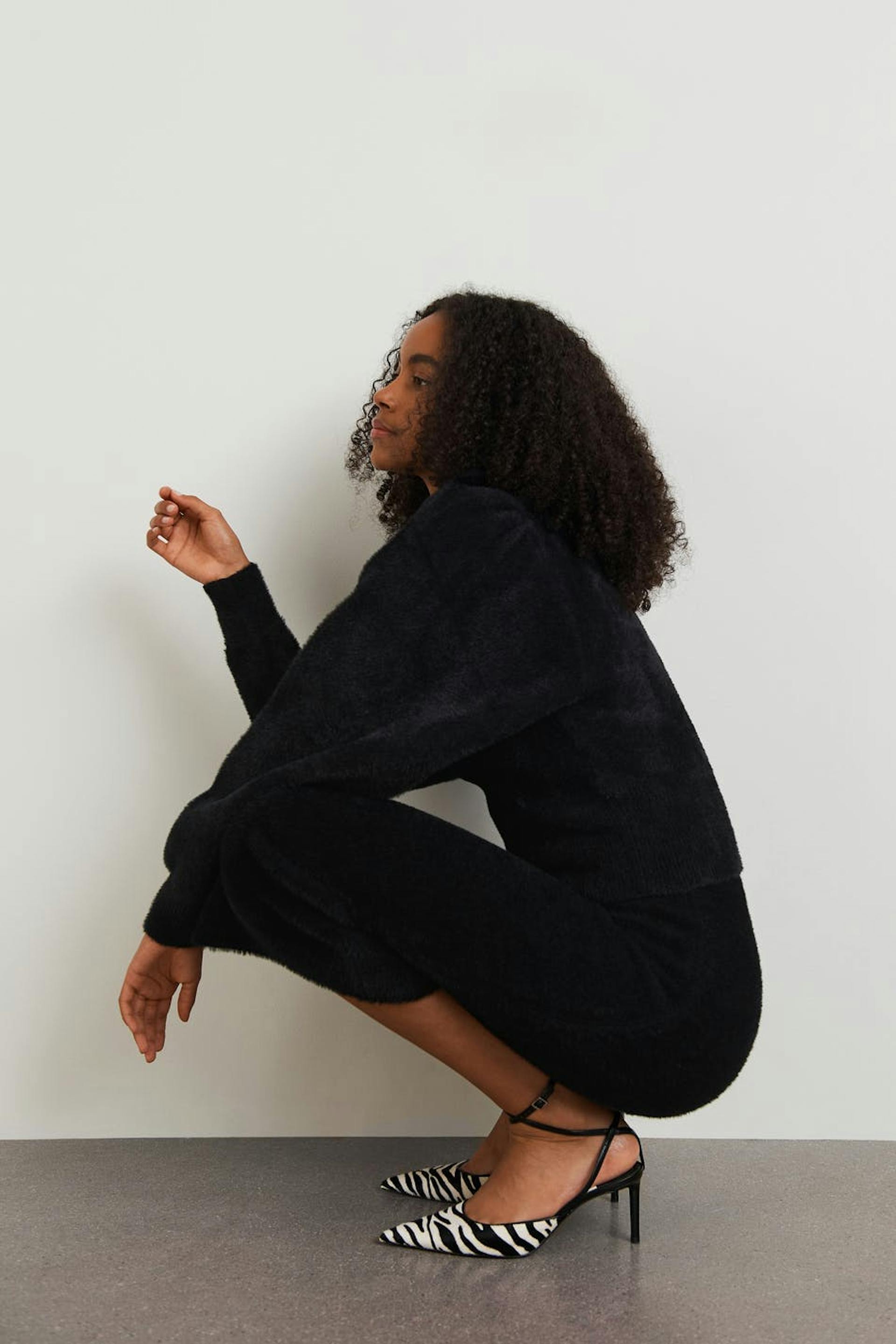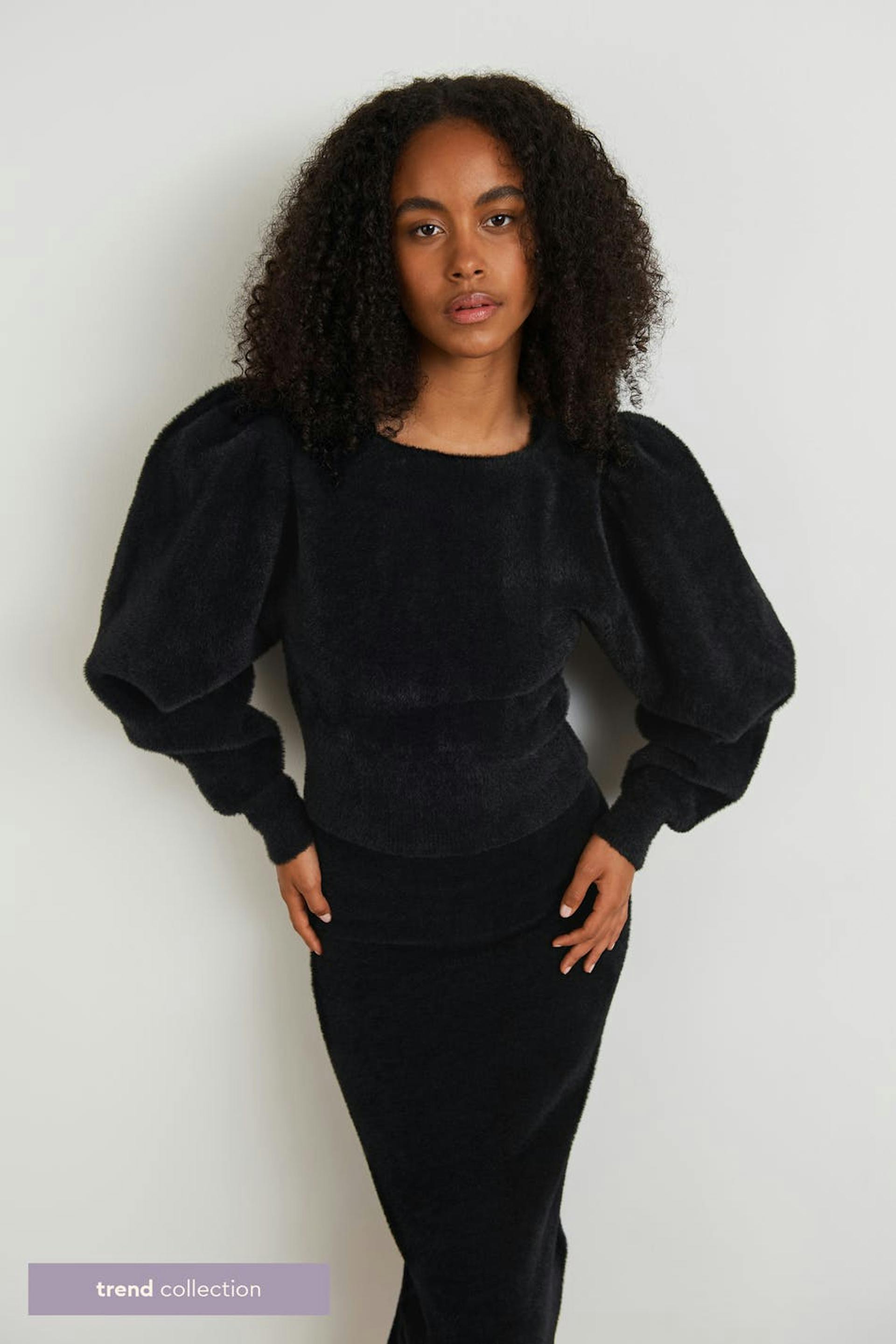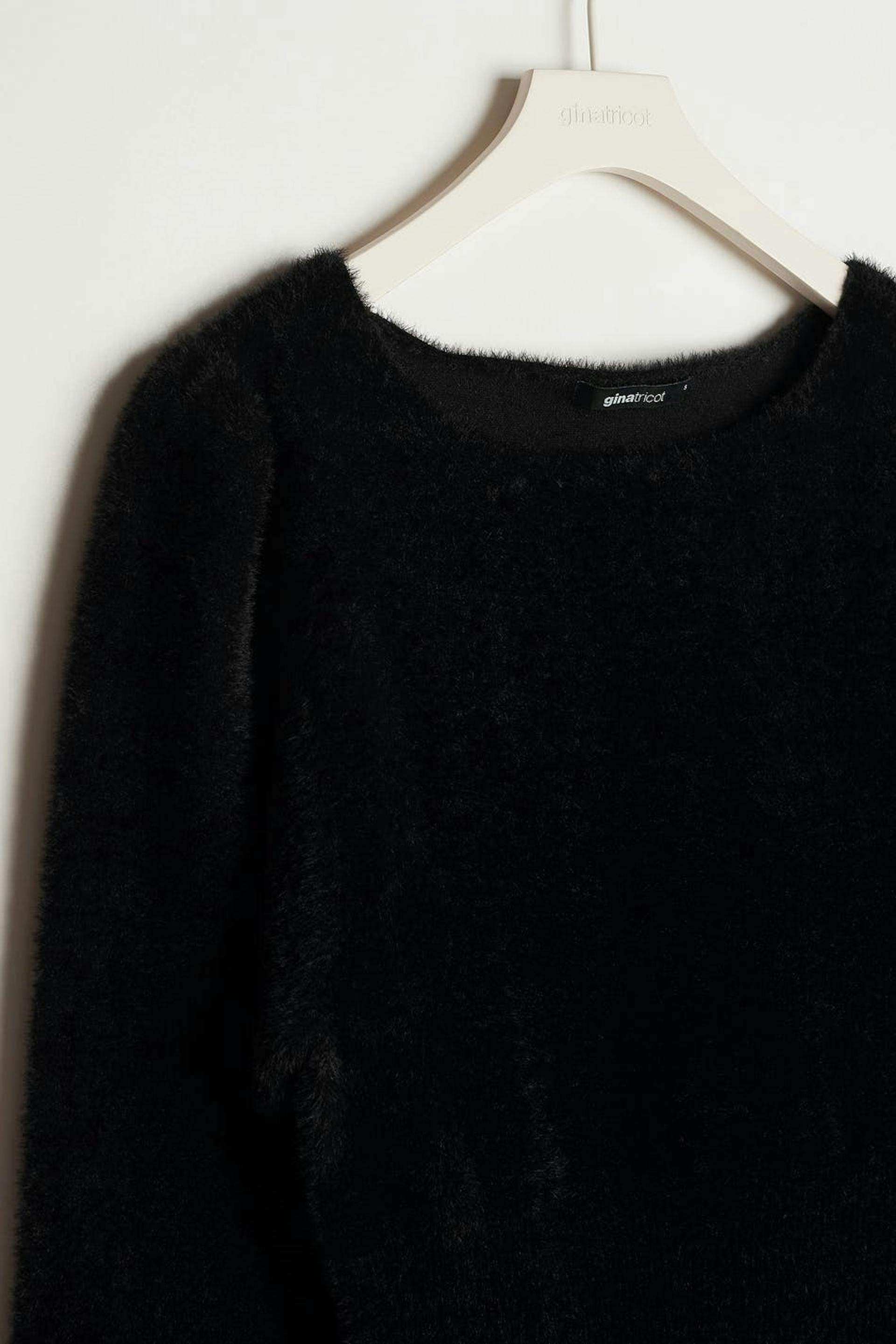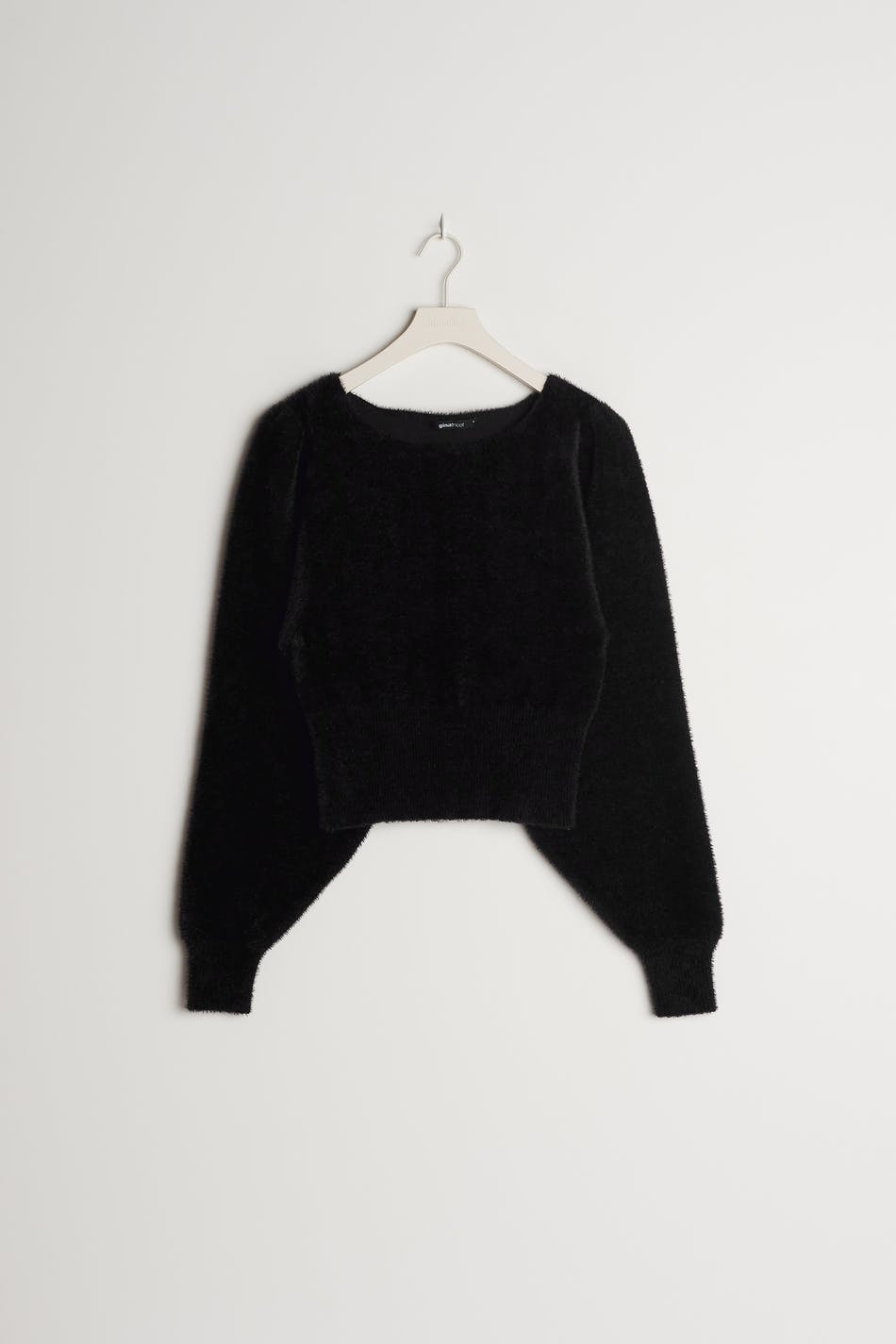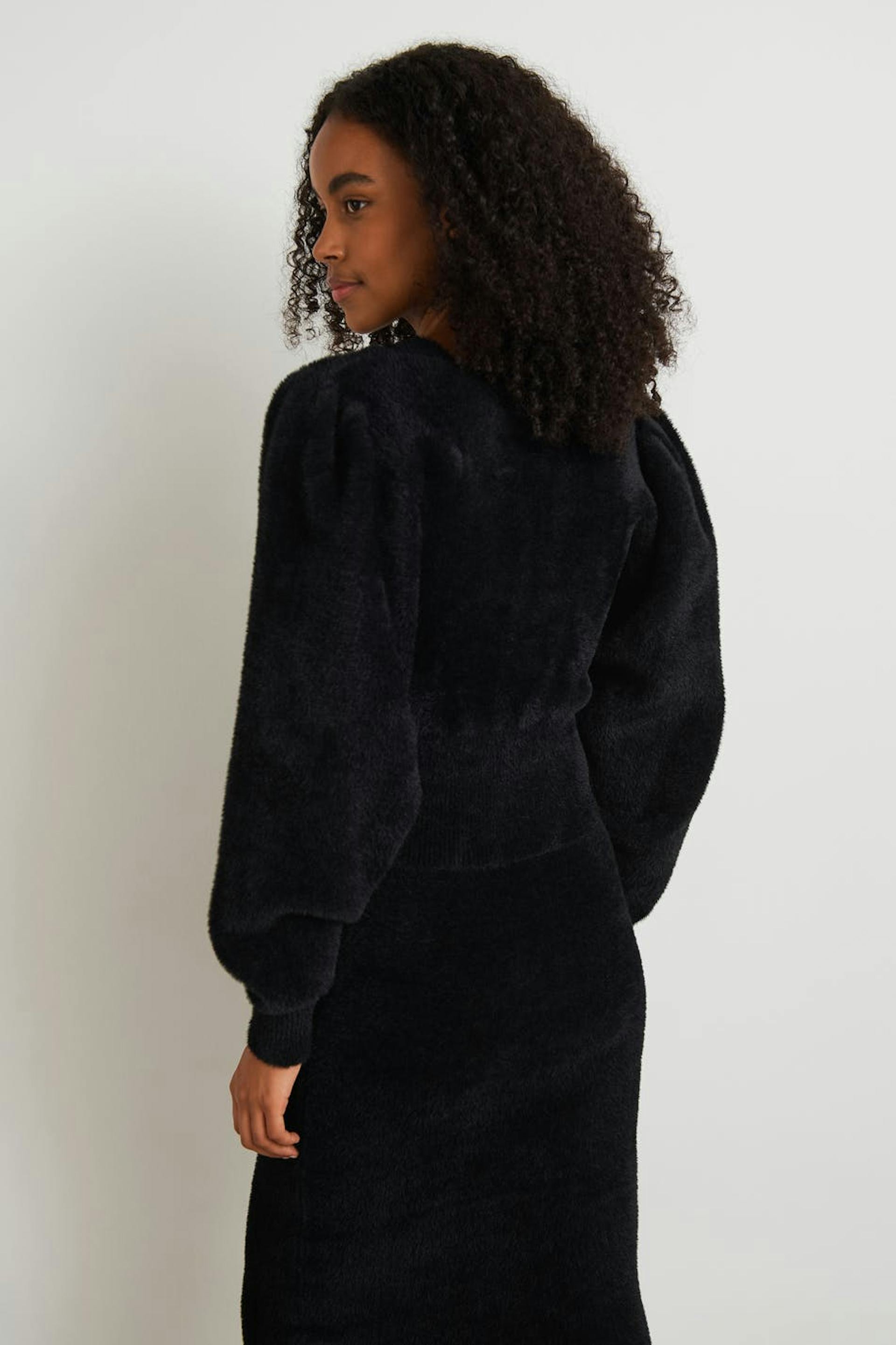 Knitted jumper with voluminous sleeves. The jumper is black and has a knitted quality with a fluffy texture. It has a fitted waist, a heart-shaped neckline, a ribbed hem and gathering at the shoulders.