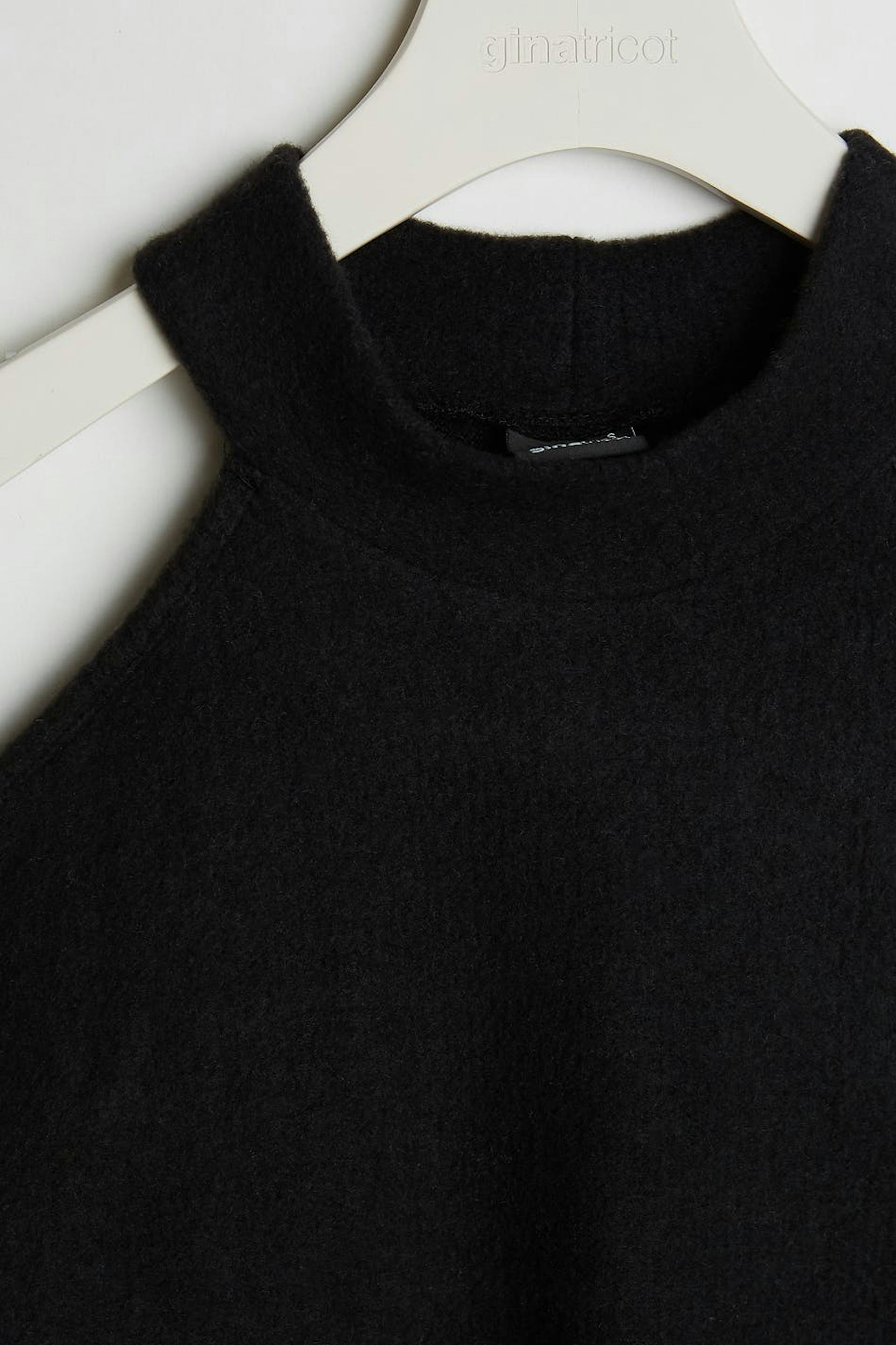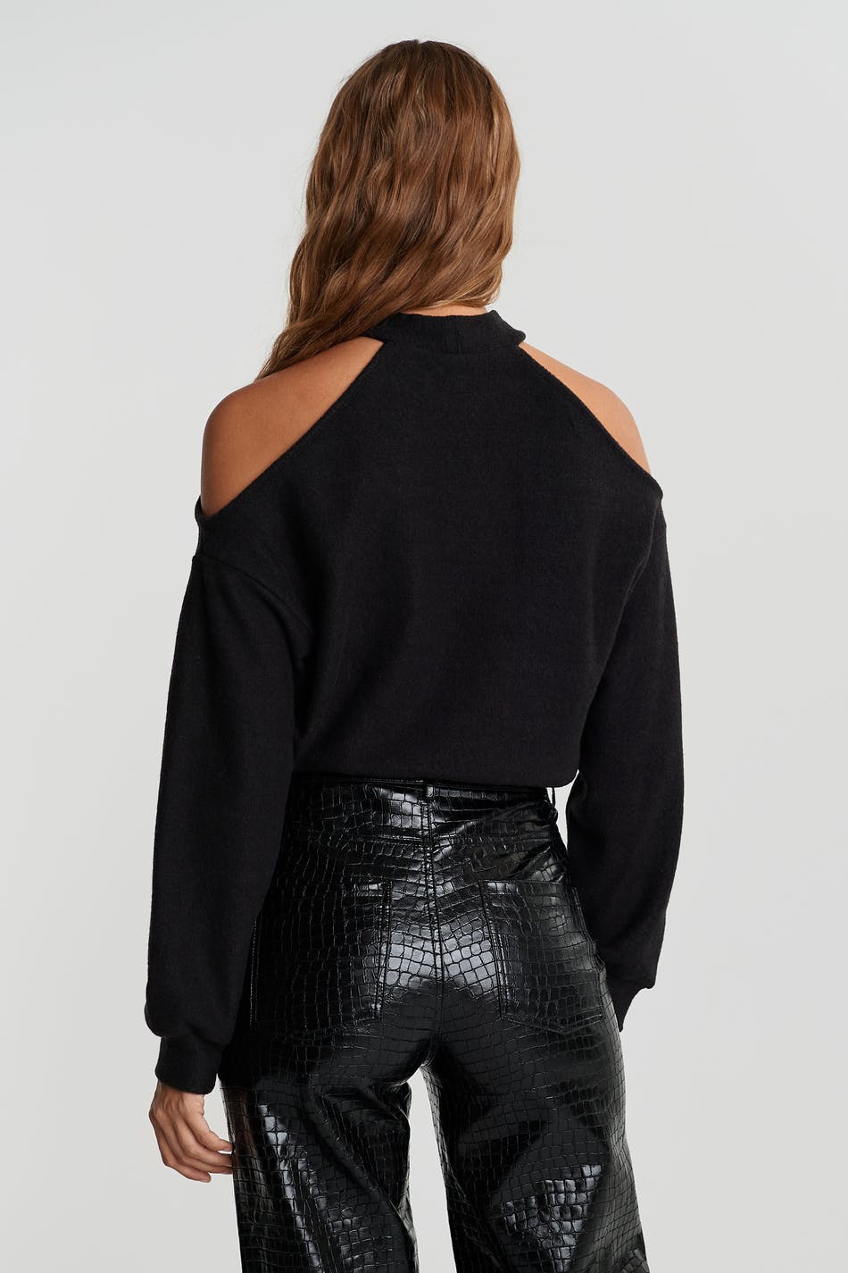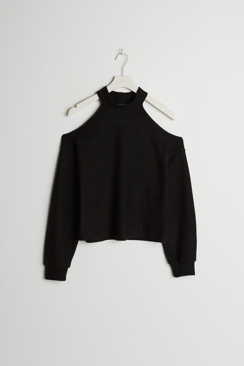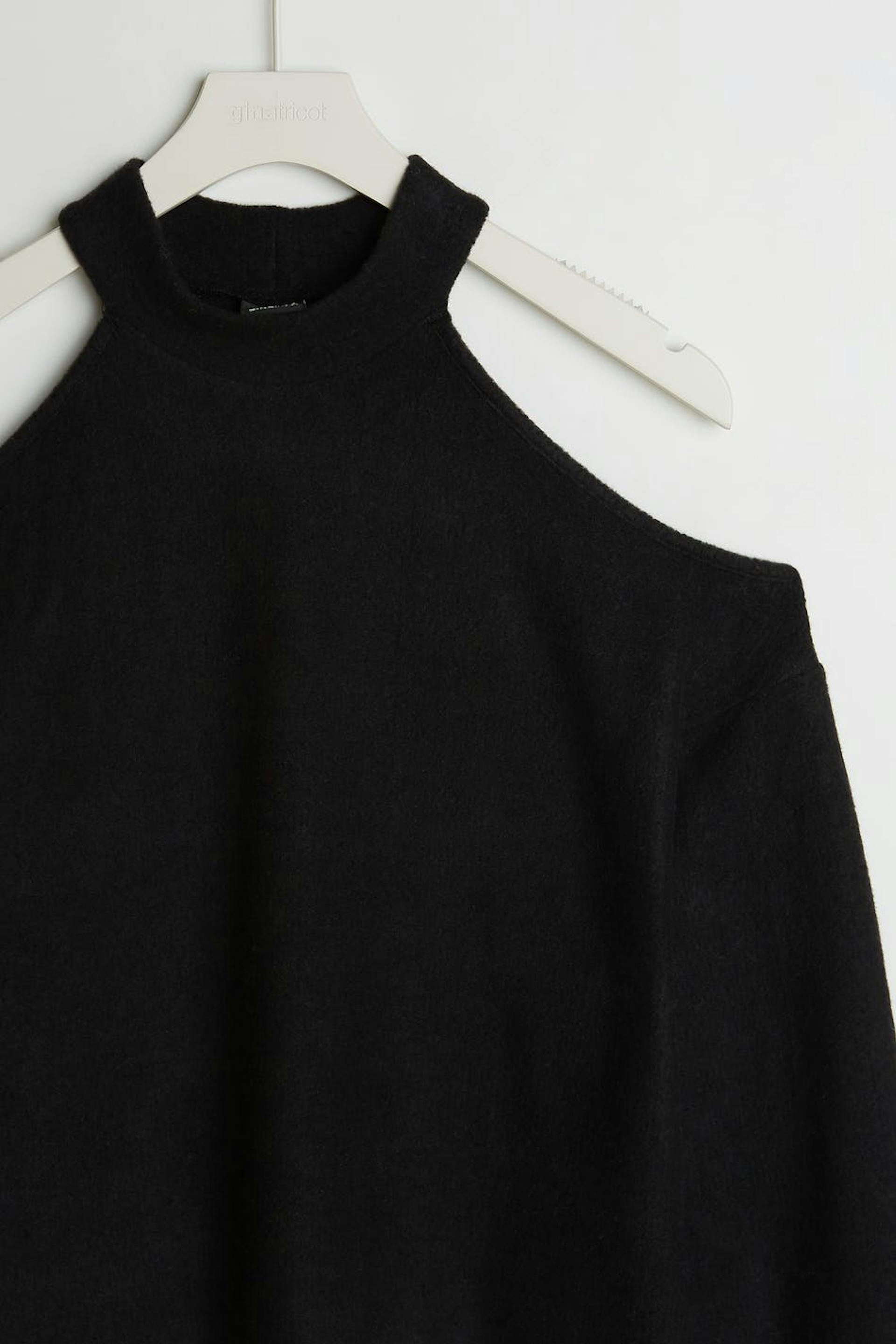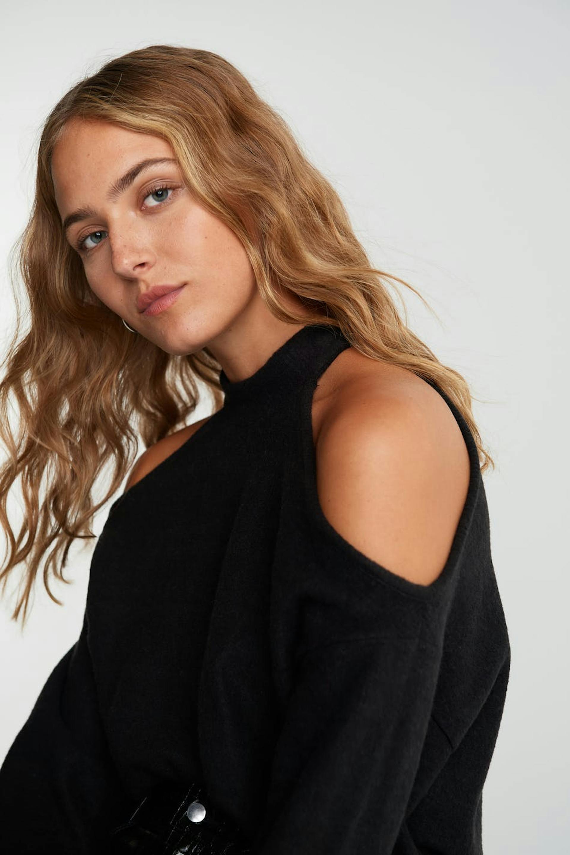 Long-sleeved jumper with a generous fit. The jumper is black and has bare shoulders.