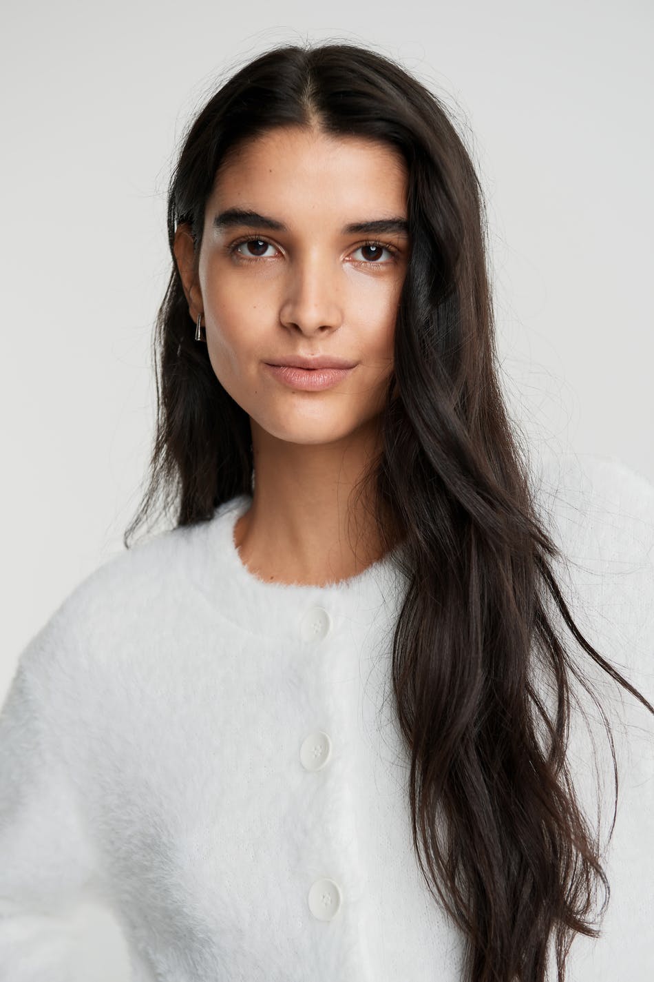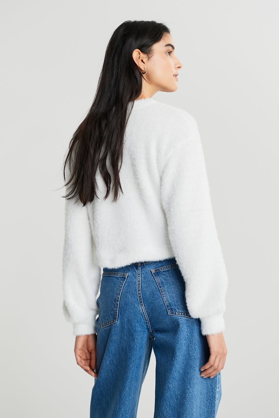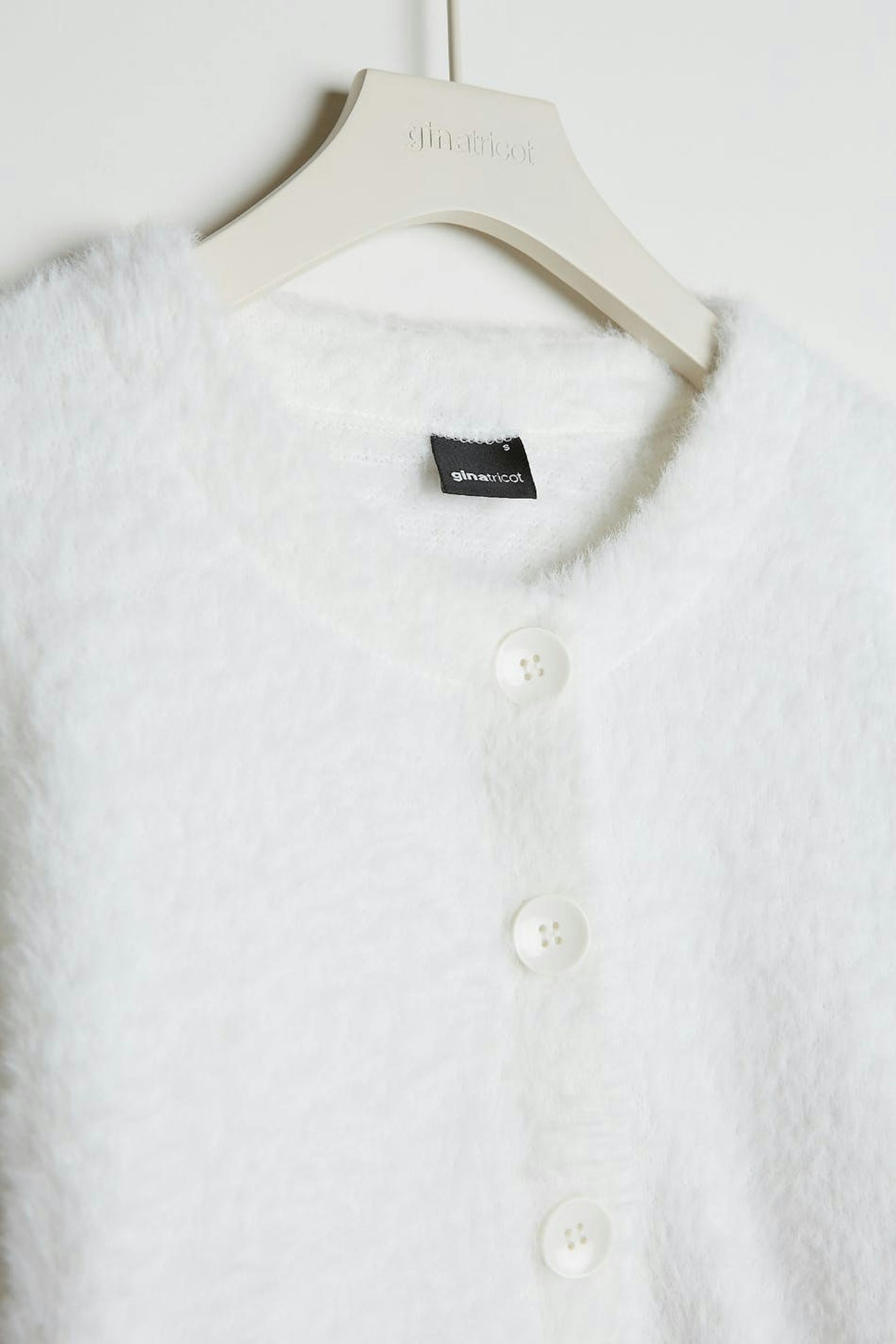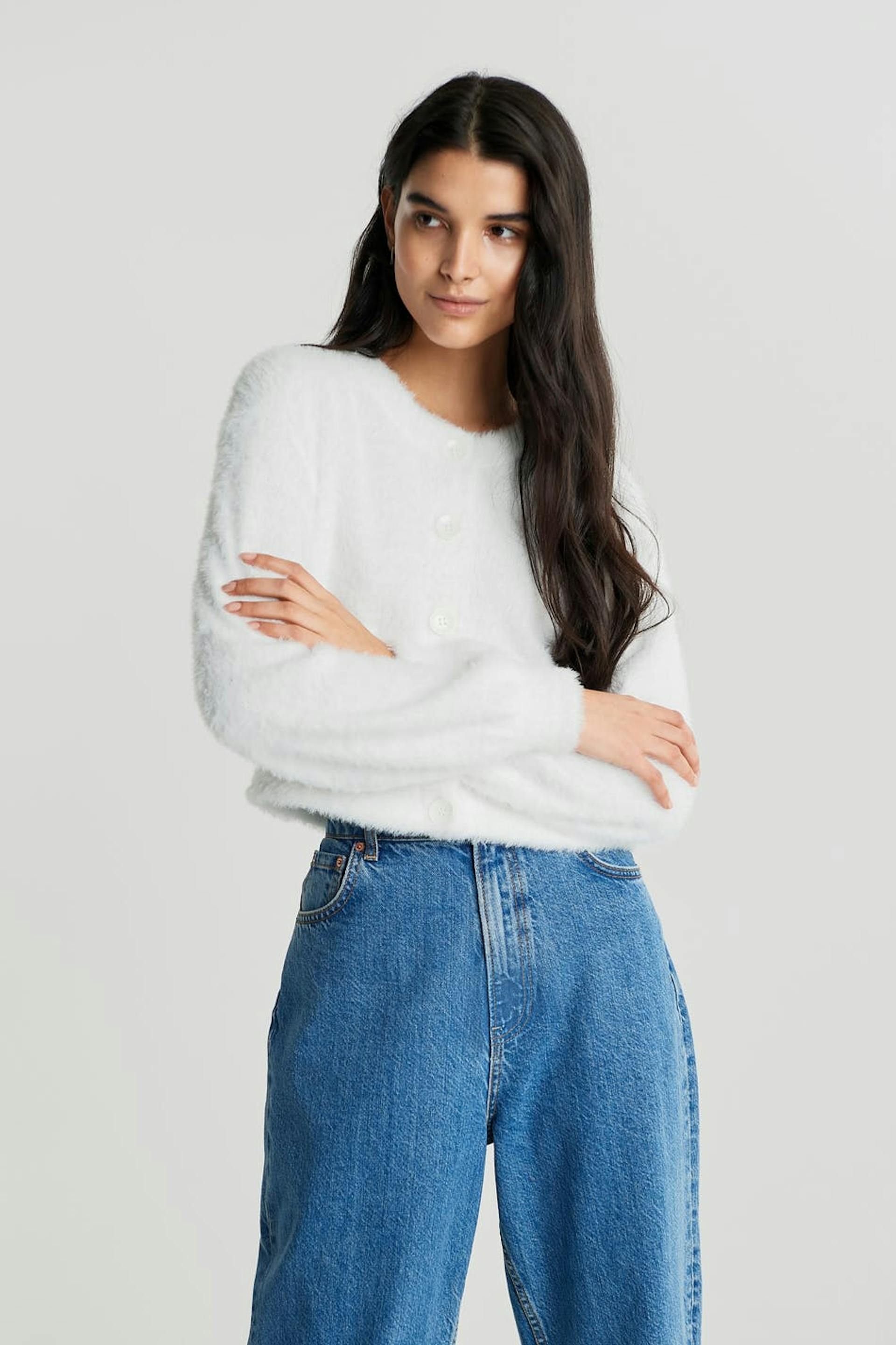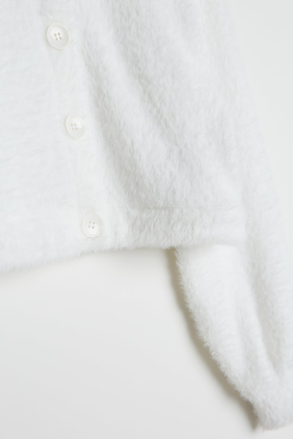 Cosy cardigan with an oversize fit. The cardigan is white, fluffy and cropped. It has buttons at the front.