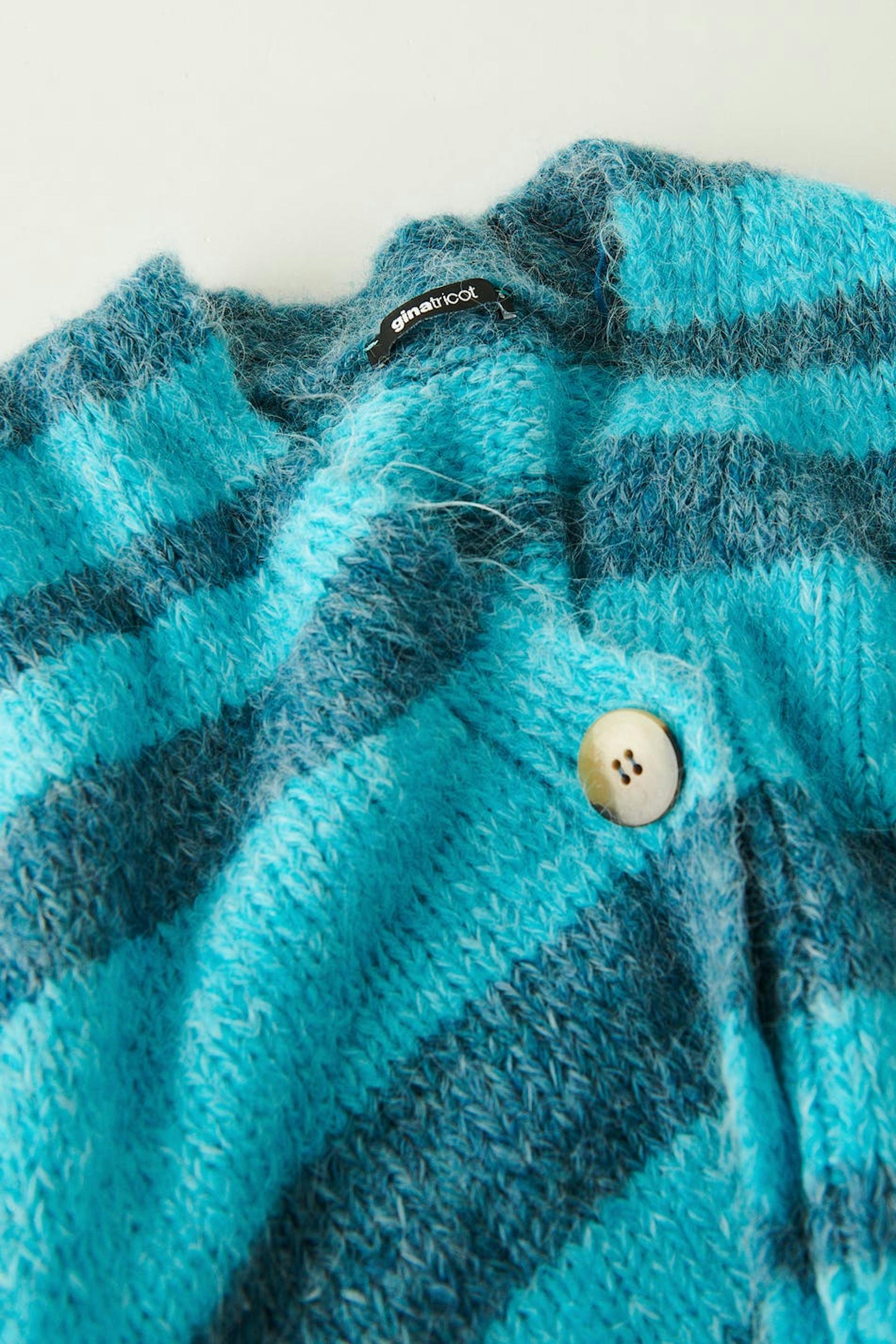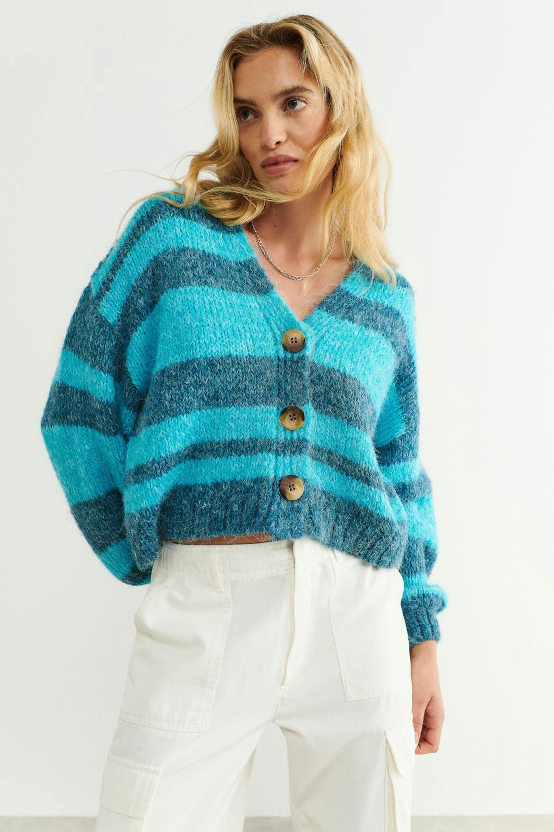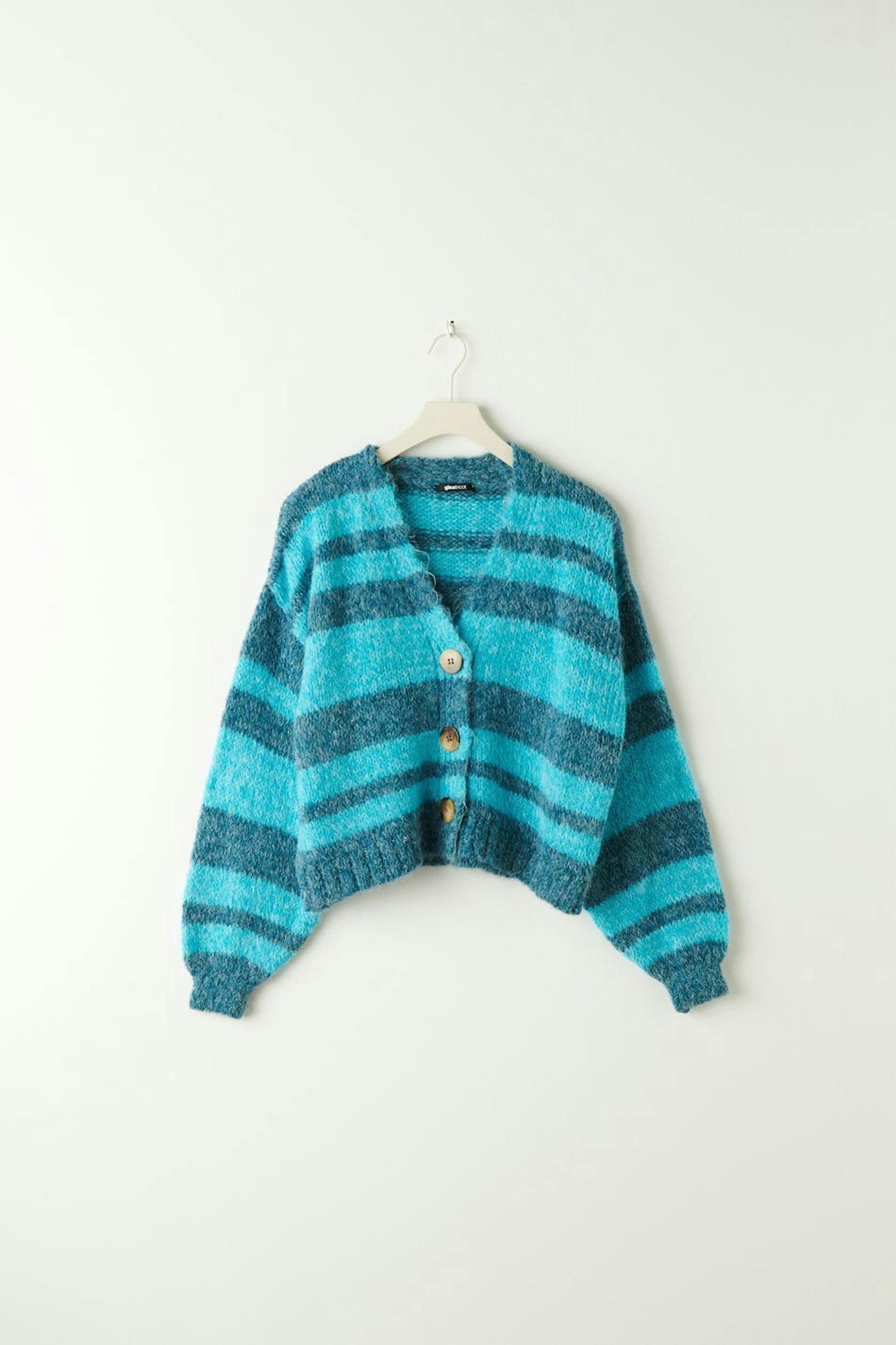 Striped cardigan with button placket in front. Blue, knitted and cropped. It has voluminous sleeves and a rib-knit bottom hemline.