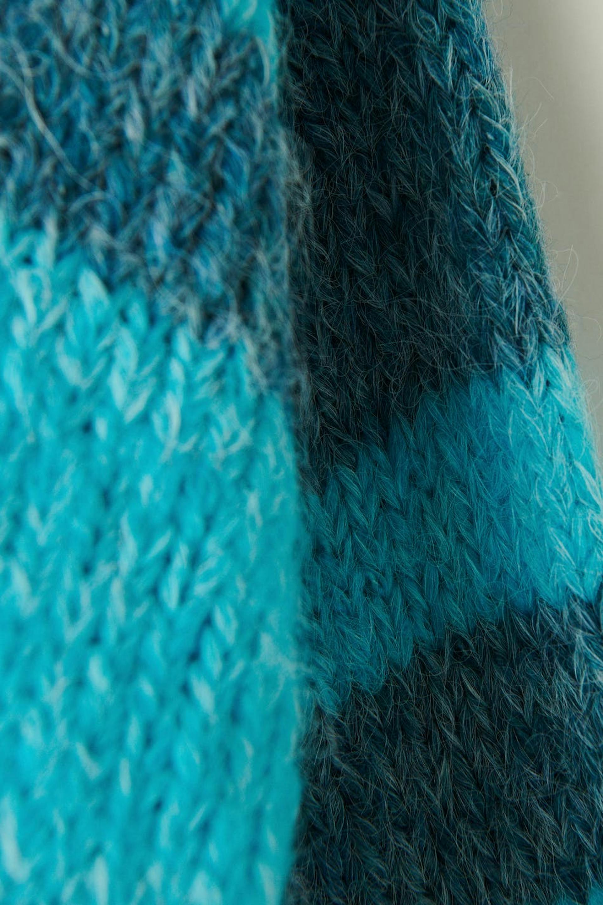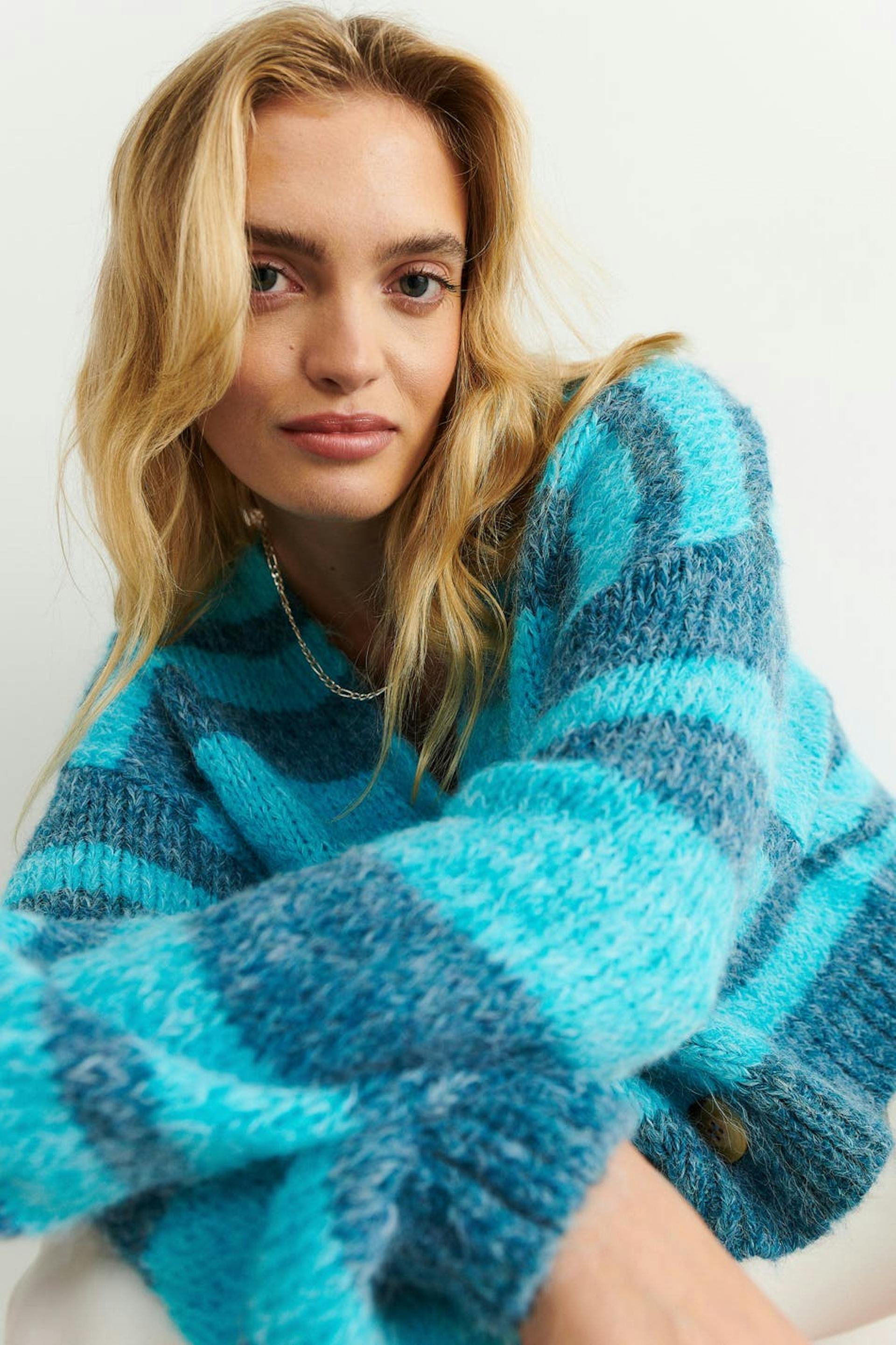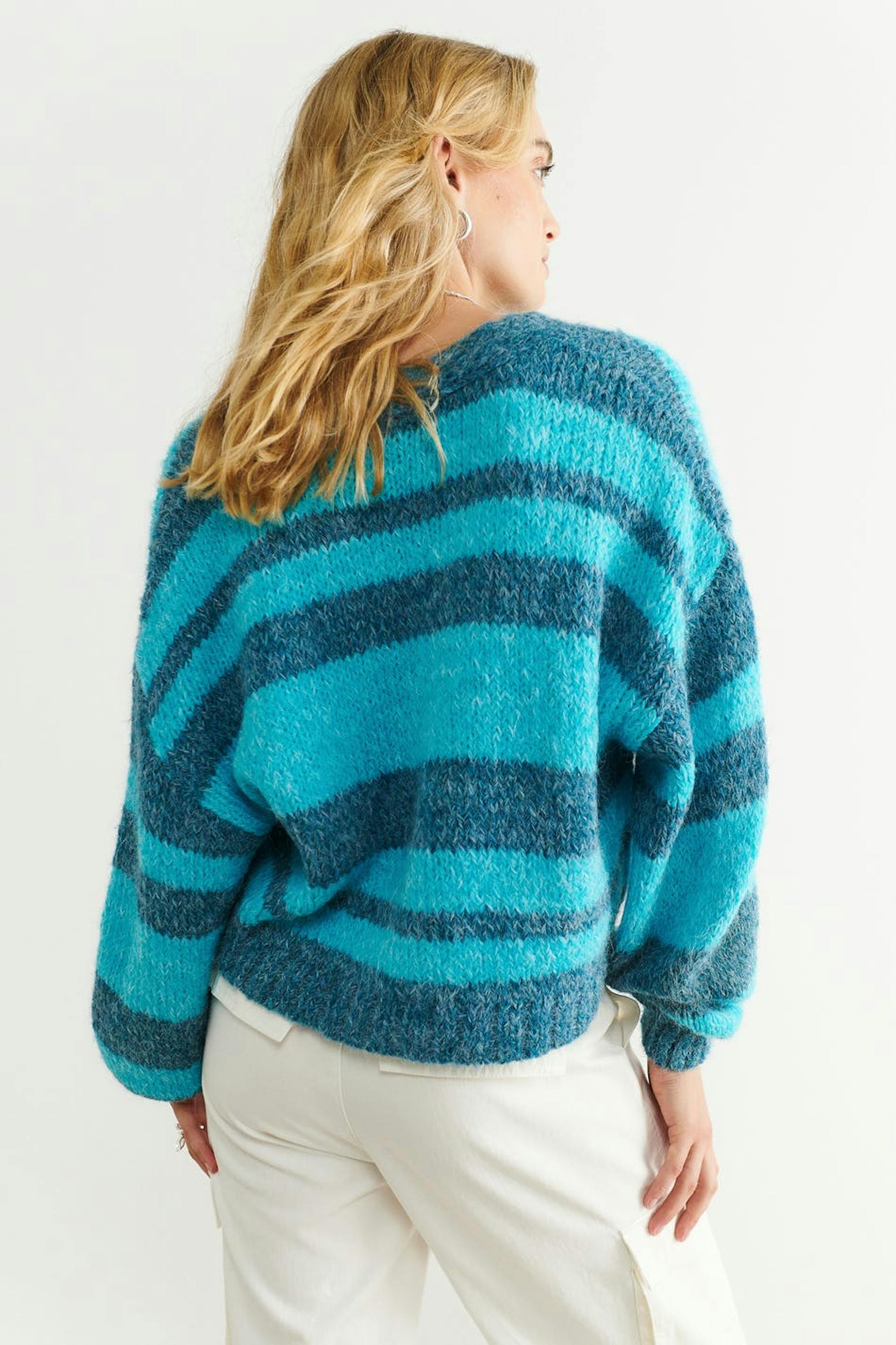 Striped cardigan with button placket in front. Blue, knitted and cropped. It has voluminous sleeves and a rib-knit bottom hemline.