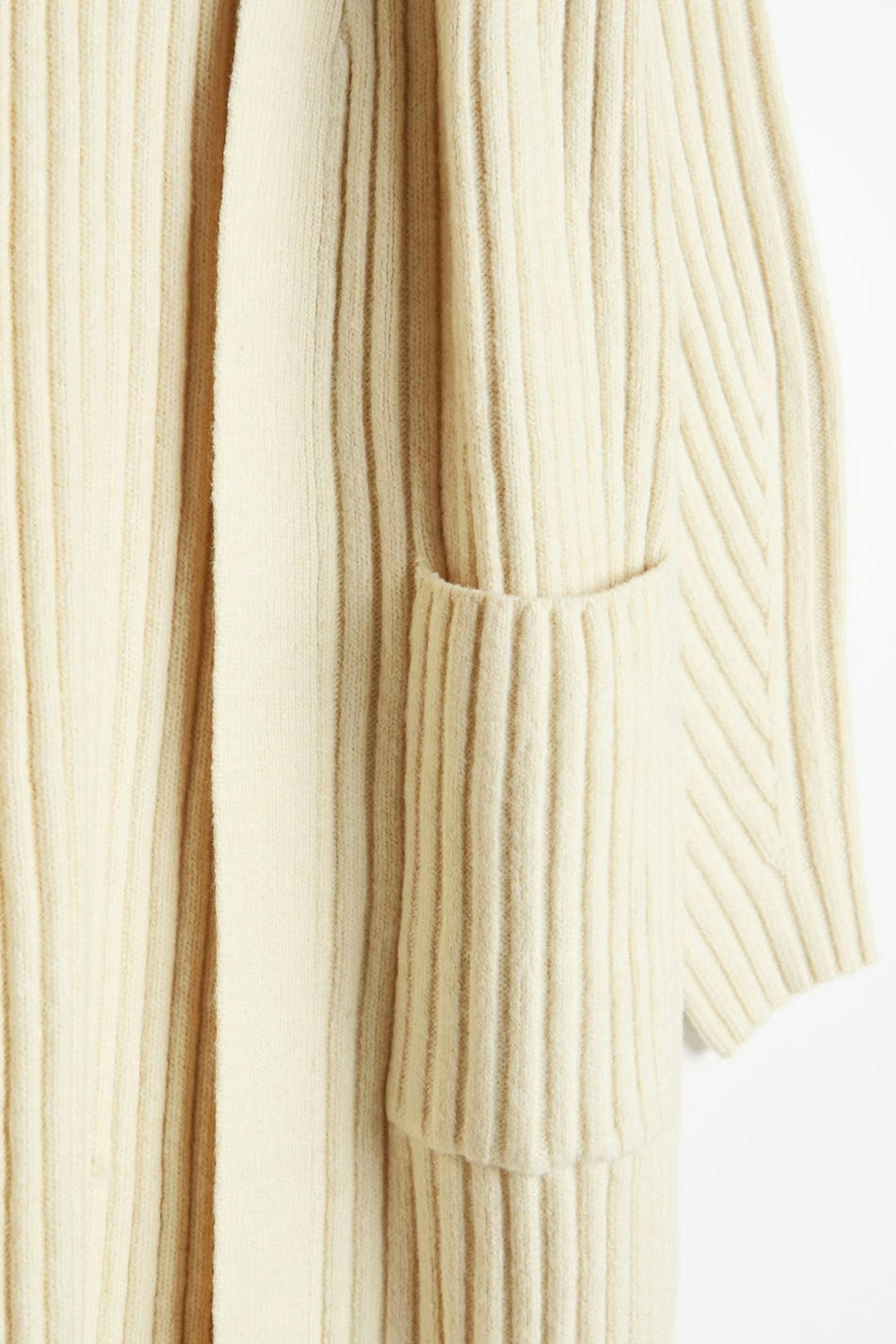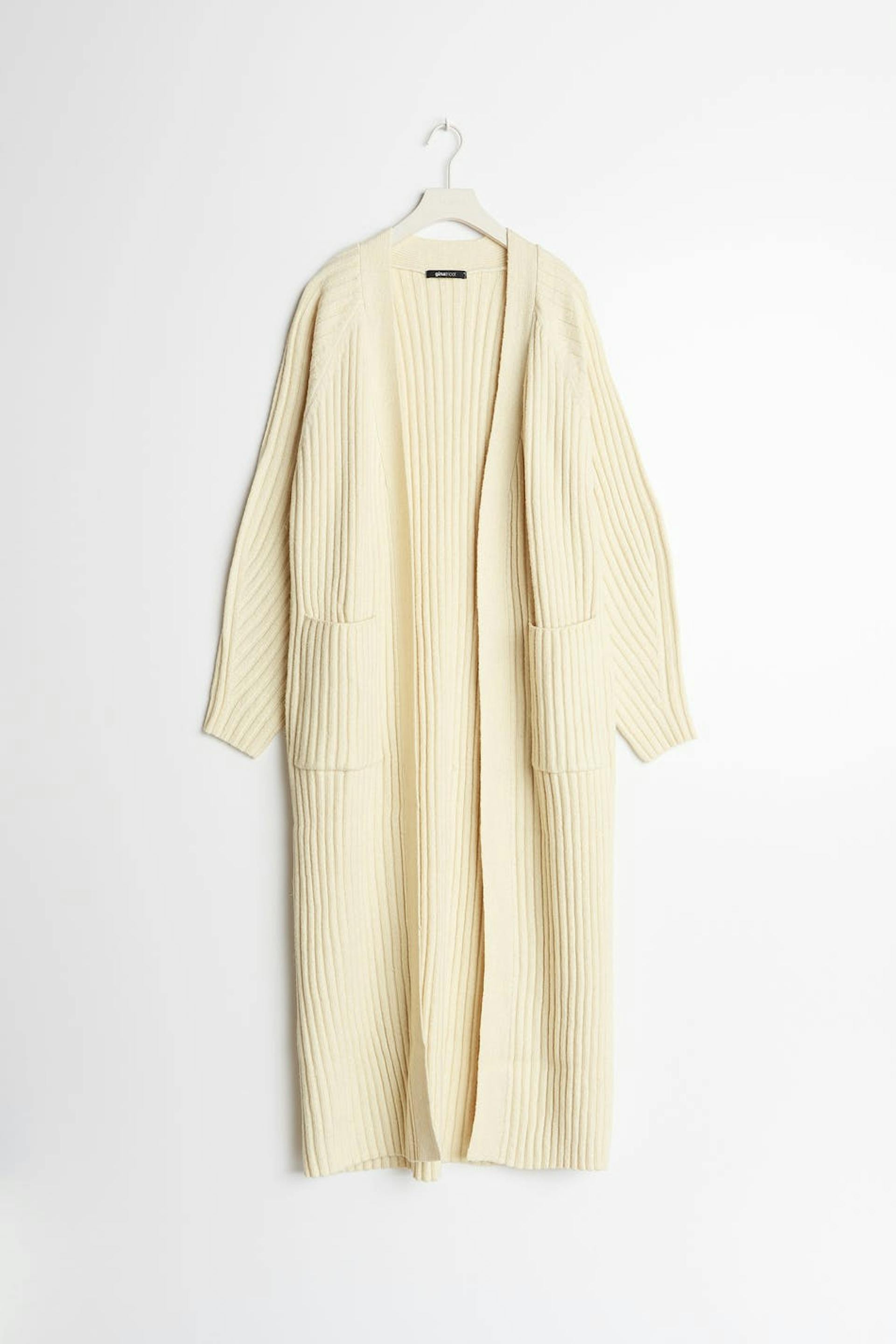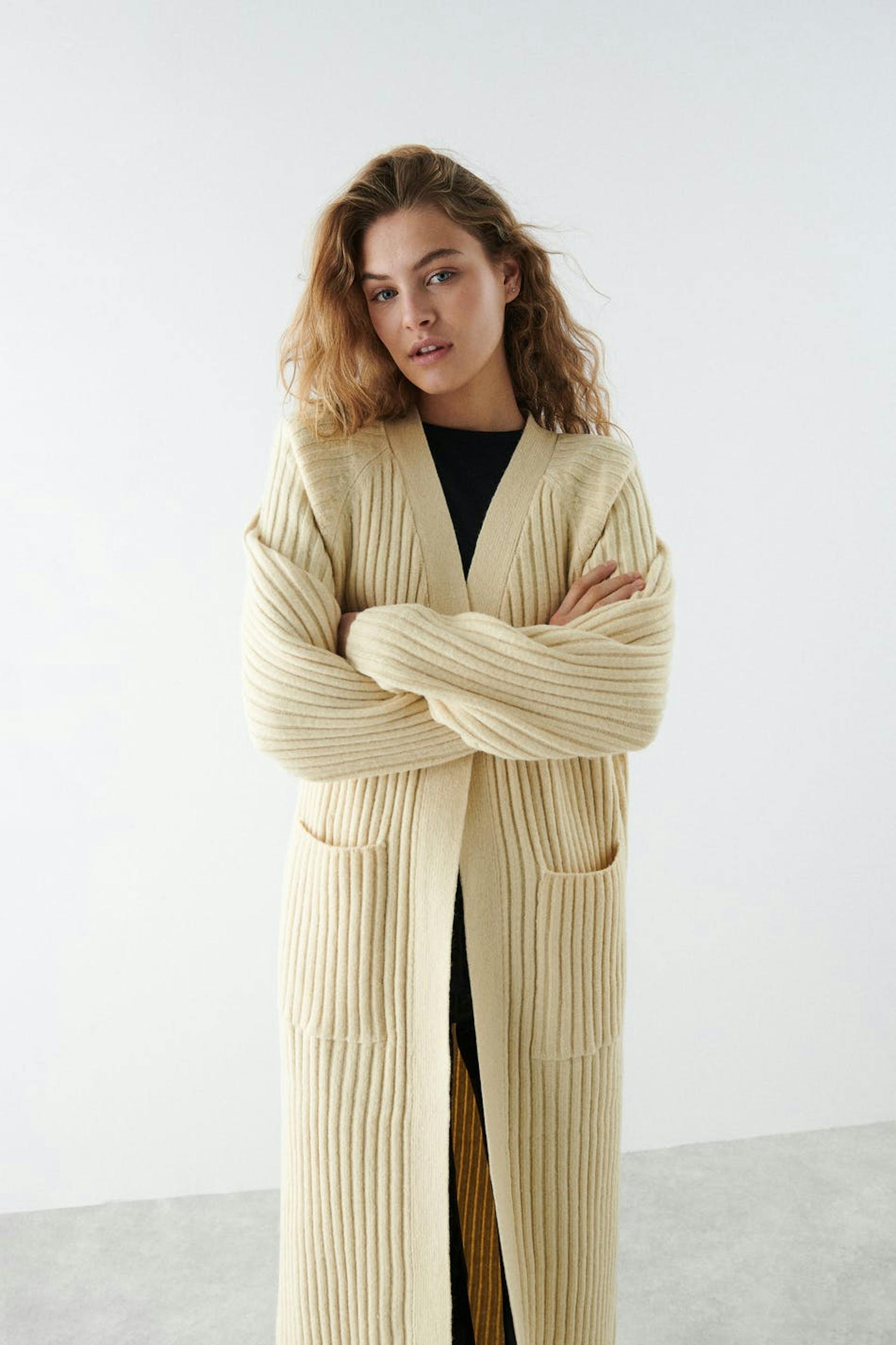 Knitted long cardigan with pockets on the sides. The cardigan is beige and has long sleeves.