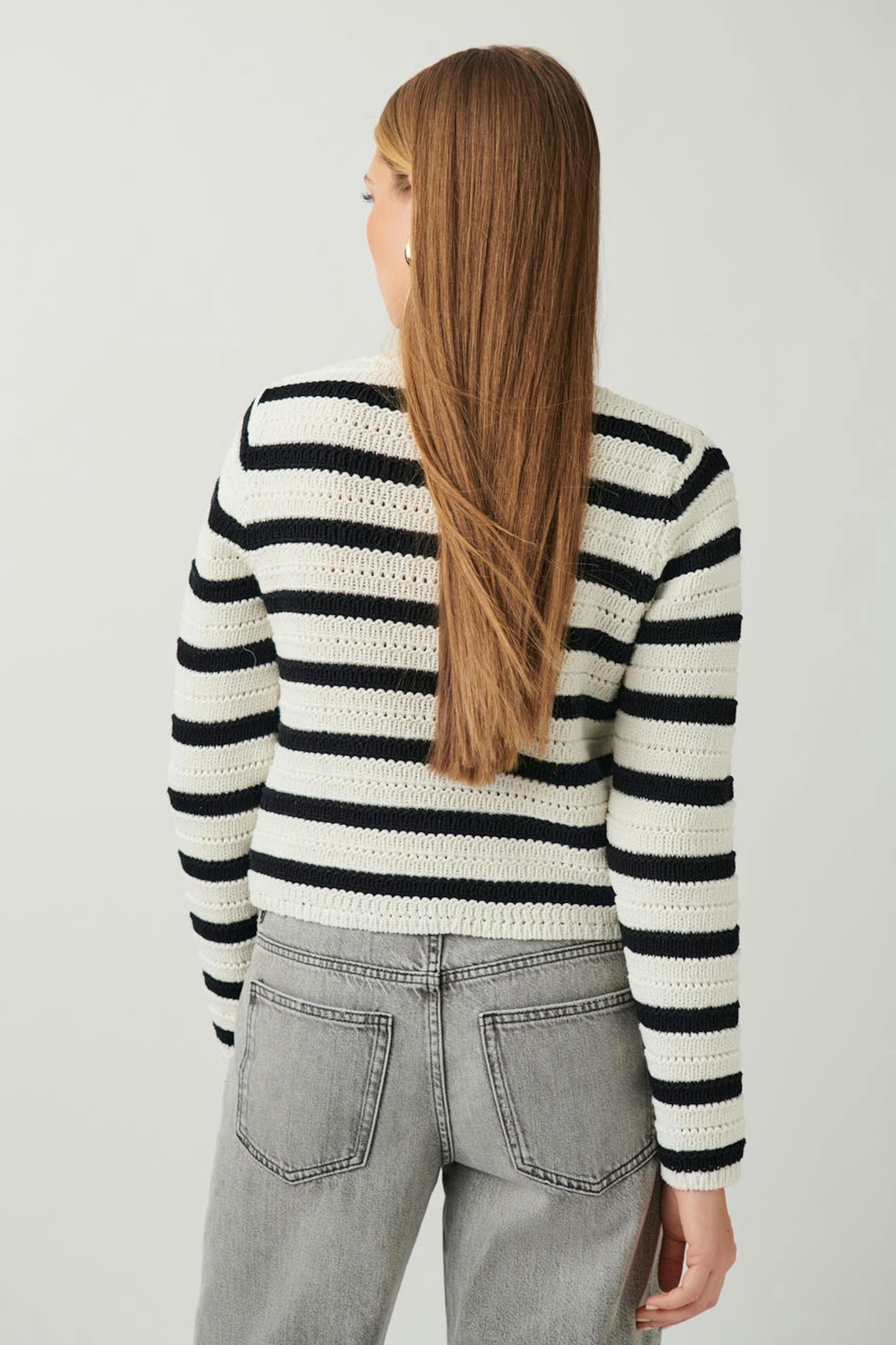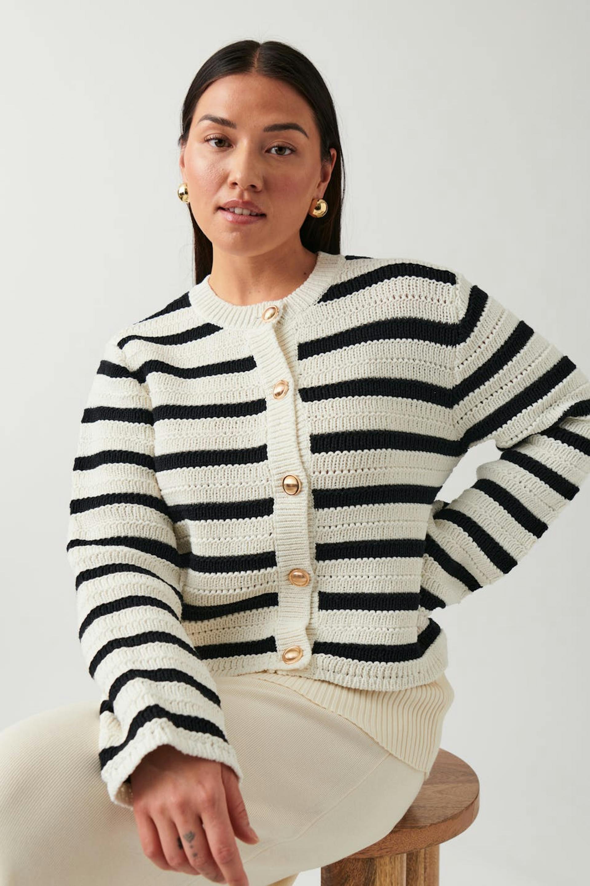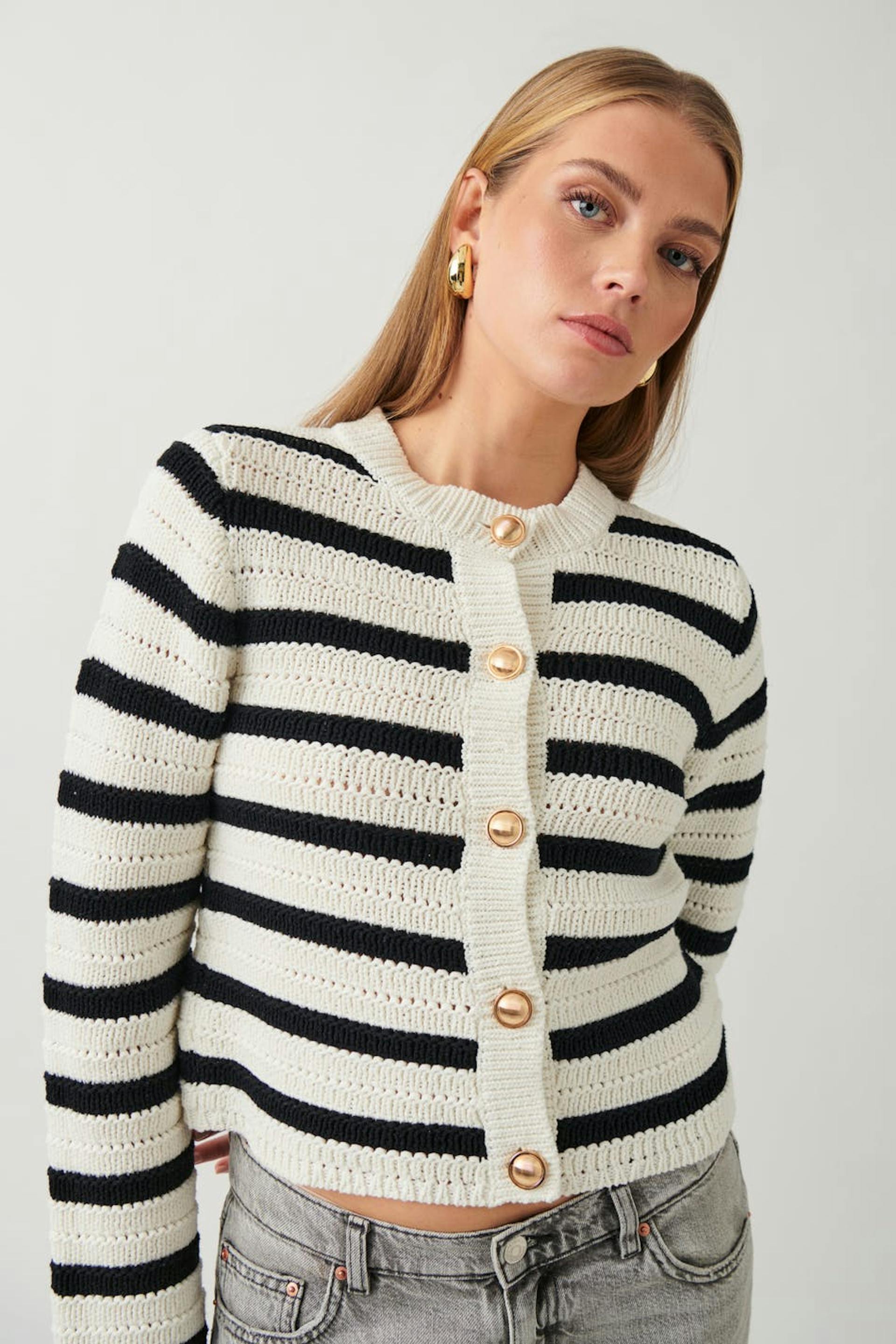 Striped cardigan with gold buttons at the front. The cardigan is black, white and knitted.