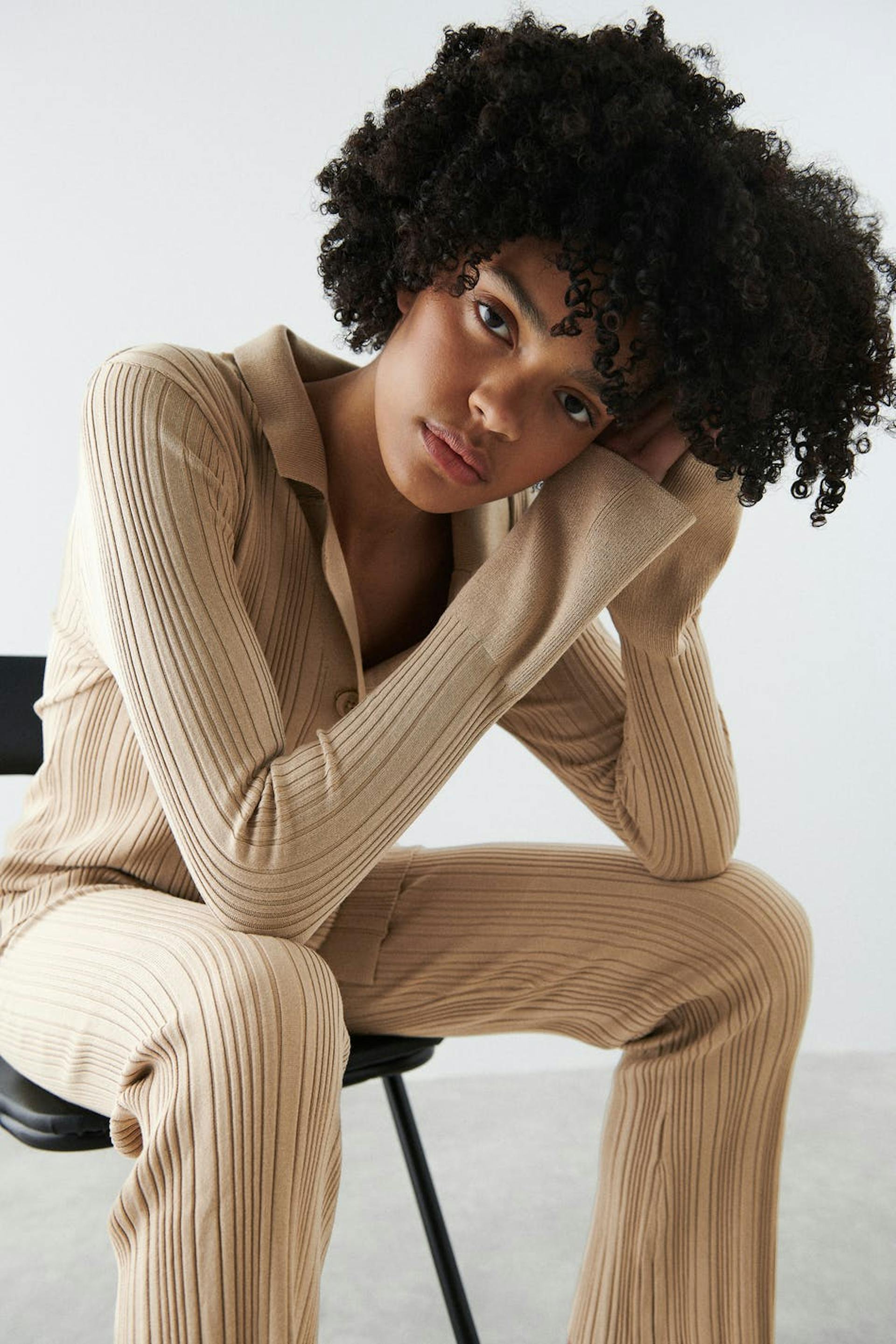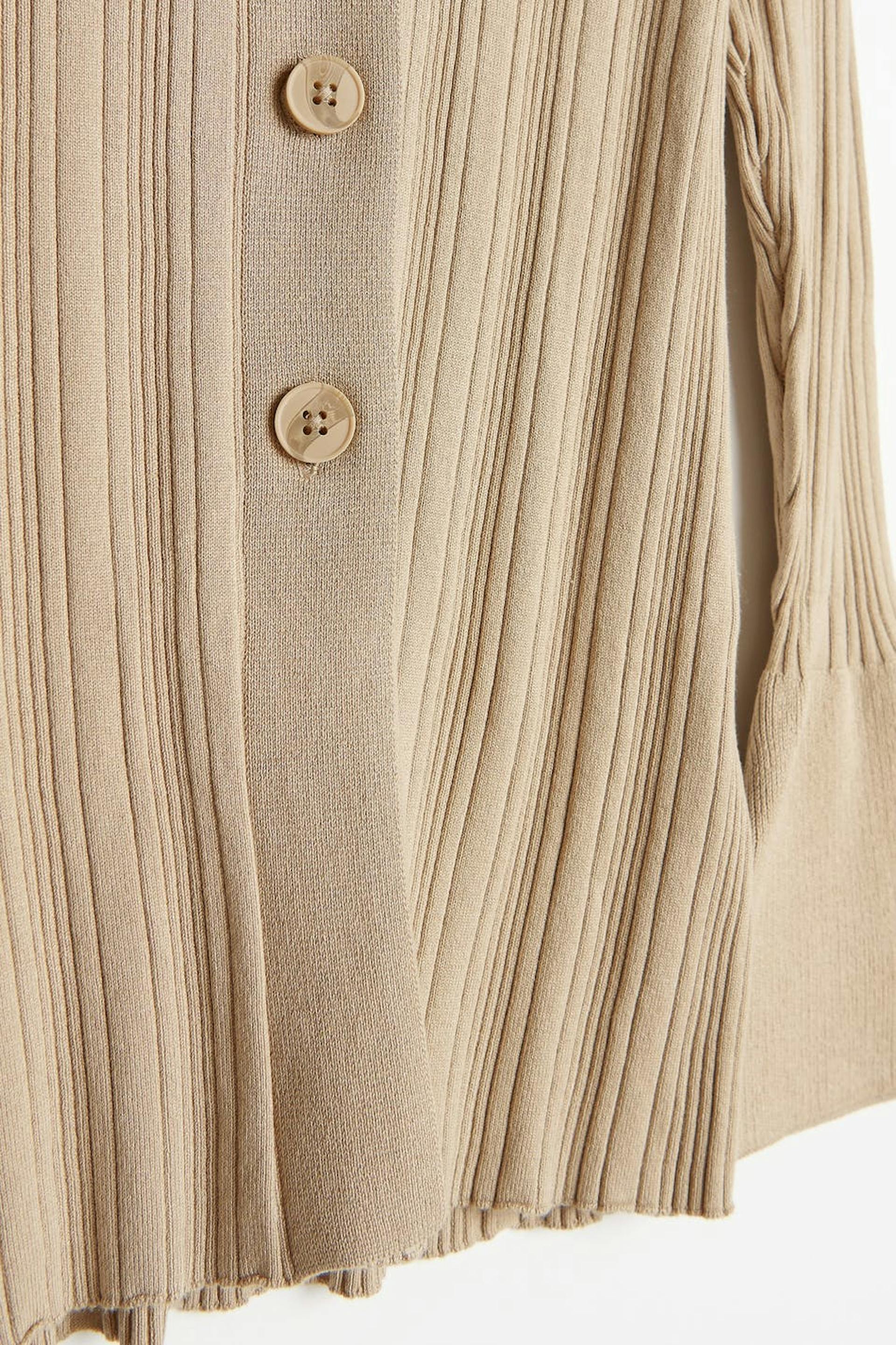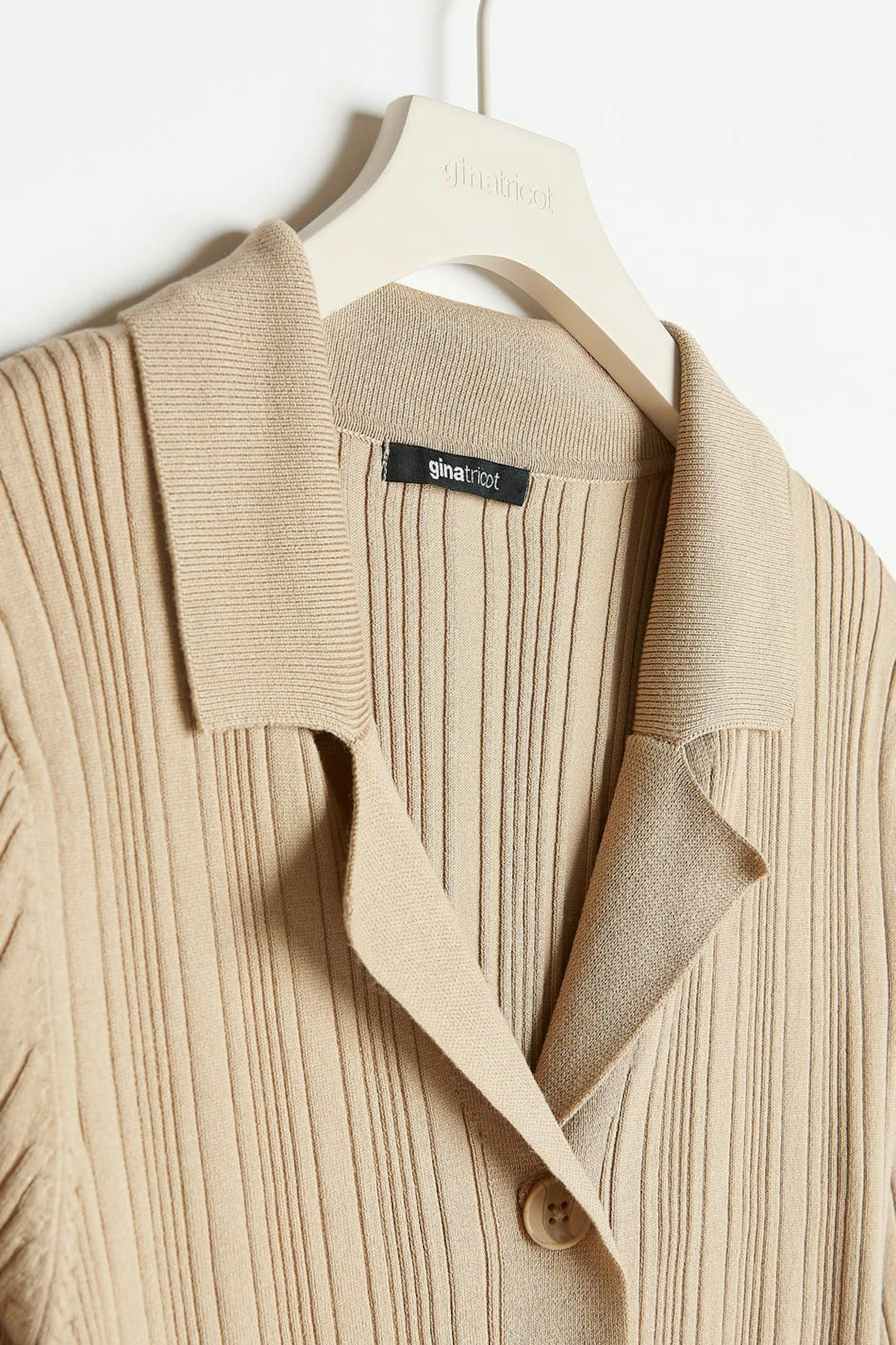 Knitted jumper with irregular rib design. The jumper is beige and has a shirt collar. It has button placket in front and long lantern sleeves.