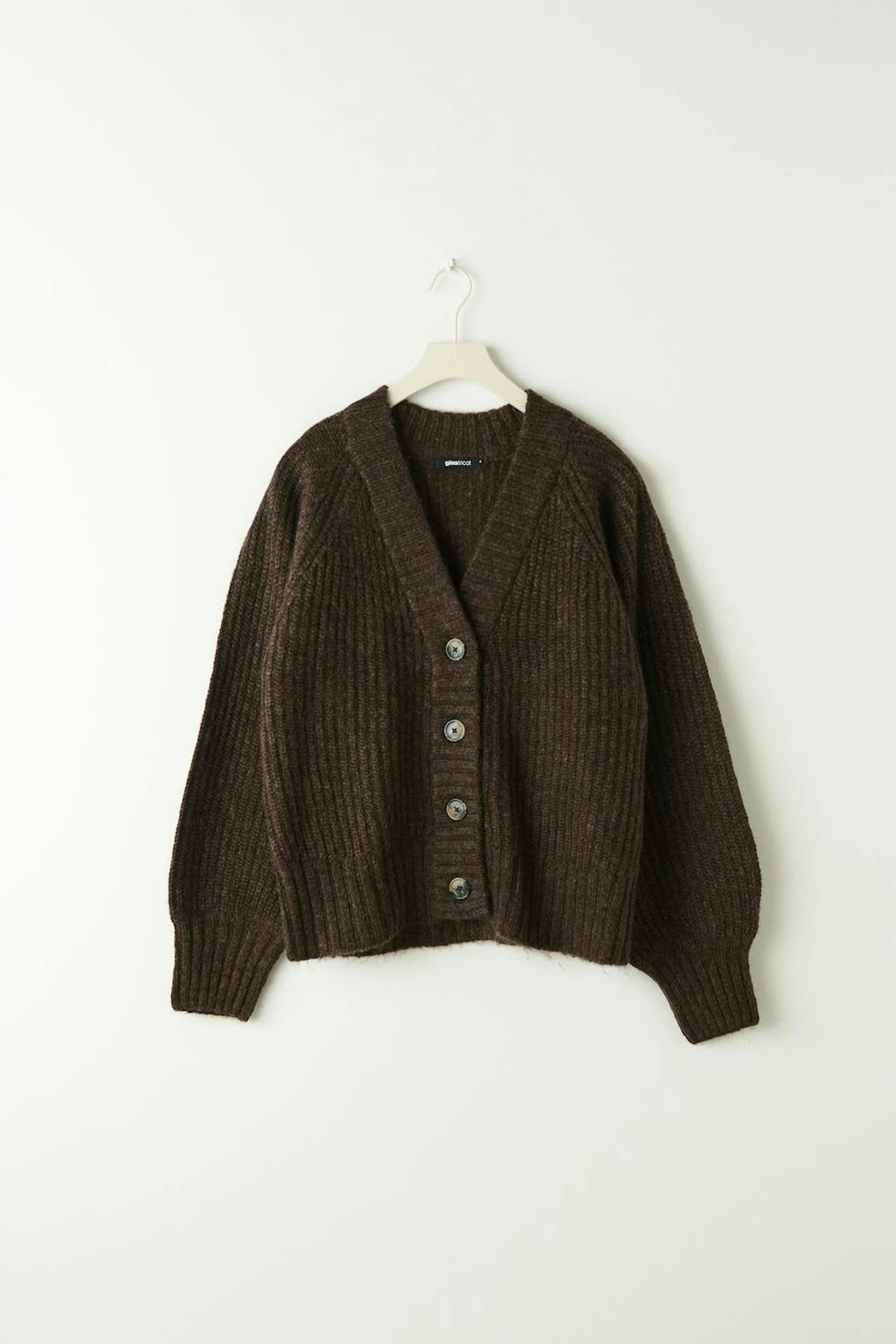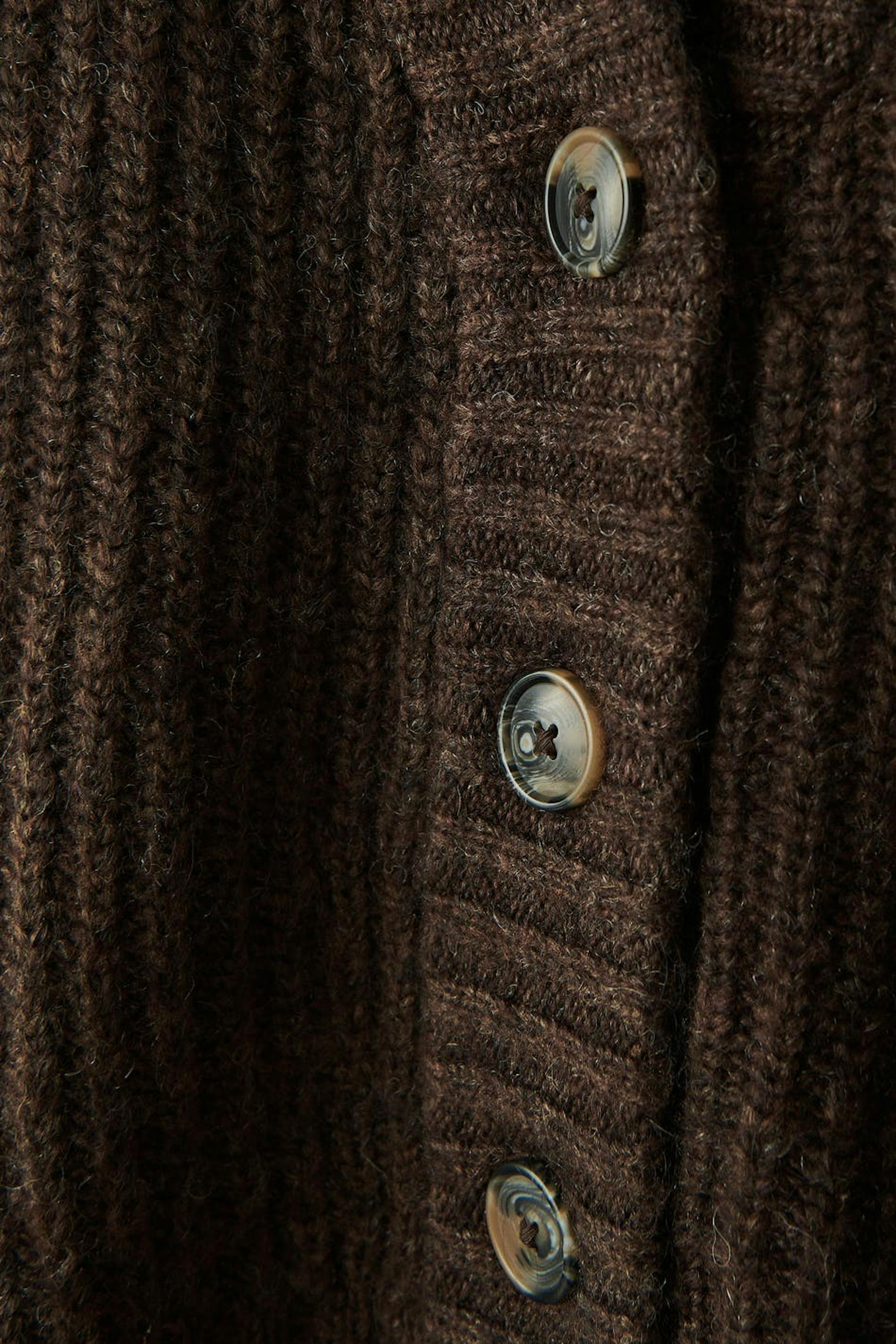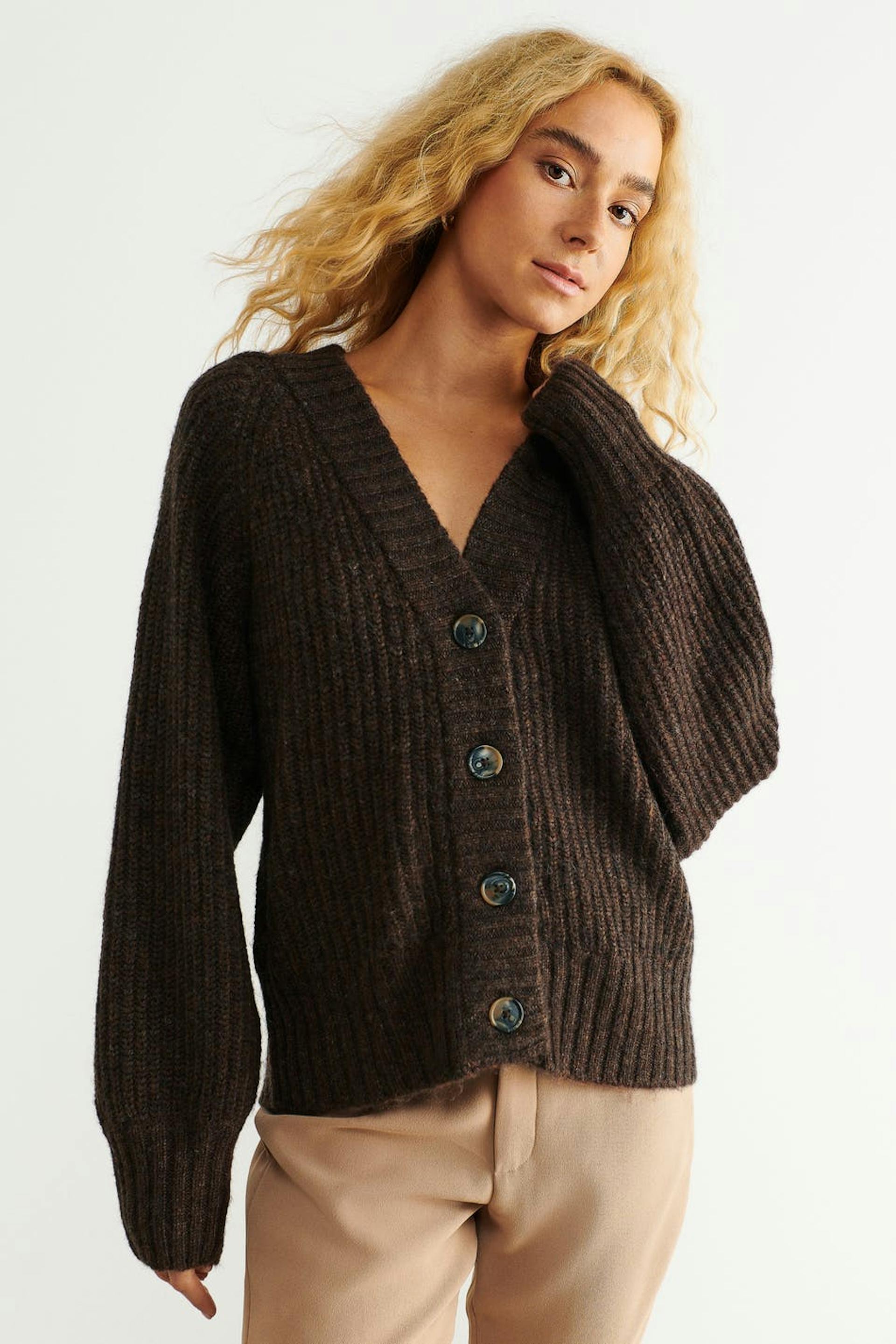 Knitted cardigan with loose-fitting style. The cardigan is brown and has button placket in front. It has v neckline and ribbed hem.