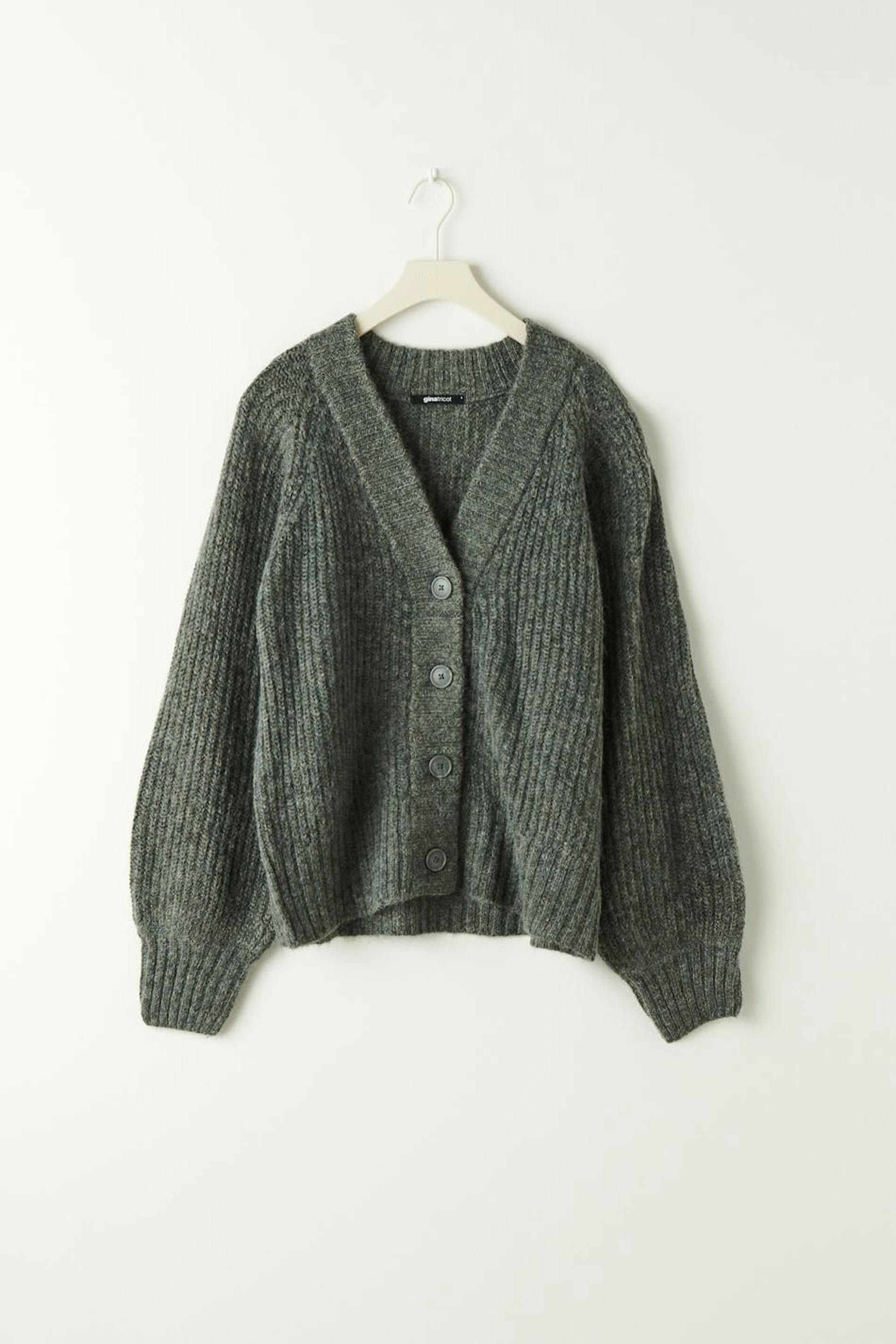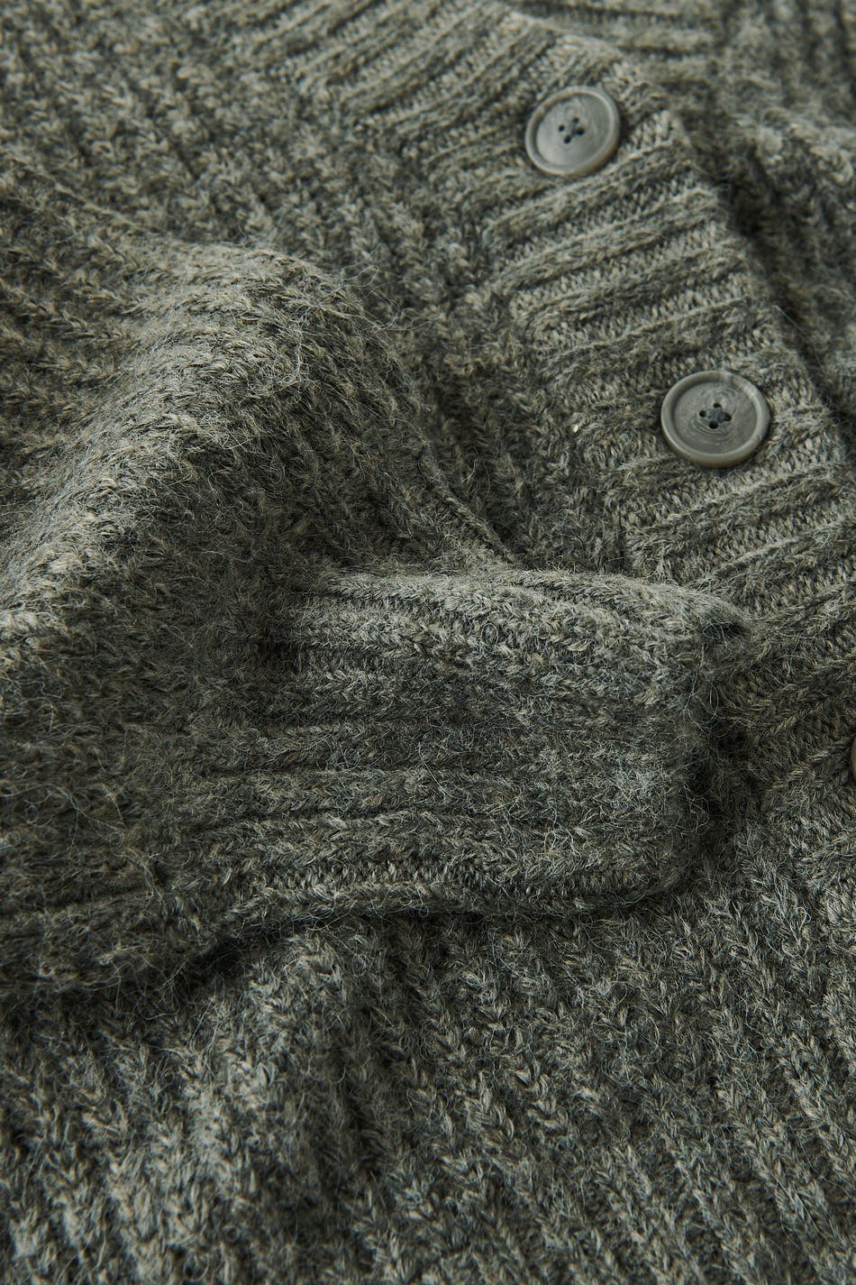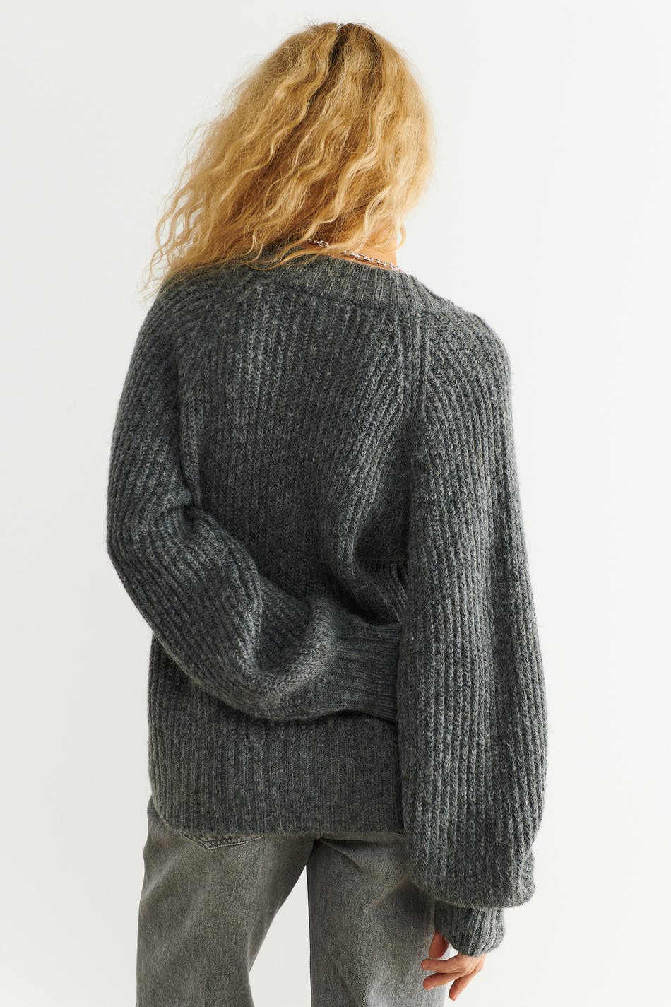 Knitted cardigan with loose-fitting style. The cardigan is grey and has button placket in front. It has v neckline and ribbed hem.