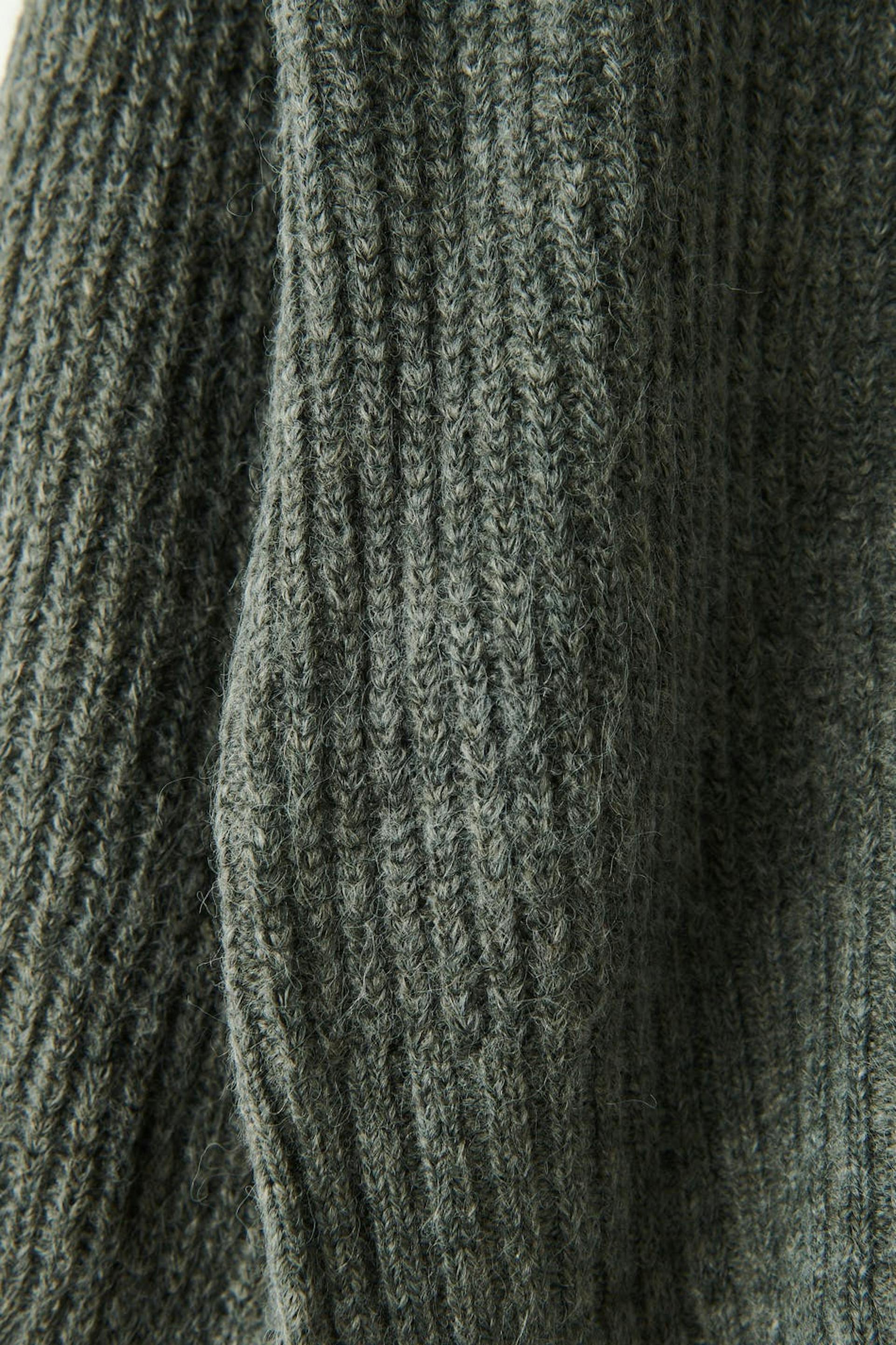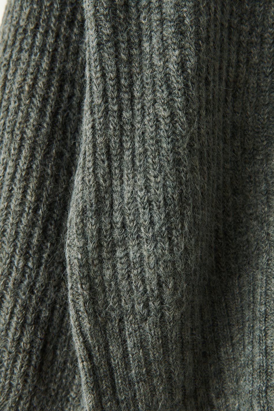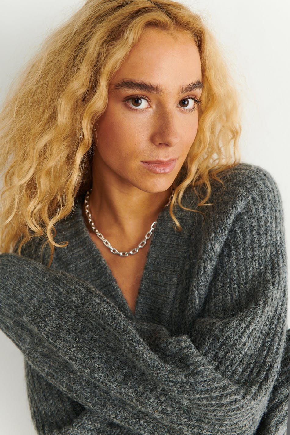 Knitted cardigan with loose-fitting style. The cardigan is grey and has button placket in front. It has v neckline and ribbed hem.