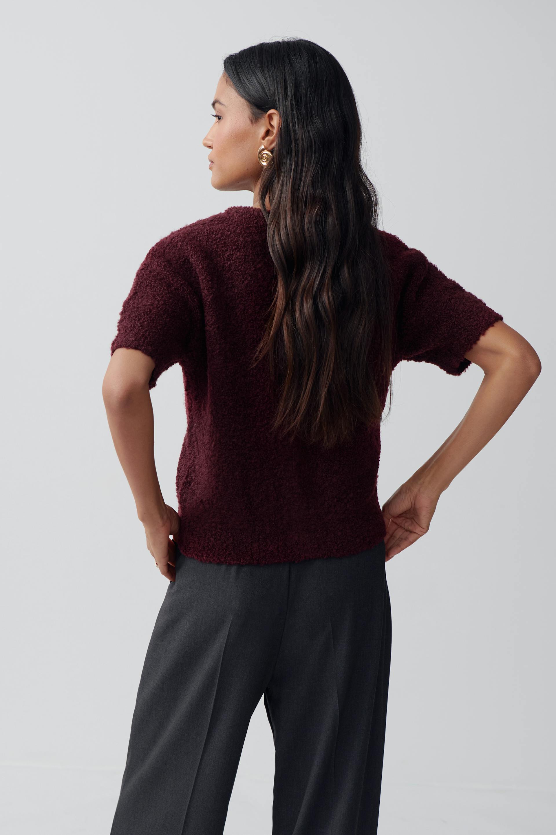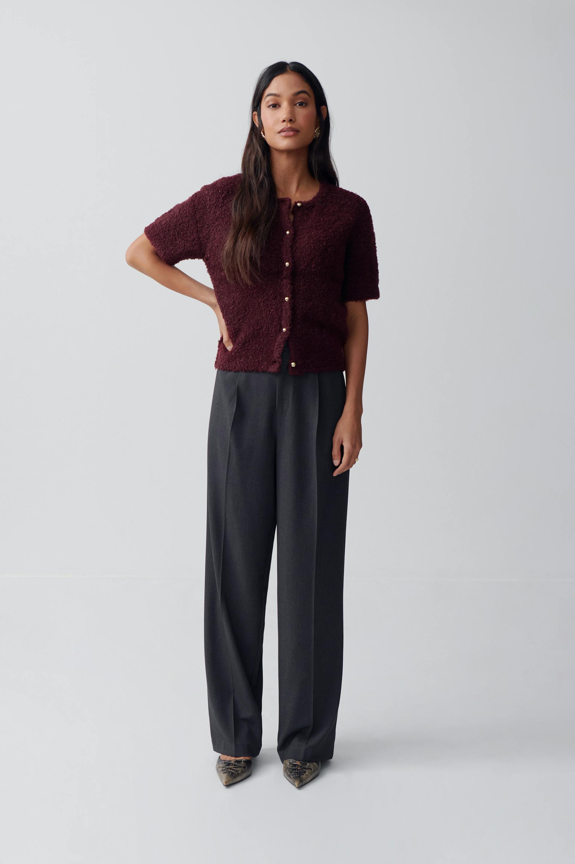 Short-sleeved cardigan in bouclé with buttons at the front. The cardigan is wine and has regular fit. It has round neckline, soft, knitted quality and rib knit at the bottom.
