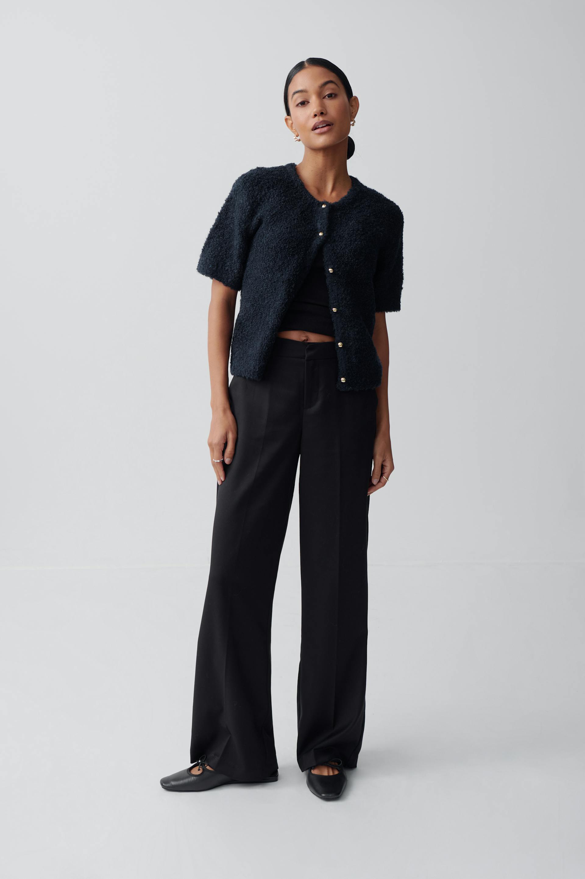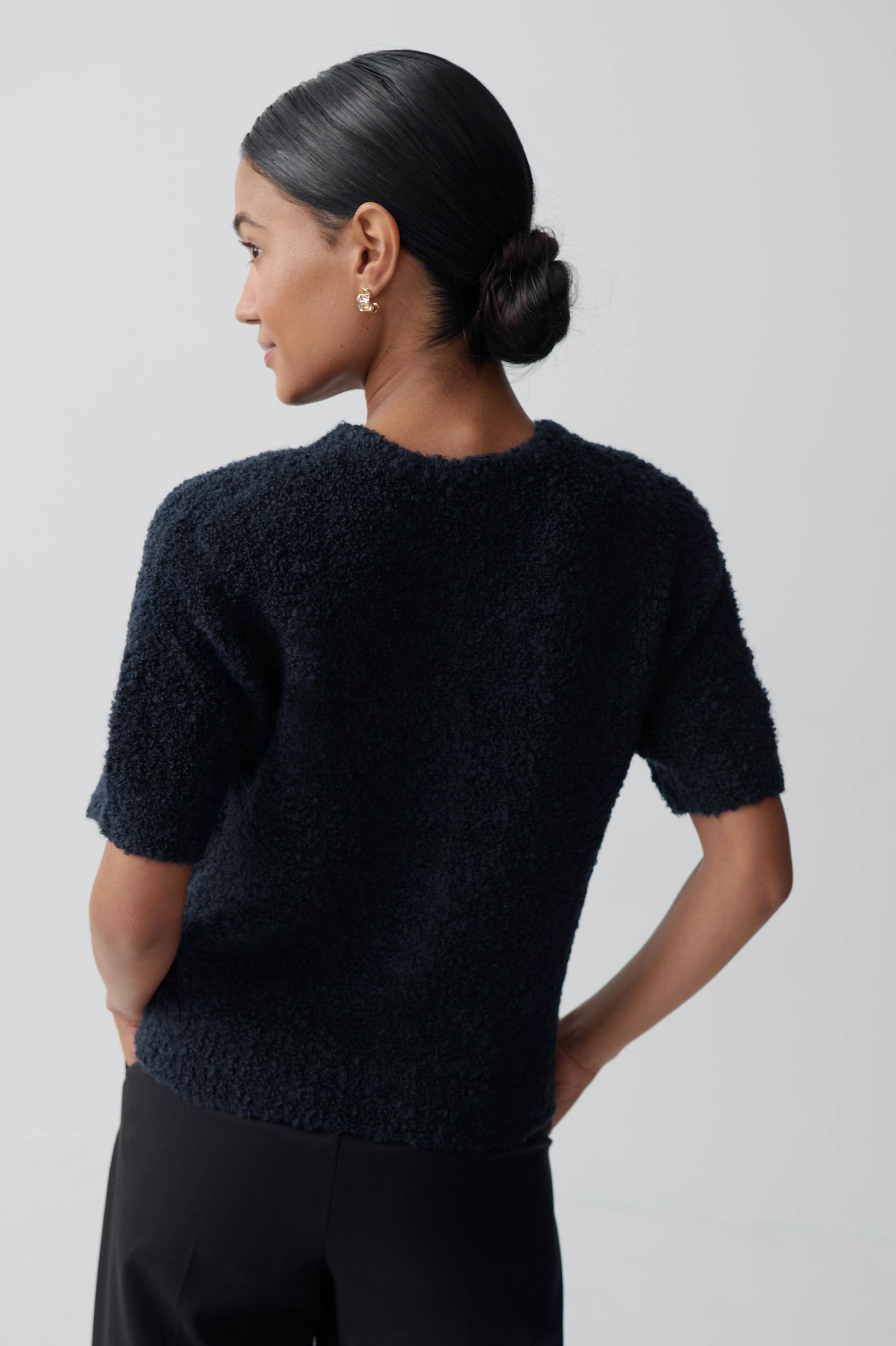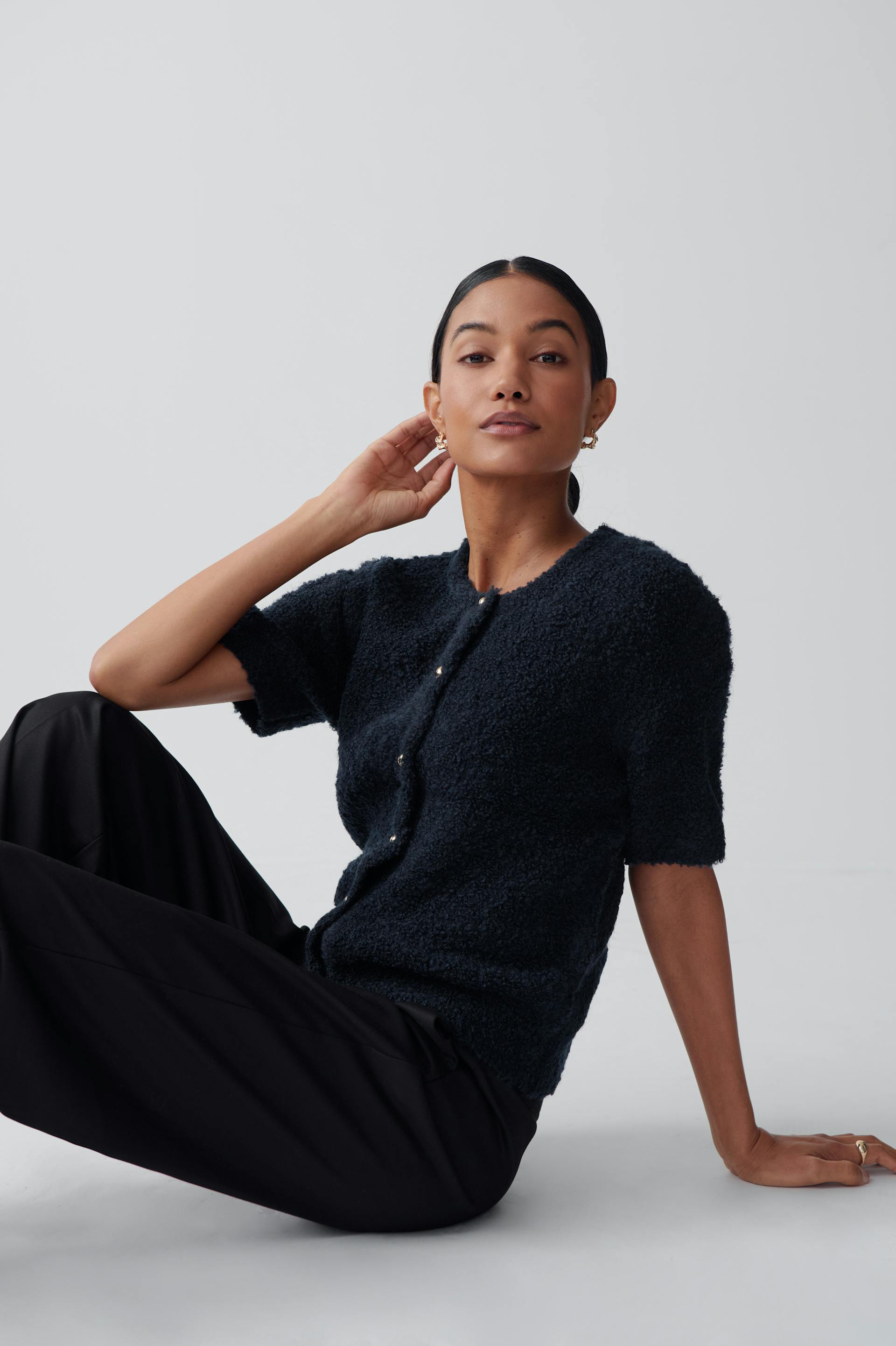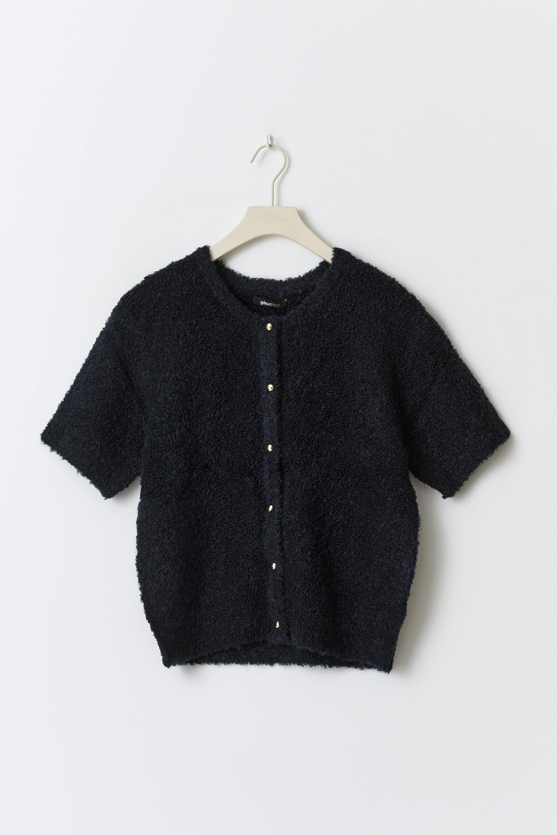 Short-sleeved cardigan in bouclé with buttons at the front. The cardigan is navy and has regular fit. It has round neckline, soft, knitted quality and rib knit at the bottom.