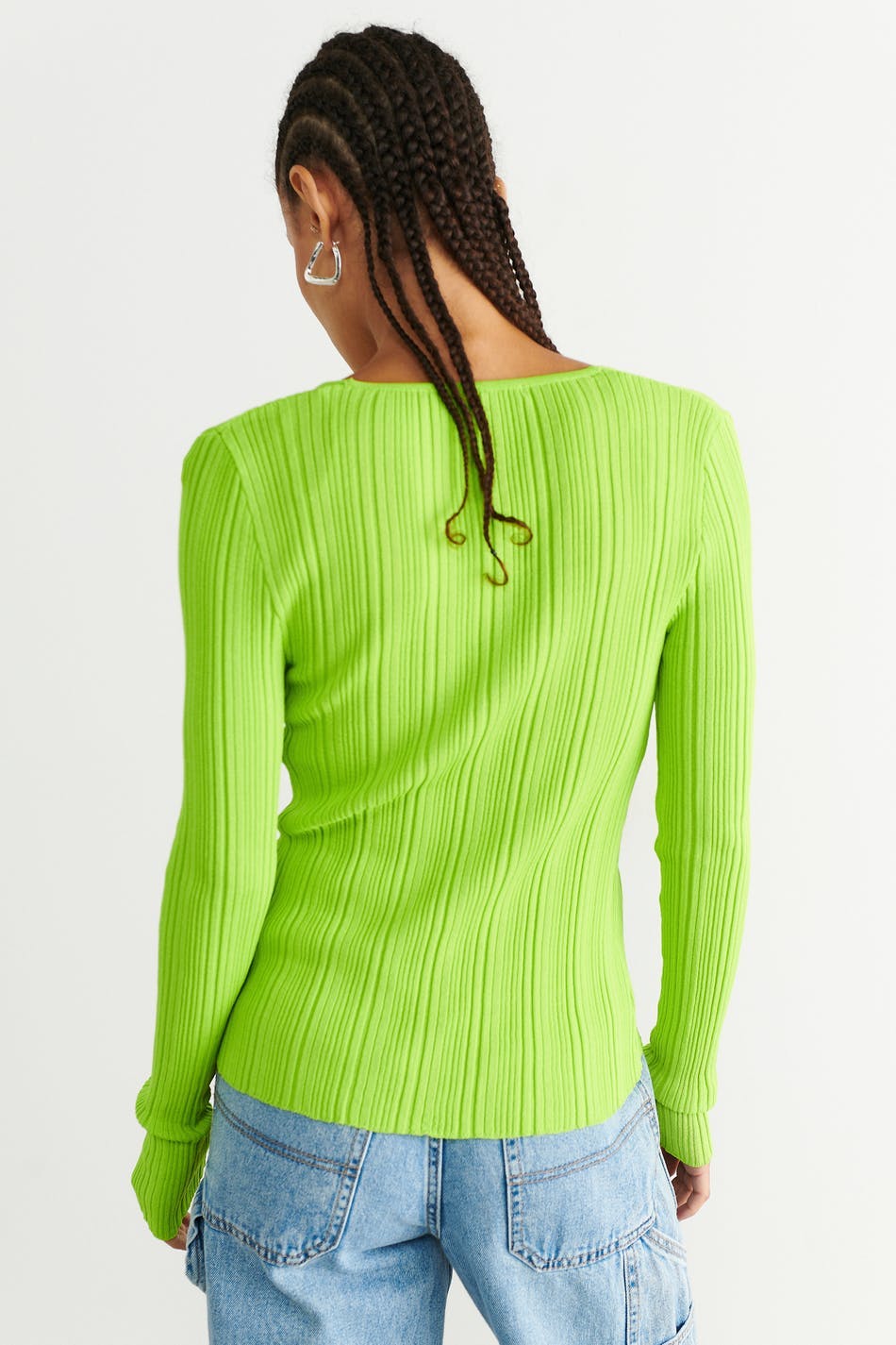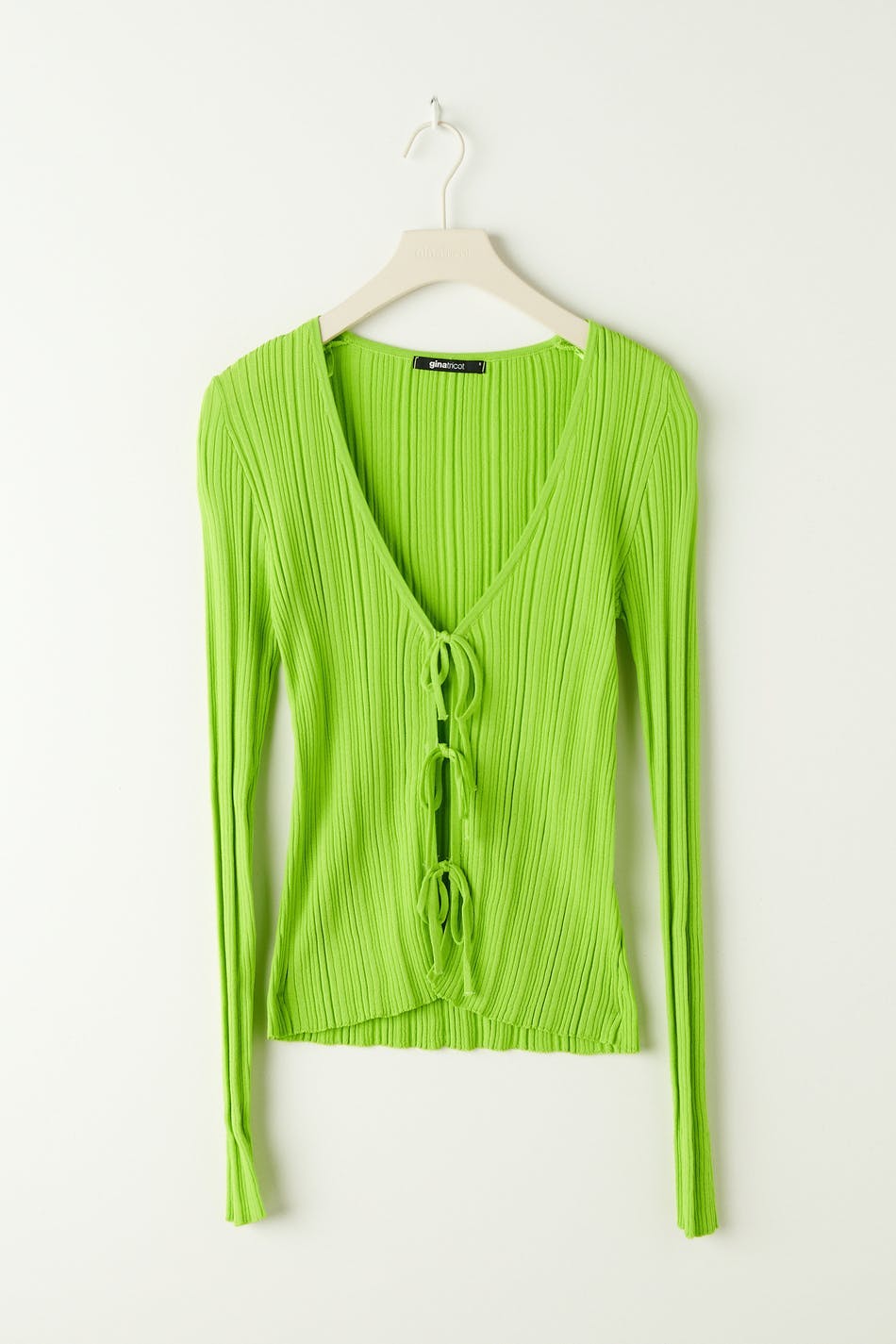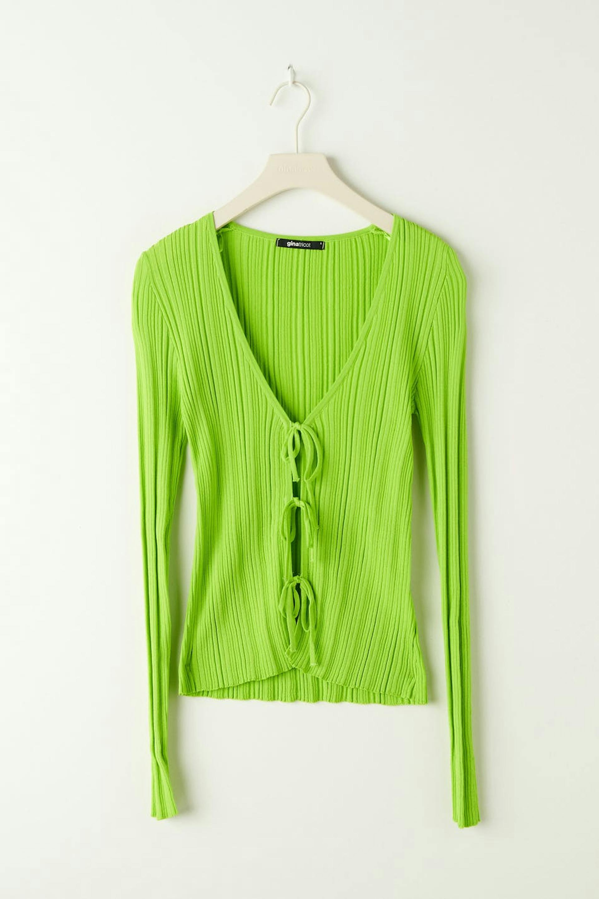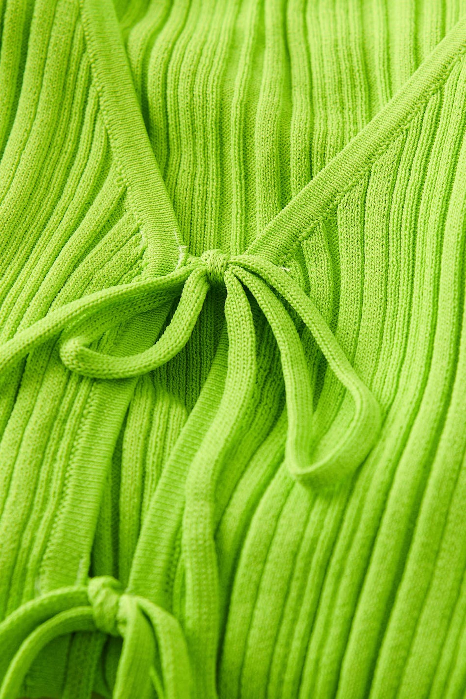 Rib-knit cardigan with knot closure in front. The cardigan is green and has v neckline.