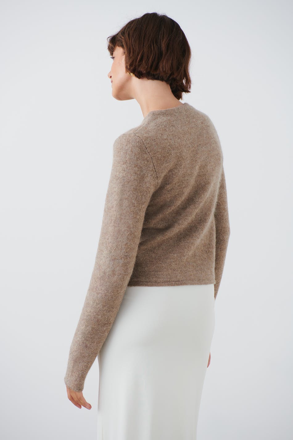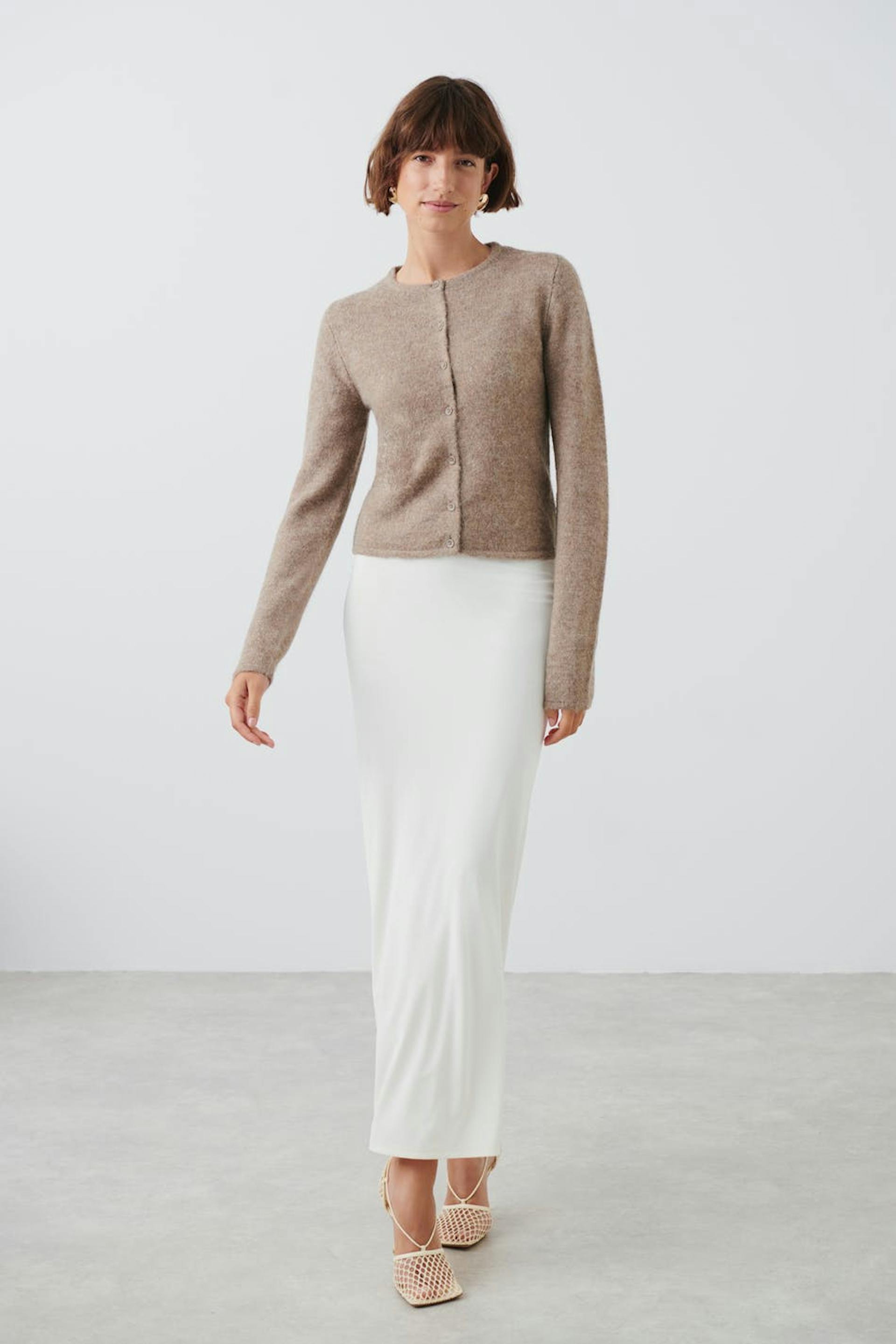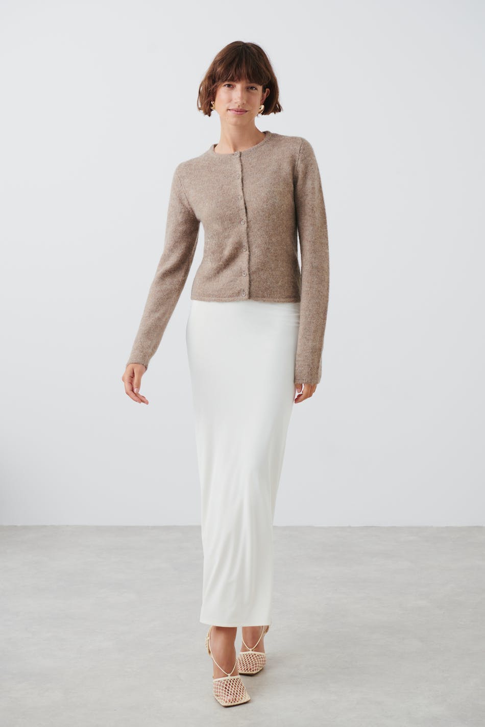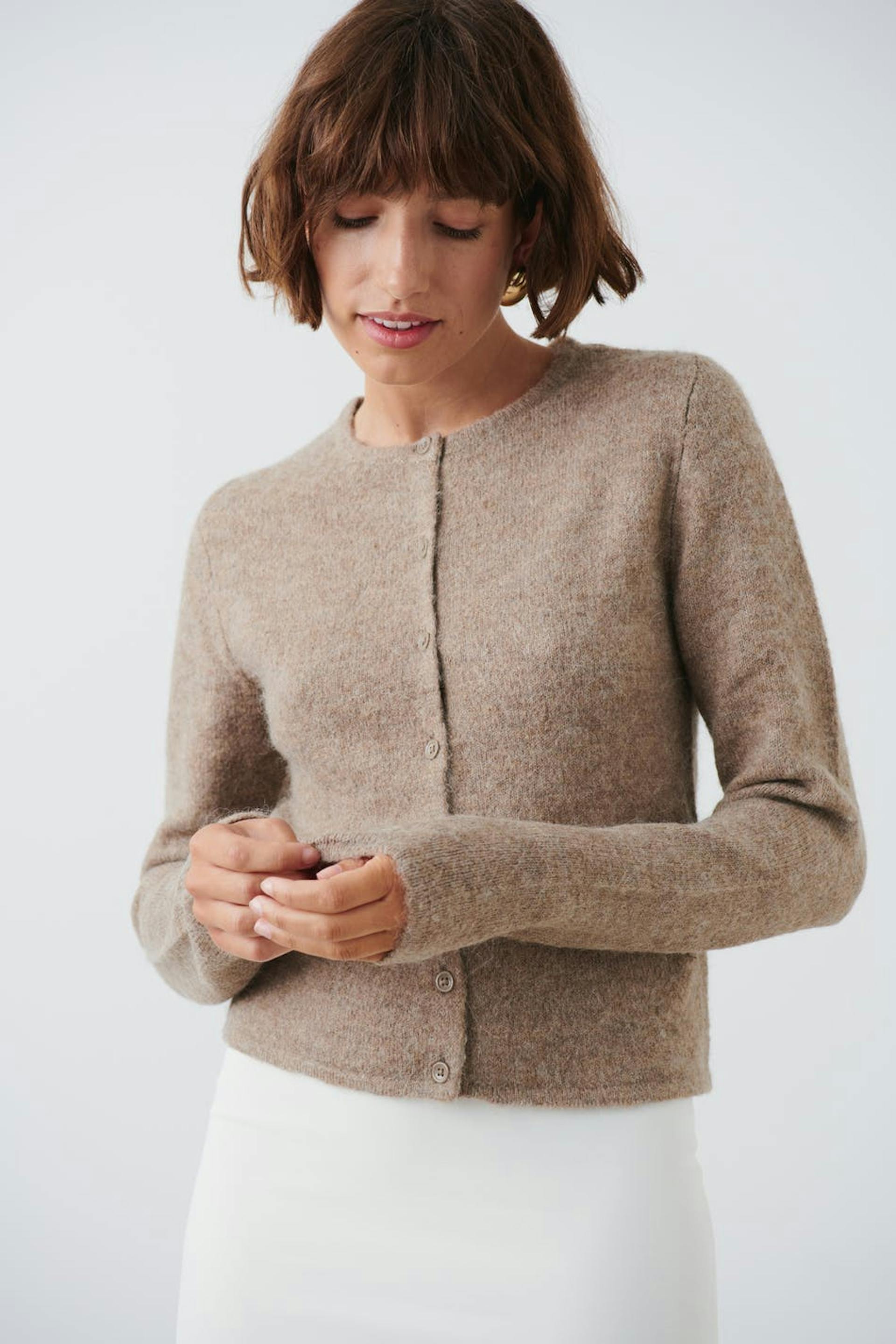 Soft knit cardigan with regular fit. The cardigan is beige and has buttoning at the front. It has long sleeve and round neckline.