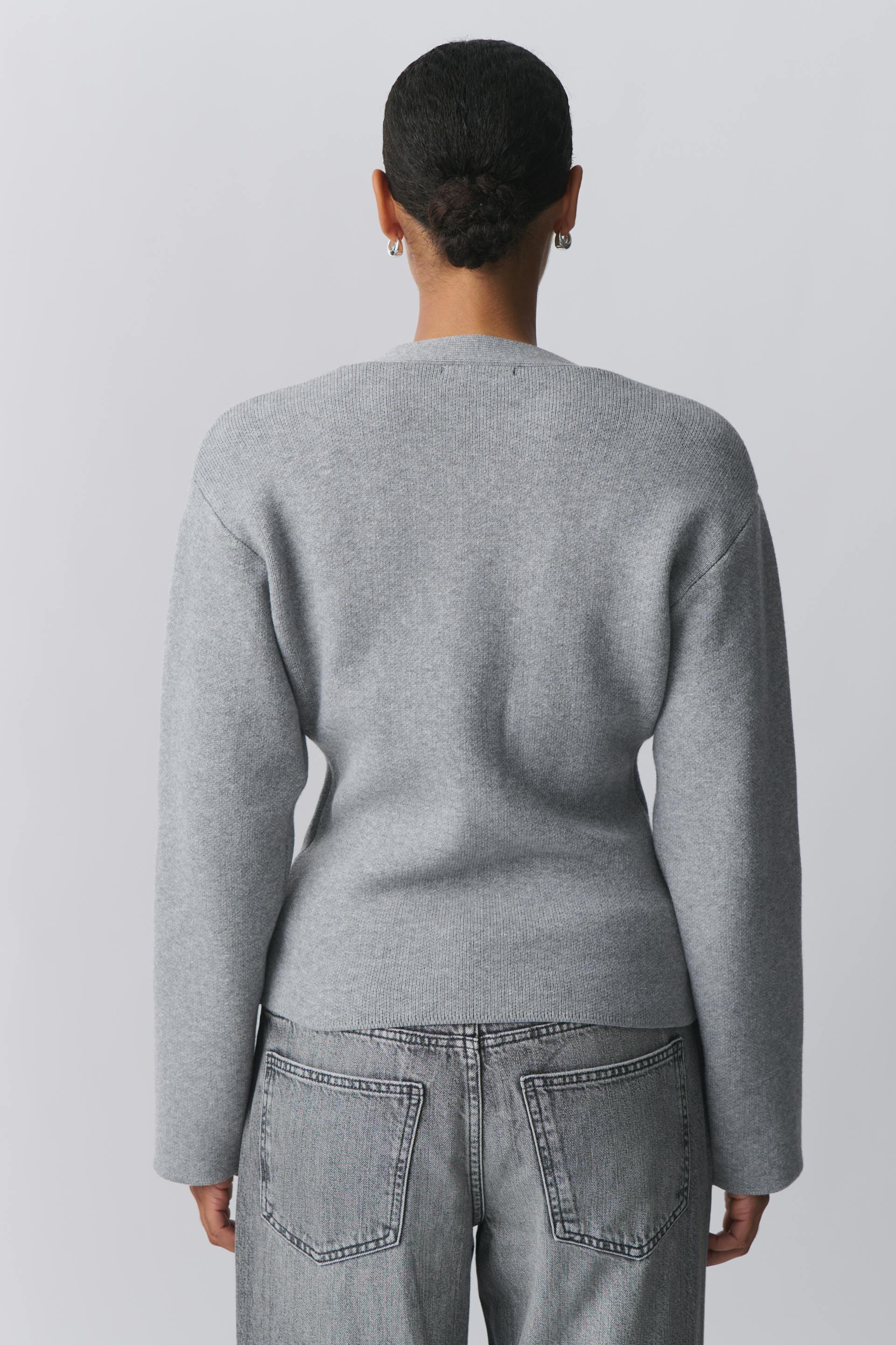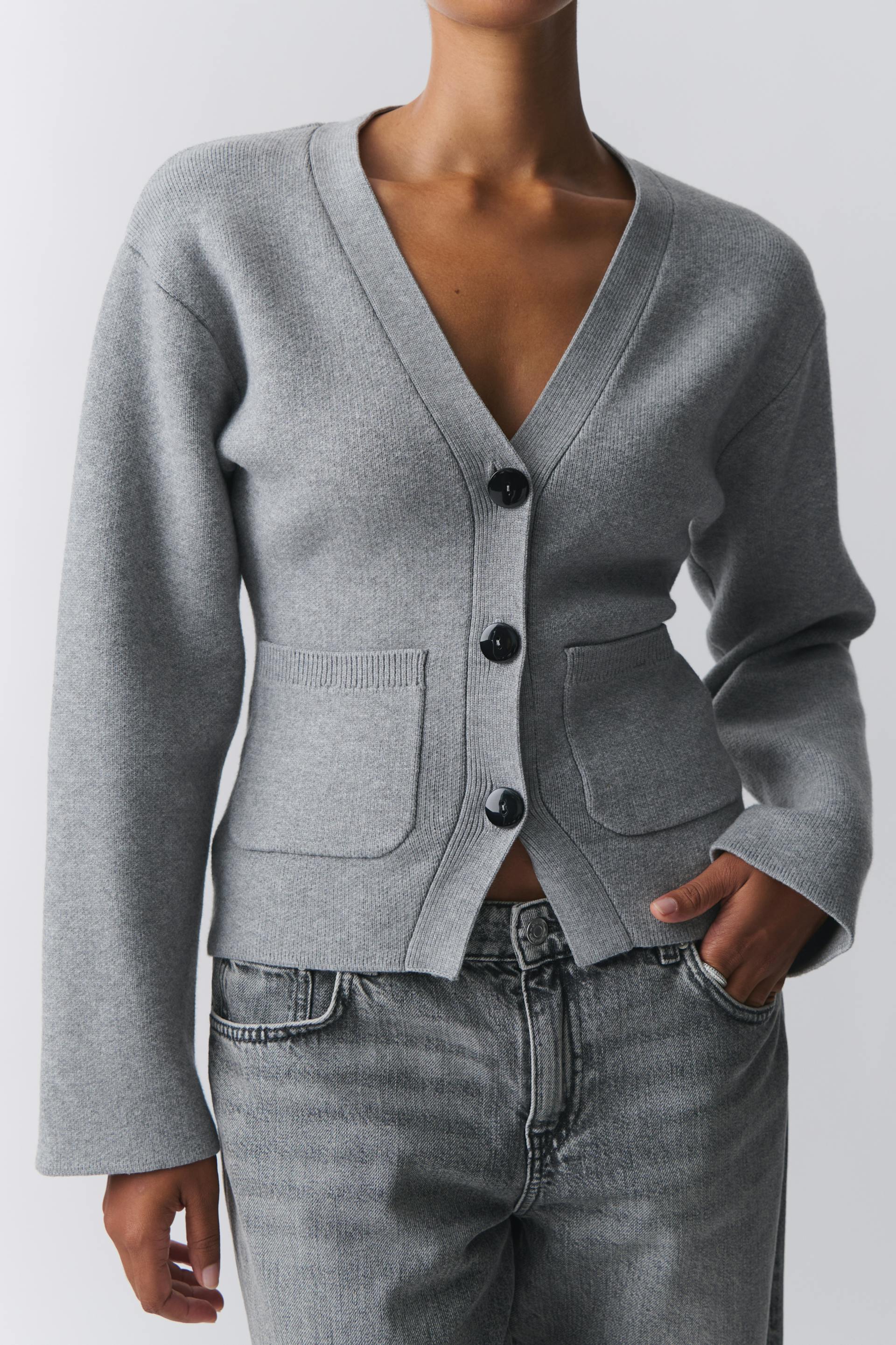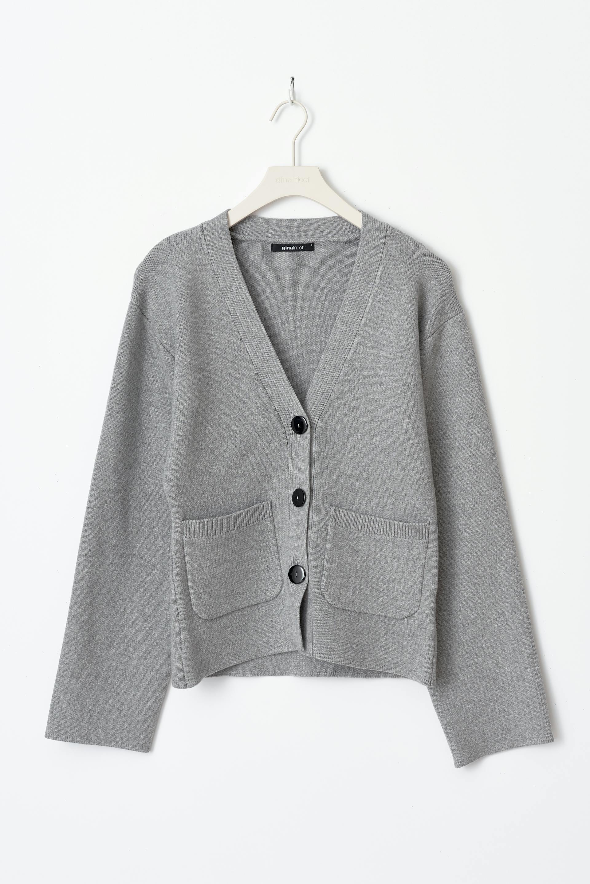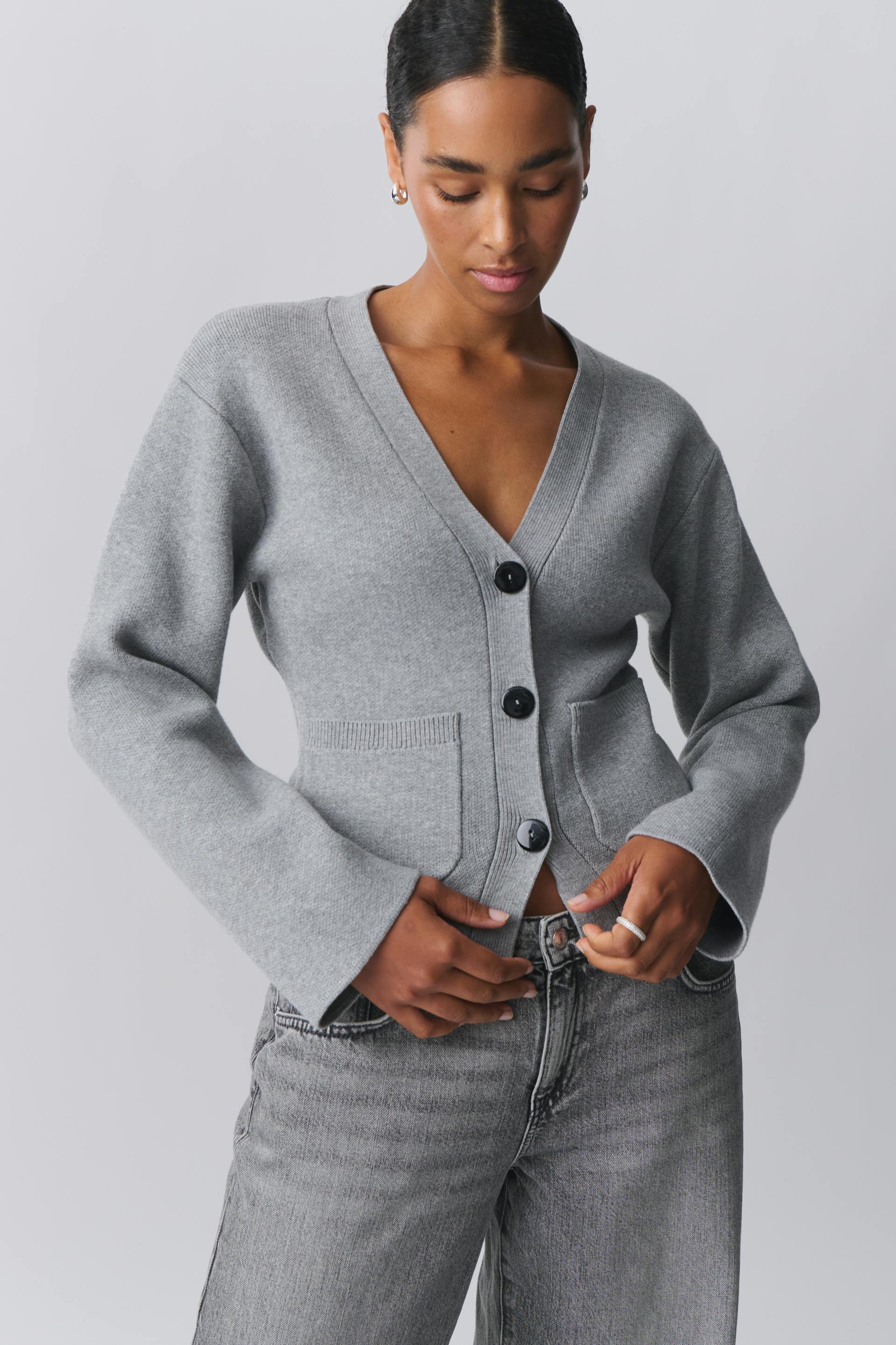 Knit cardigan with v-neck. The knit cardigan is grey and has regular fit. It has buttons at the front, long sleeve and pockets at the front.