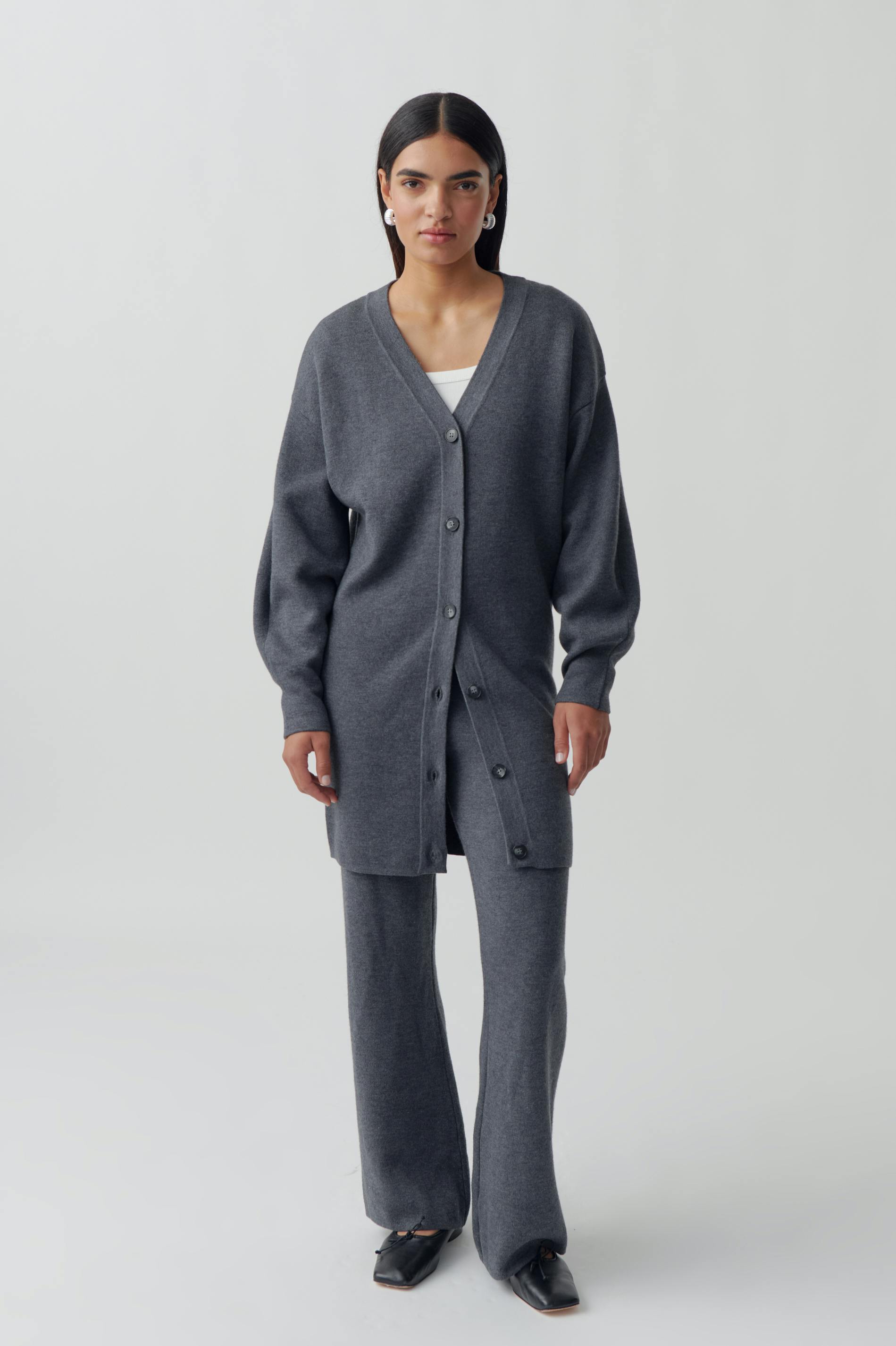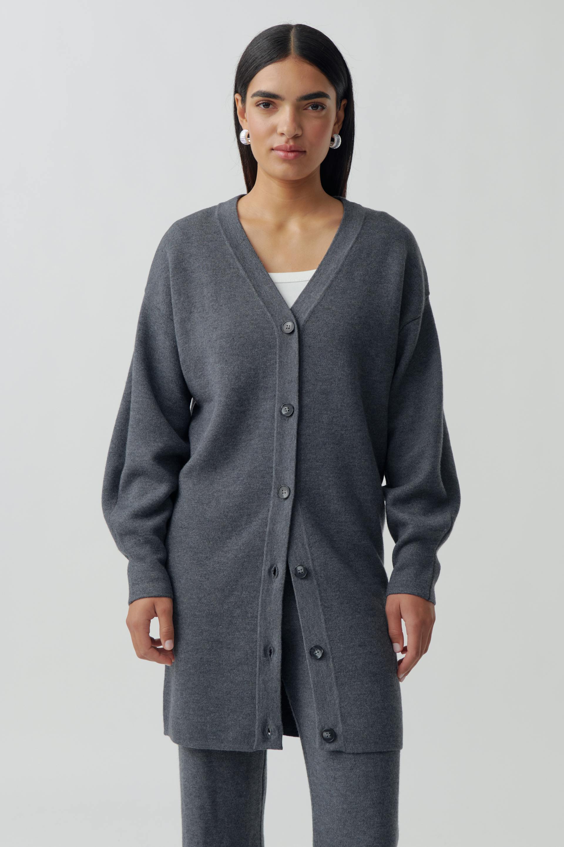 Long cardigan with oversize fit. The cardigan is grey and has v-neck. It has soft, knitted quality and buttons at the front.