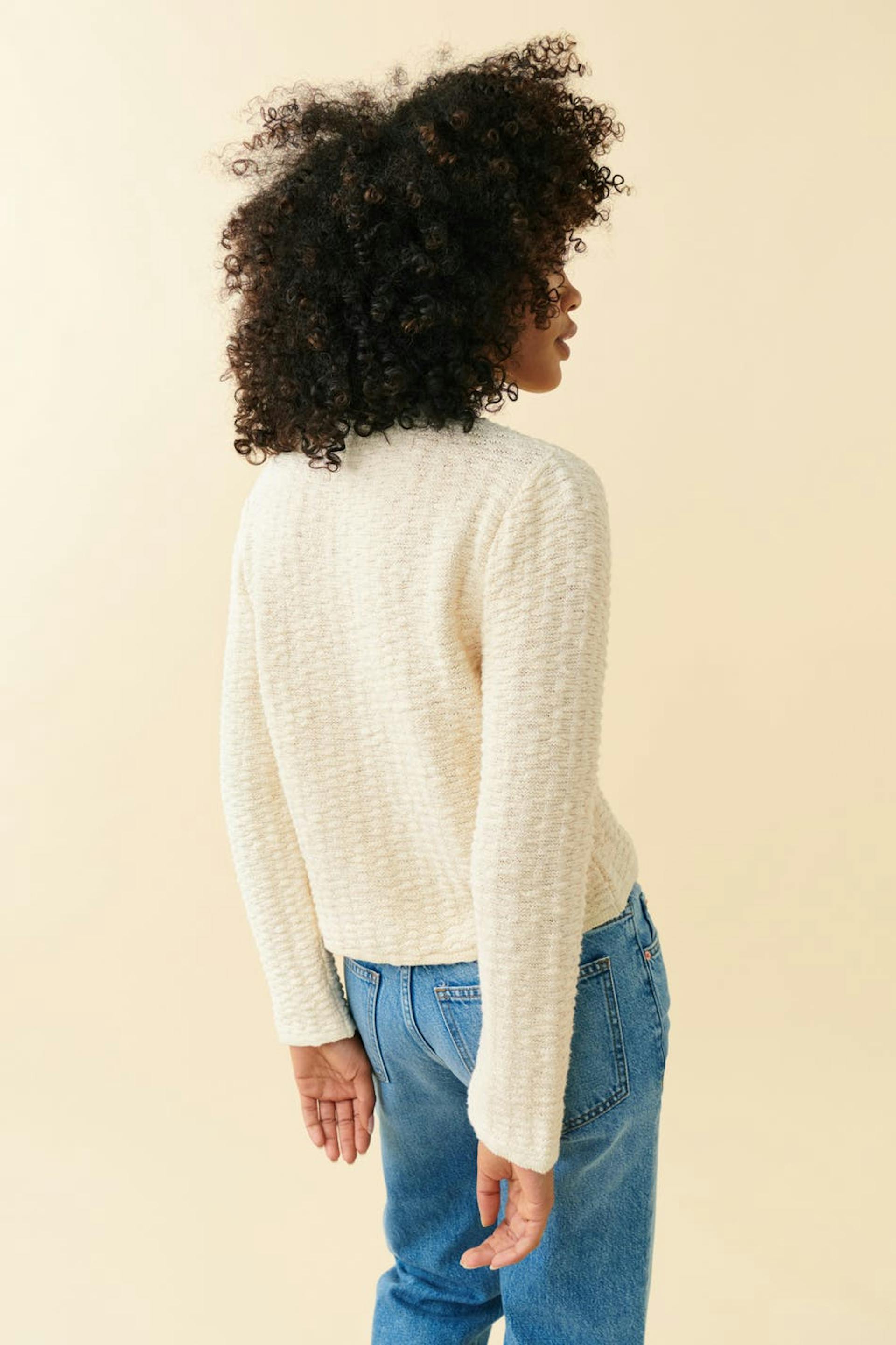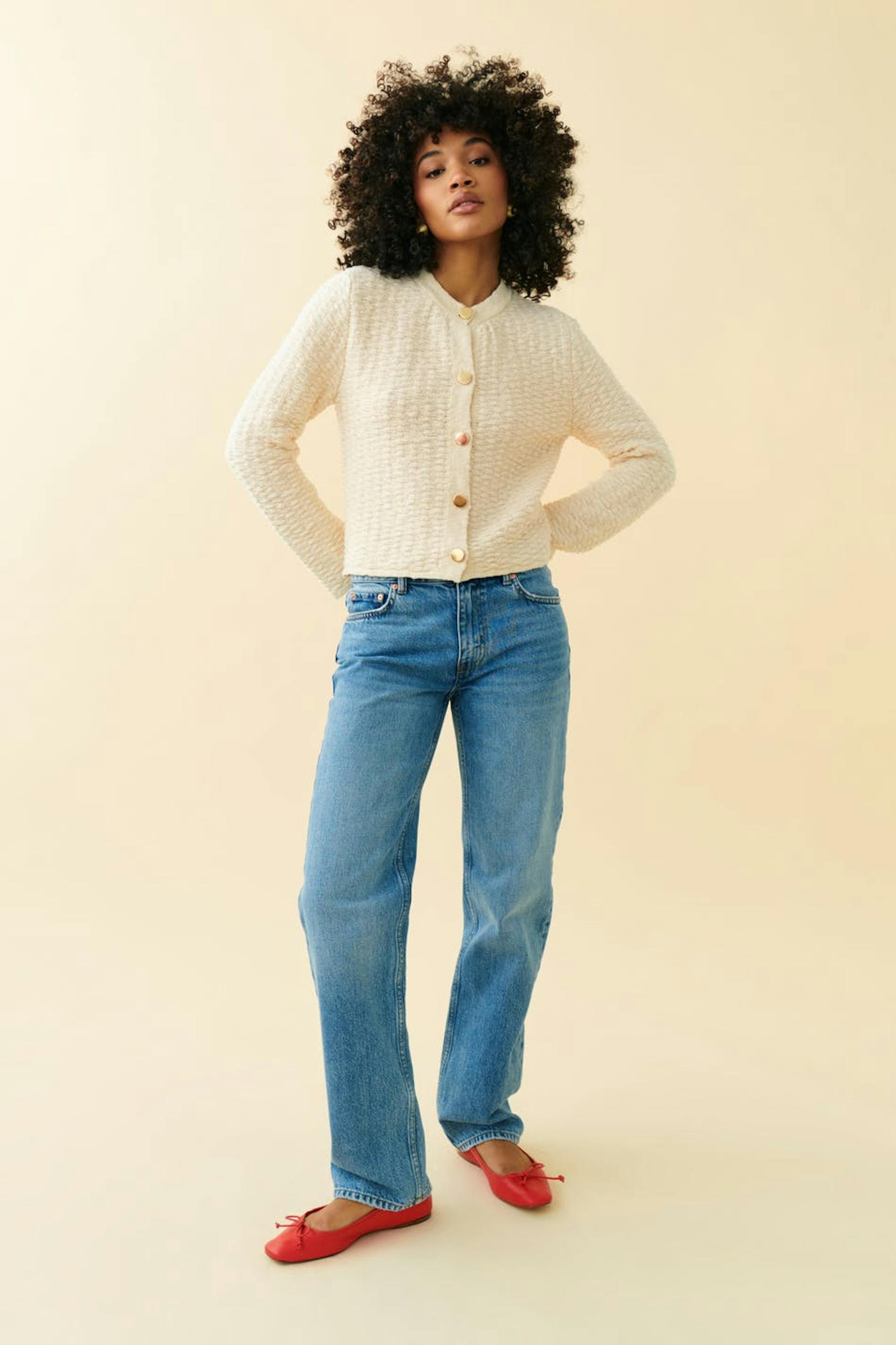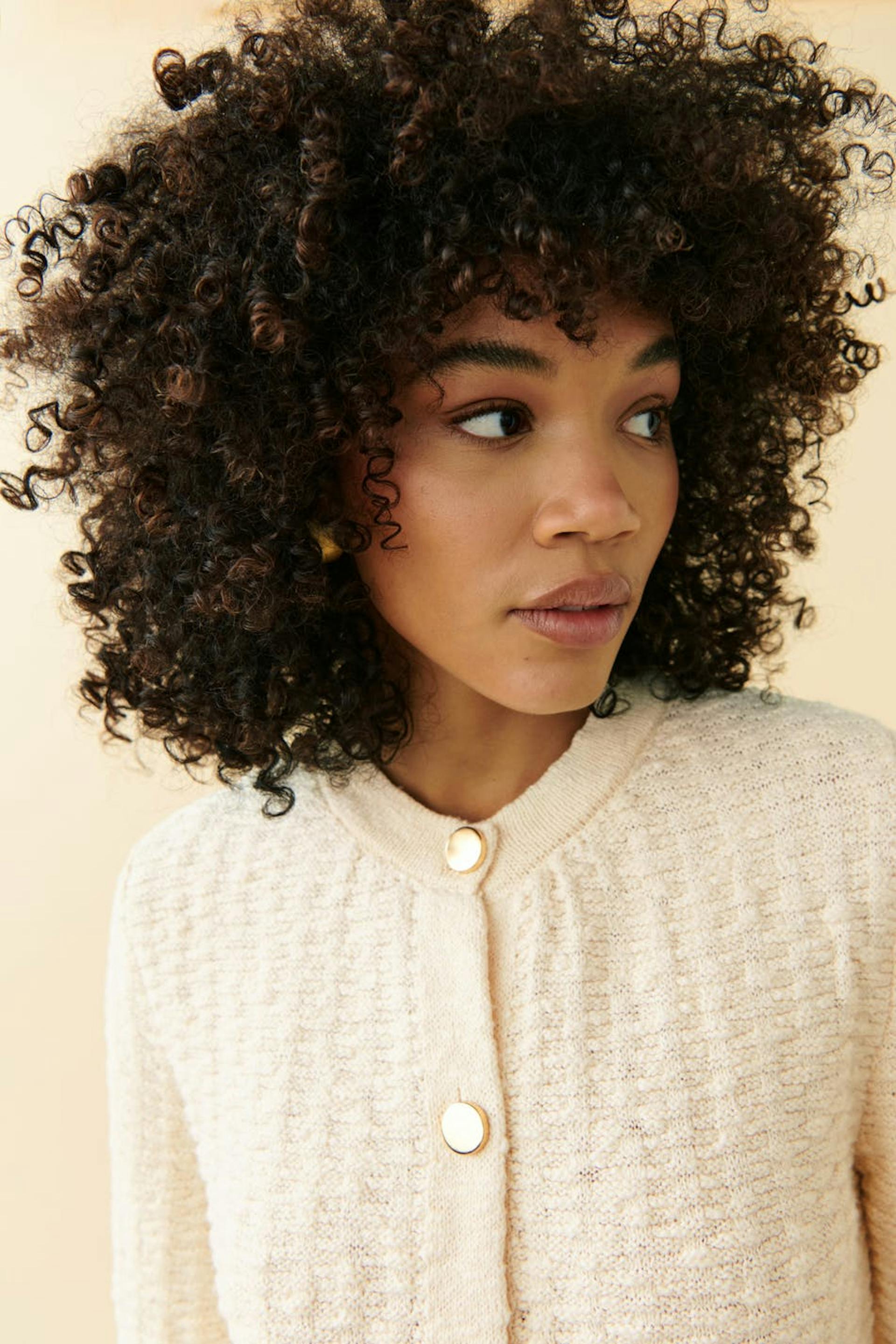 Knitted cardigan with normal fit. The cardigan is light beige and has gold coloured buttons at the front.