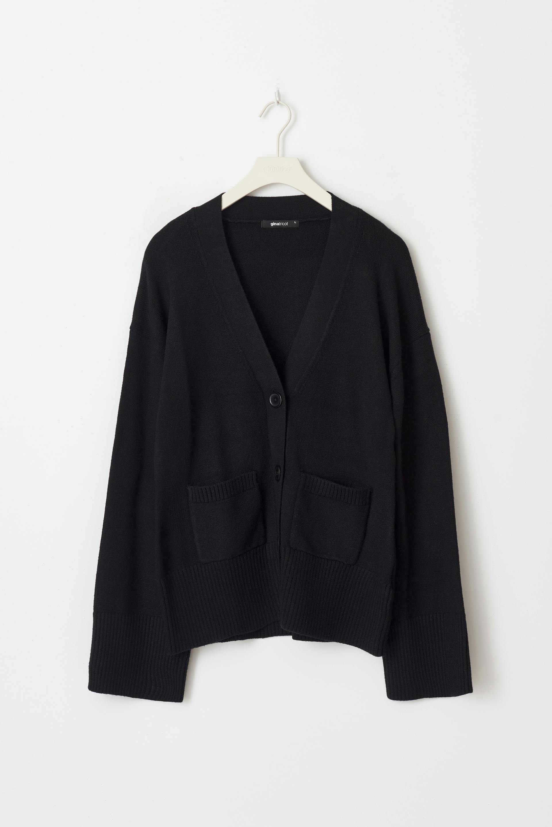 Knit cardigan with pockets in the sides. The cardigan is black and has V-neck. It has regular fit, buttoning at the front and long sleeve.