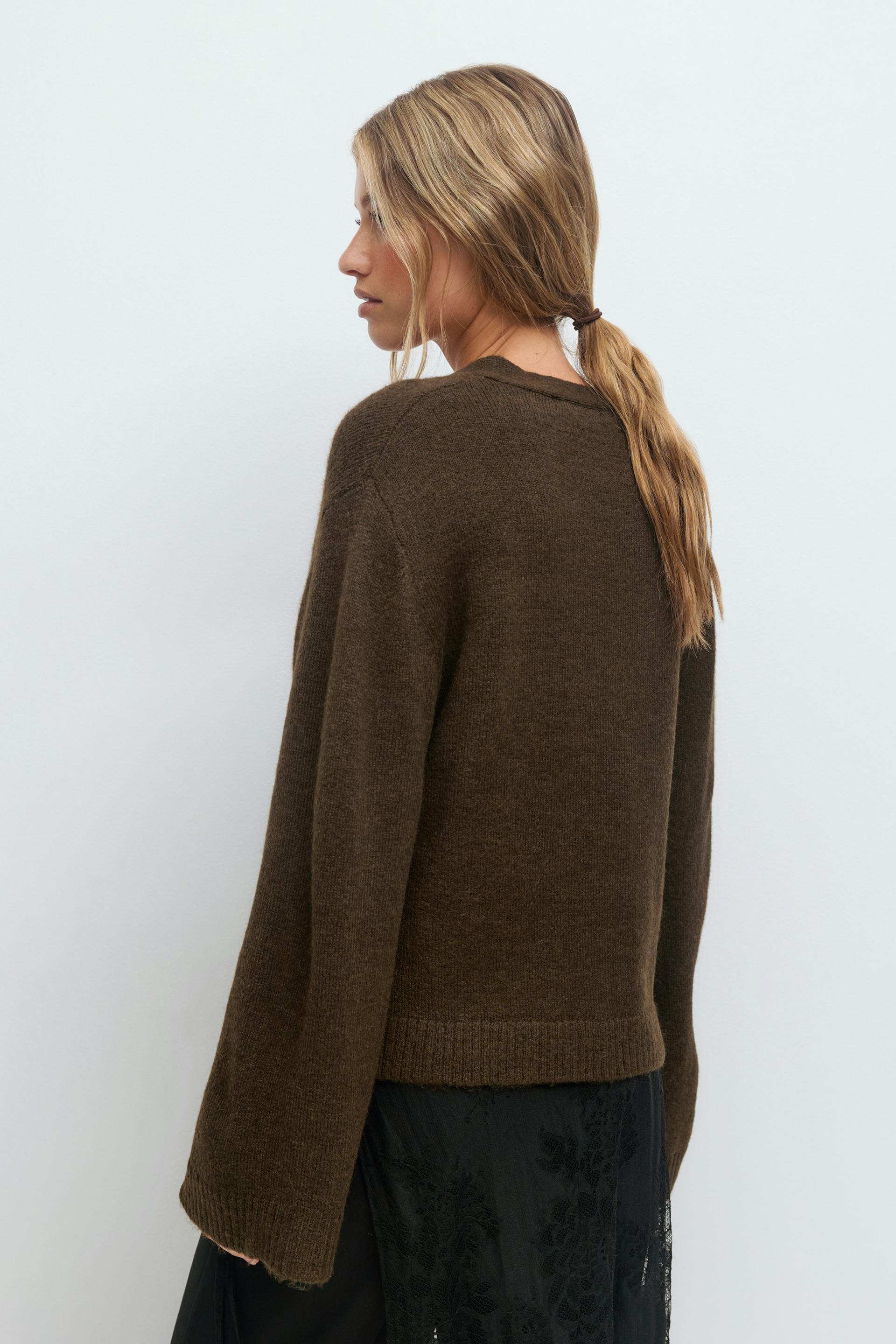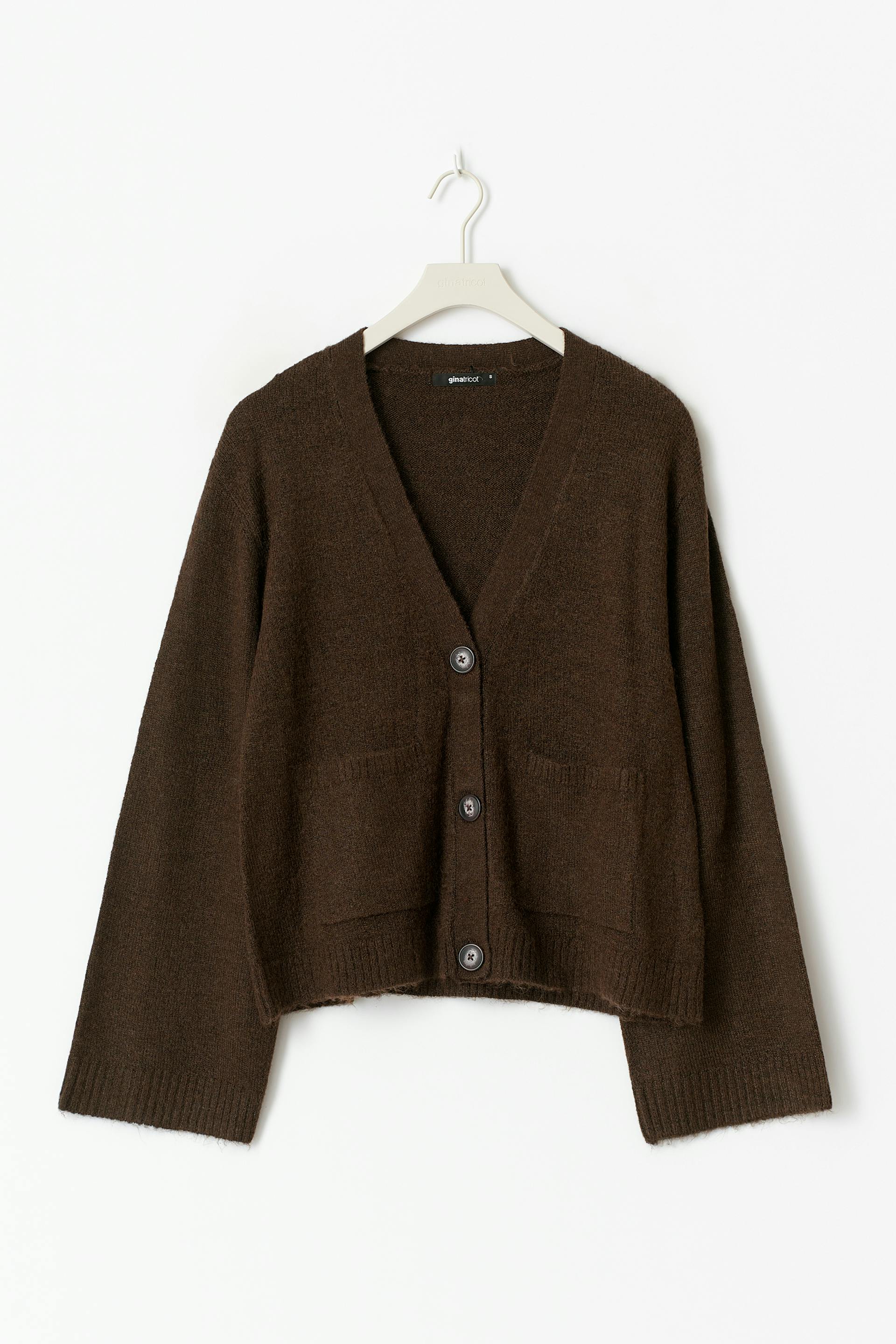 Knit cardigan with a deep v neckline. The cardigan is brown and has long sleeves. It has pockets at the front and buttons at the front.