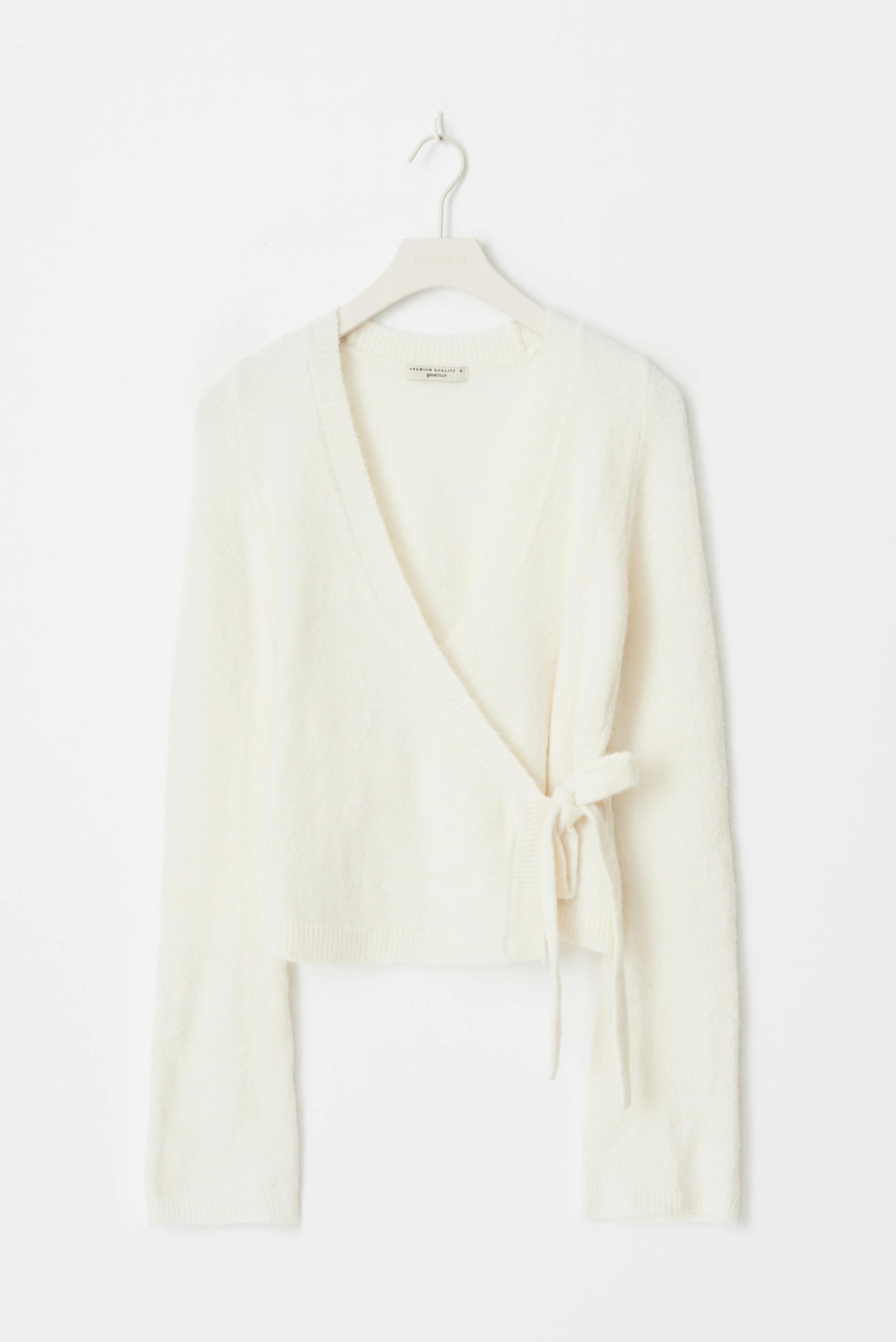 Knitted wrap cardigan with self-tie at the waist. The cardigan is white and has v-neck. It has regular fit and long sleeve.