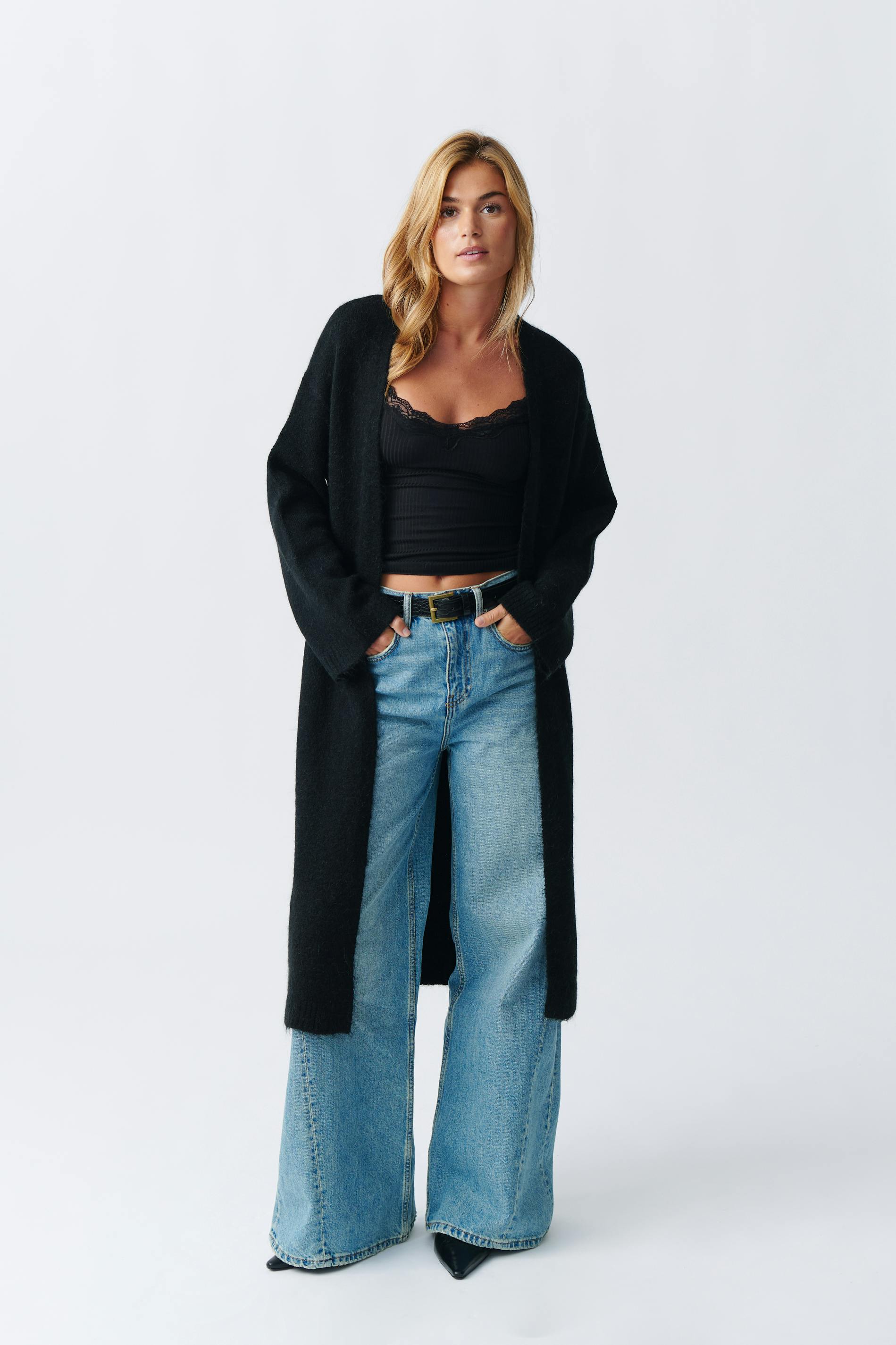 Long cardigan with soft, knitted quality. The cardigan is black and has regular fit. It has long sleeve and rib knit at the bottom.
