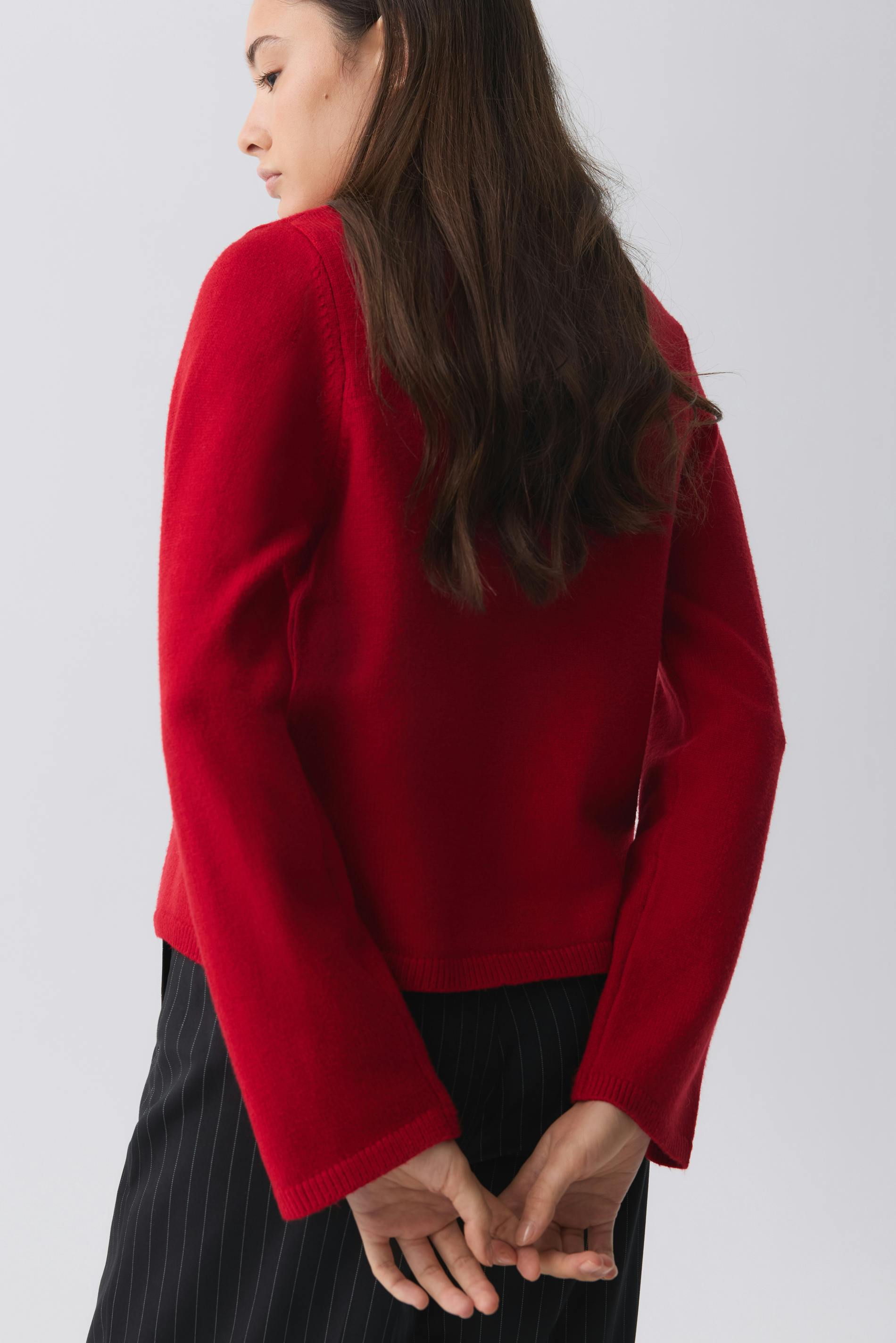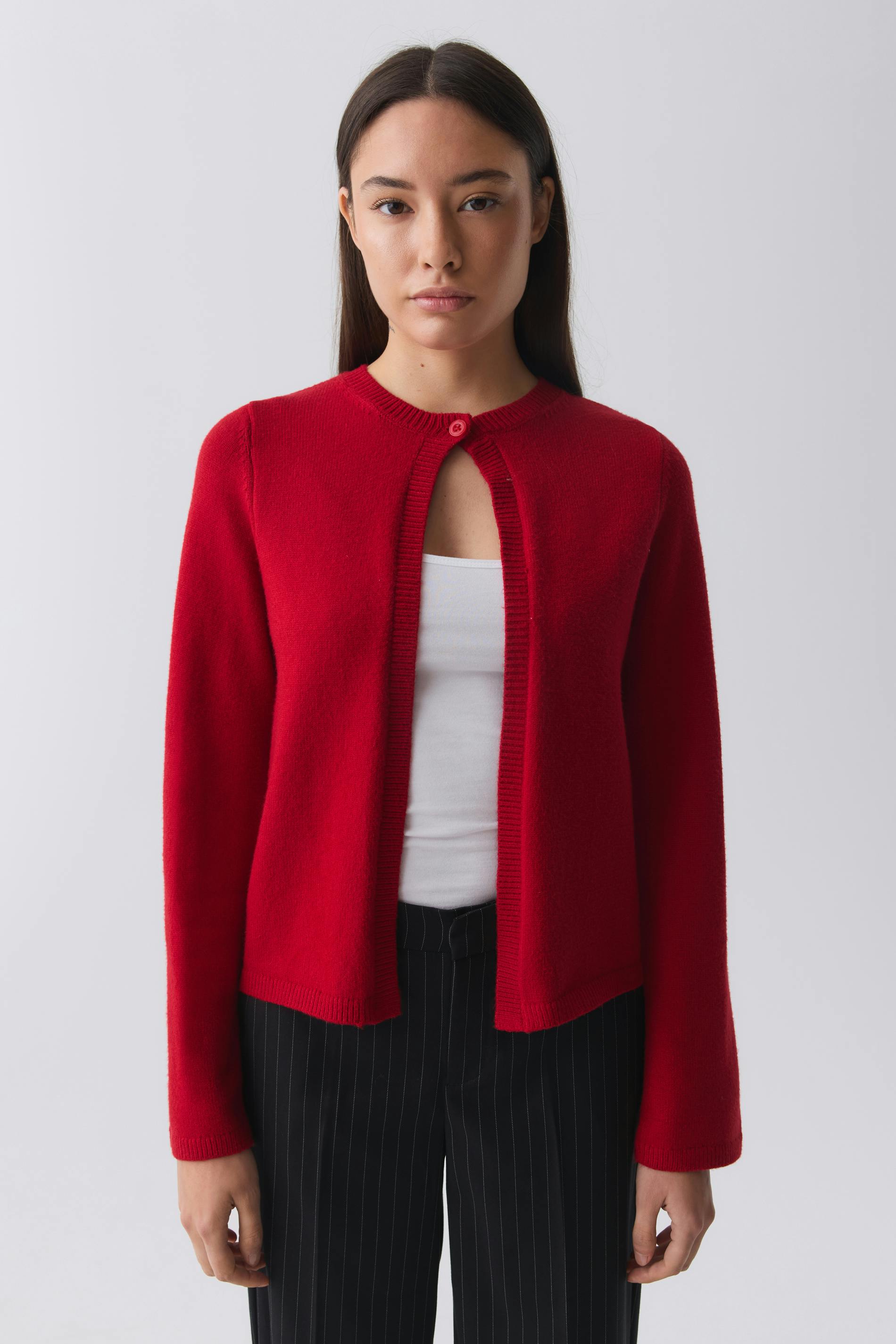 Knitted cardigan with one button at the top. The cardigan is red and has round neckline. It has long sleeve and rib knit at sleeve ends, at the front and at the bottom.
