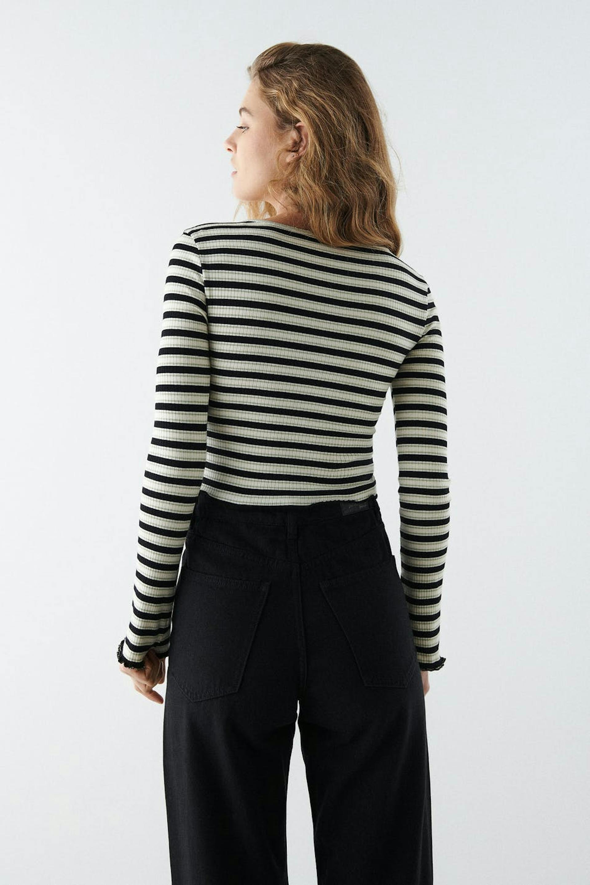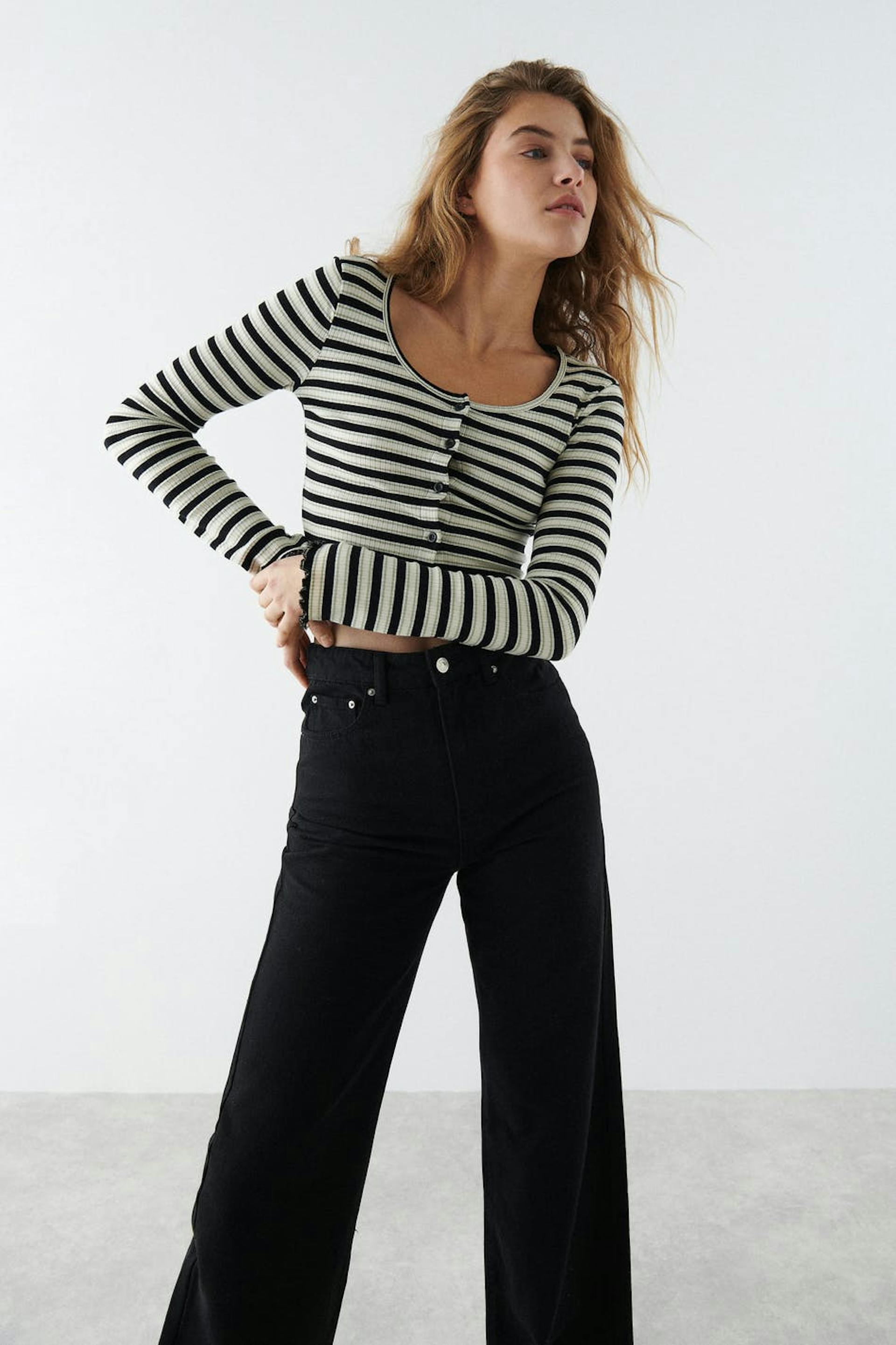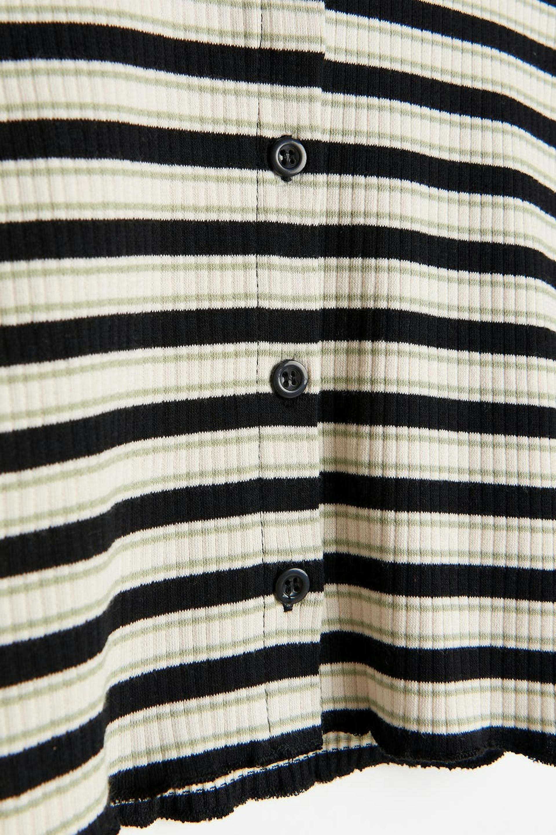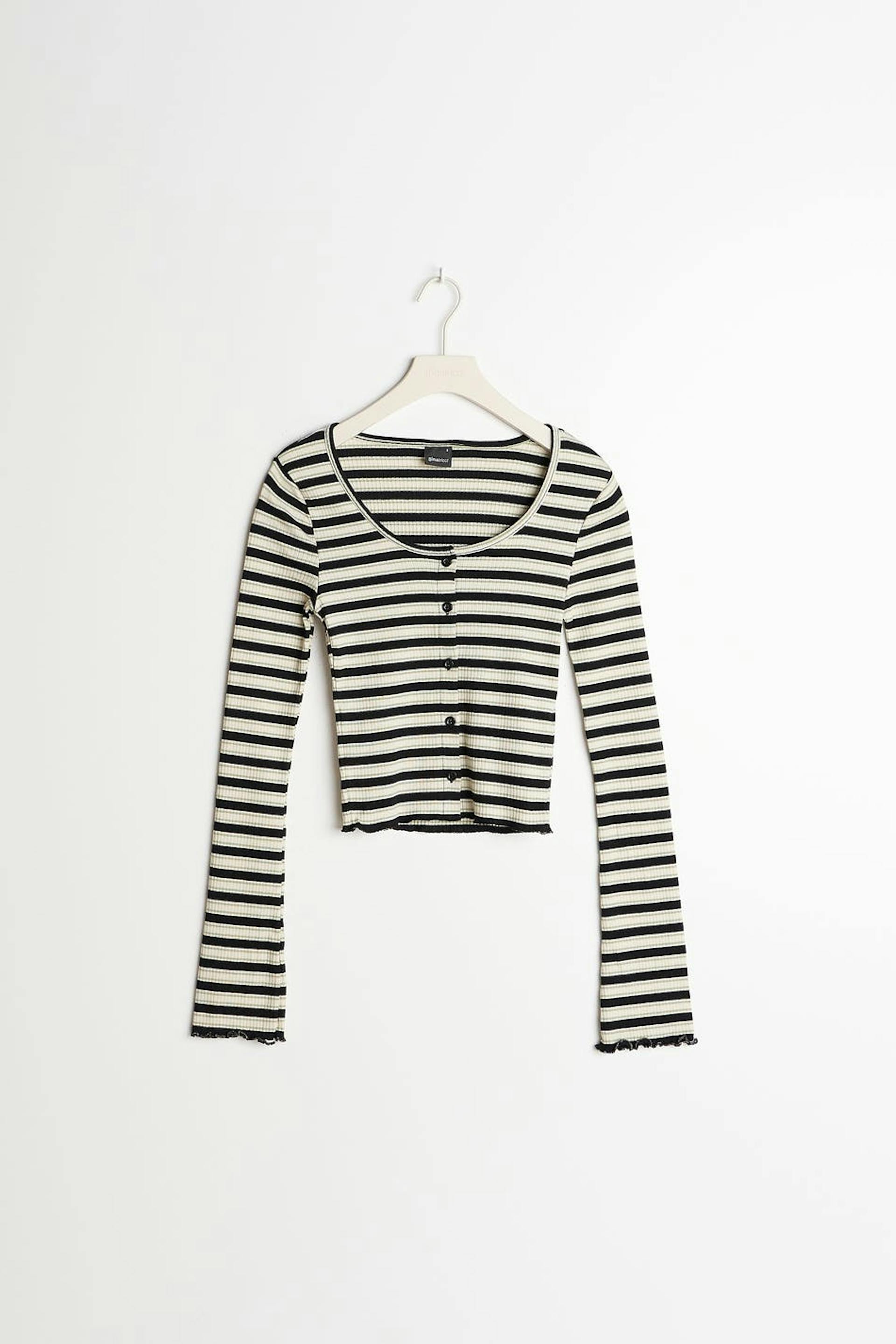 Striped cardigan with a ribbed quality. The cardigan is white, black and short. It has a fitted fit, a crew neckline and small frills at the bottom hem.