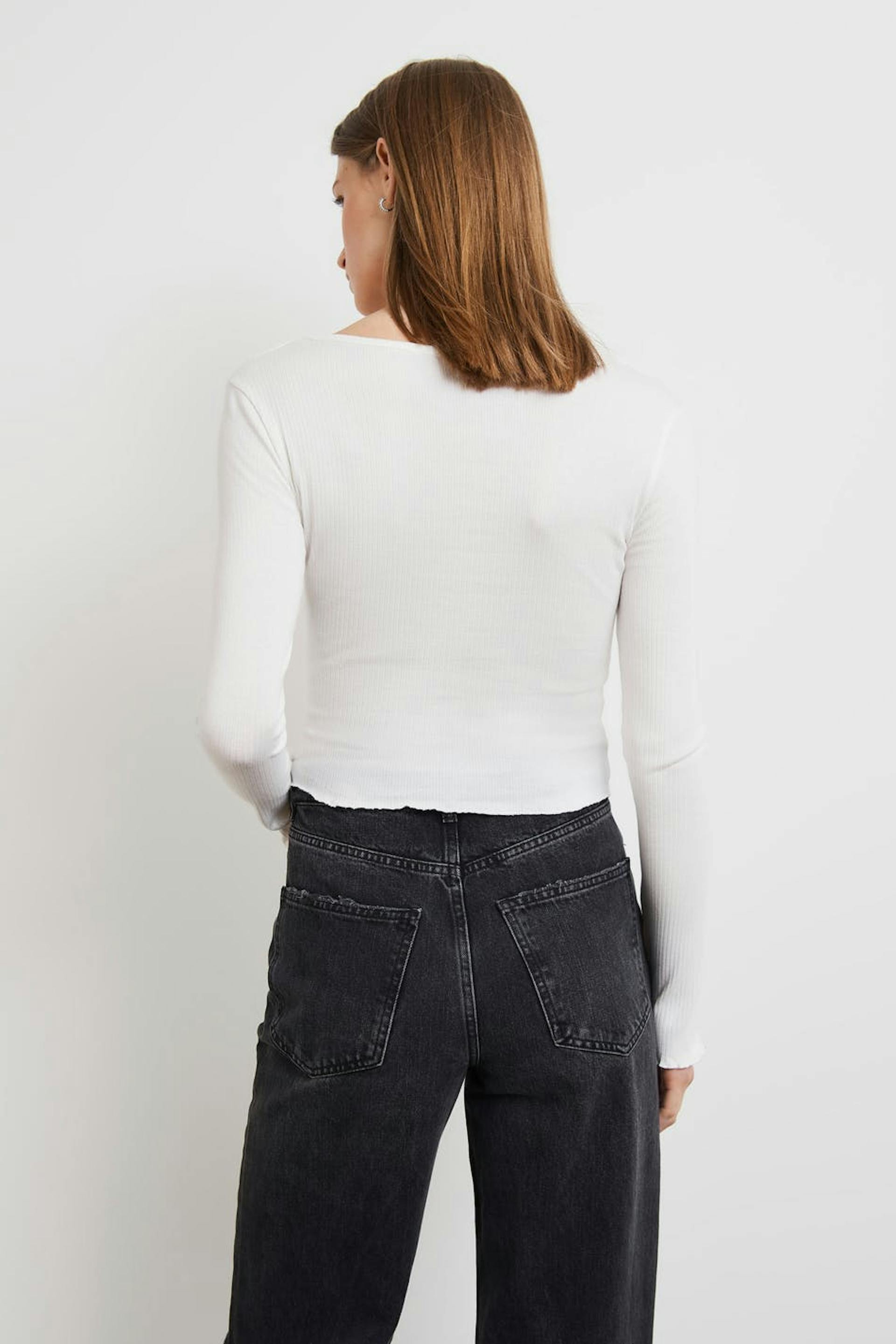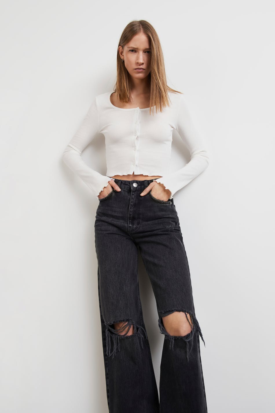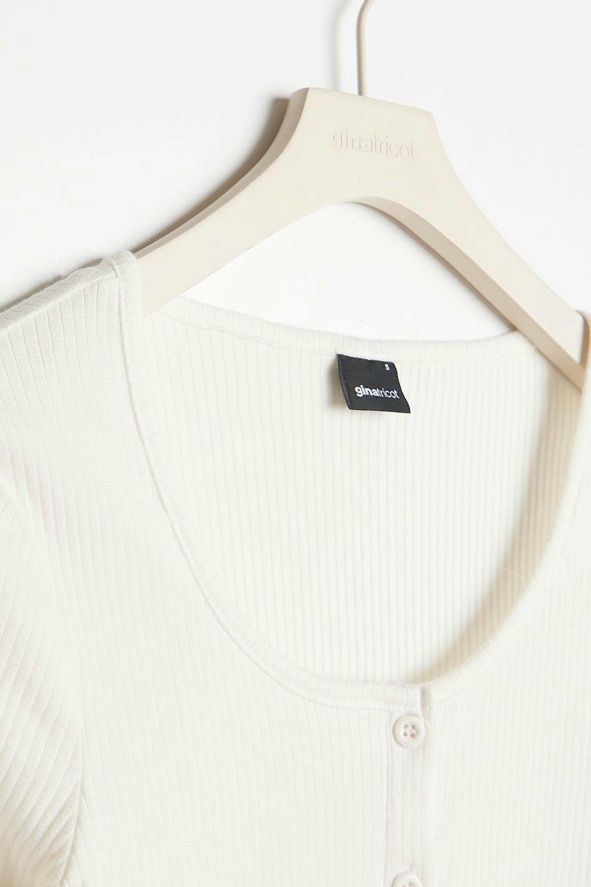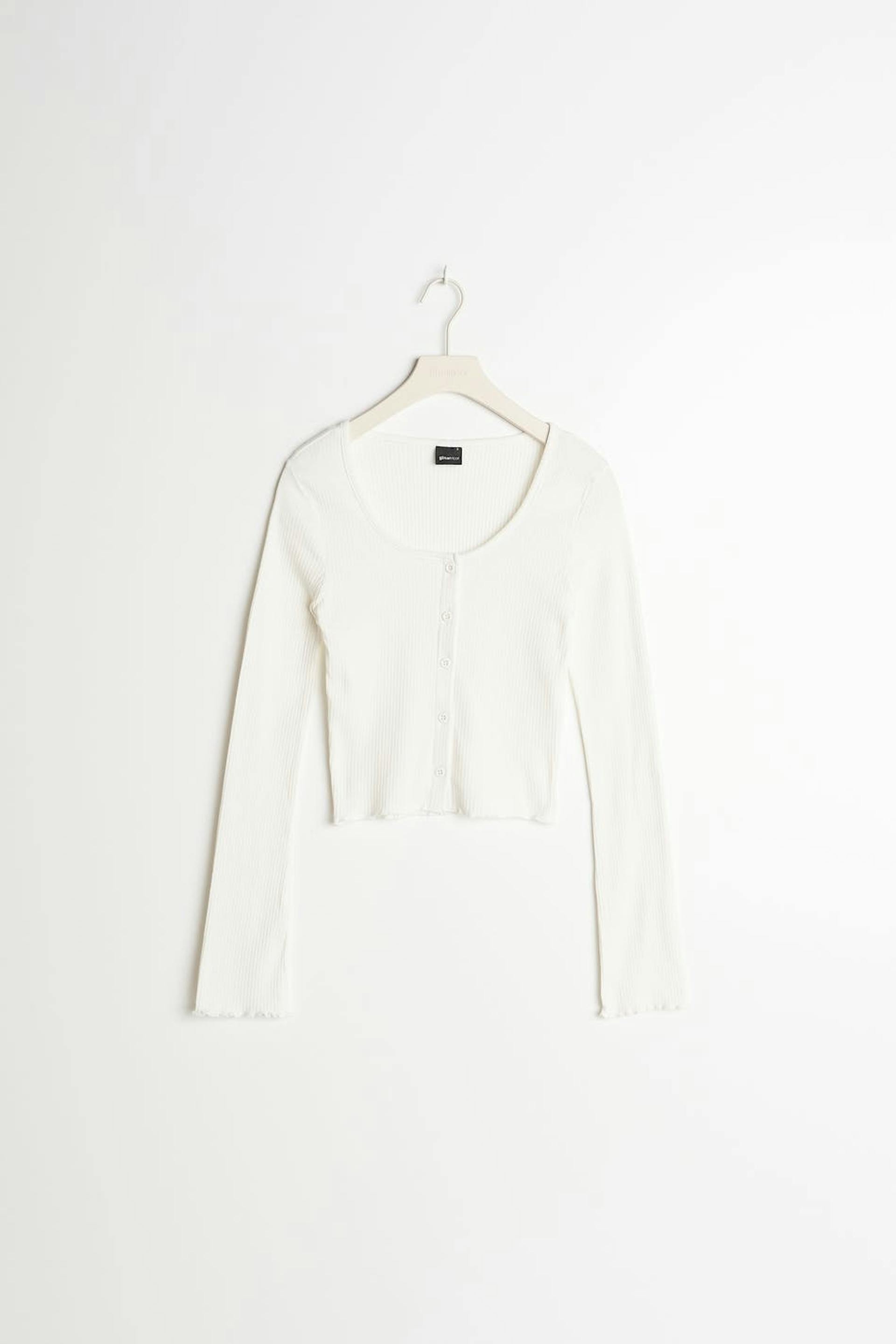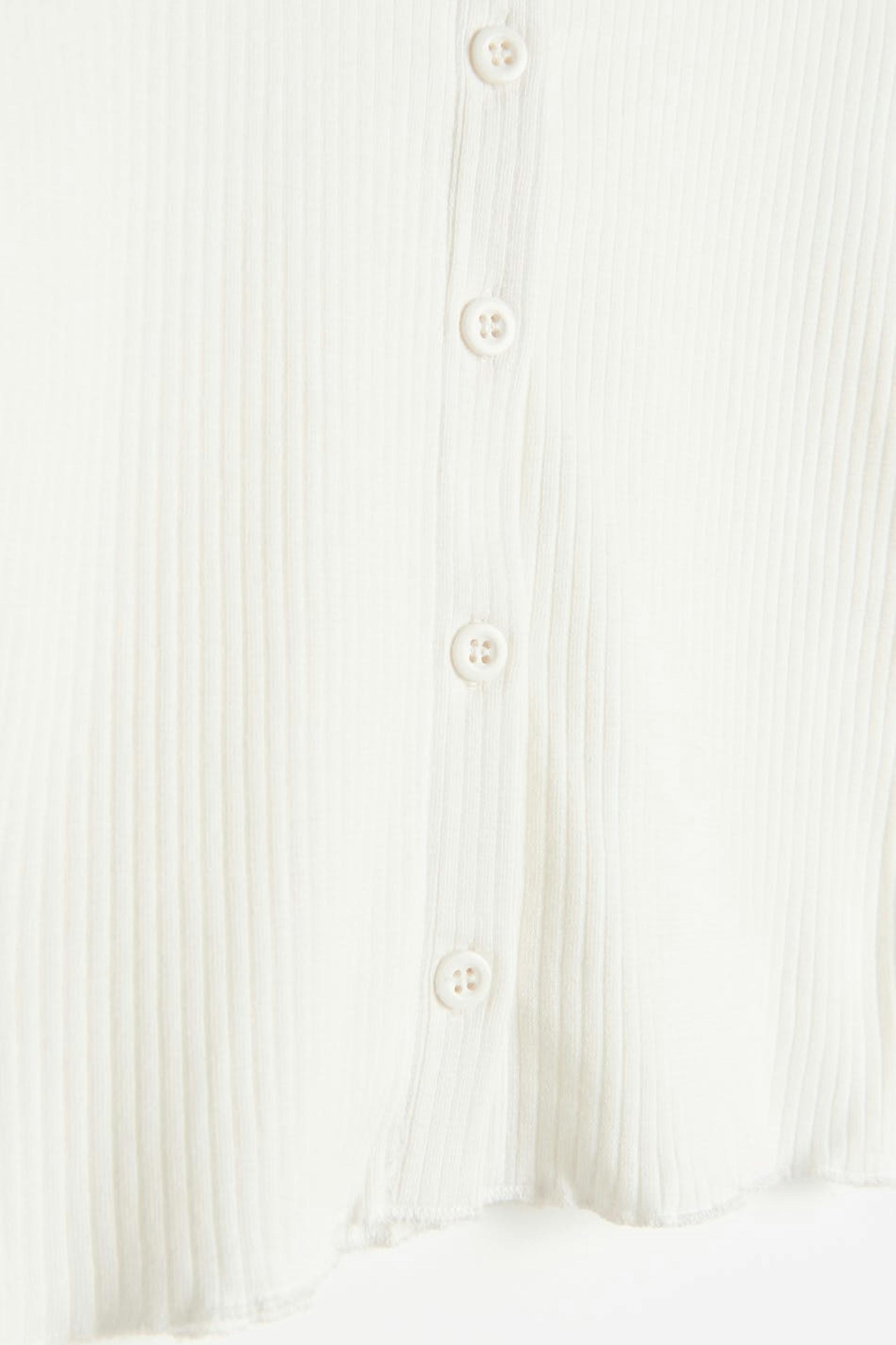 Short cardigan with a ribbed quality. The cardigan is white and has a fitted fit. It has a crew neckline and small frills at the bottom hem.