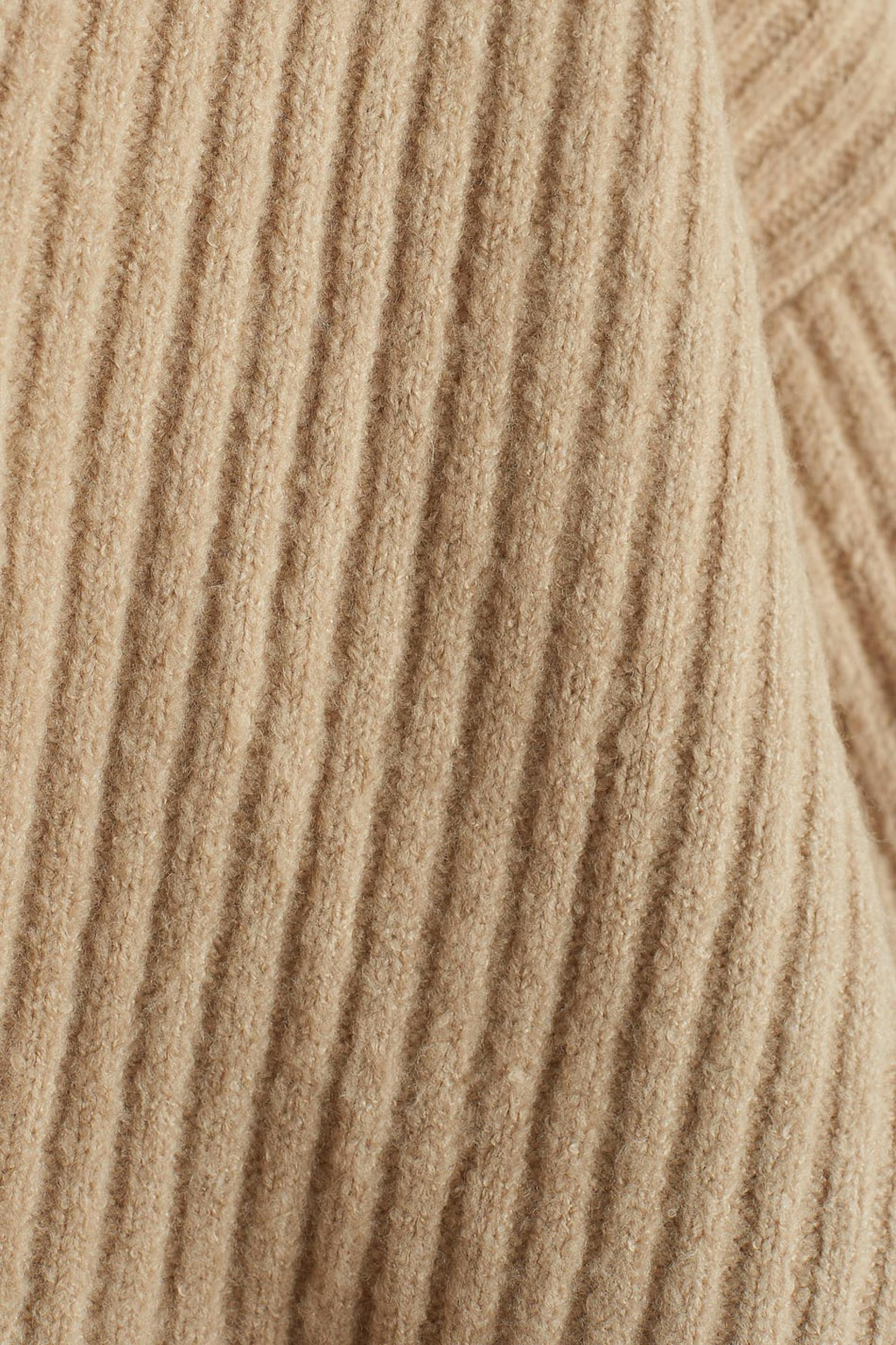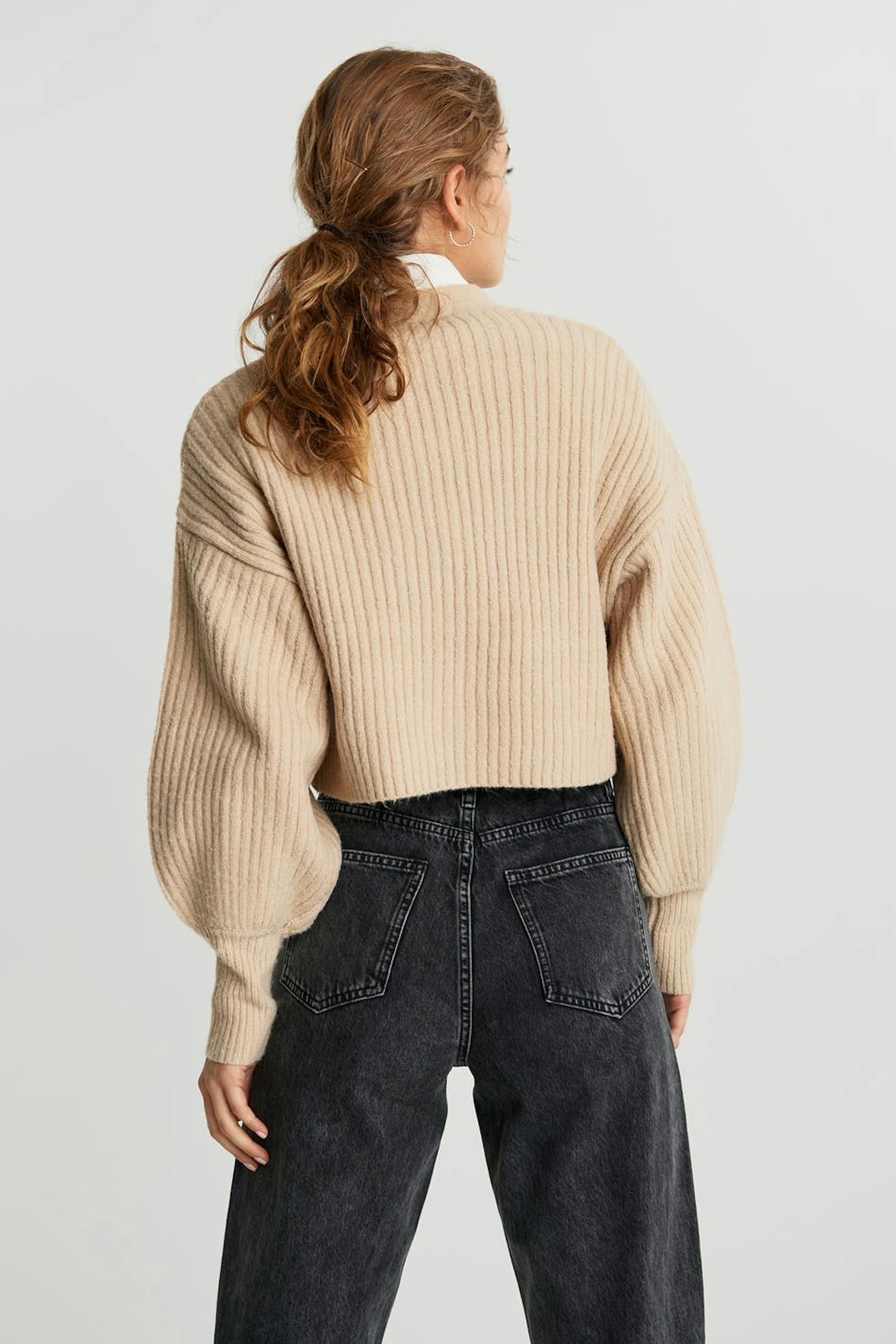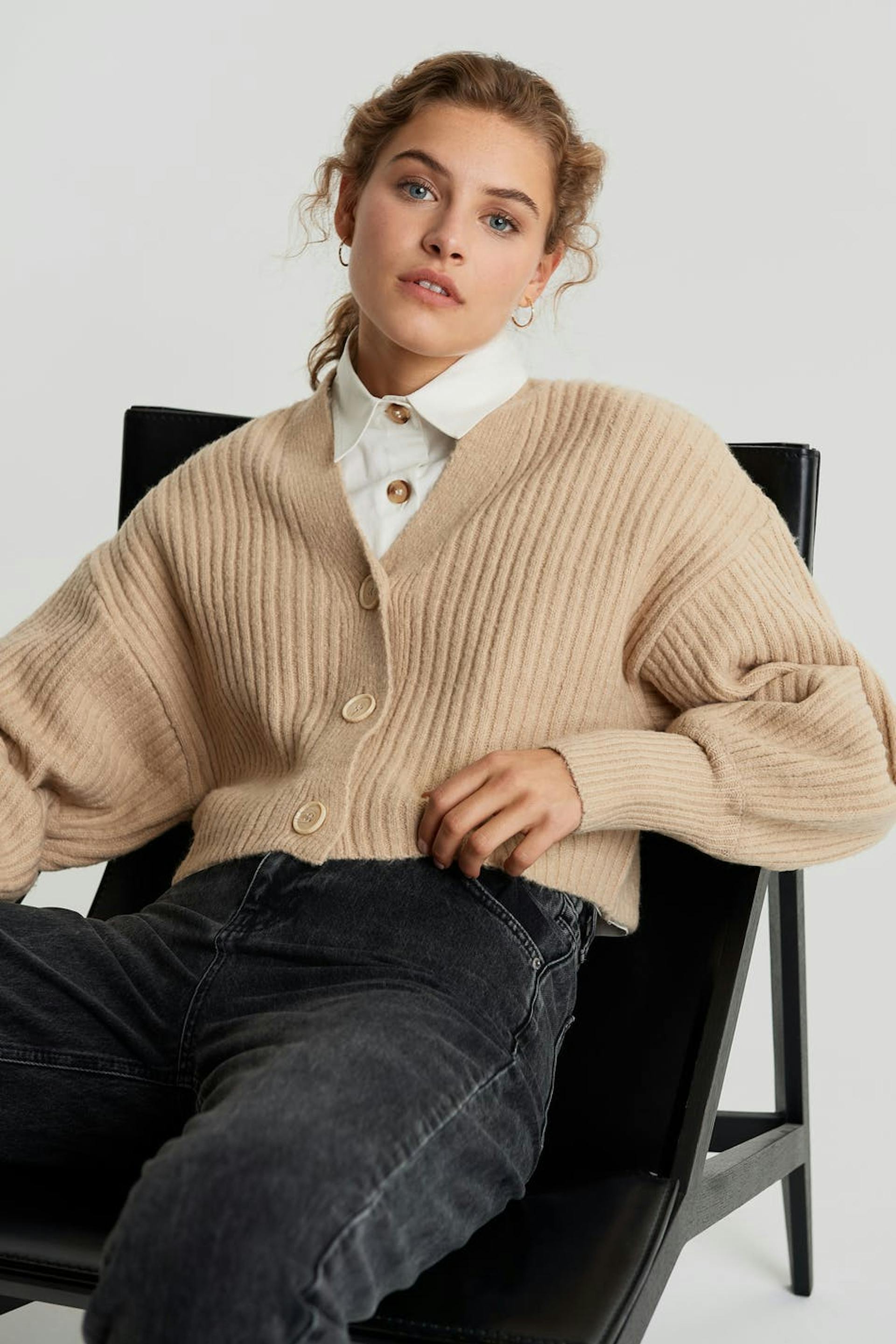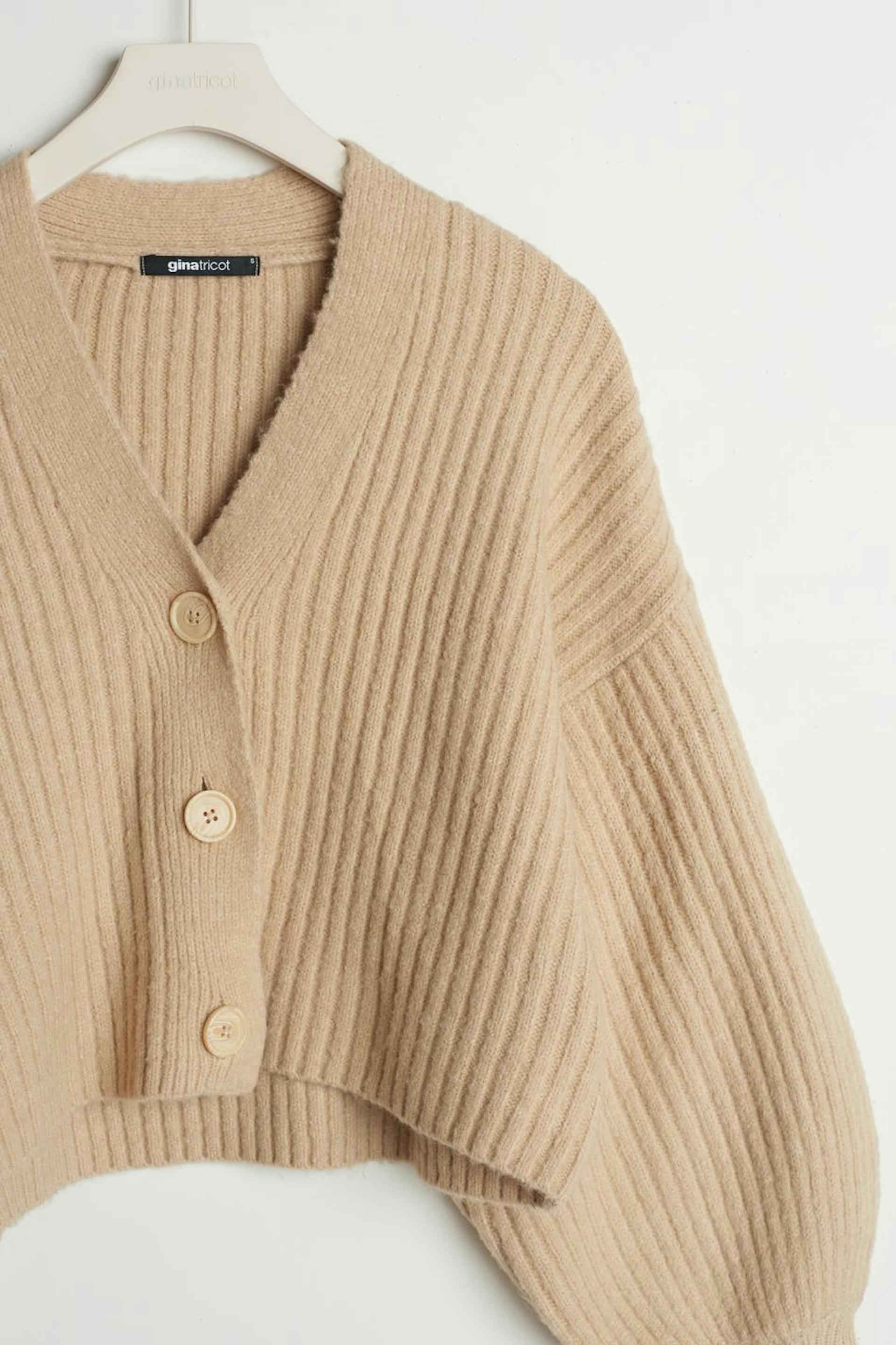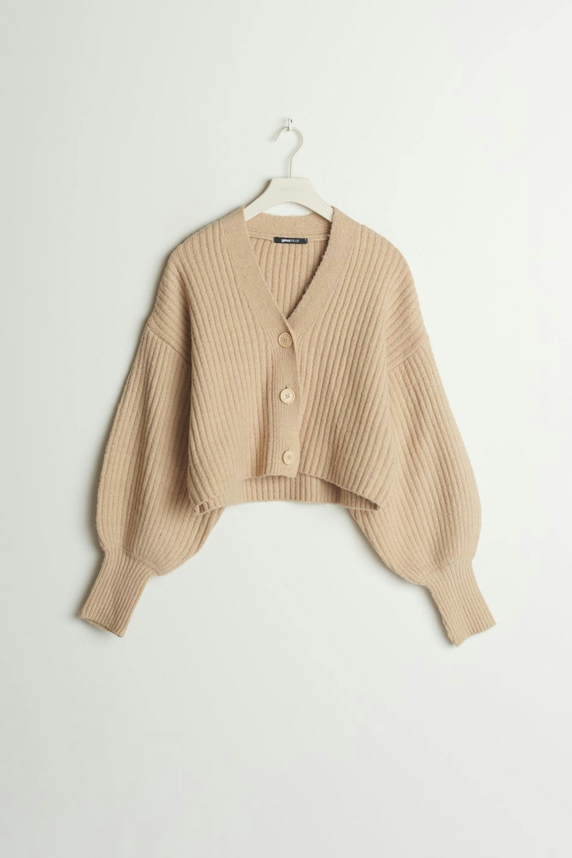 Knitted cardigan with long rib knit on the sleeves. The cardigan is beige, knitted and shorter.