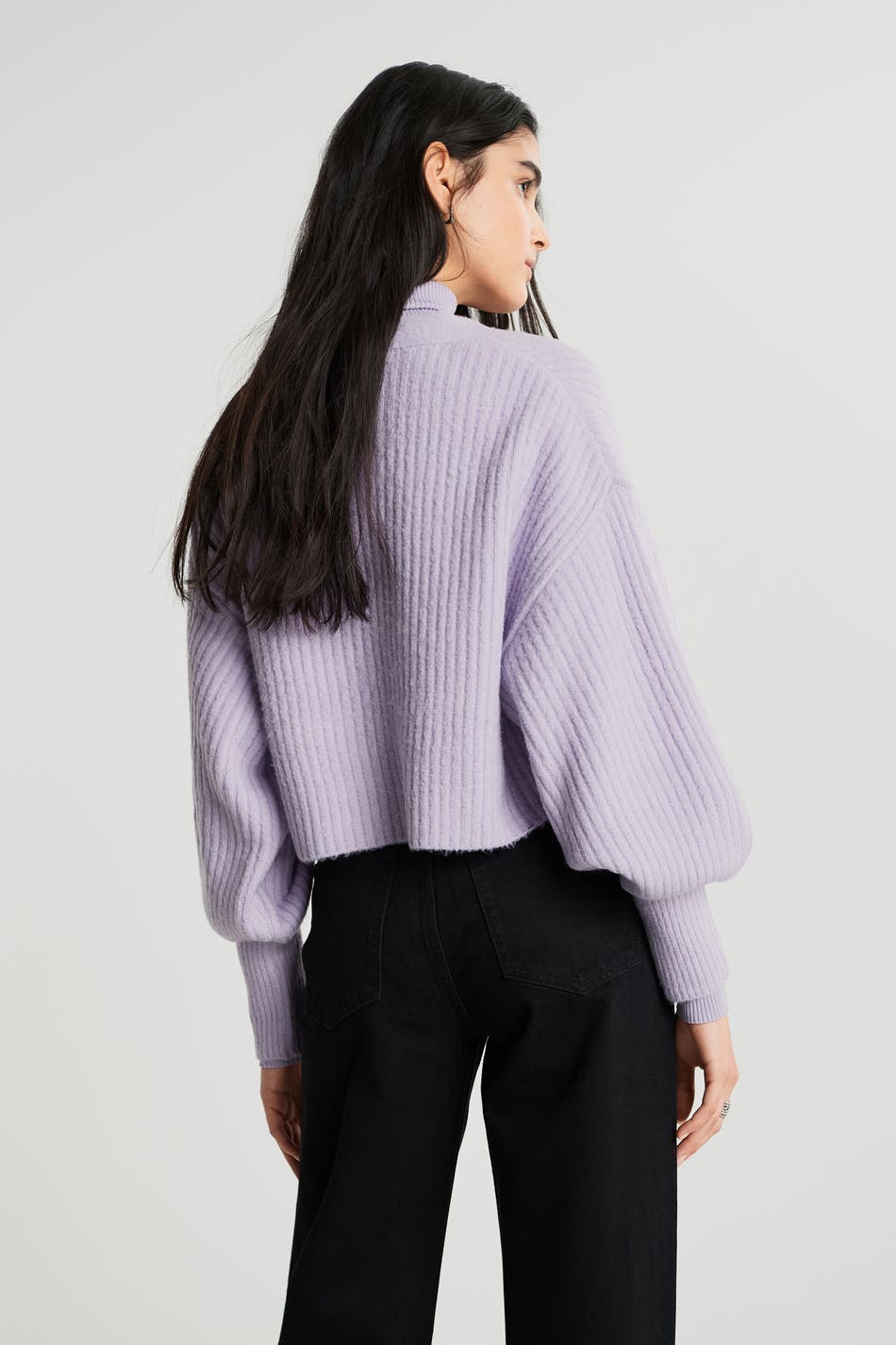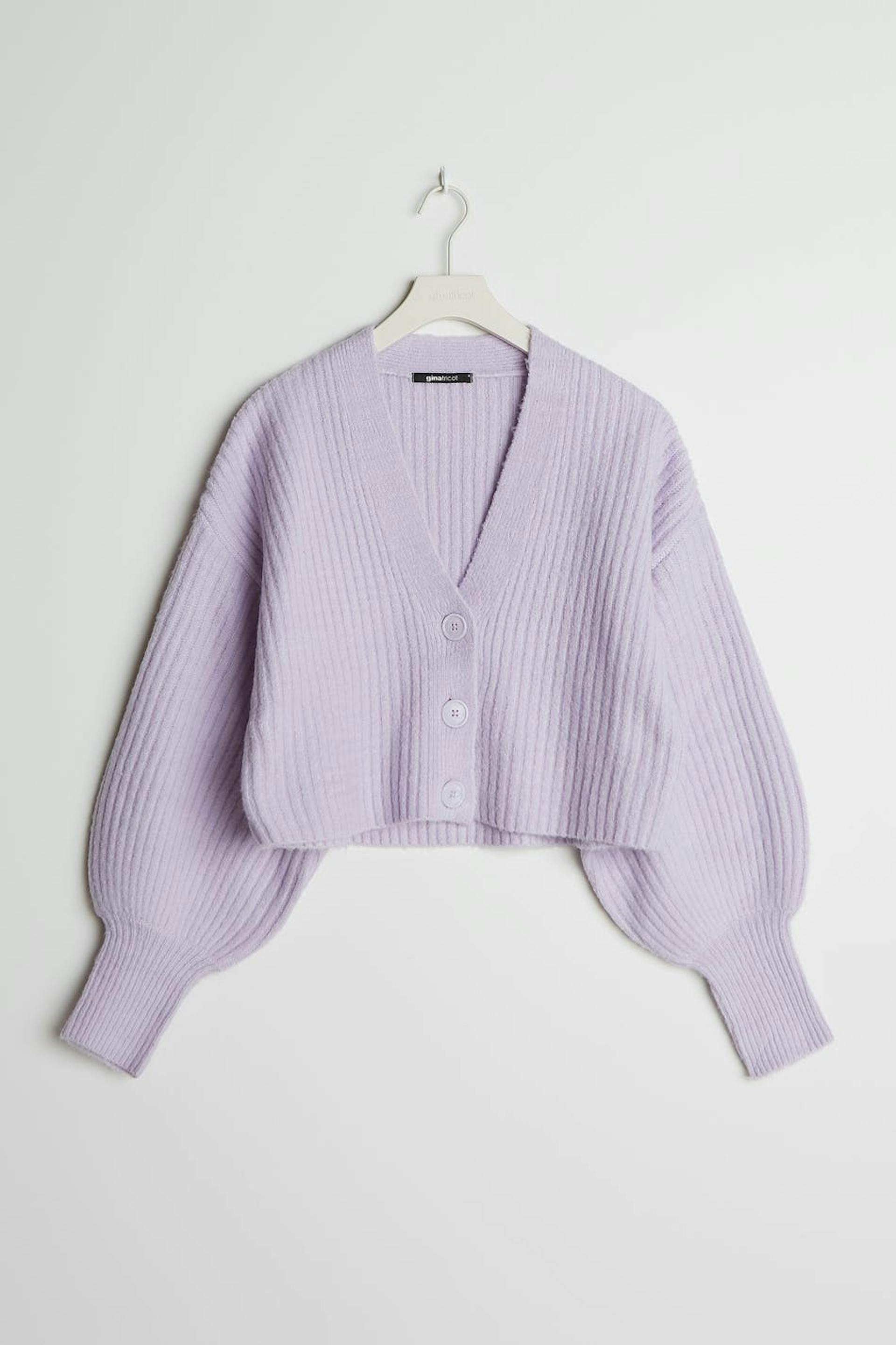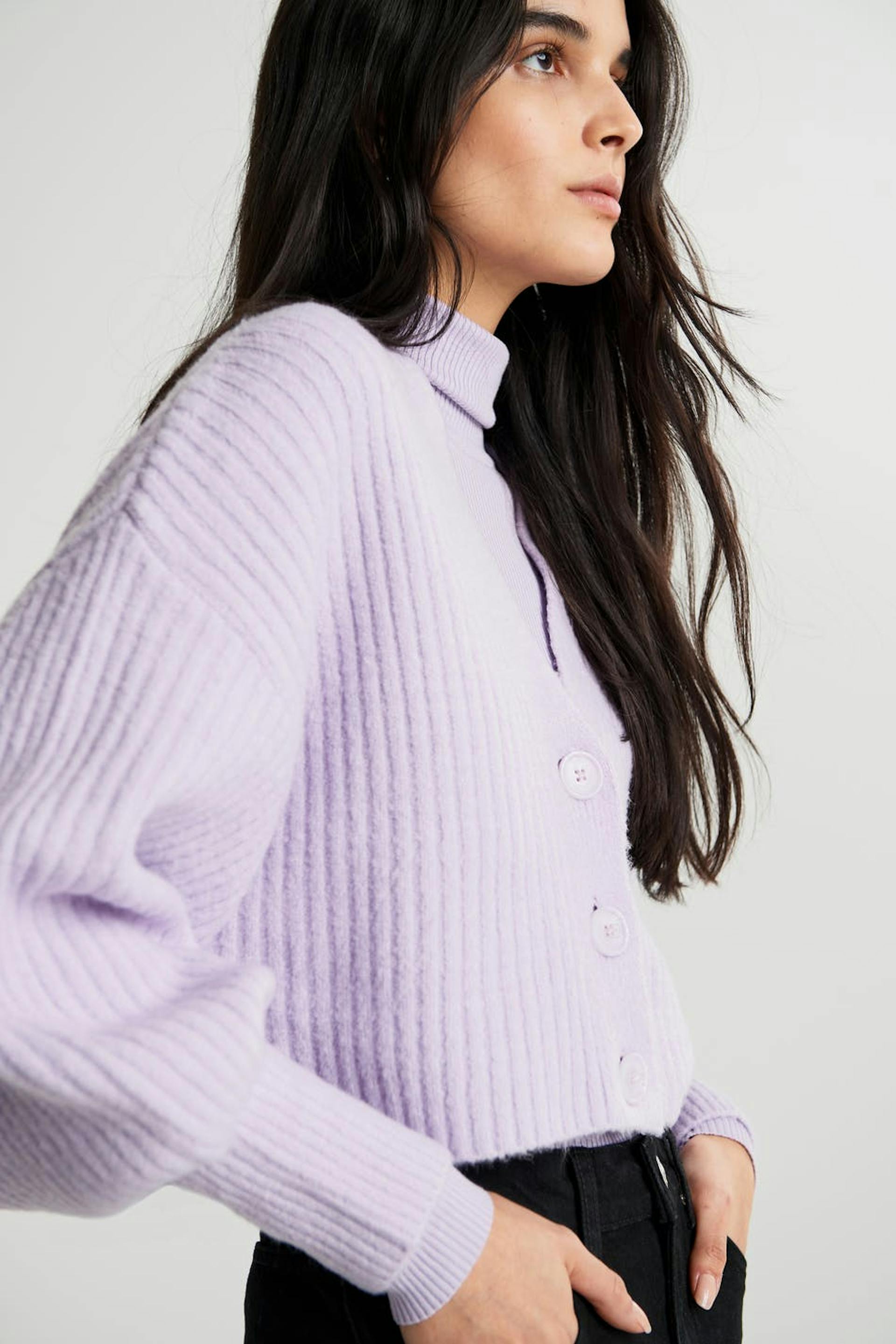 Knitted cardigan with long rib knit on the sleeves. The cardigan is purple and shorter.