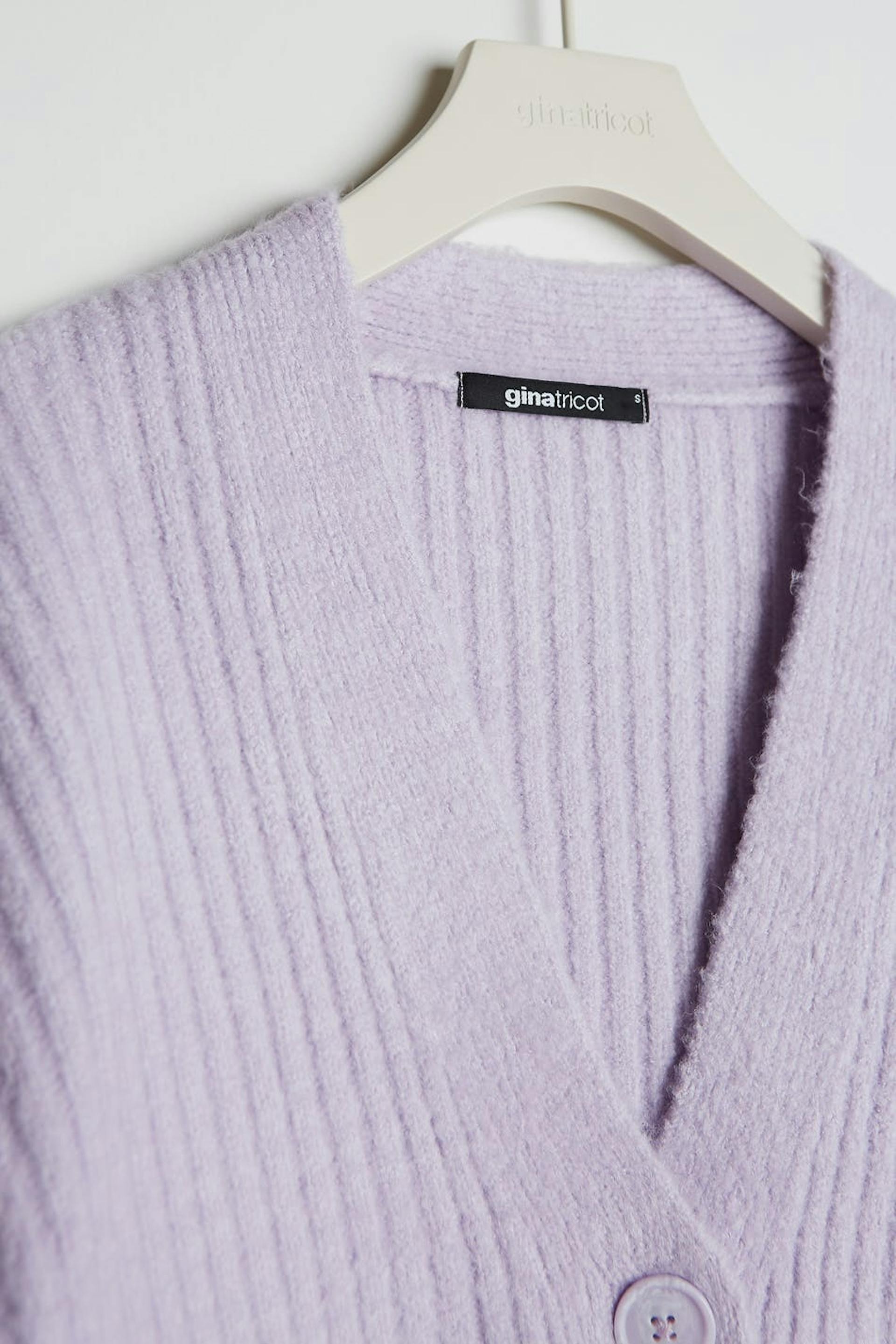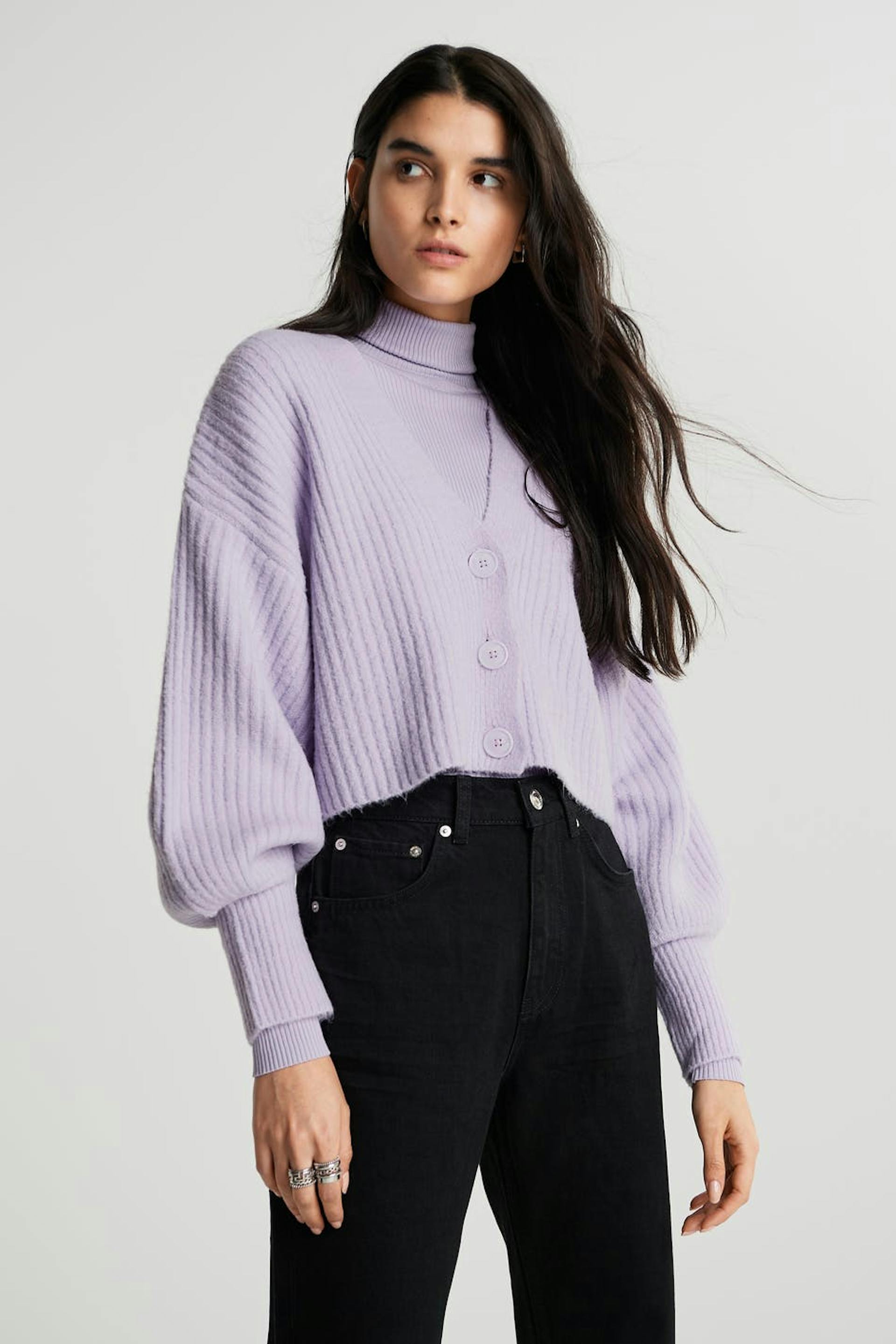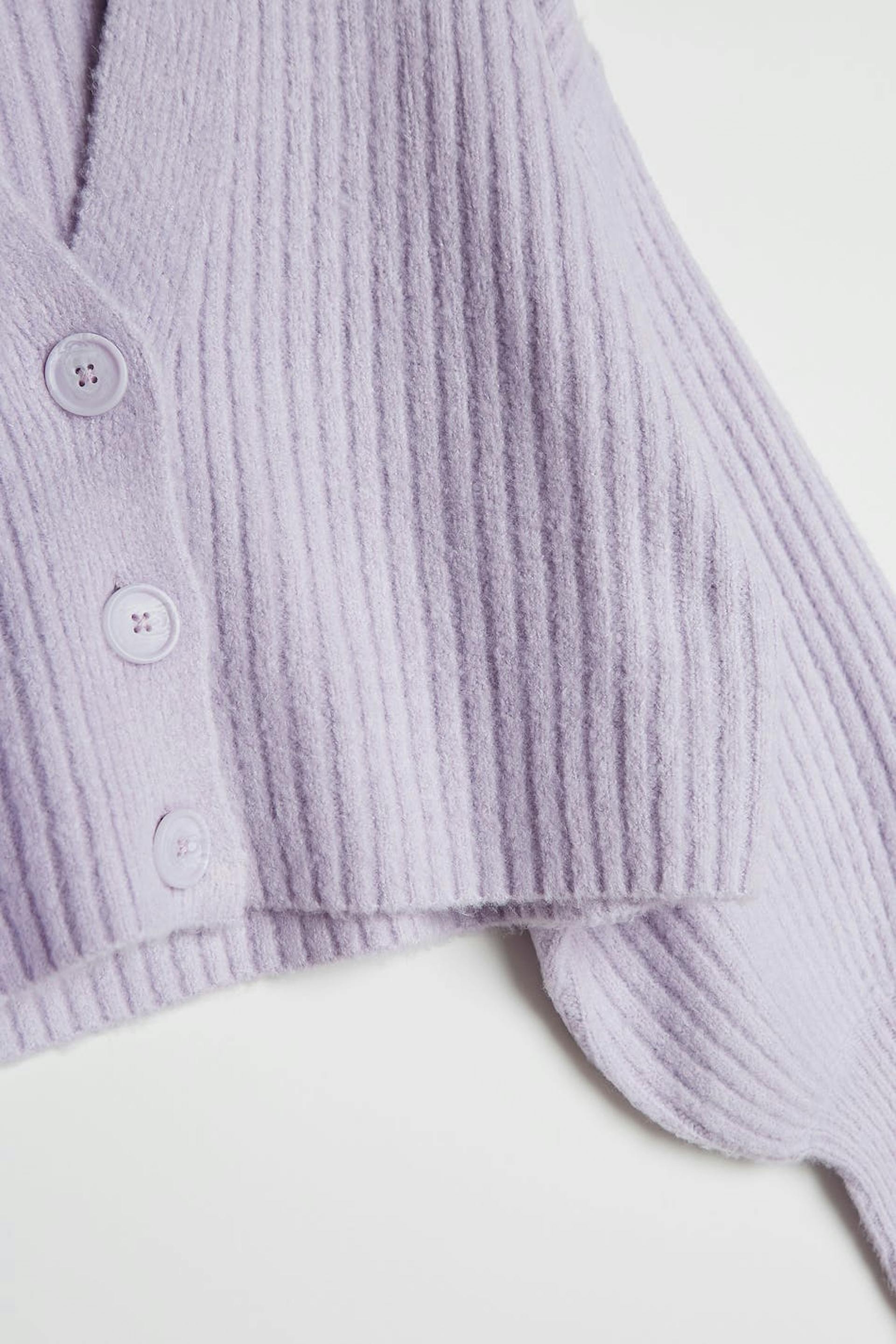 Knitted cardigan with long rib knit on the sleeves. The cardigan is purple and shorter.