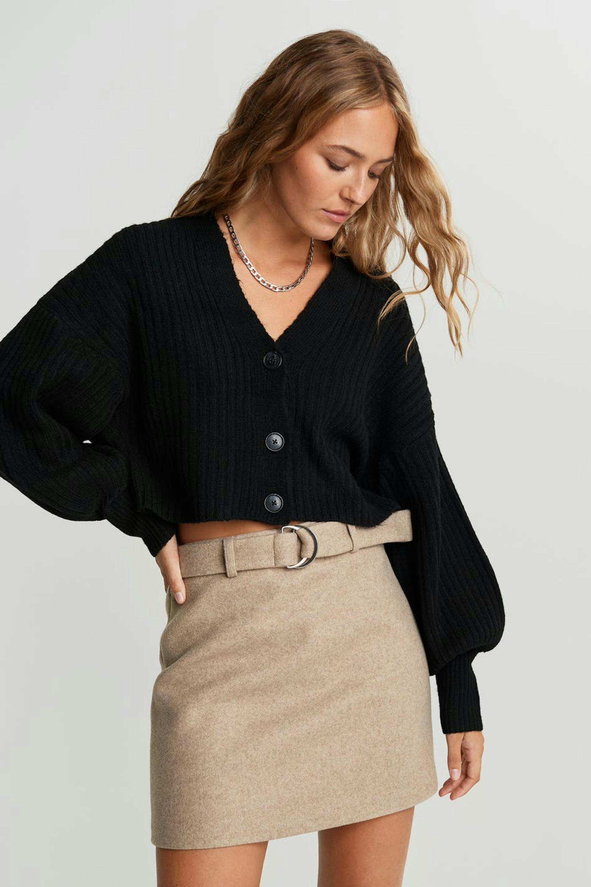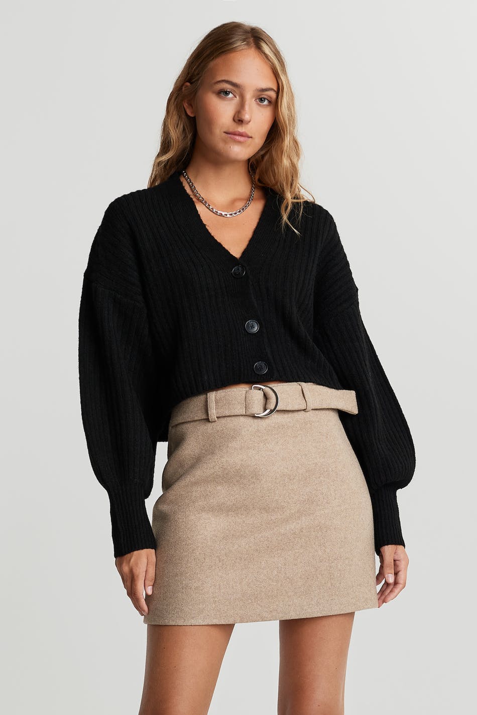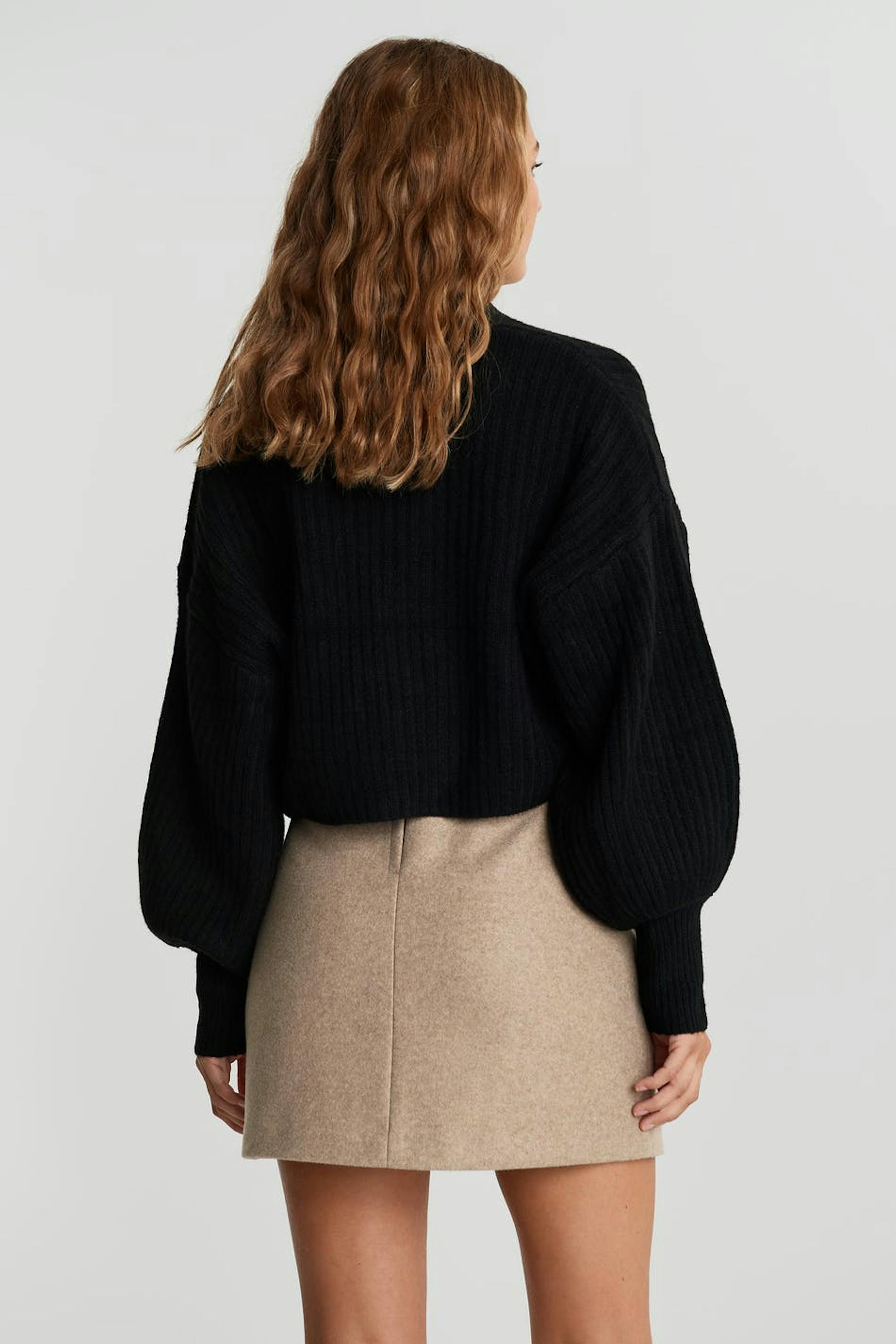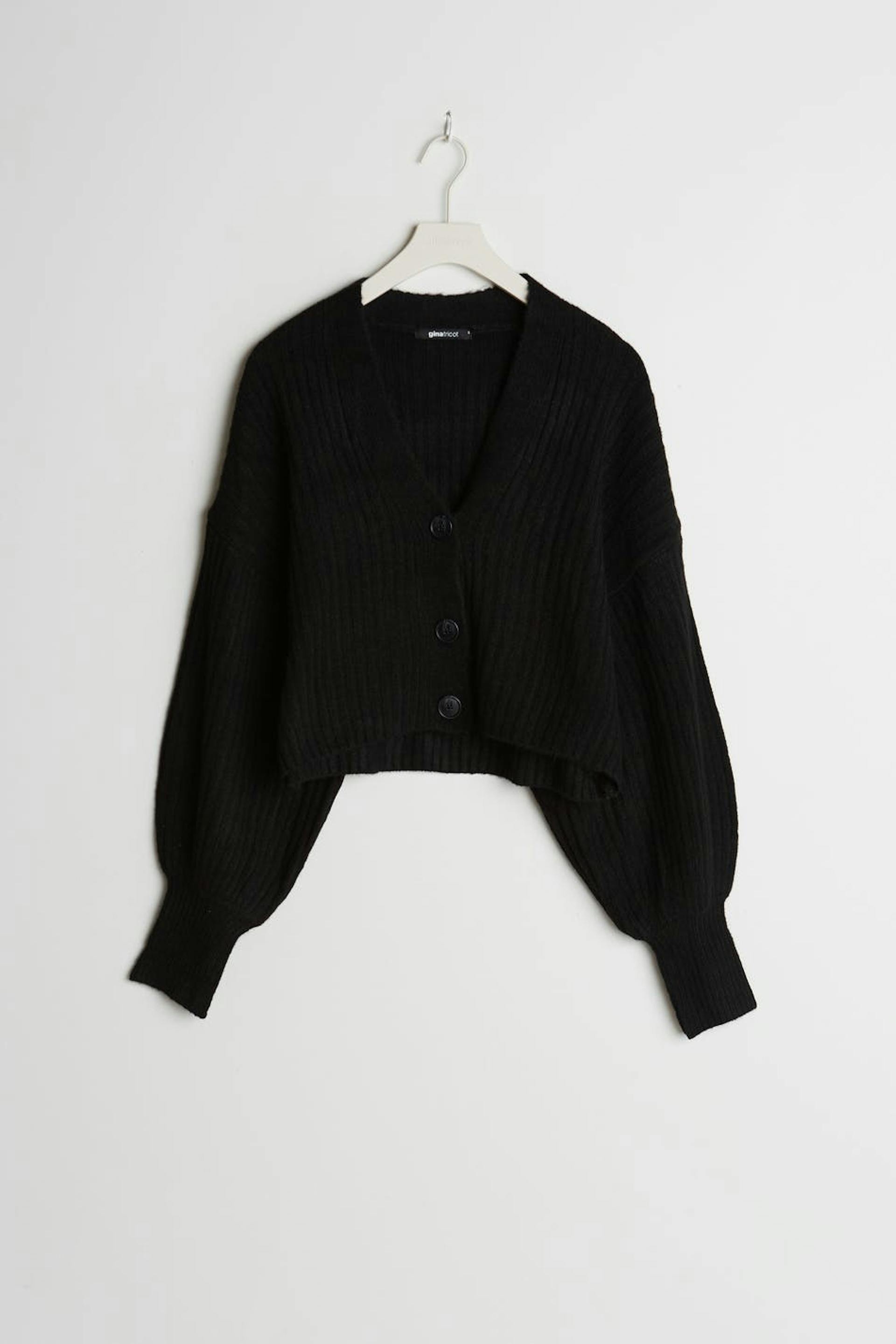 Knitted cardigan with long rib knit on the sleeves. The cardigan is black and shorter.