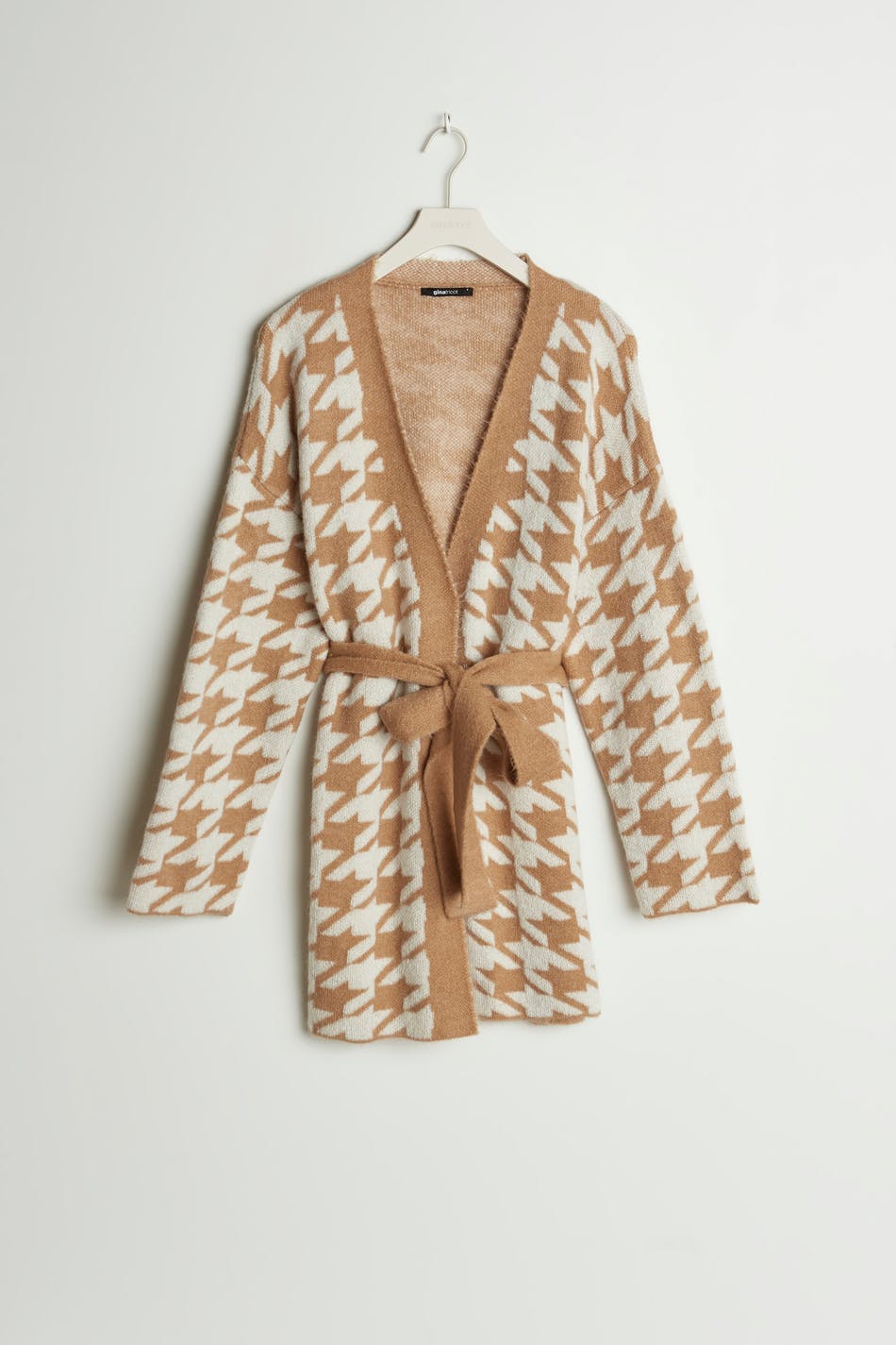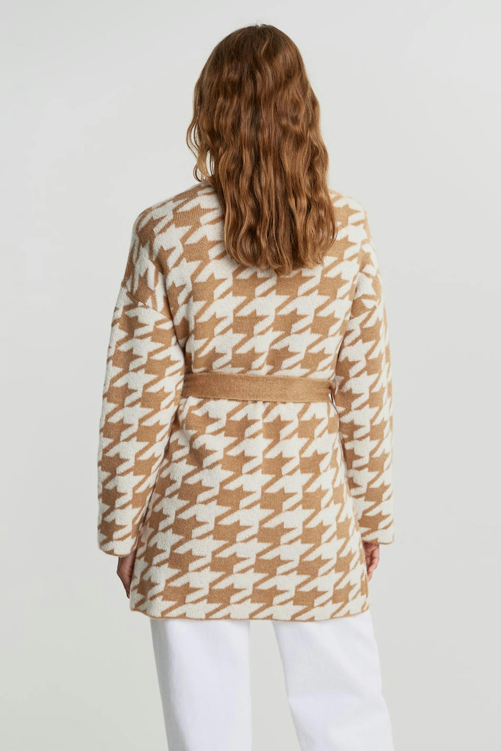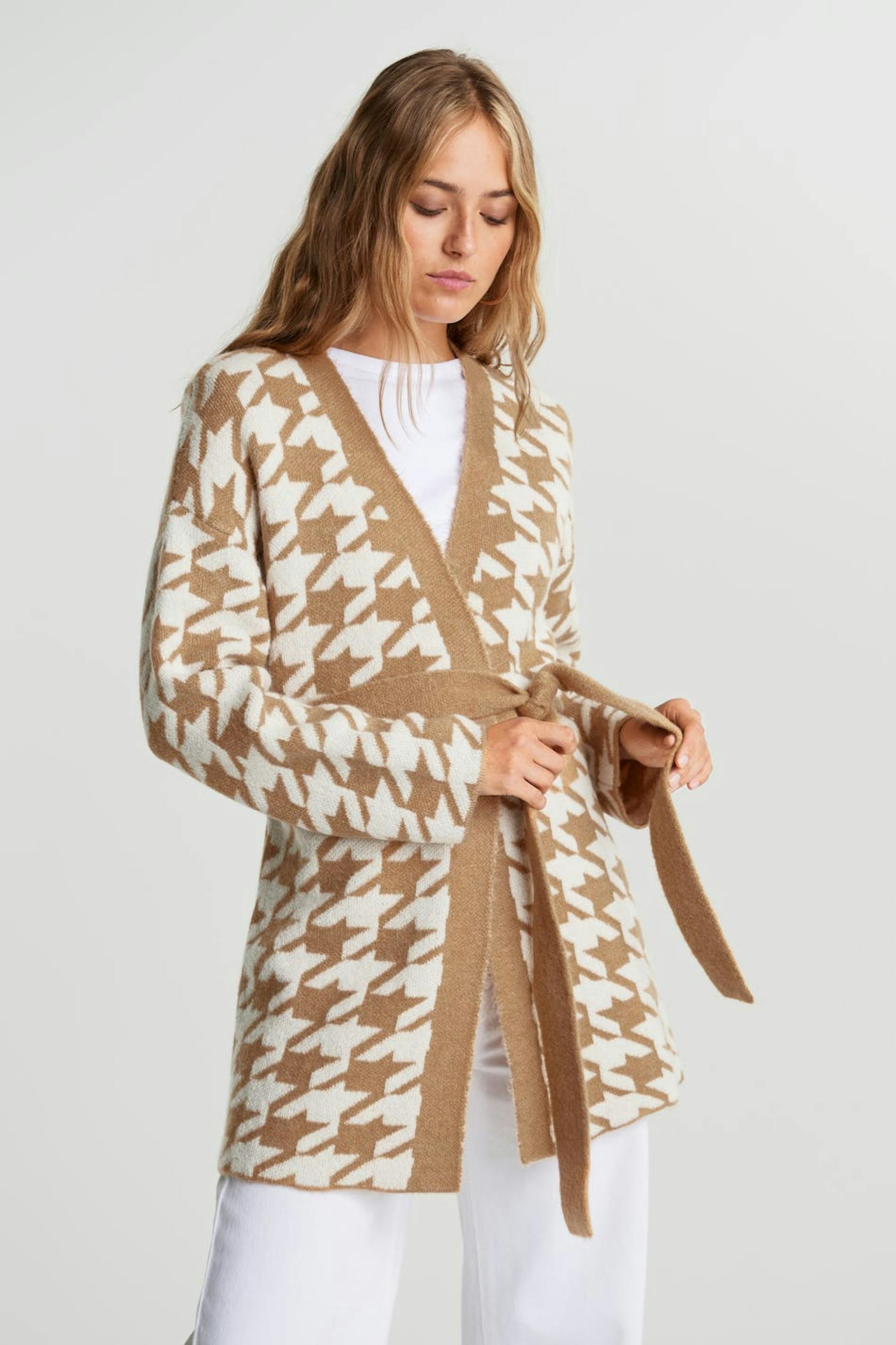 Dog tooth patterned cardigan with an opening at the front. The cardigan is beige, white and long. It has long sleeves, small slit on the sides and a tie strap at the waist.