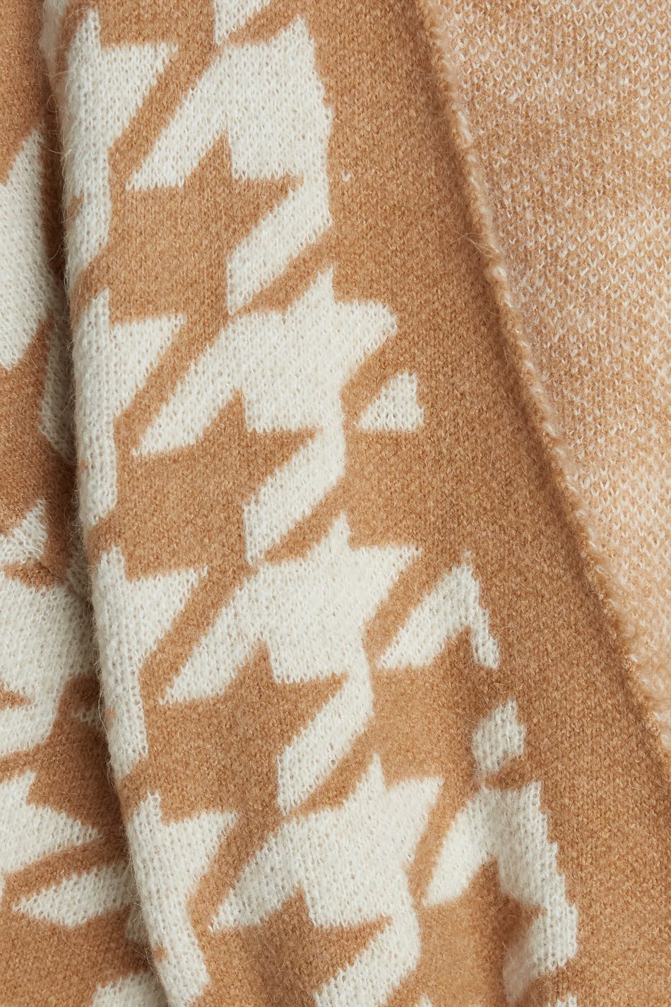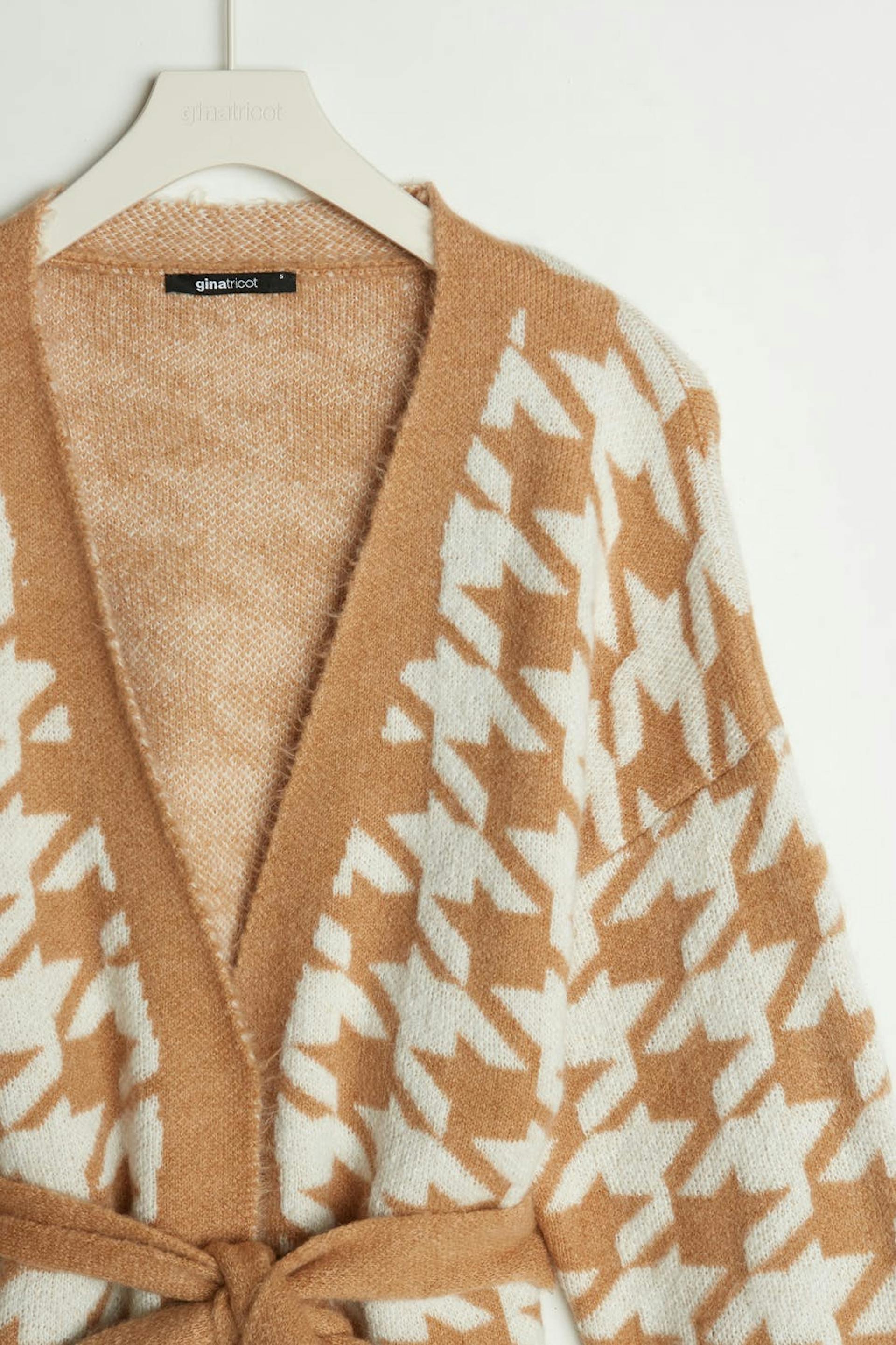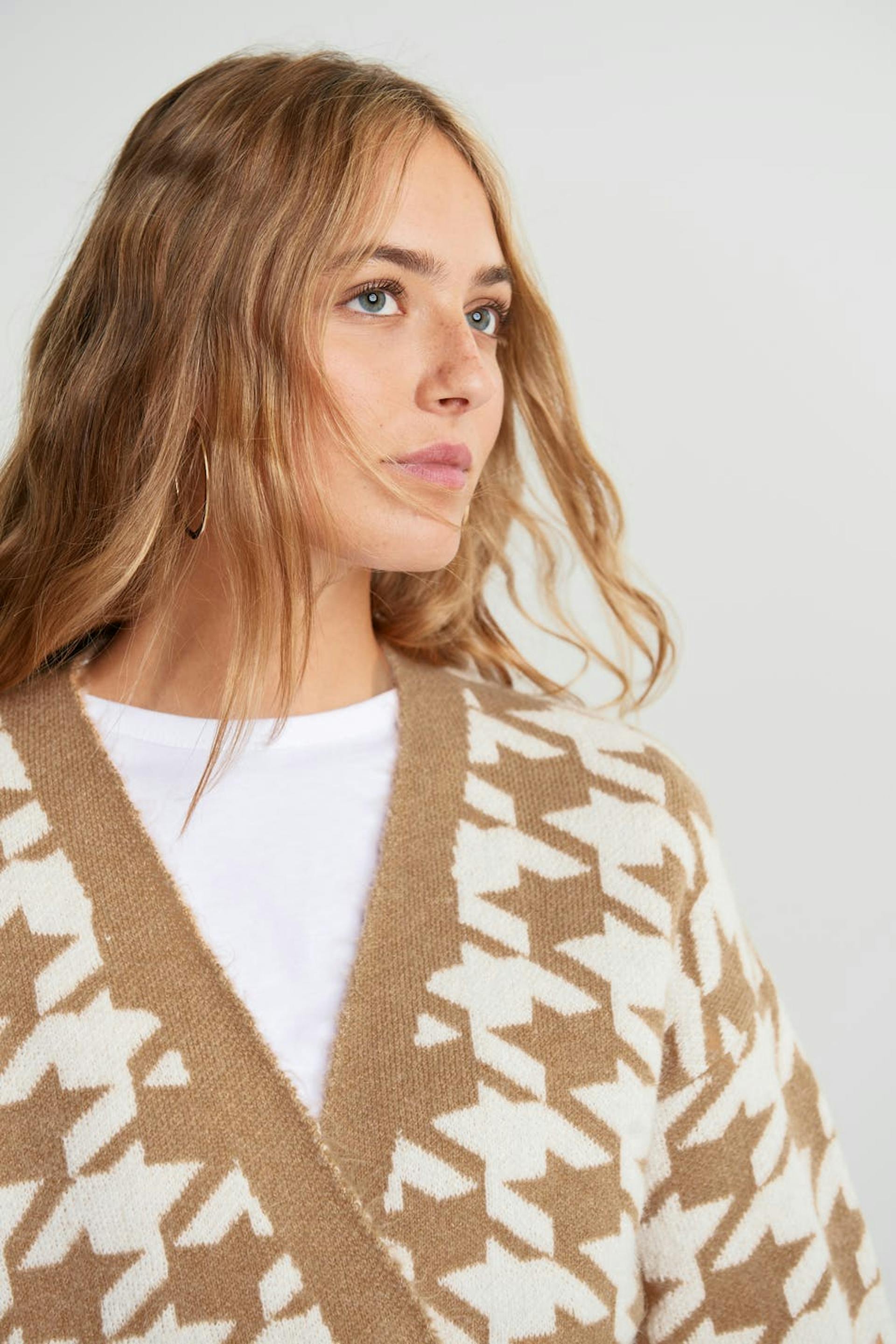 Dog tooth patterned cardigan with an opening at the front. The cardigan is beige, white and long. It has long sleeves, small slit on the sides and a tie strap at the waist.