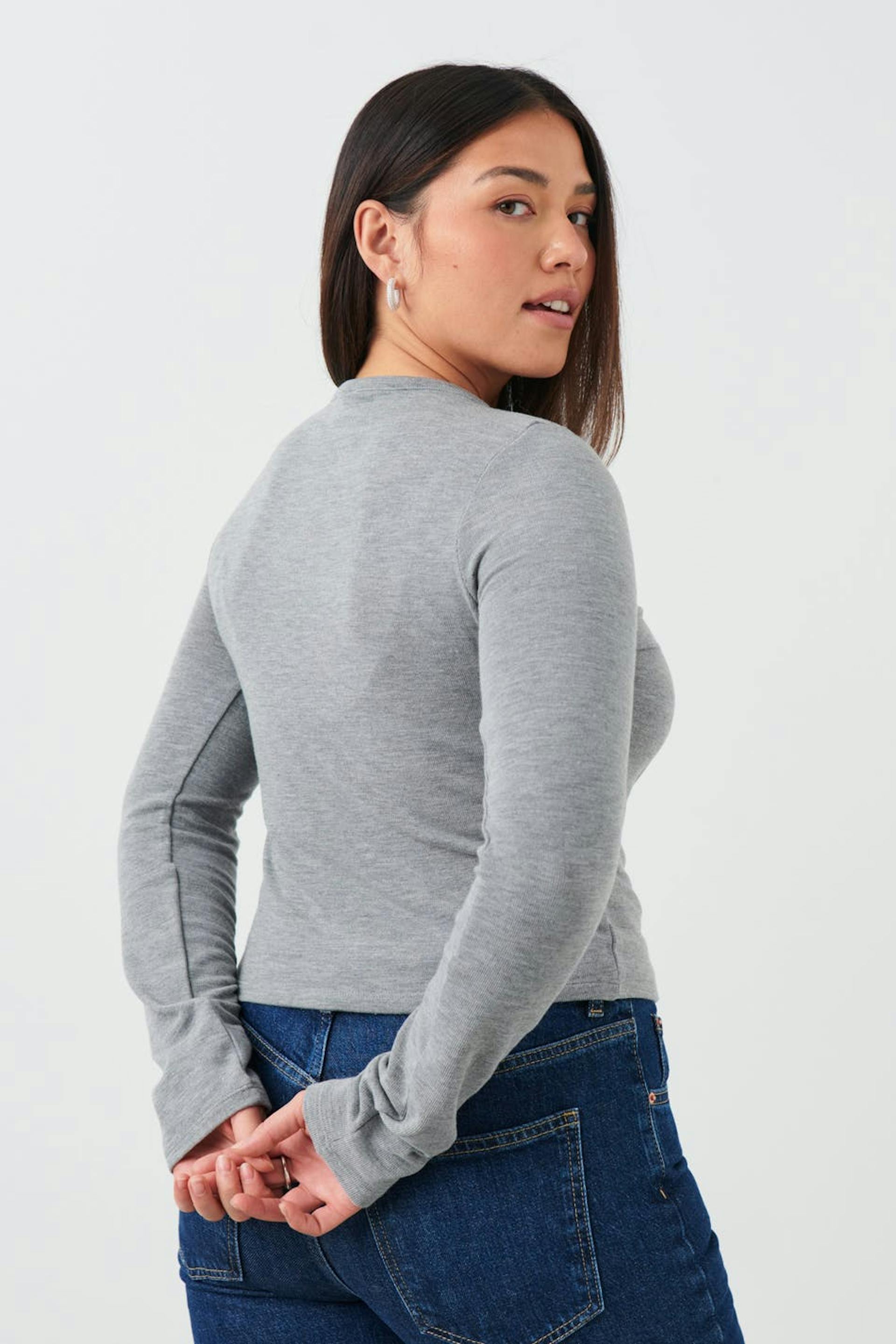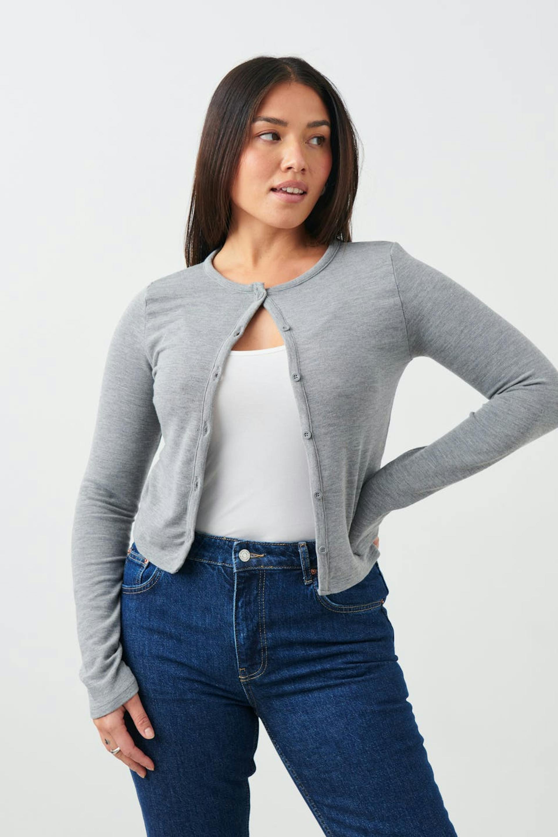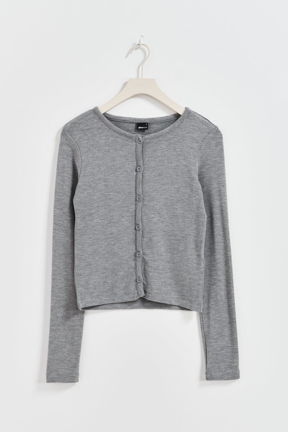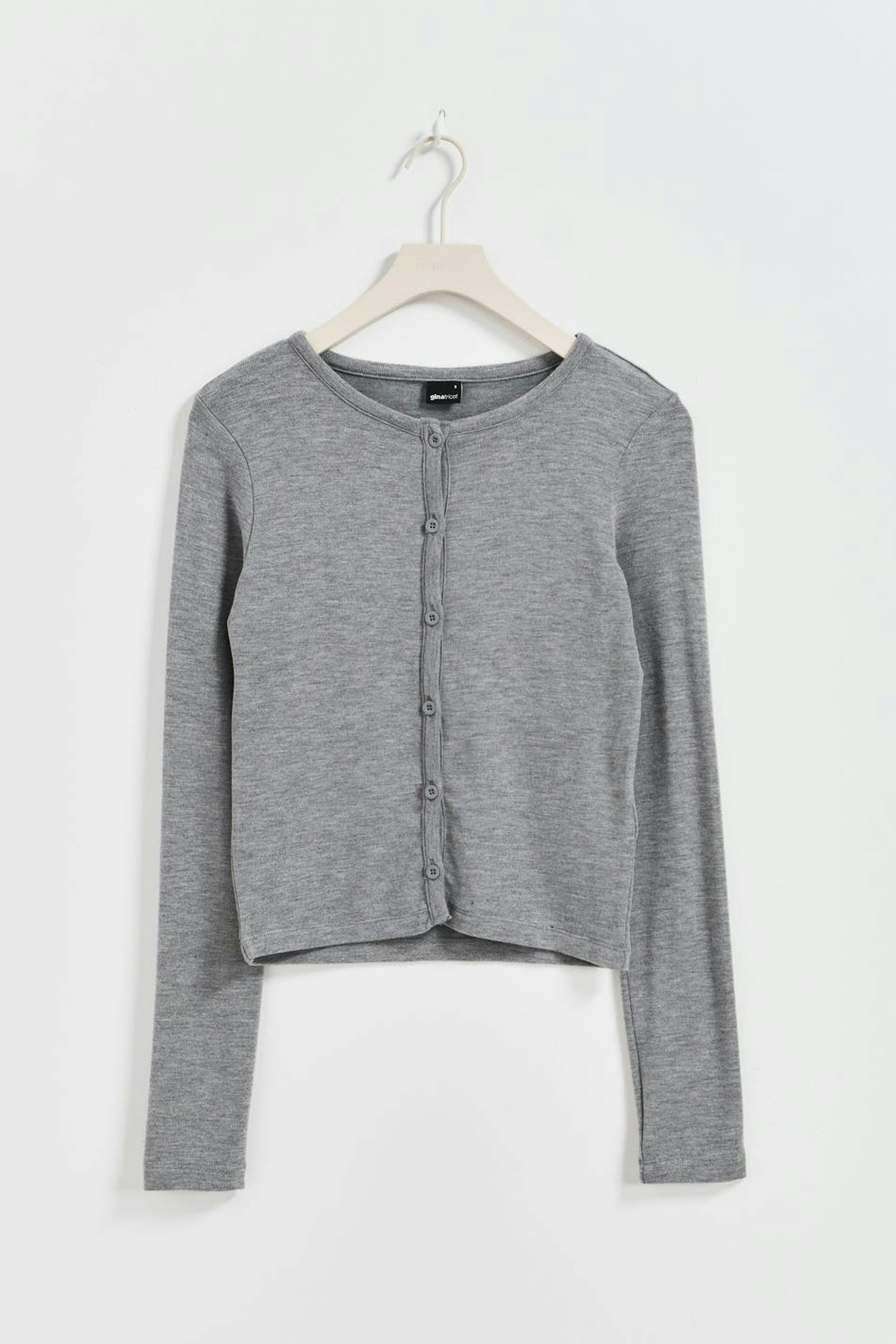 Long-sleeved cardigan in ribbed jersey with figure-hugging fit. The cardigan is grey and has buttoning at the front. It has round neckline and short length.
