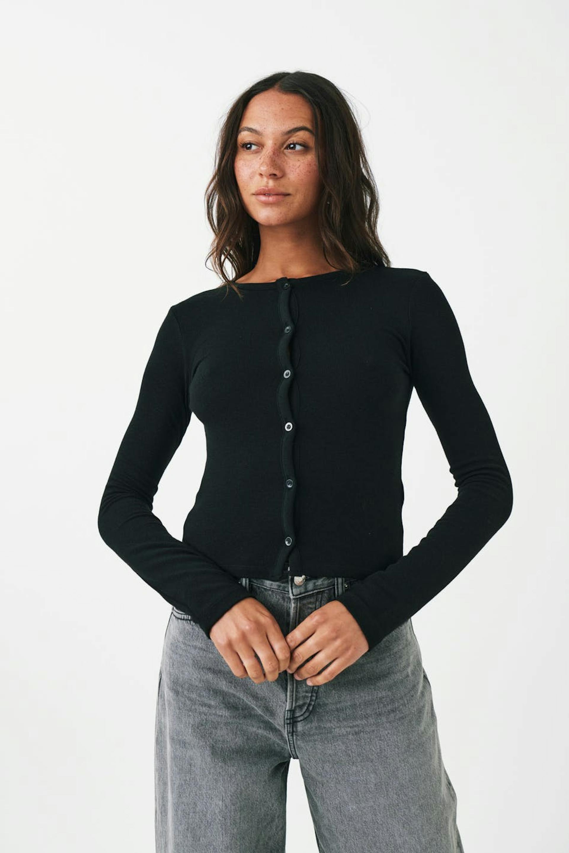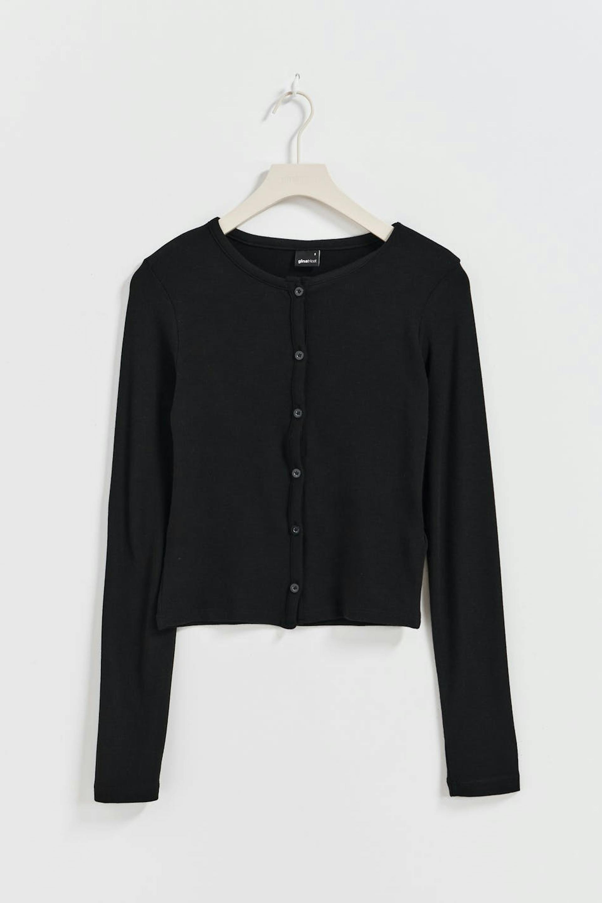 Long-sleeved cardigan in ribbed jersey with figure-hugging fit. The cardigan is black and has buttoning at the front. It has round neckline and short length.