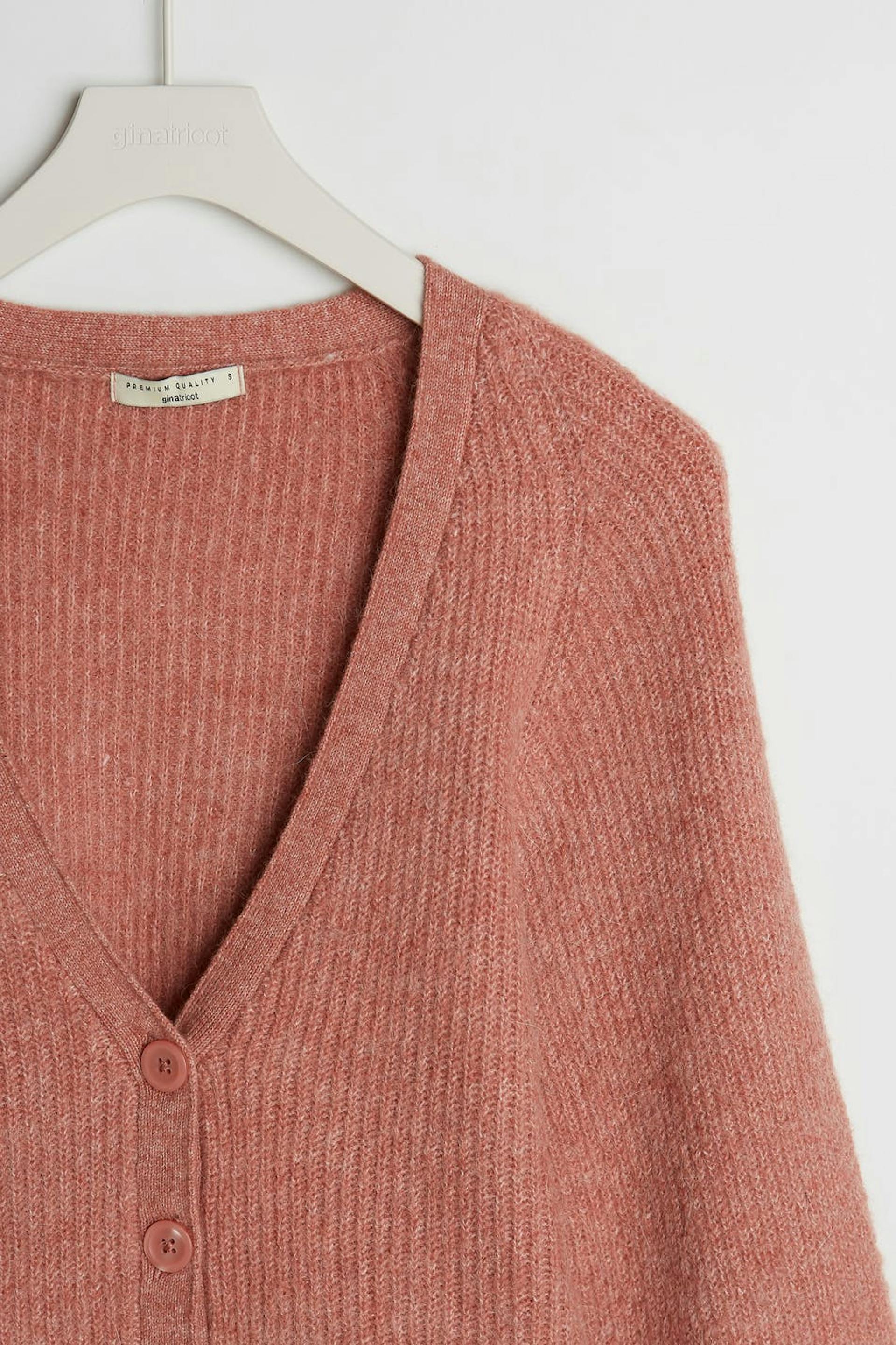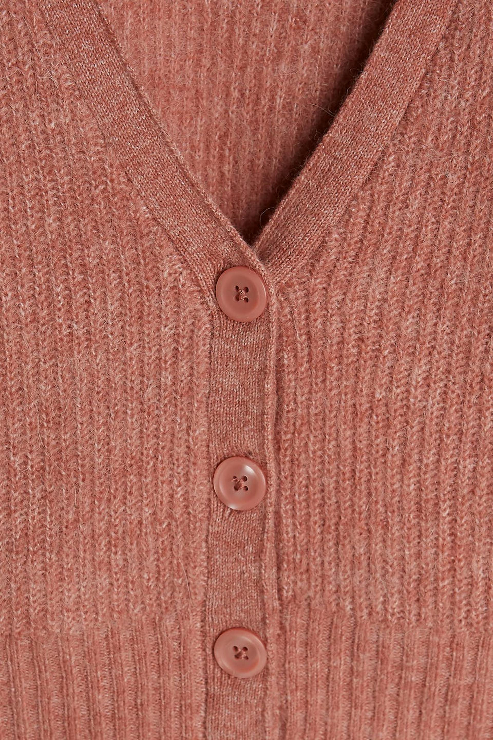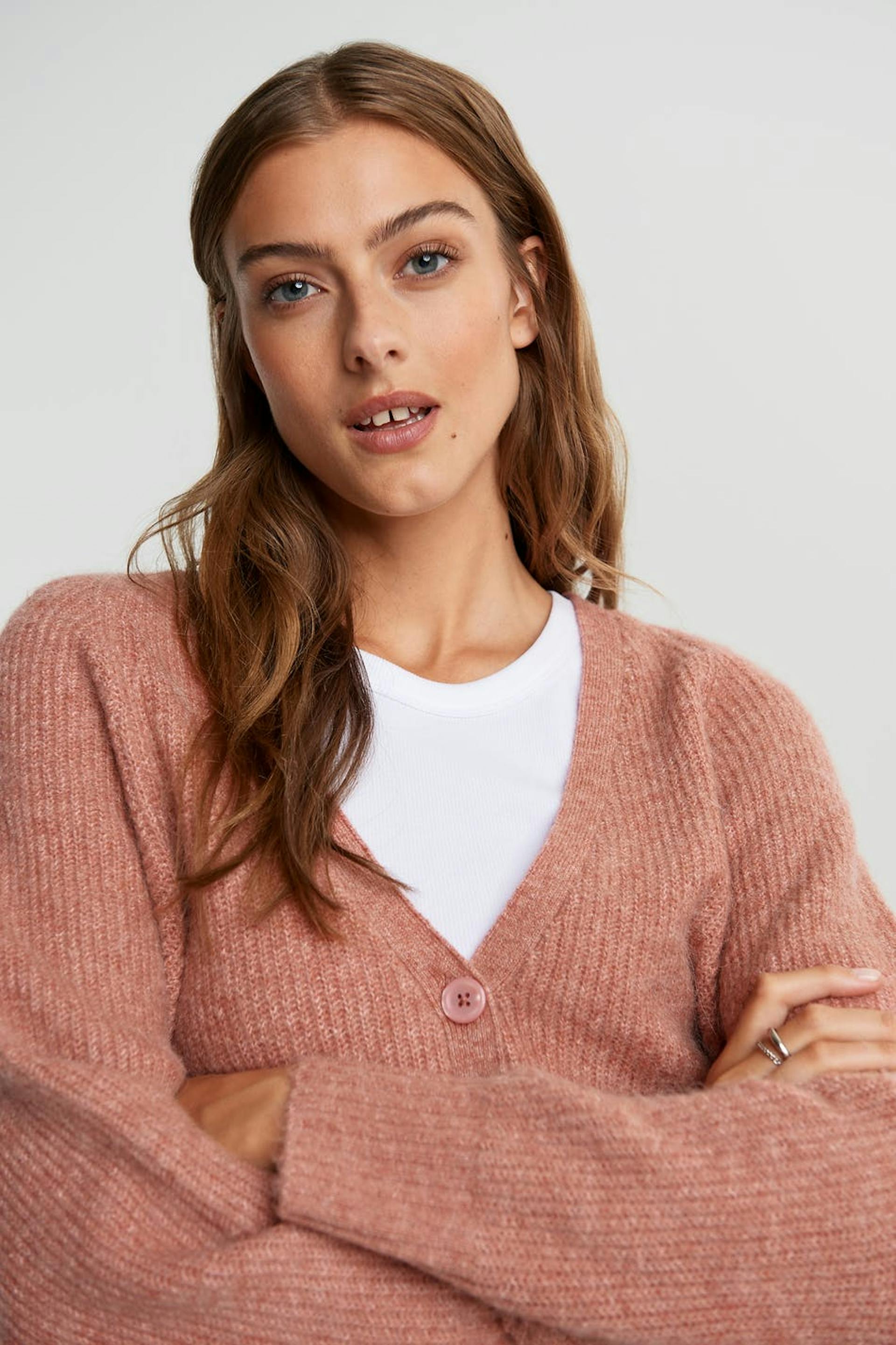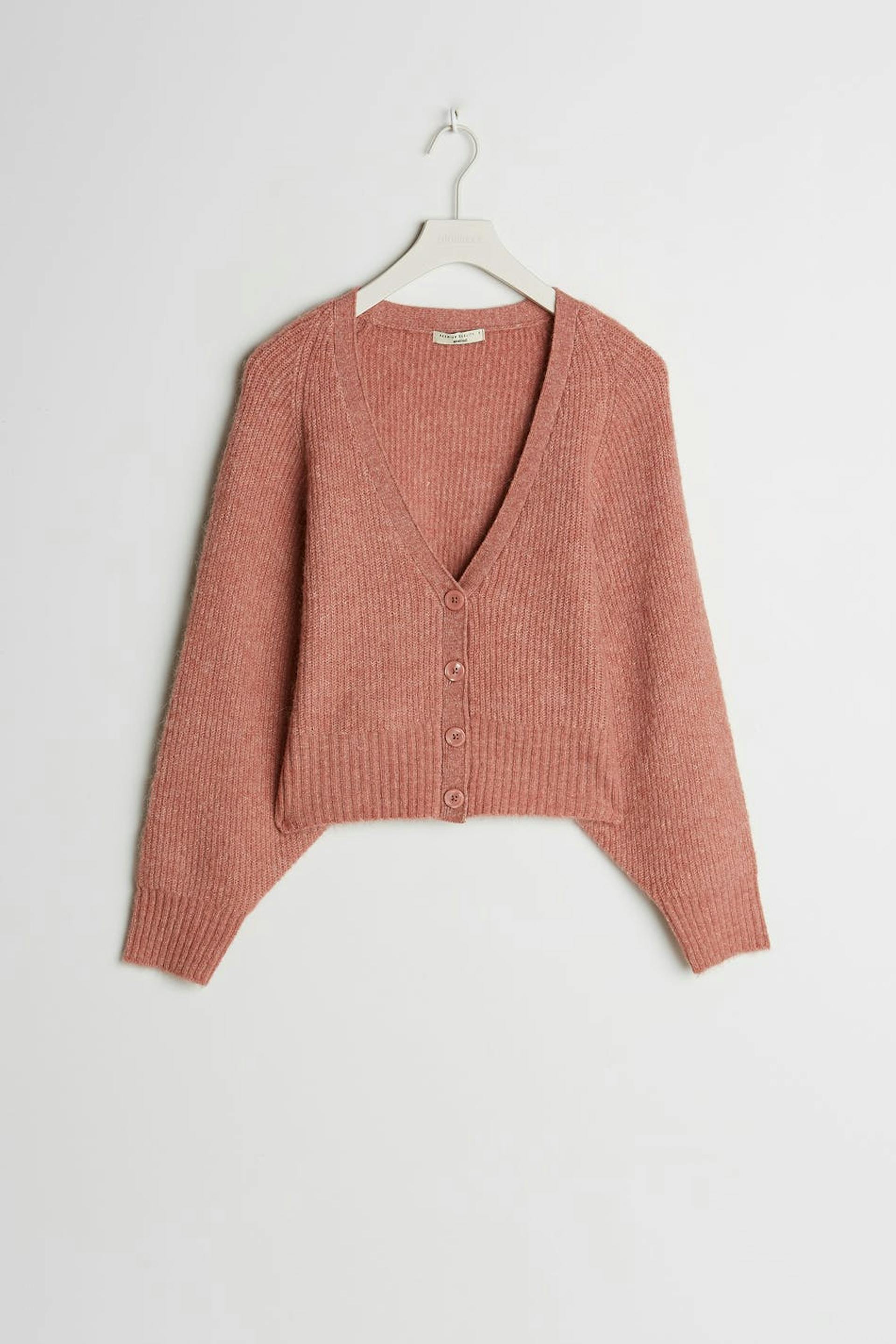Knitted cardigan with big sleeves. The cardigan is pink, knitted and short. It has a V-neck.